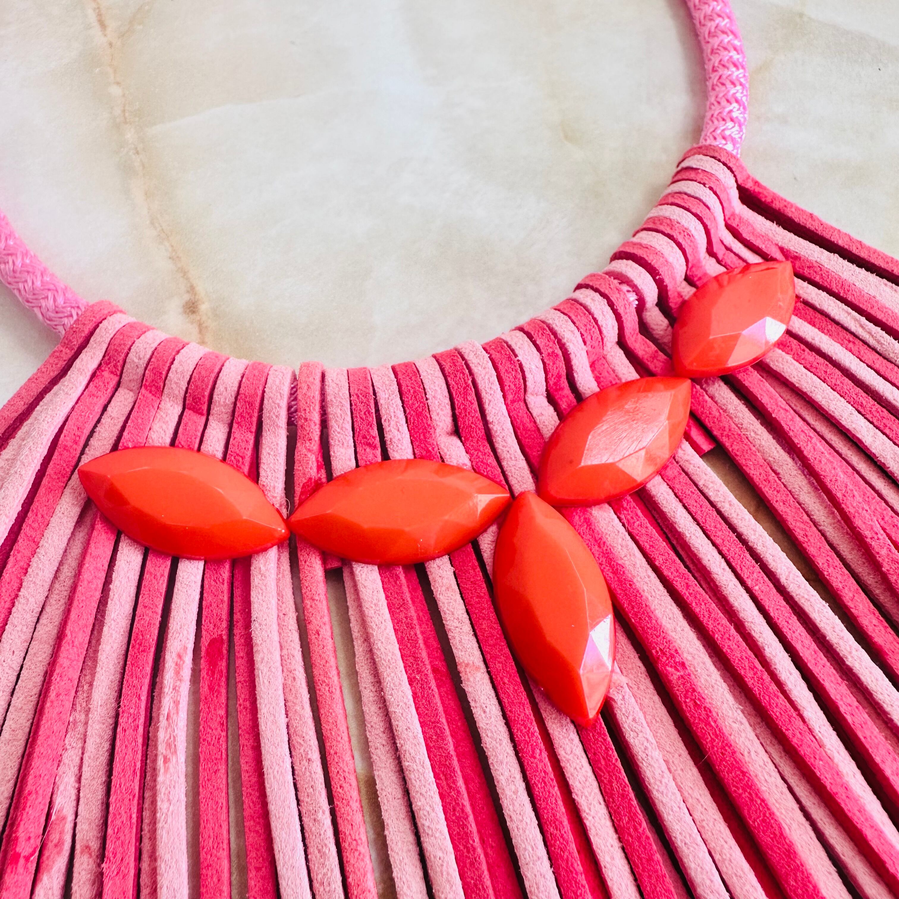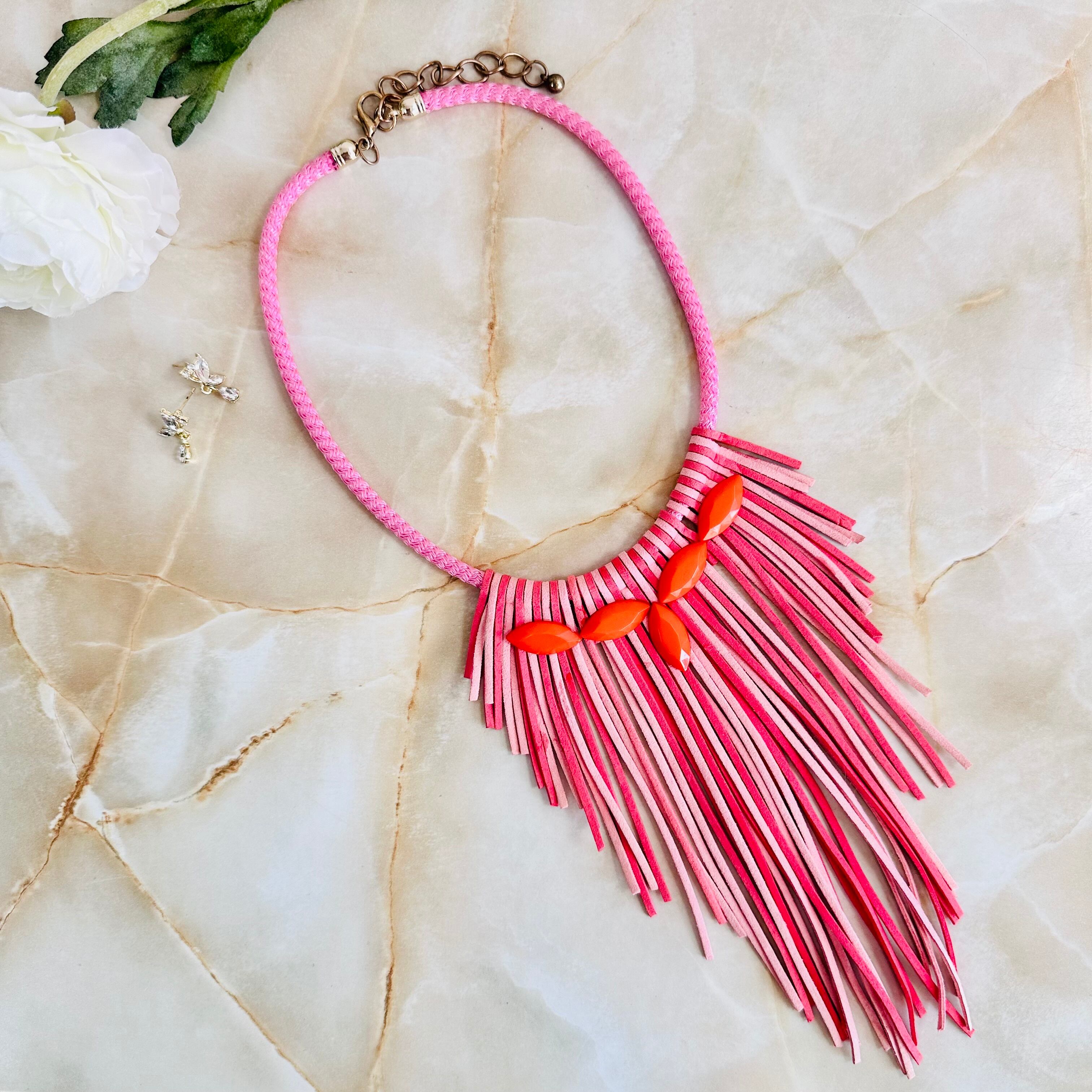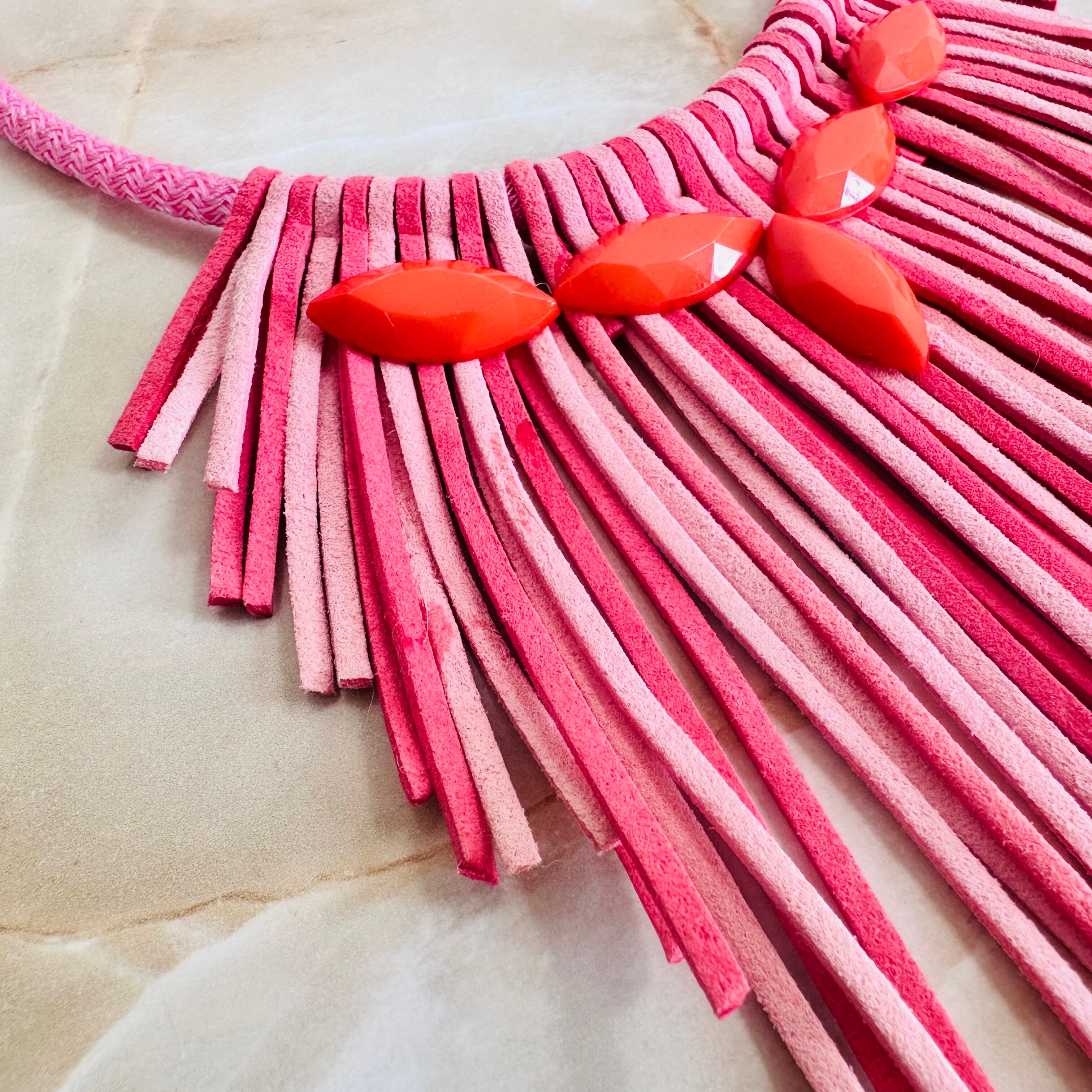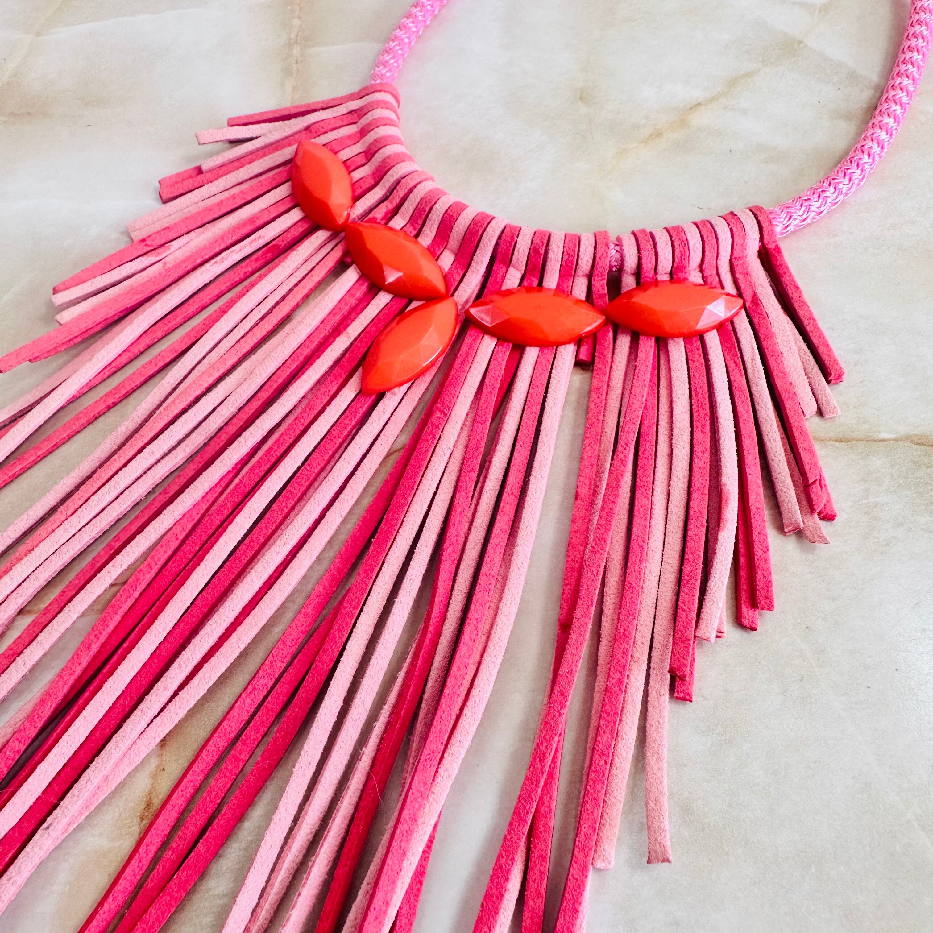 鮮やかなカラーの革紐をフリンジ状にカットし、オレンジのパーツをプラスし、元気溢れるポップなテイストに仕上げました。
