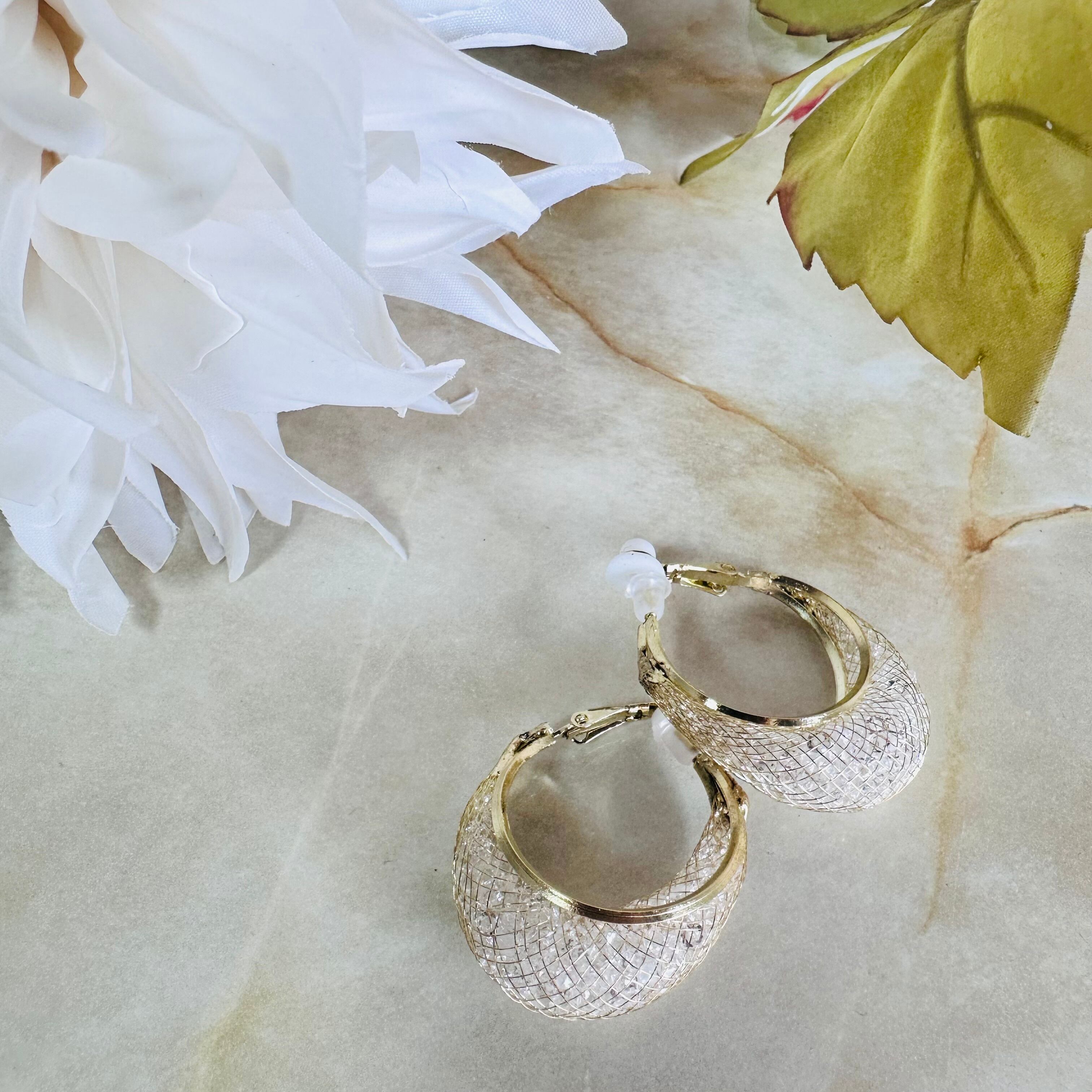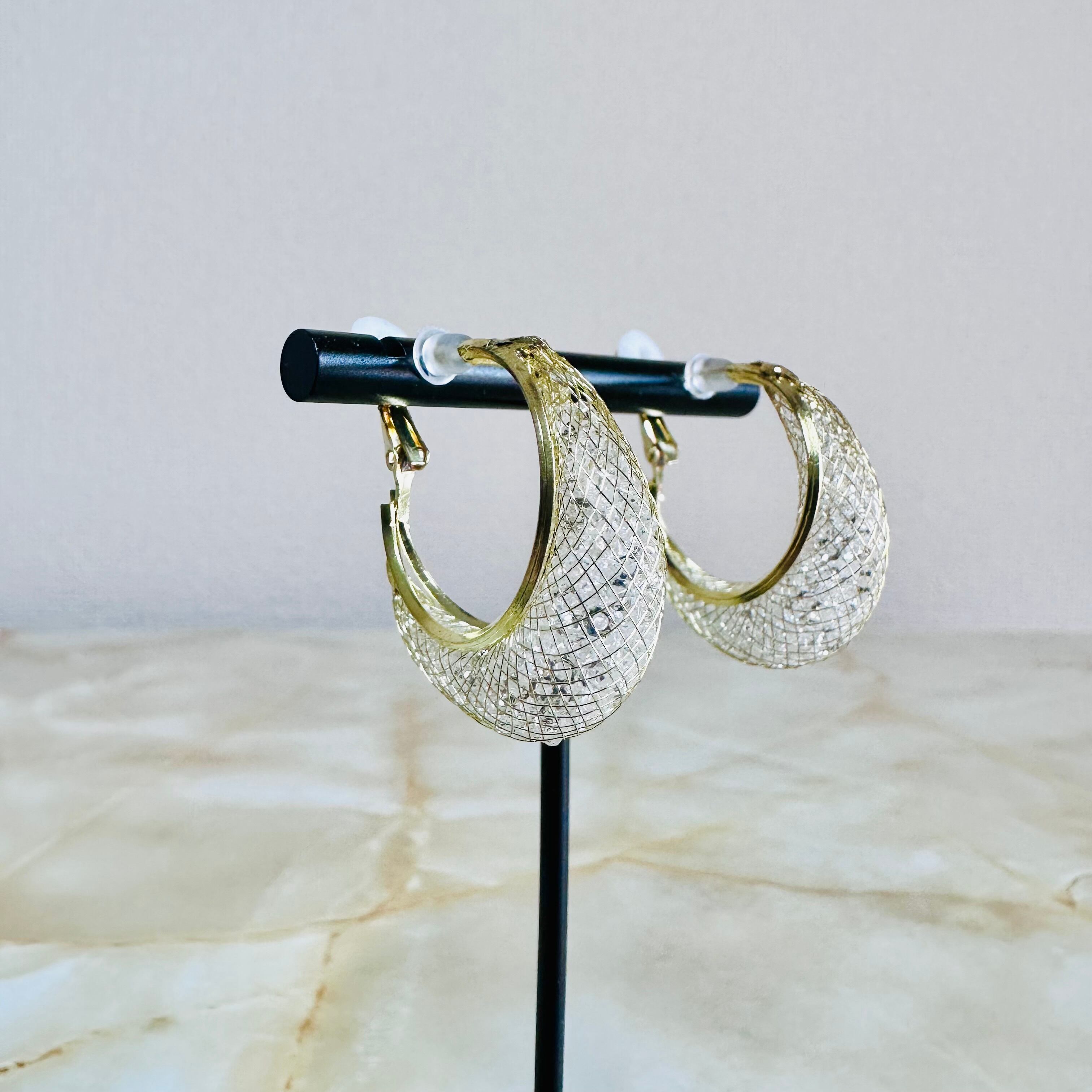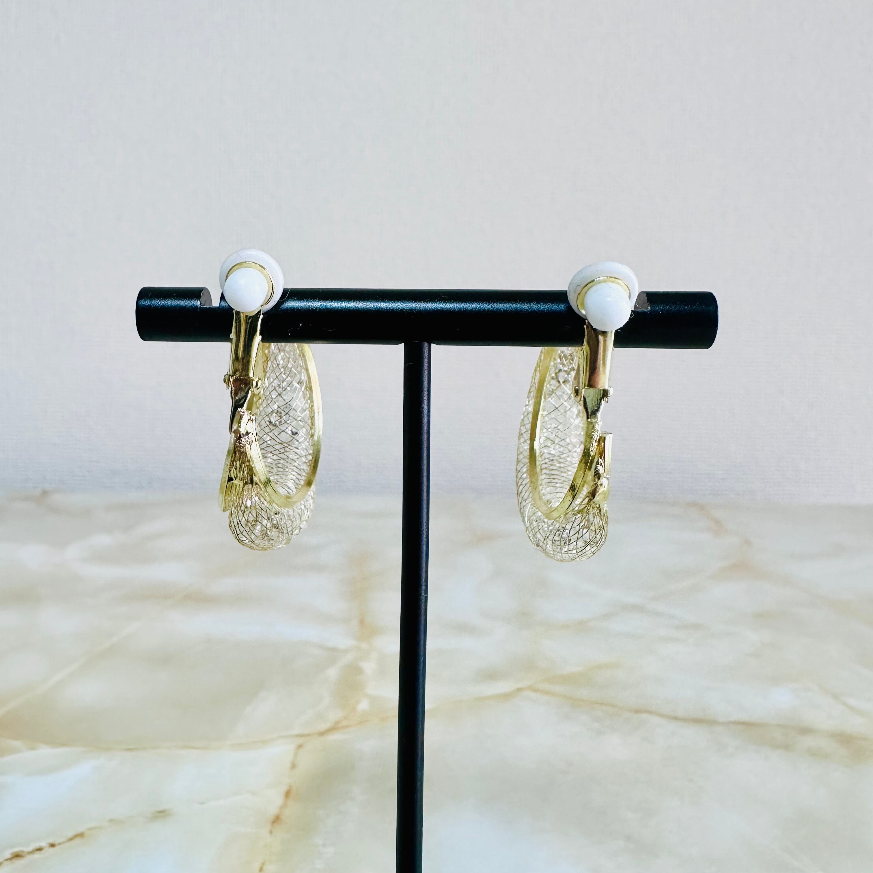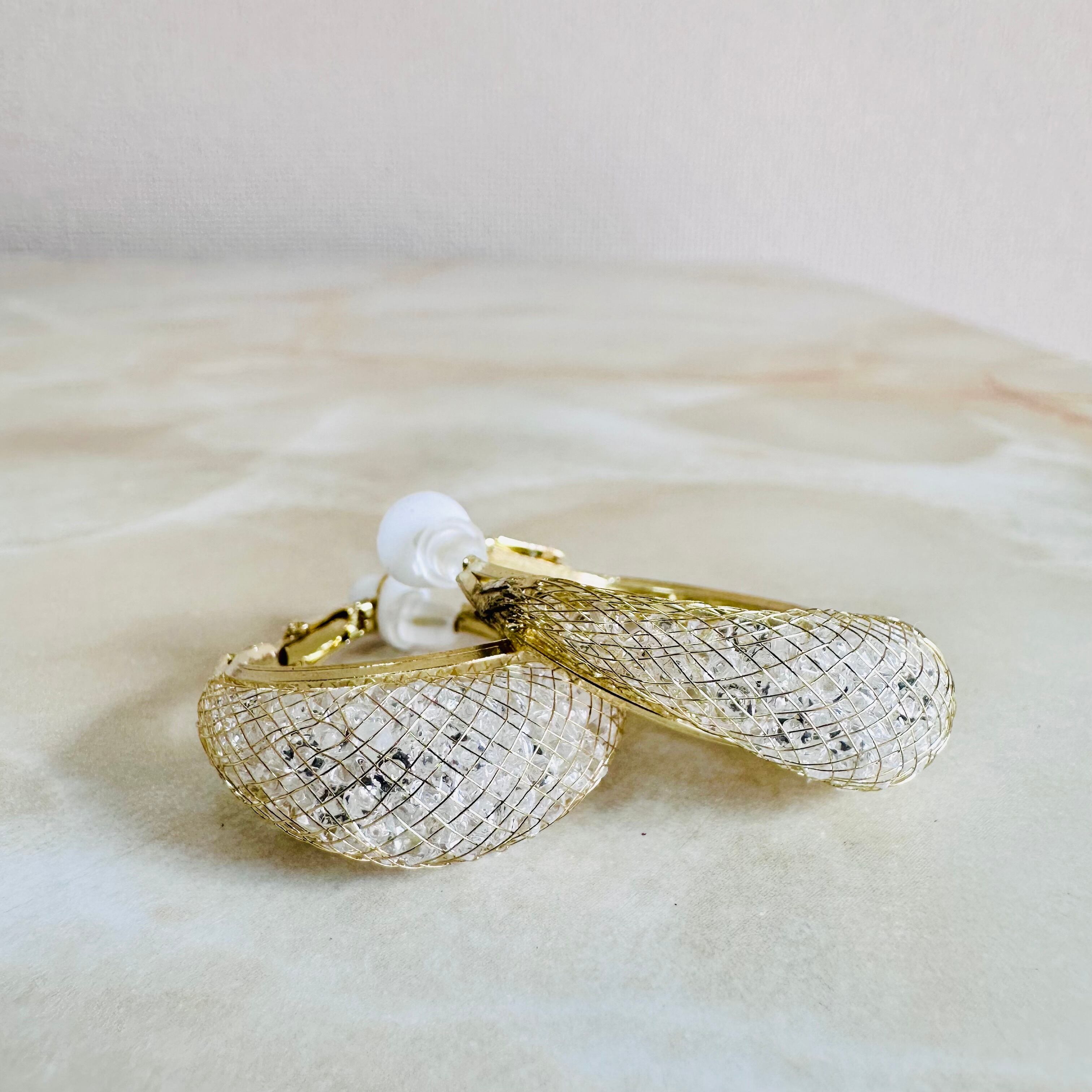 ゴールドワイヤーでネット状に編まれた中にクリアのガラスパーツが入ったデザインです。