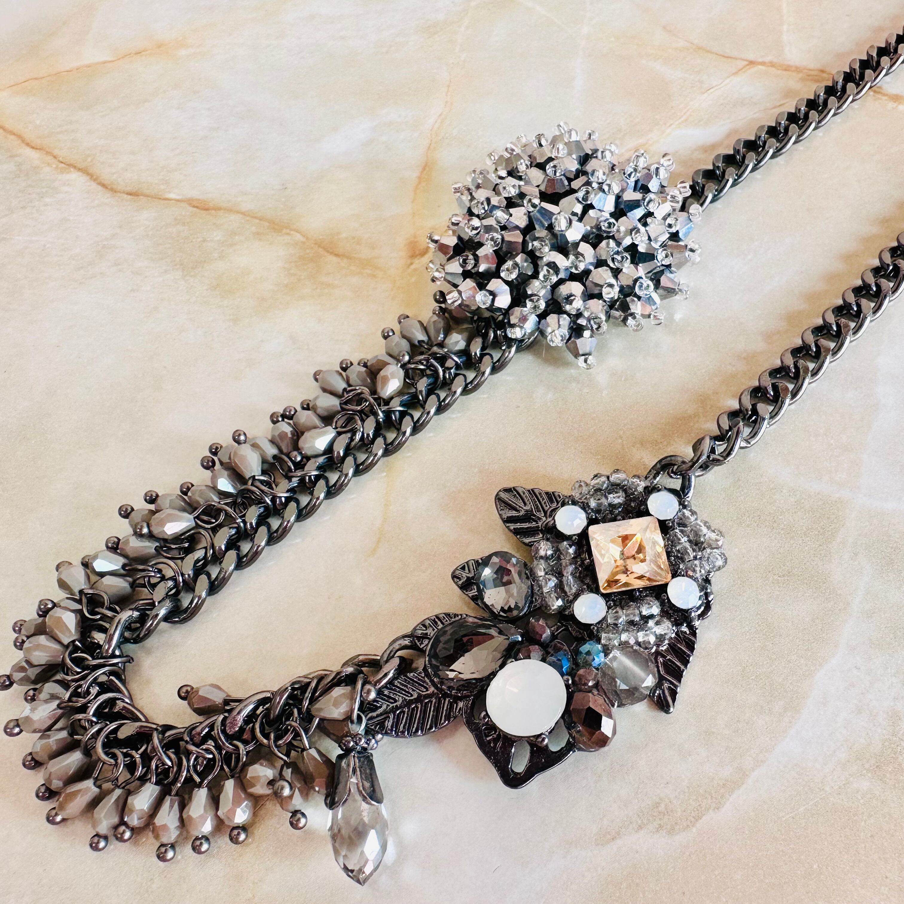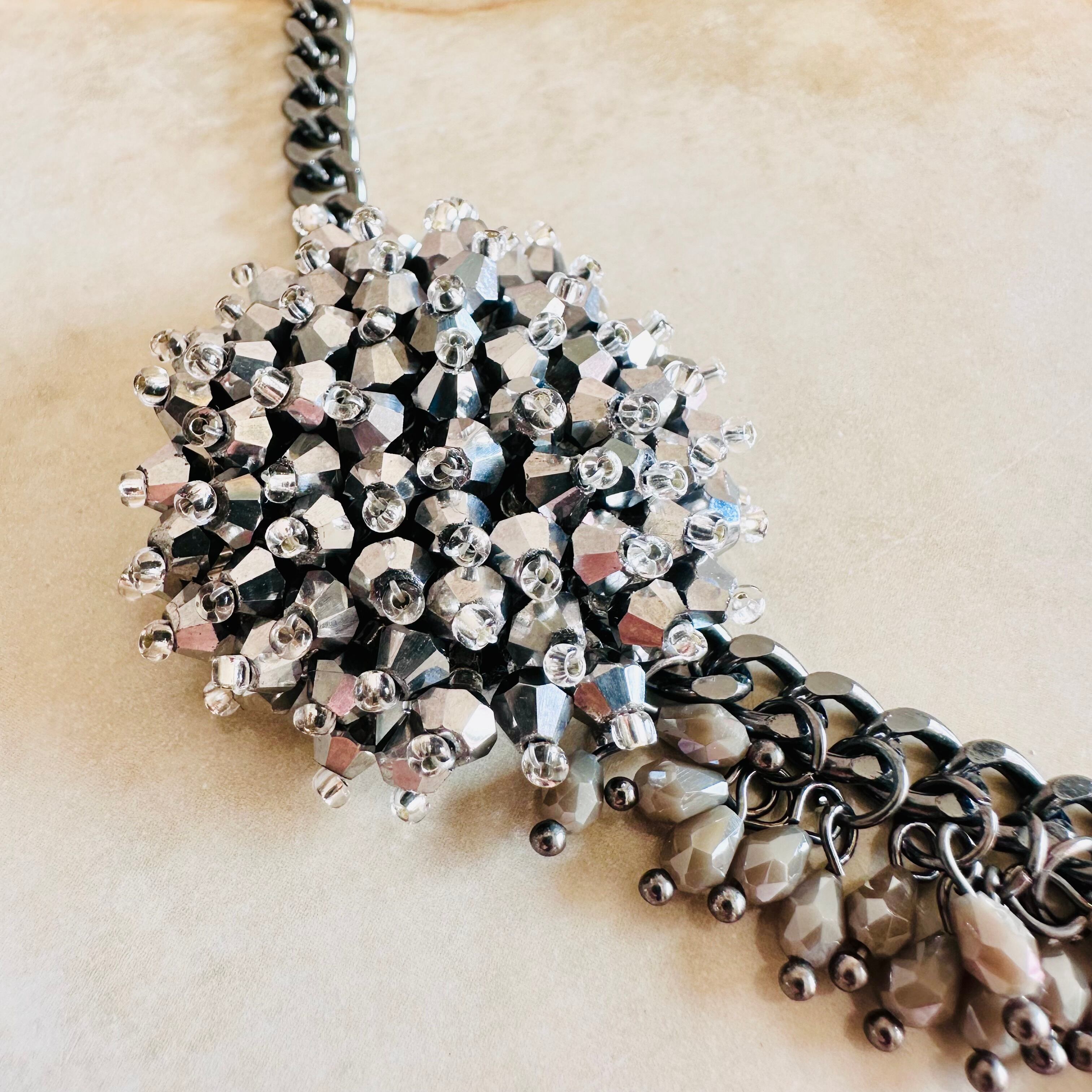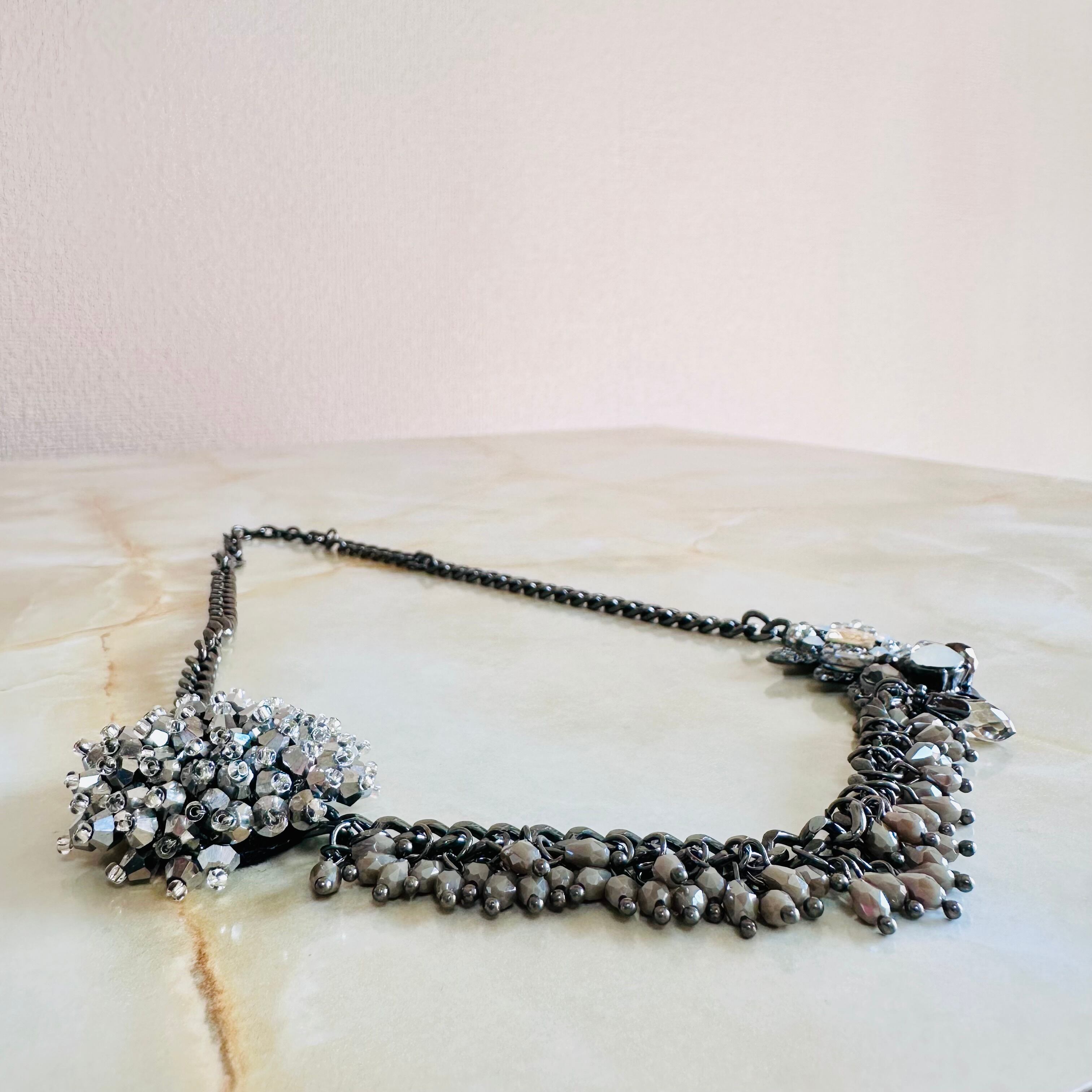 シルバーフラワーモチーフ、グレージュガラスビーズ、ラインストーンパーツと、シルバーベースでさまざまなモチーフを取り入れたデザインです。