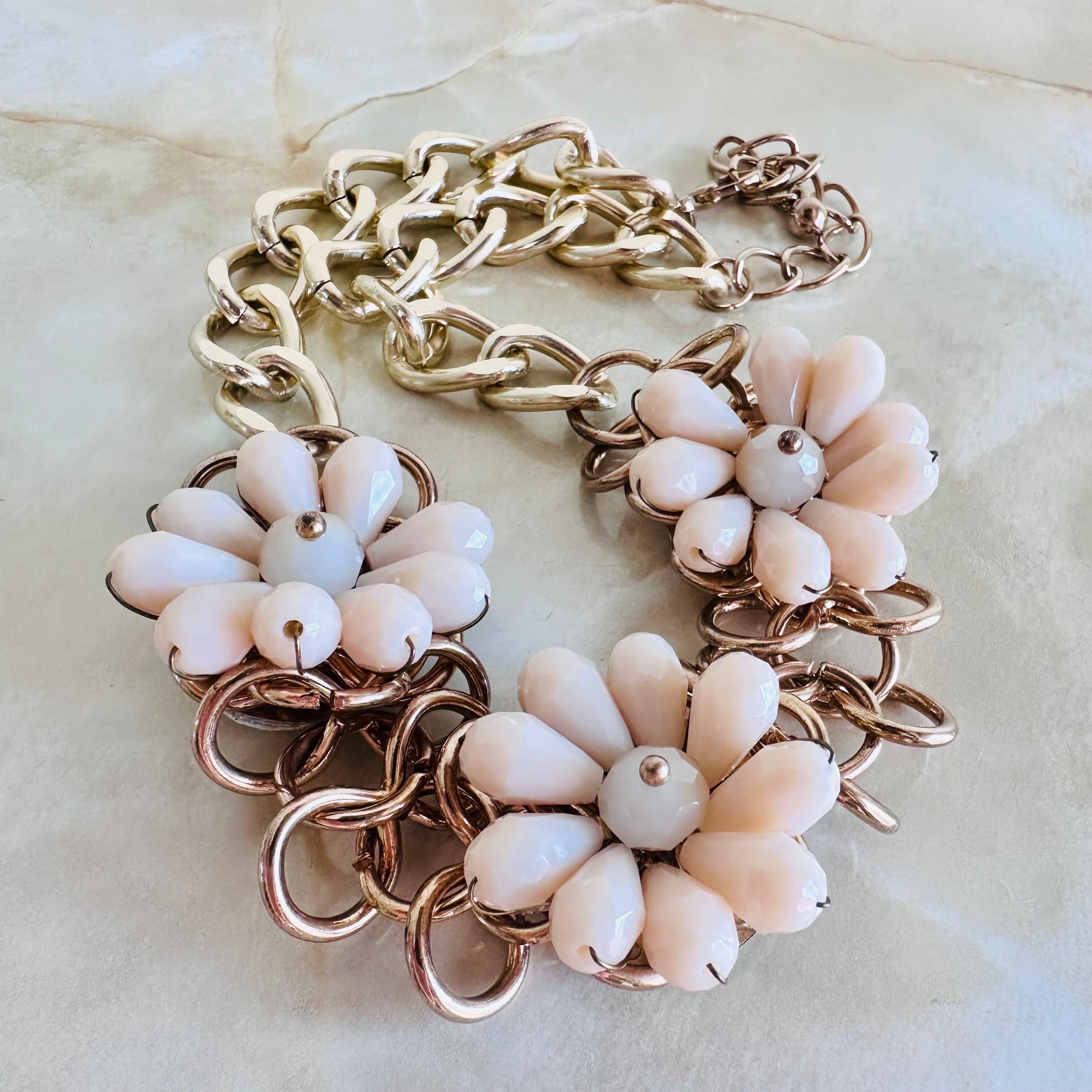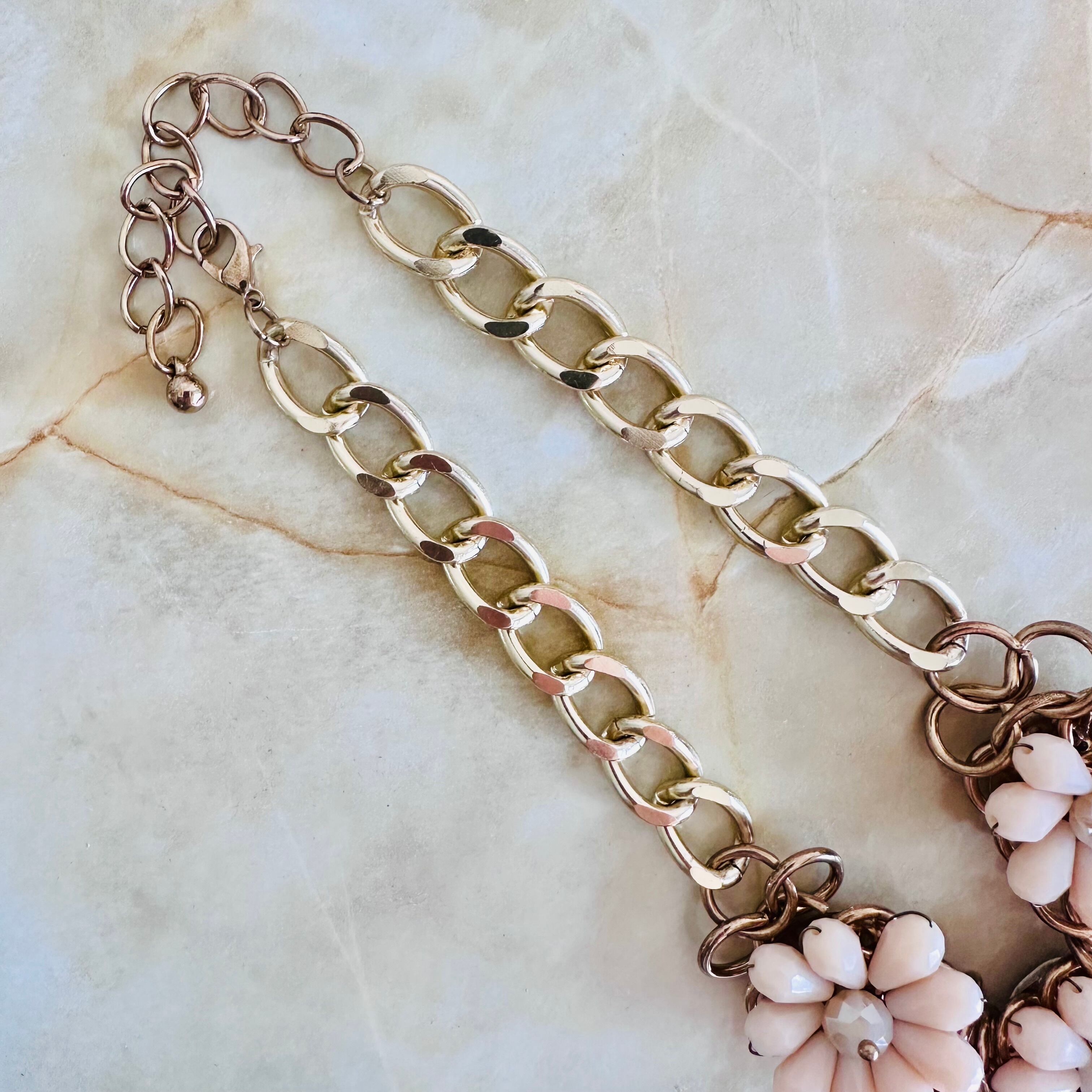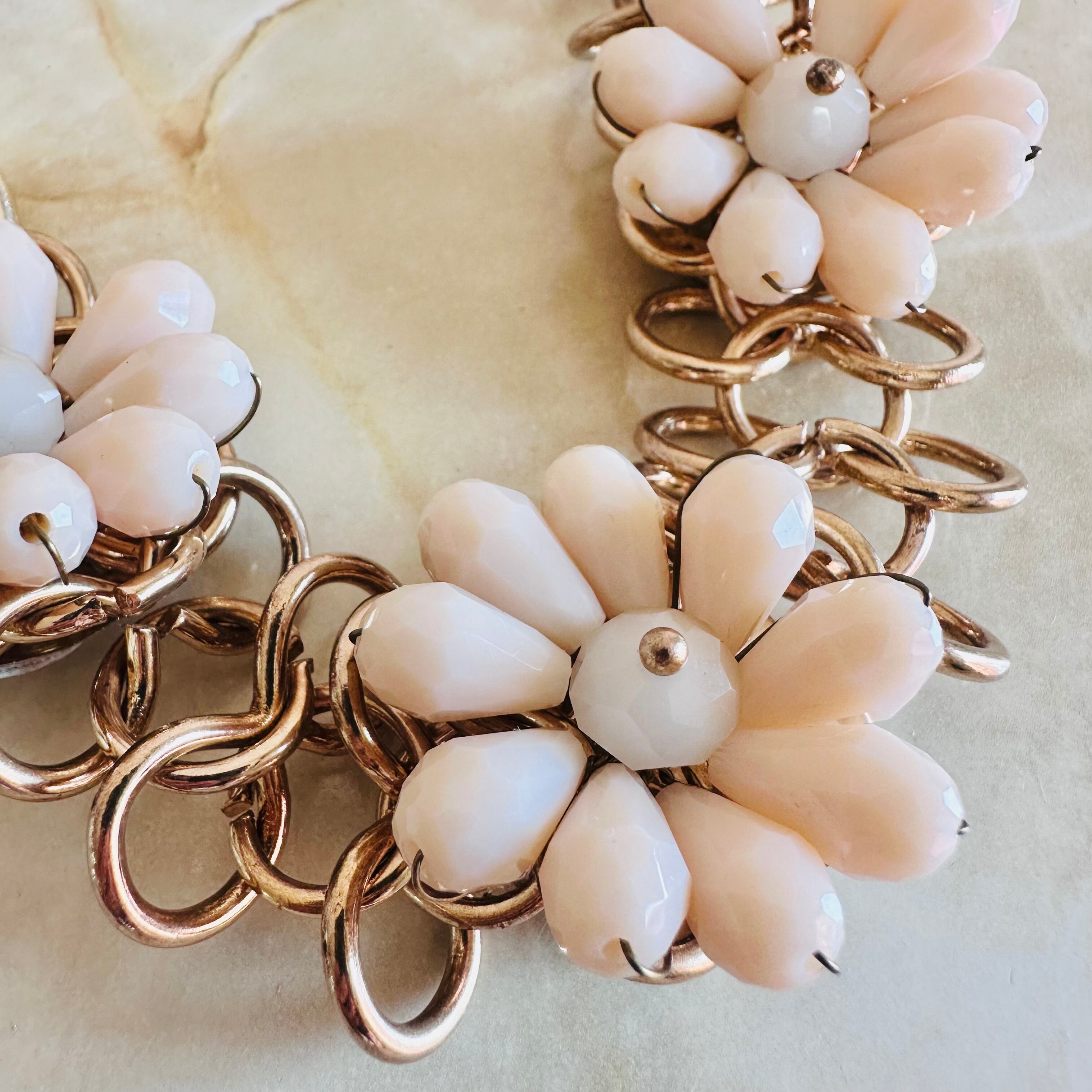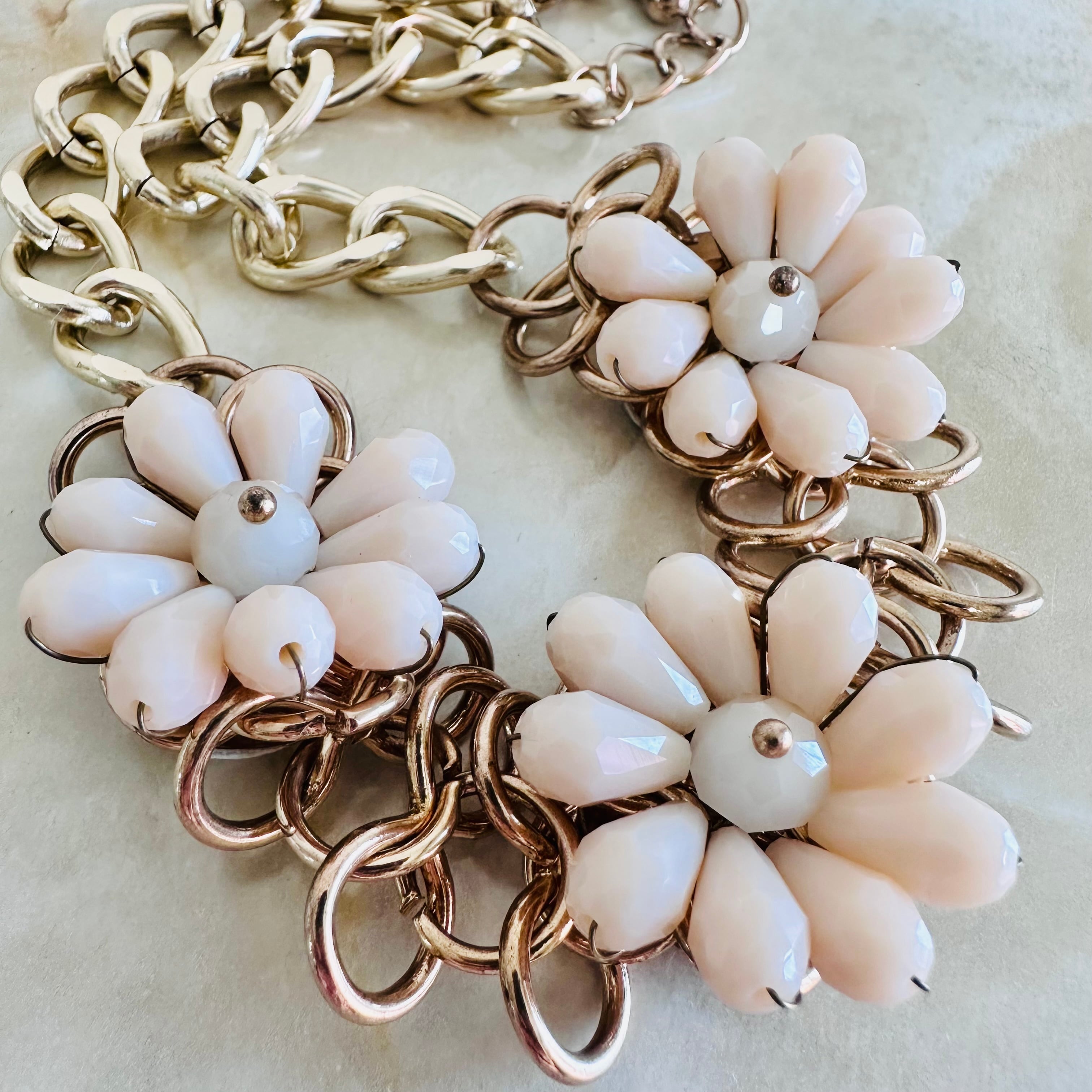 上品に輝くピンクベージュのガラスパーツをフラワーモチーフにし、チャンキーチェーンでおしゃれに仕上げました。