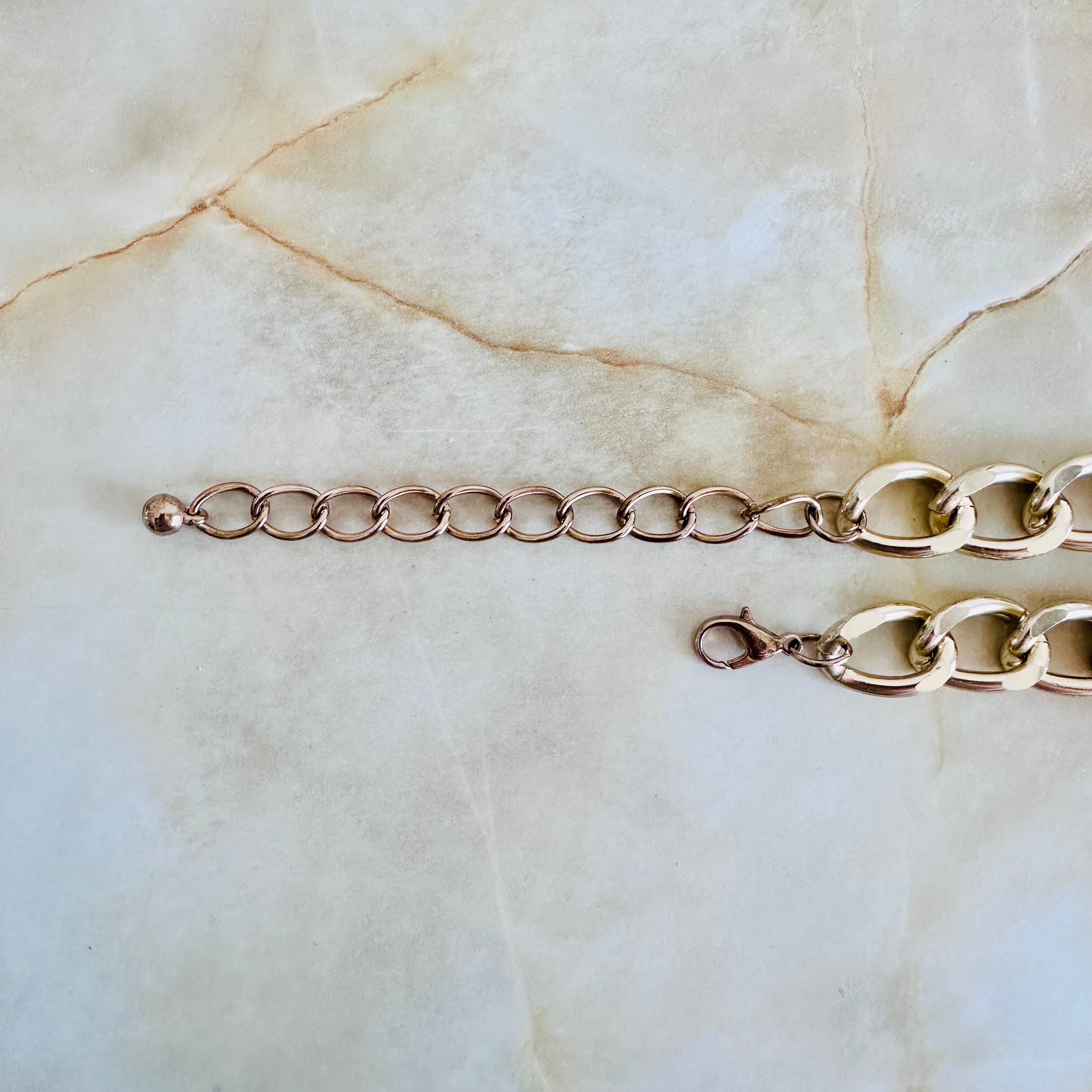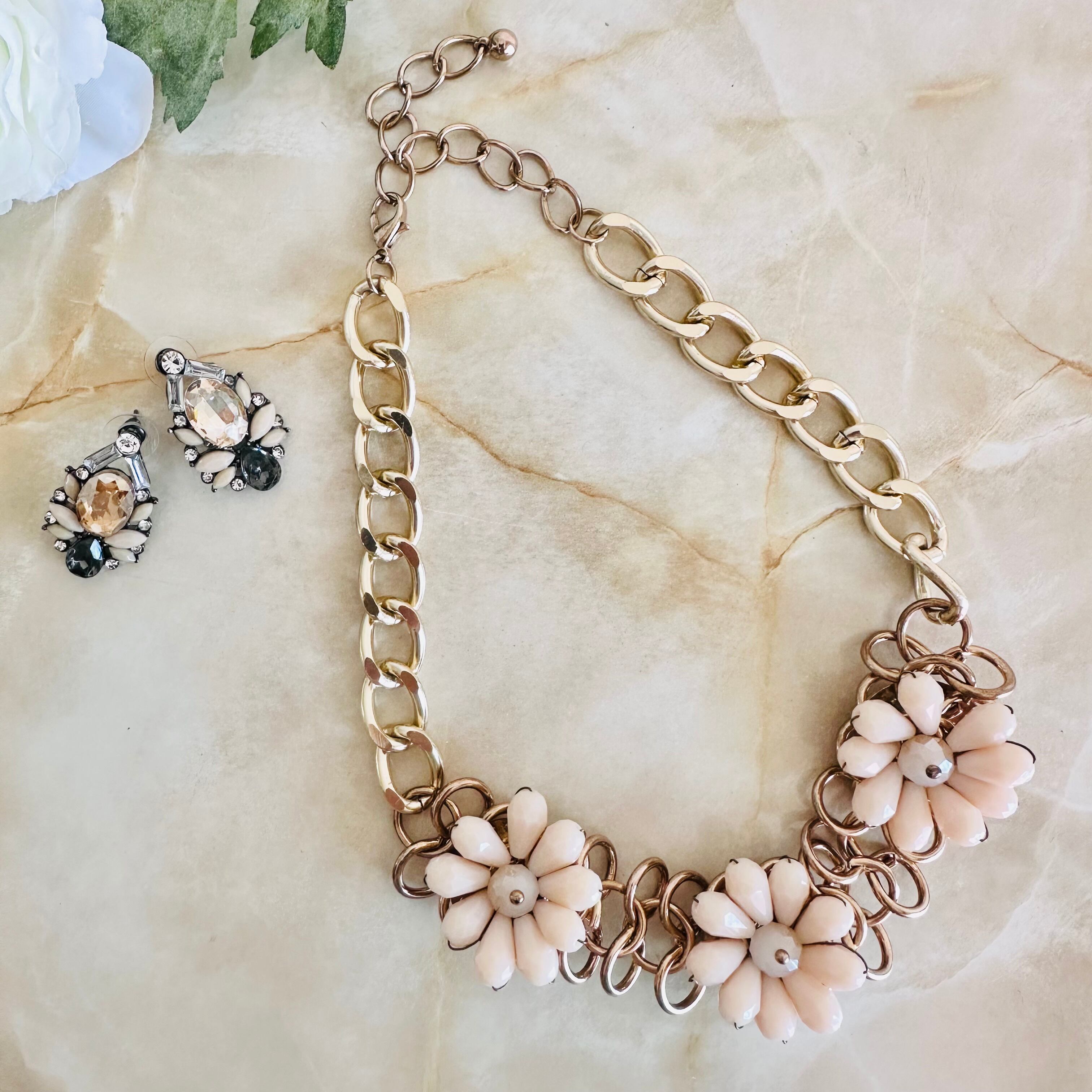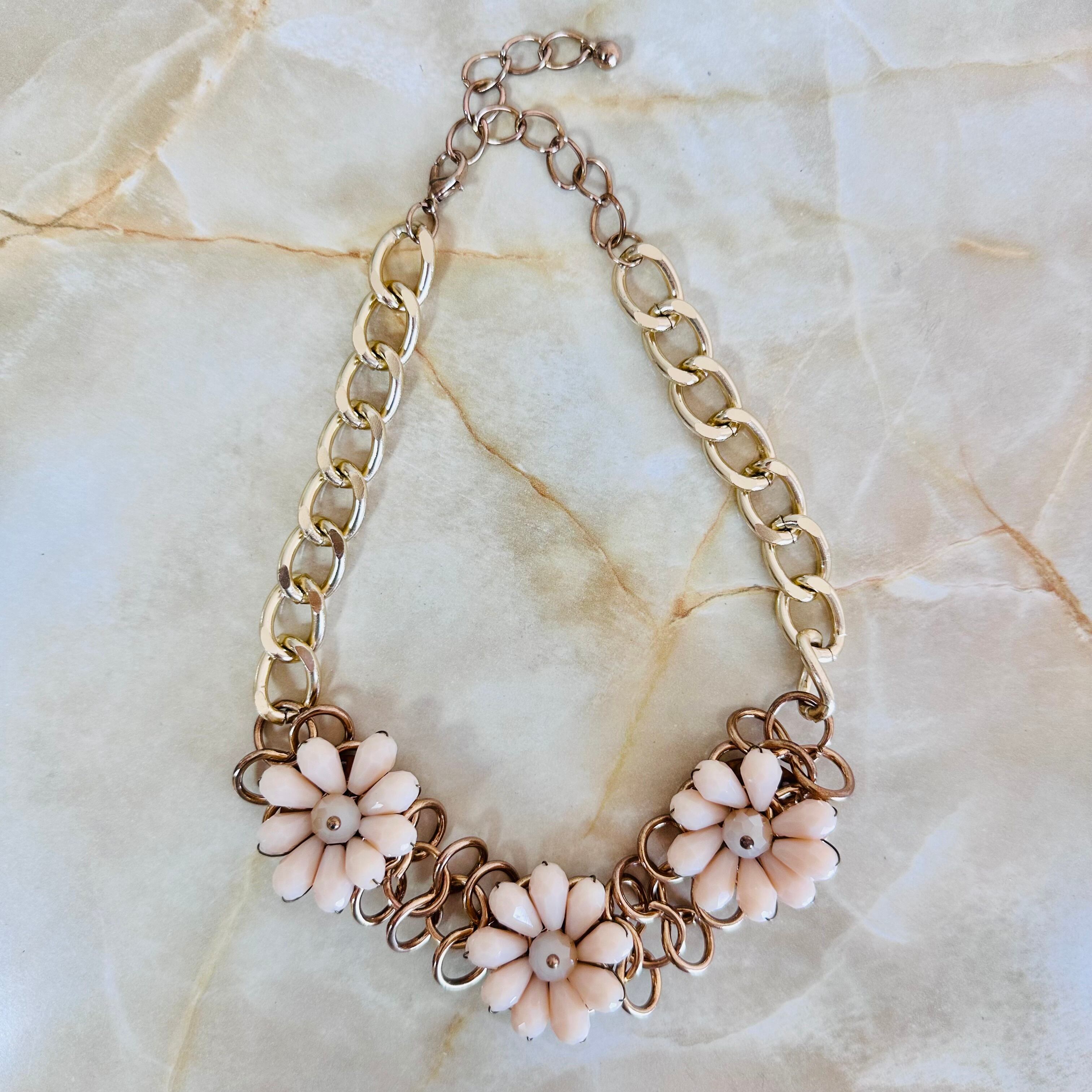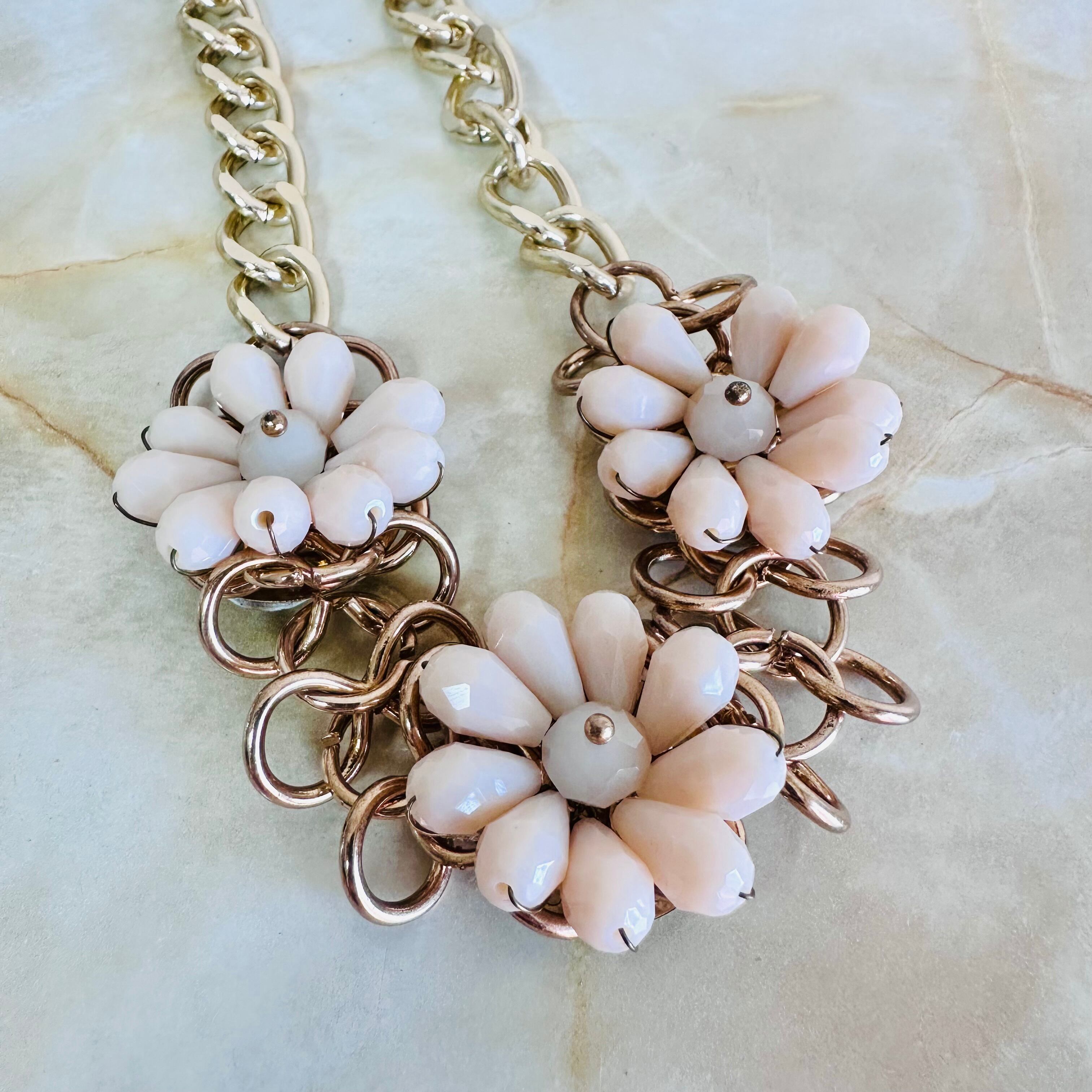 上品に輝くピンクベージュのガラスパーツをフラワーモチーフにし、チャンキーチェーンでおしゃれに仕上げました。