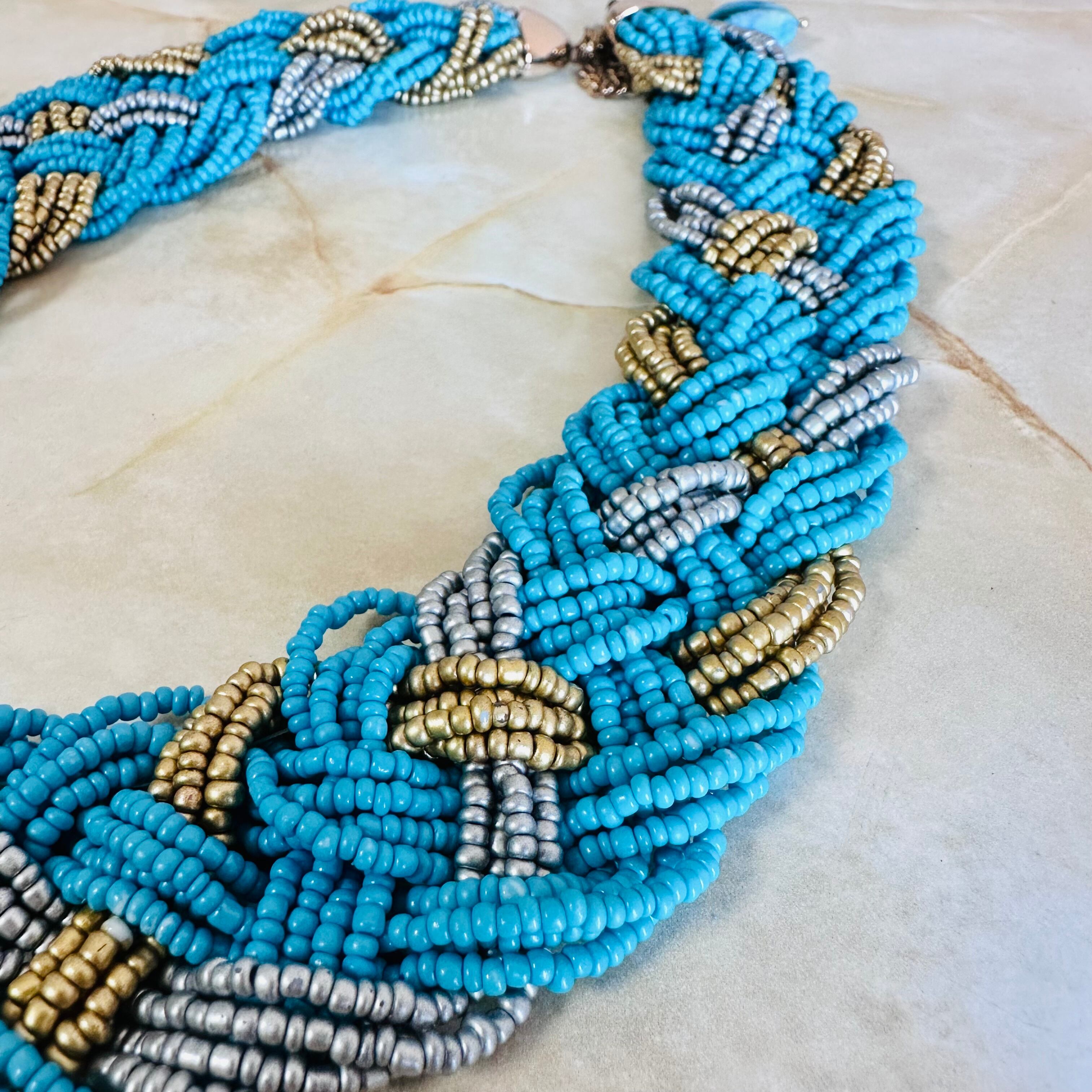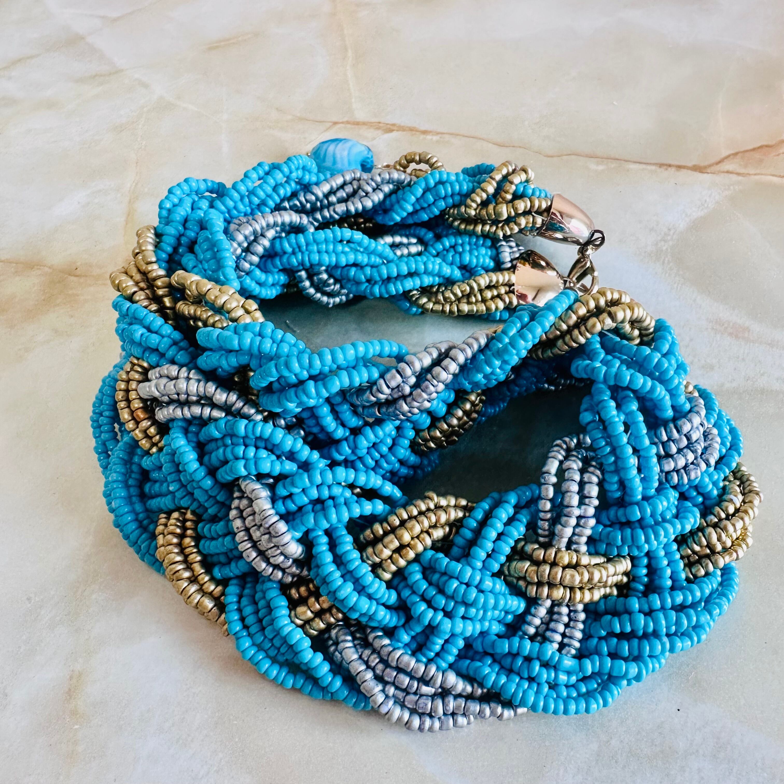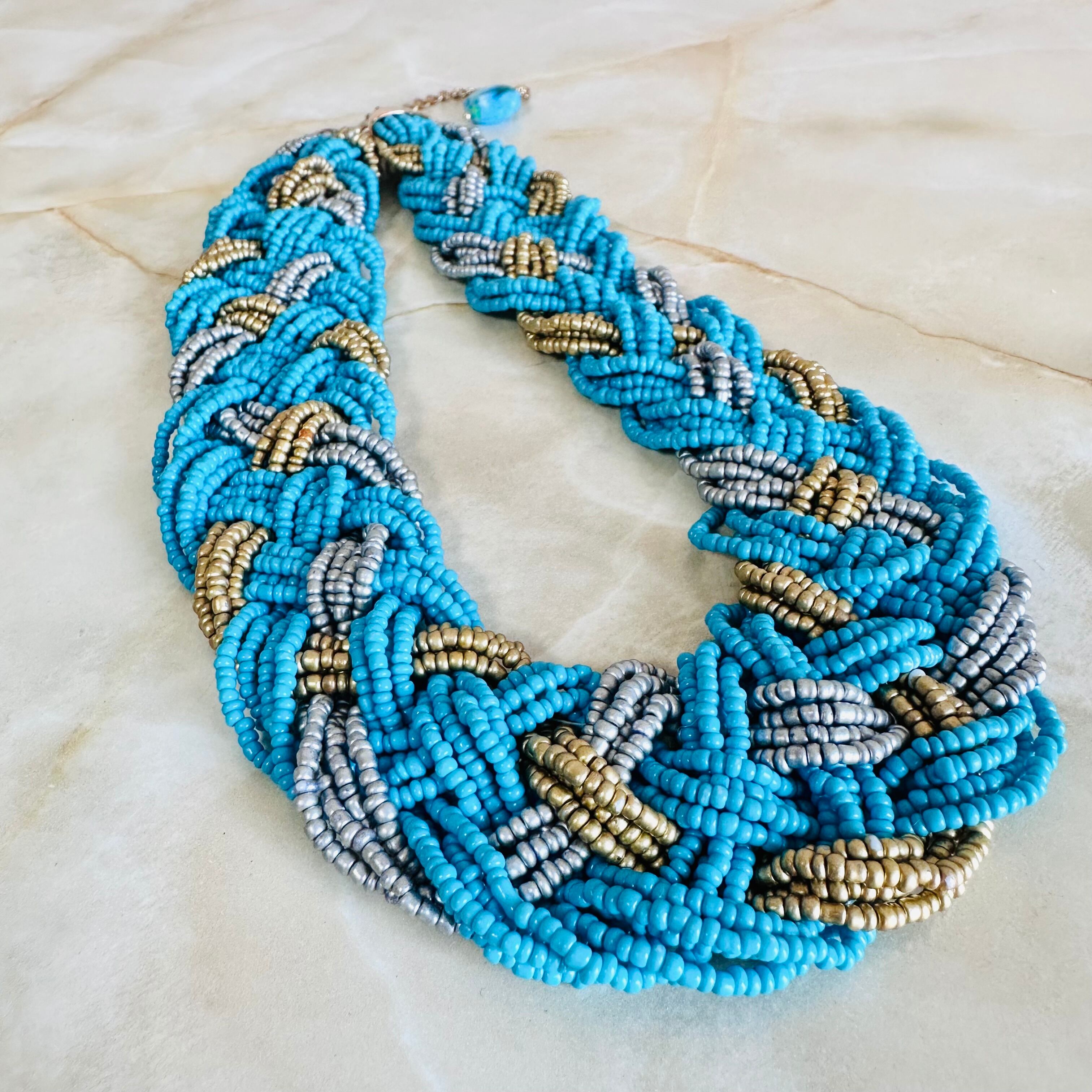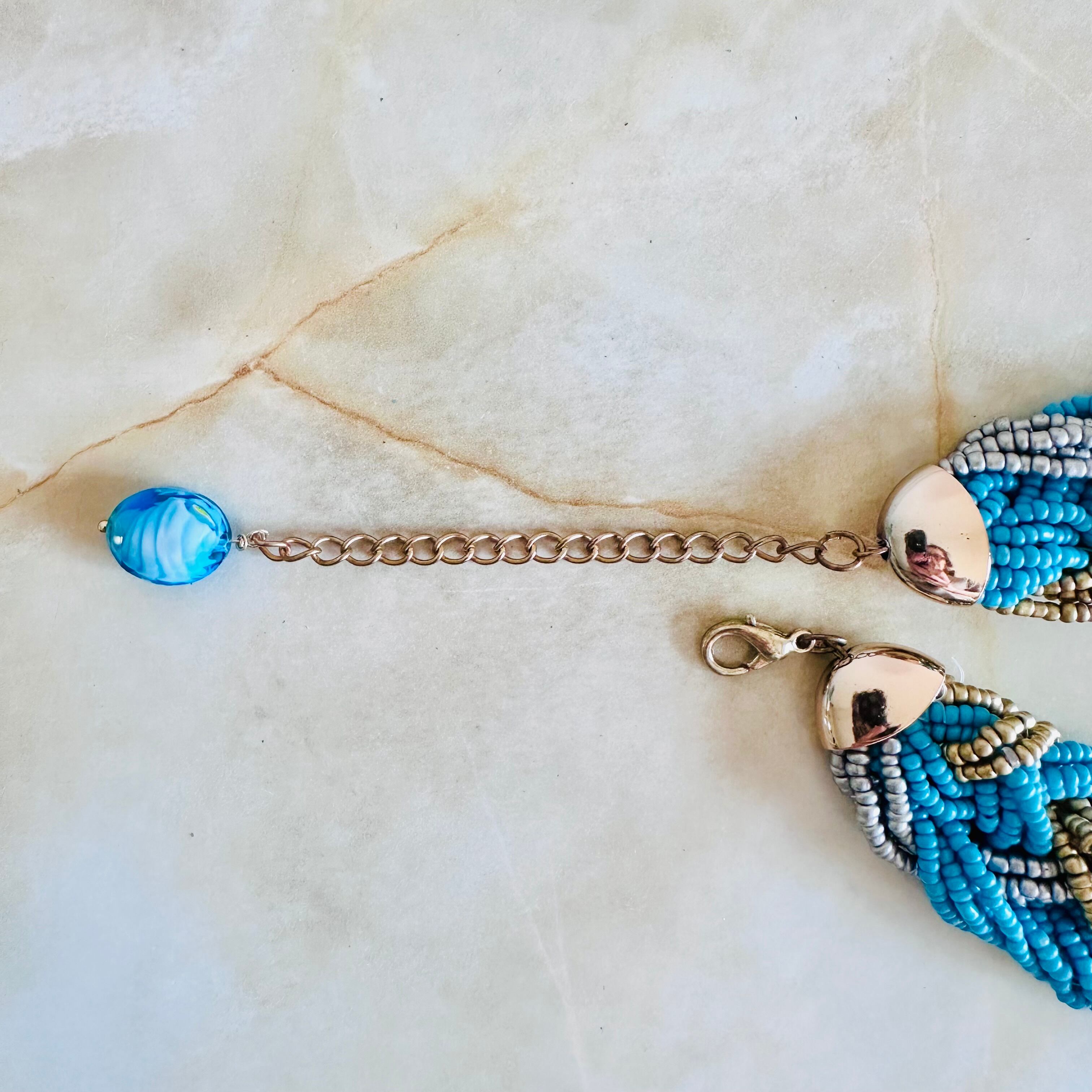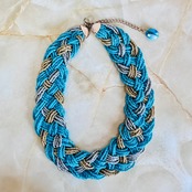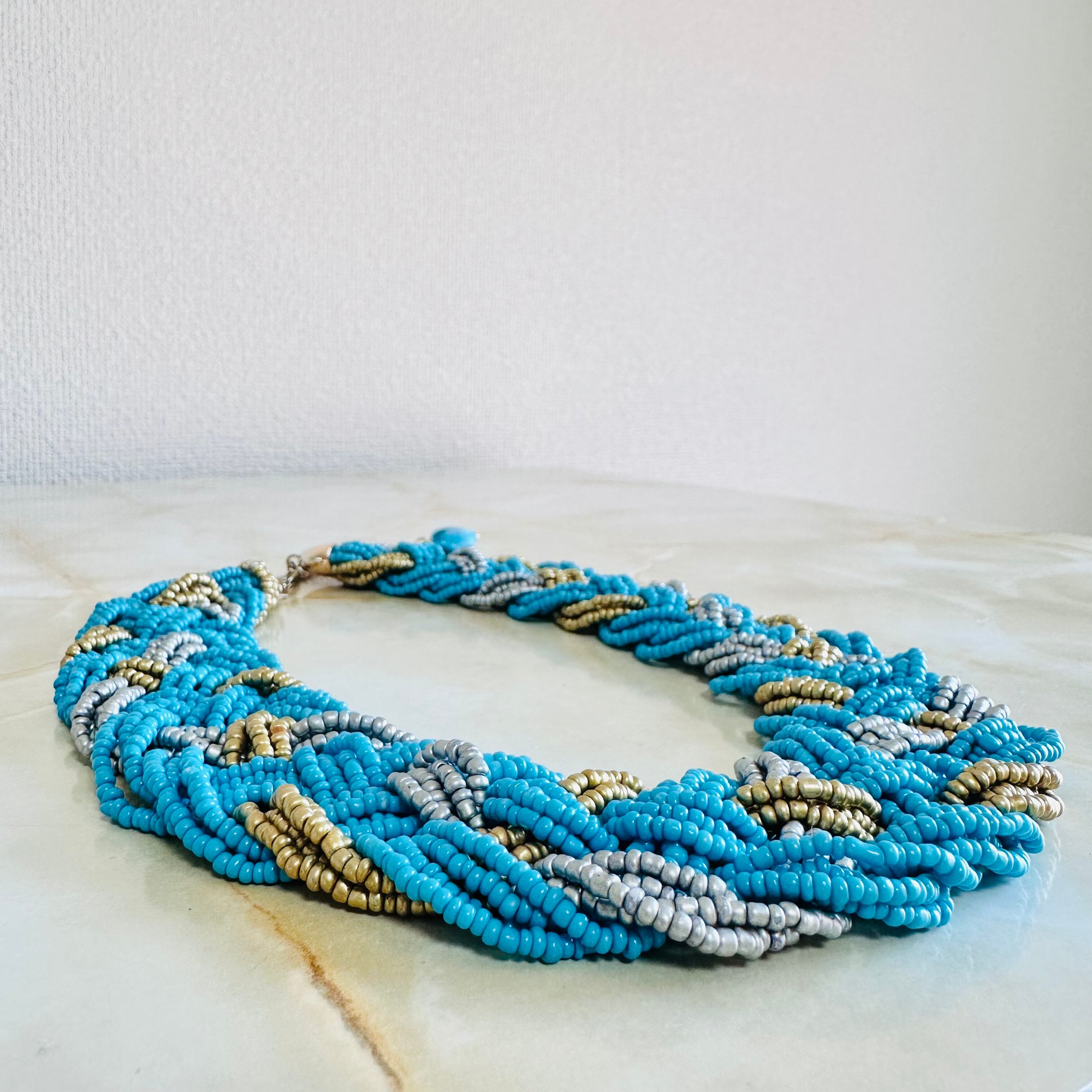 爽やかなターコイズブルーとゴールド、シルバーのビーズを編み上げたデザインです。