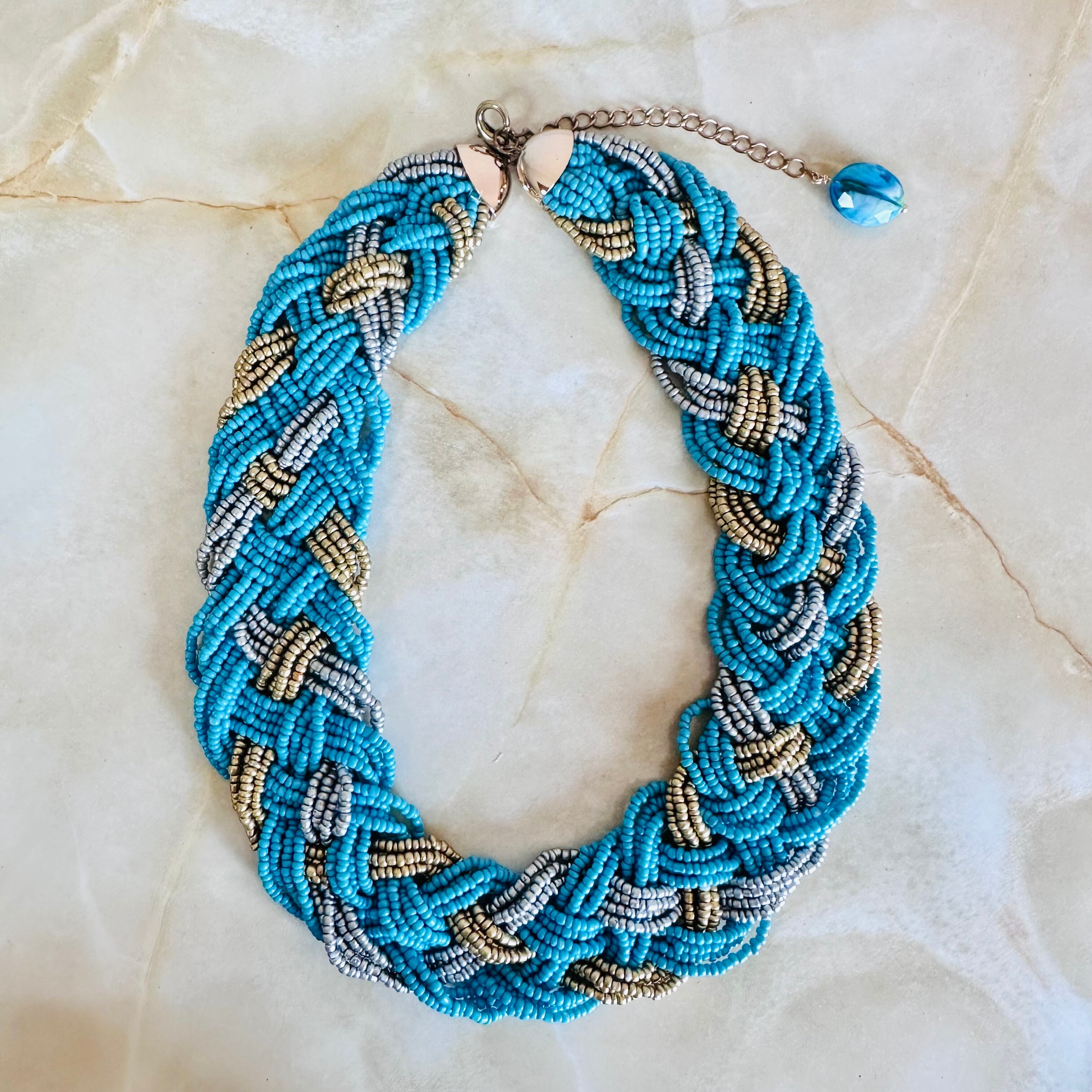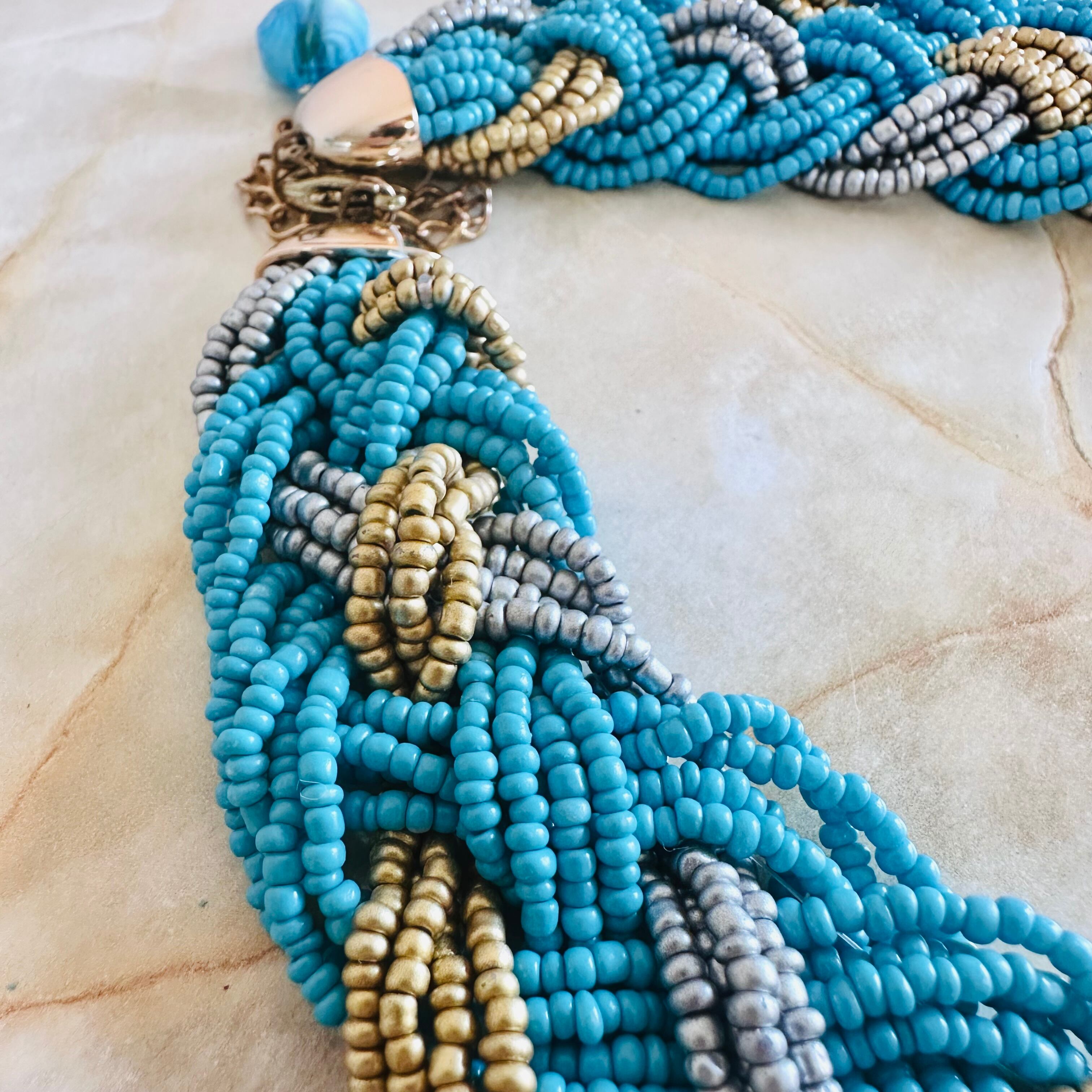 ターコイズブルー、ゴールド、シルバー✖️アンティークゴールドカラーのネックレスです。