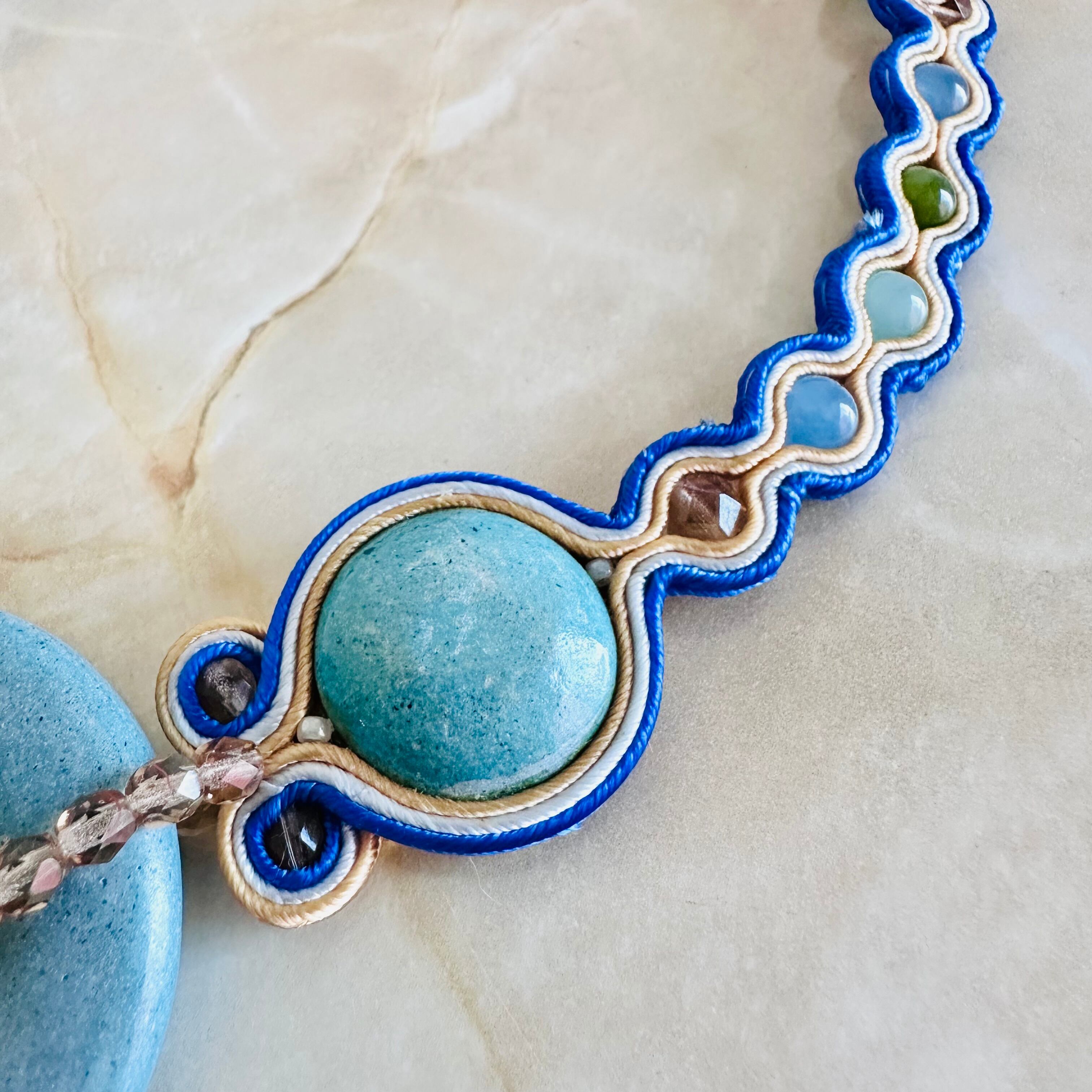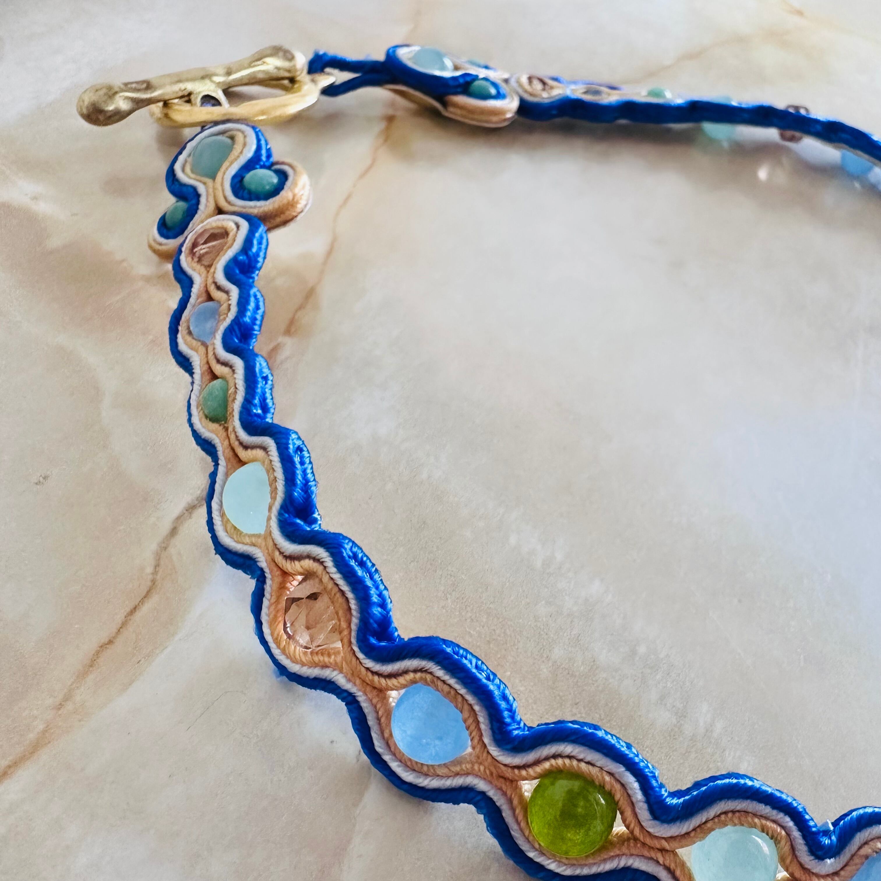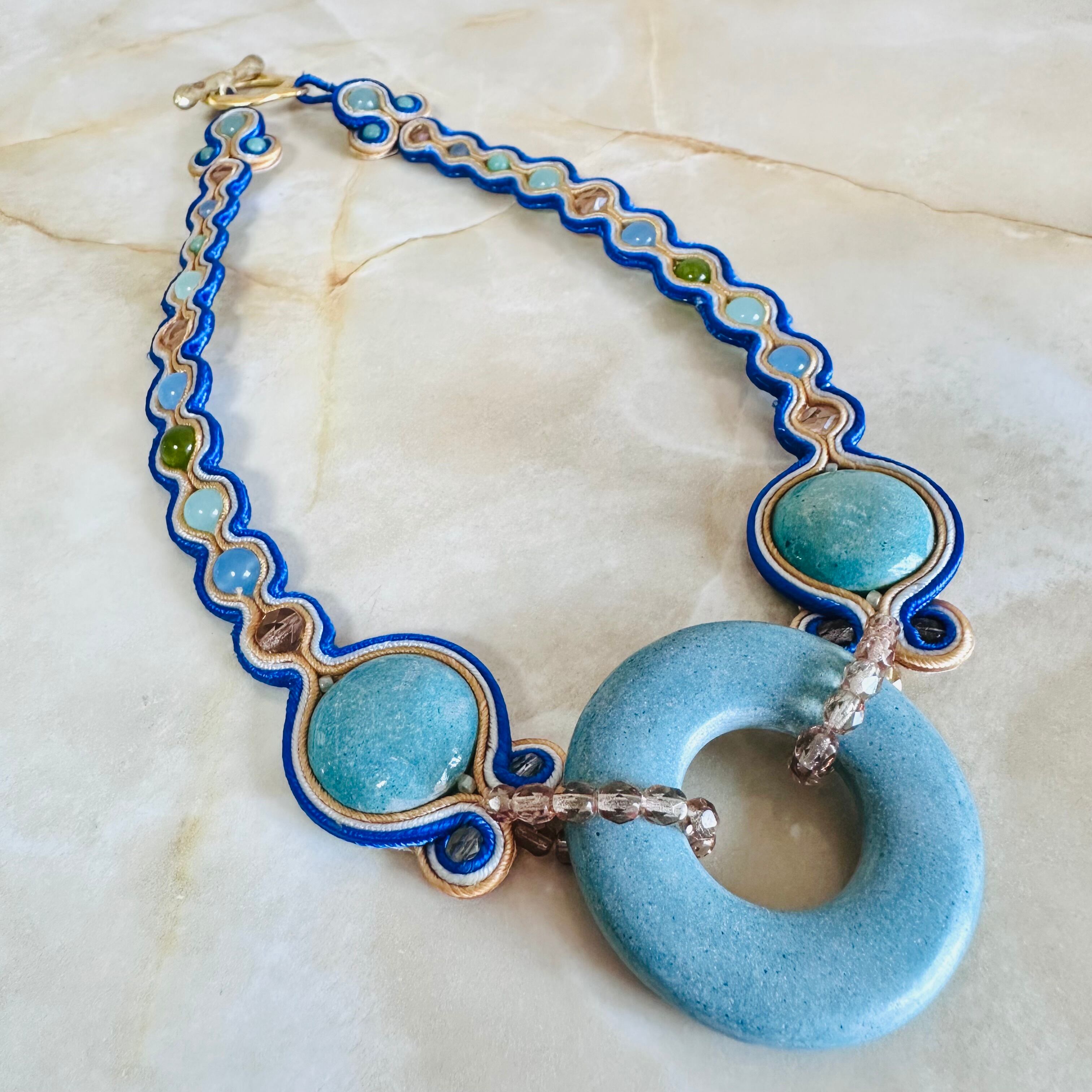 ターコイズブルー、マルチカラー✖️マットゴールドカラーのチョーカーネックレスです。