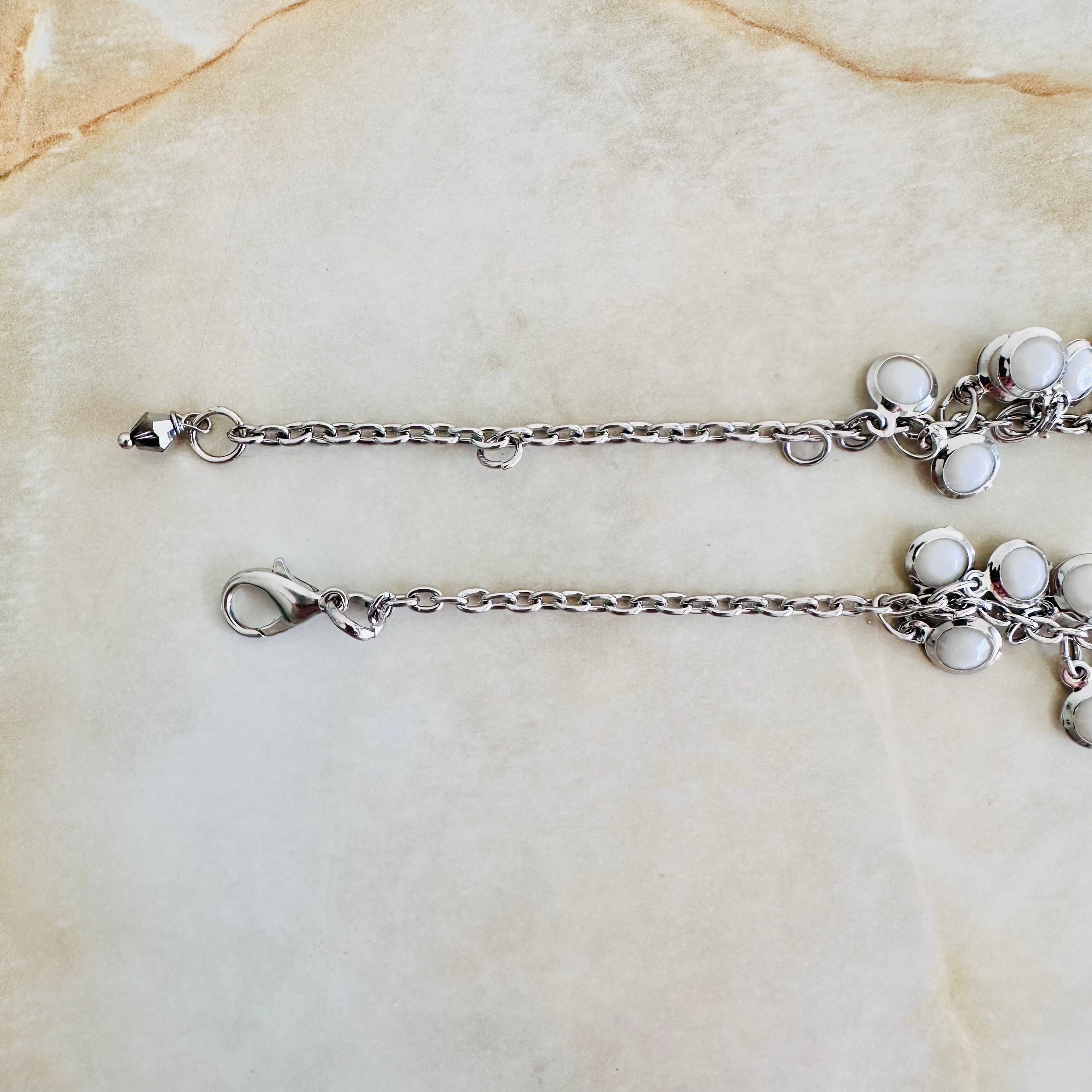 2色の白色のパーツを使用しフラワーモチーフを取り付けシルバーチェーンでスッキリとまとめたデザインです。