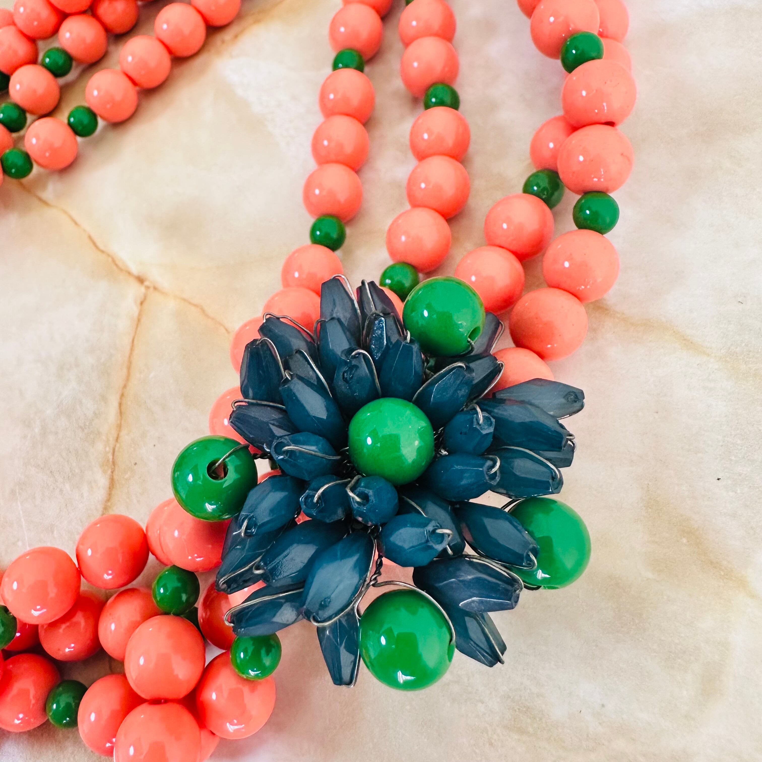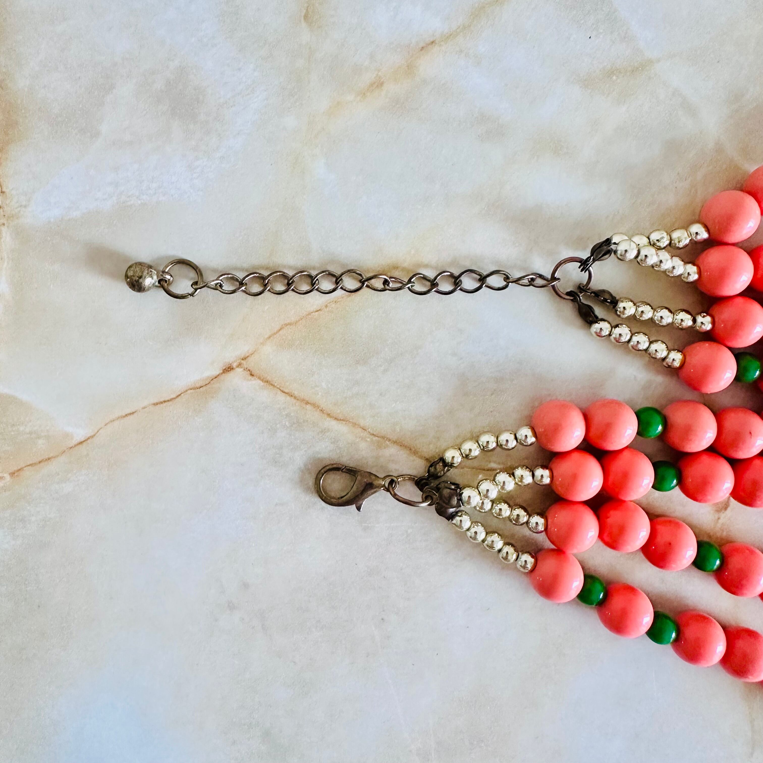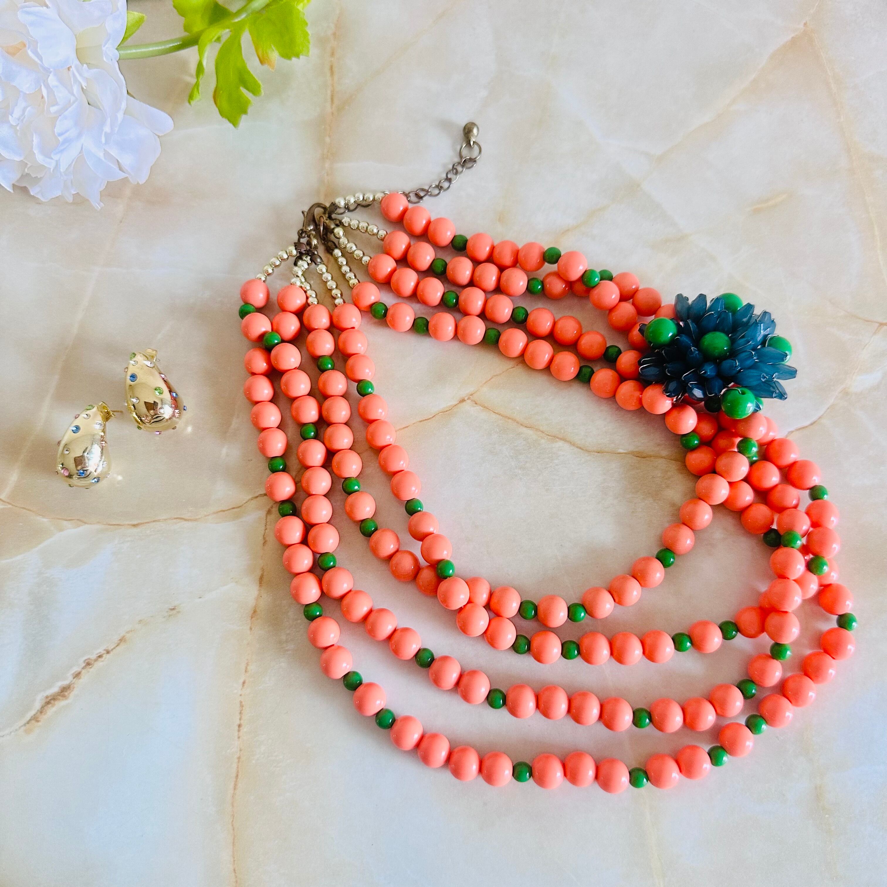 ポップなオレンジとグリーンのビーズを使用し、ユニークなフラワーモチーフでアクセントをつけたデザインです。