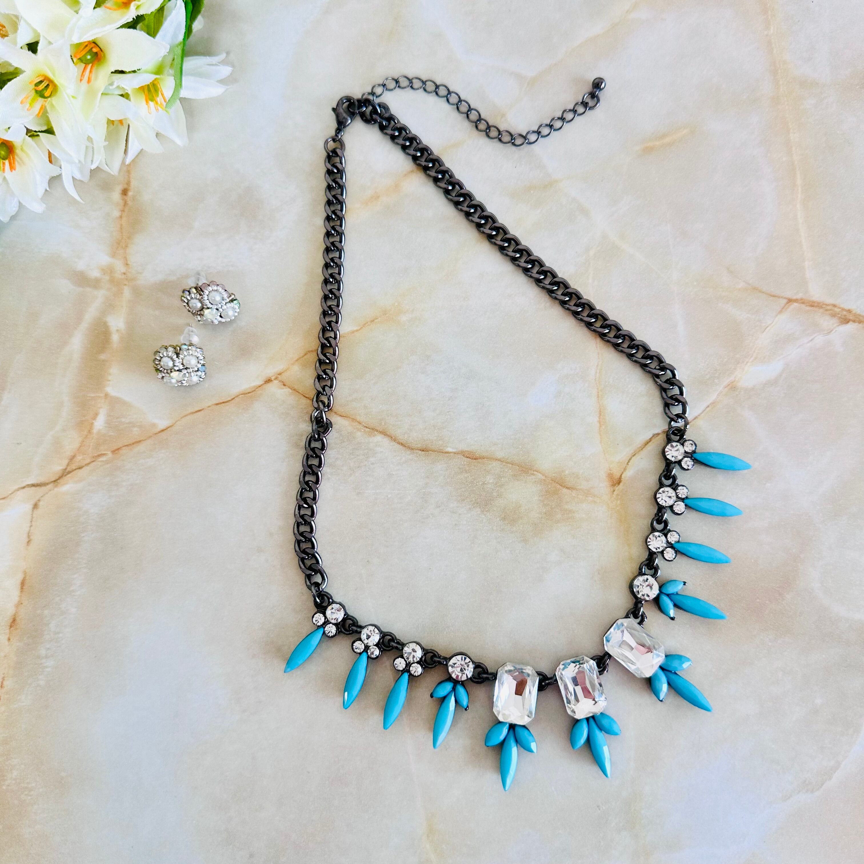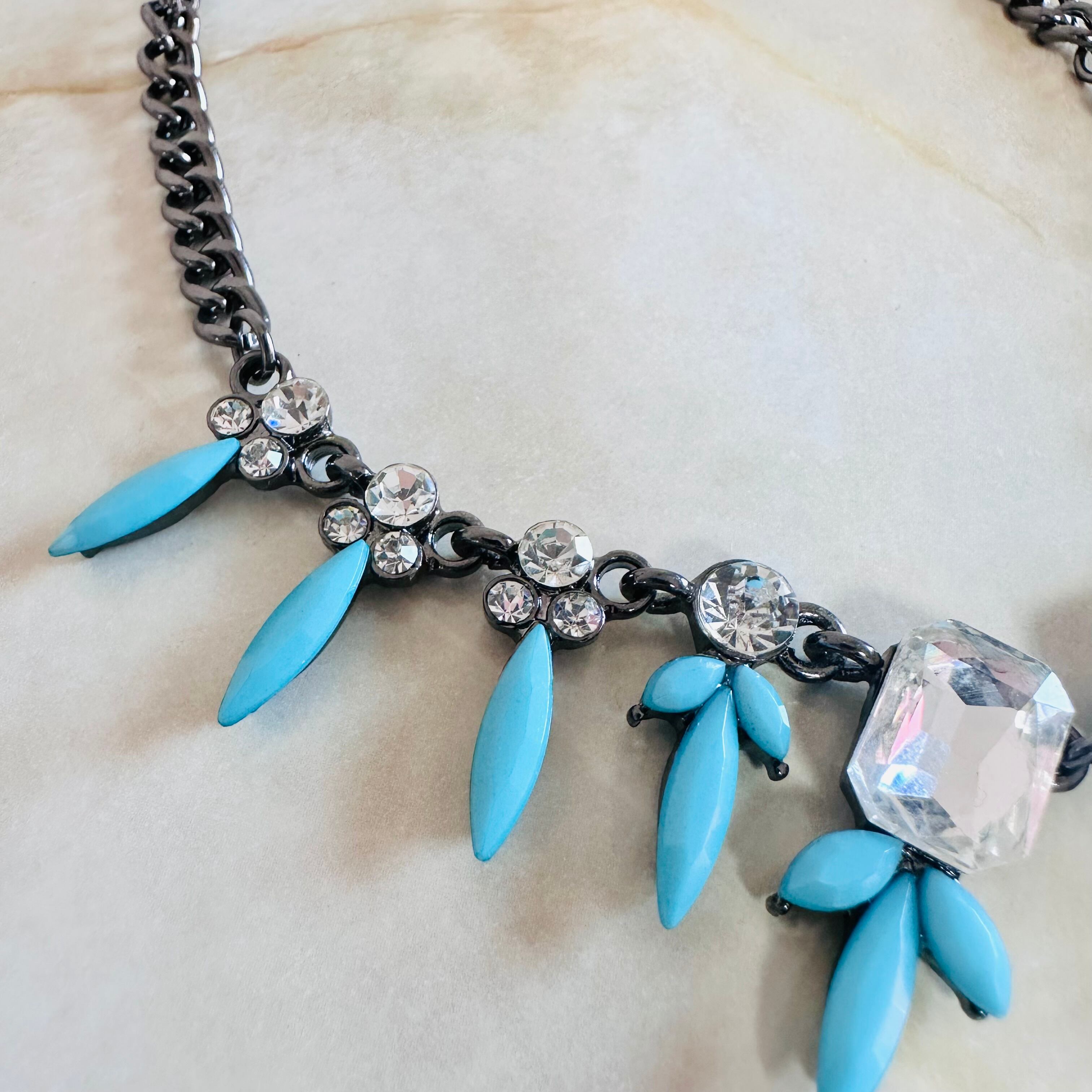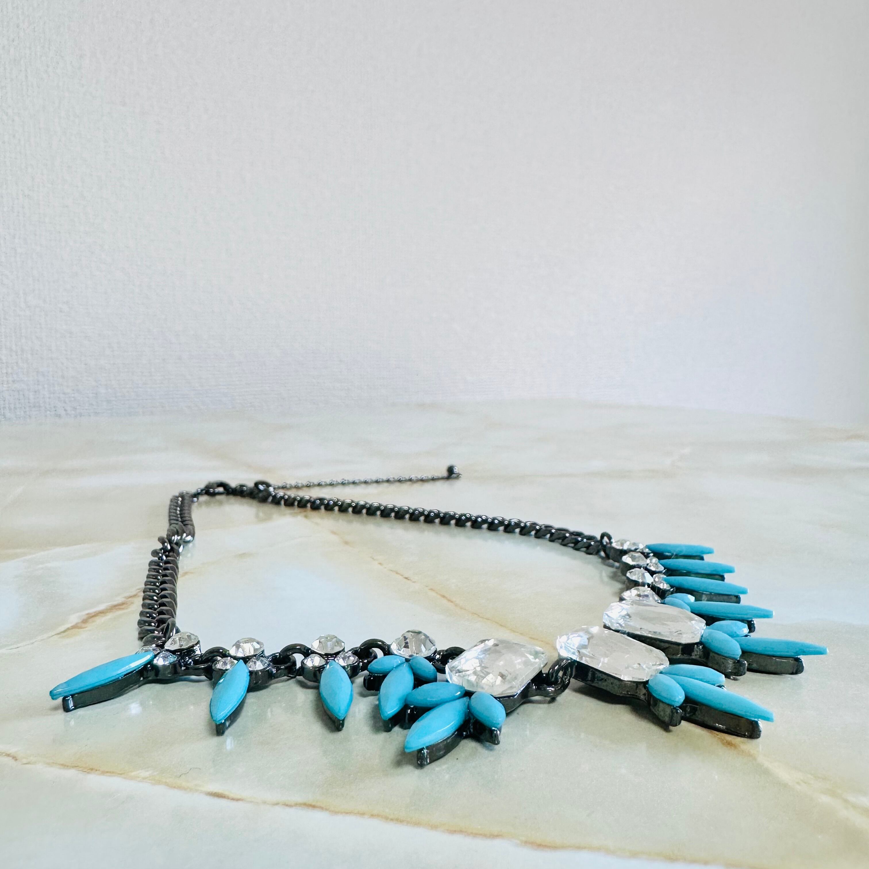 鮮やかなターコイズブルーのパーツにクリアビジューを合わせて、ブラックシルバーカラーのチェーンで引き締めたデザインです。