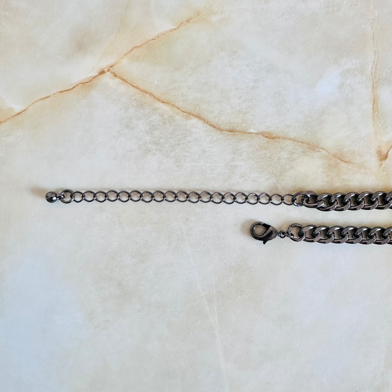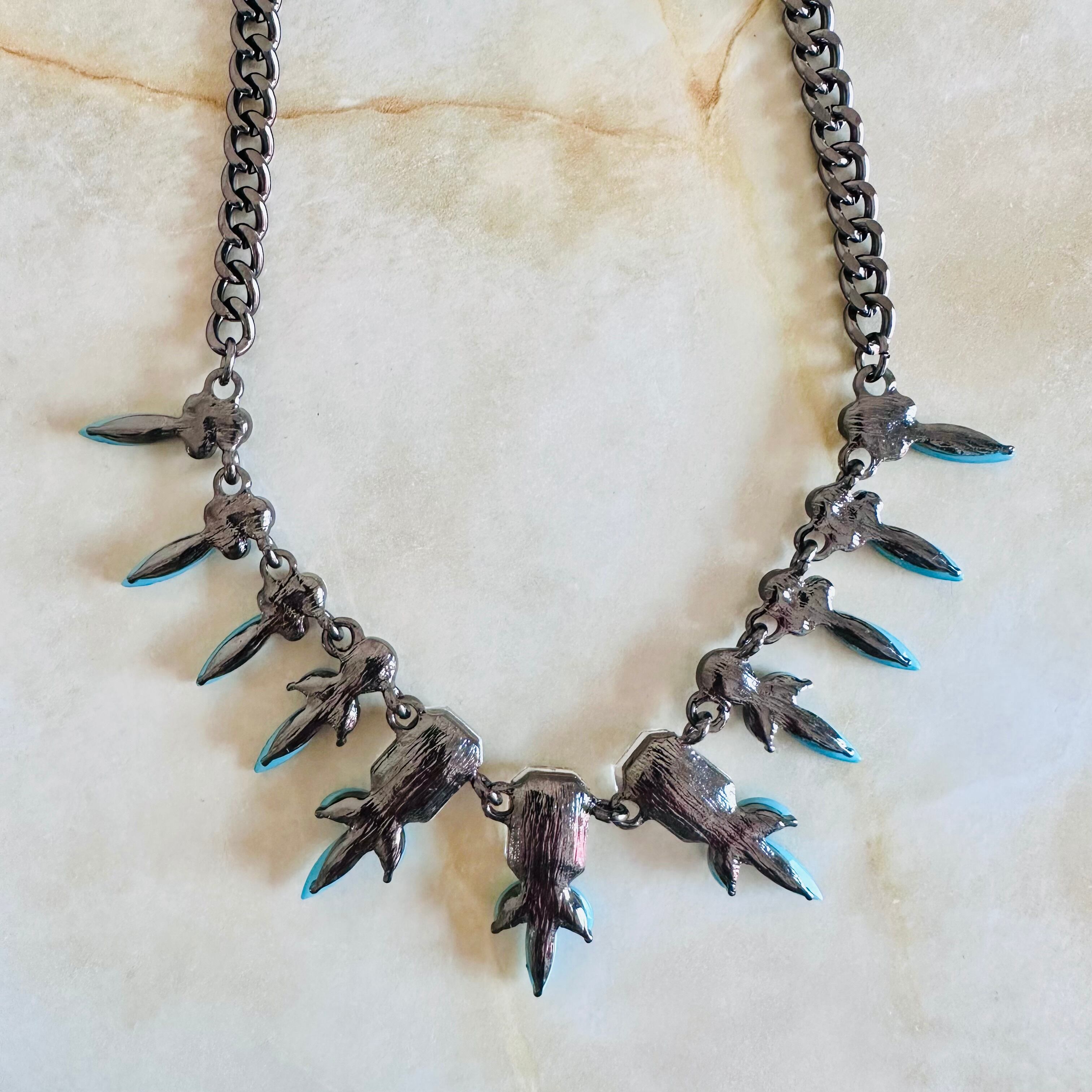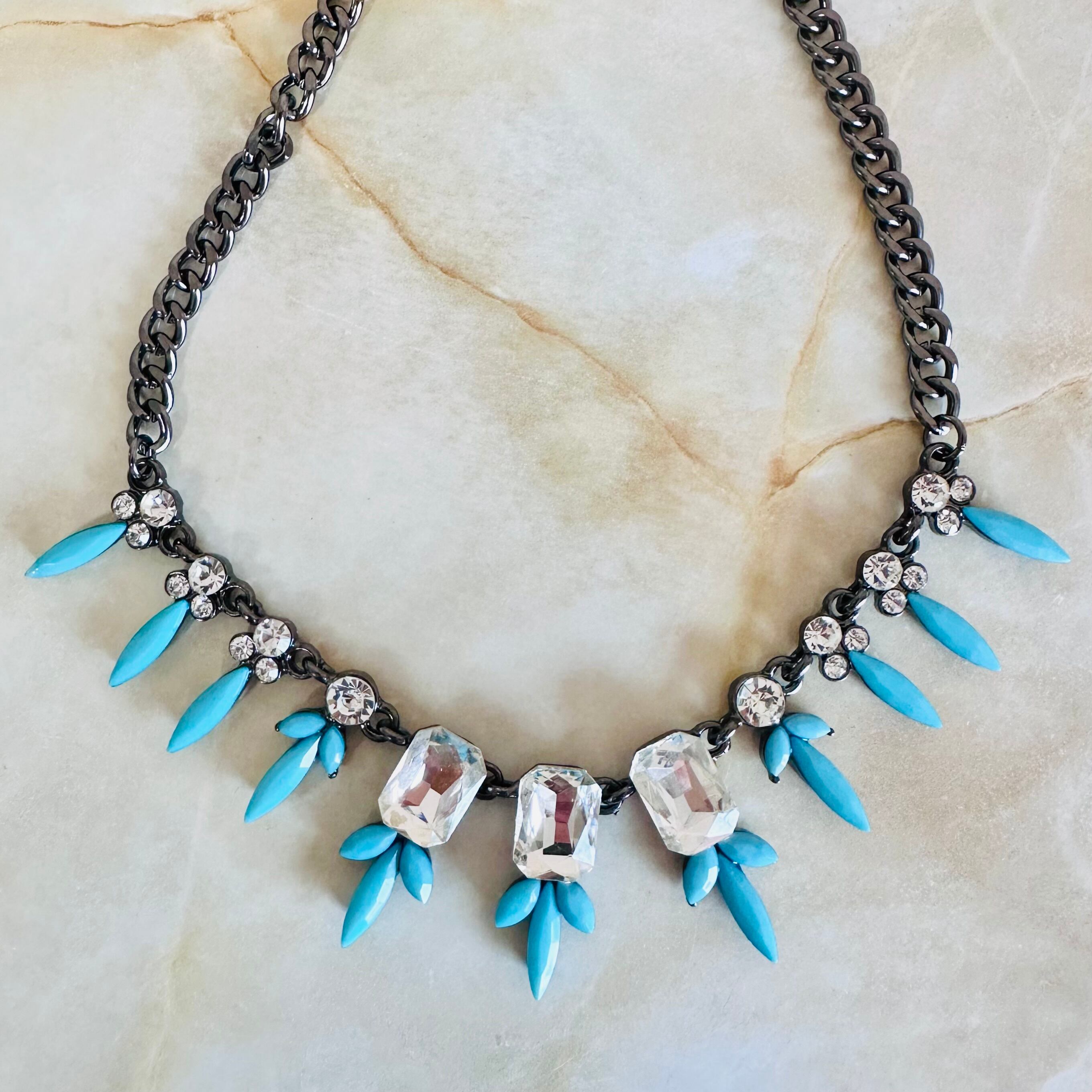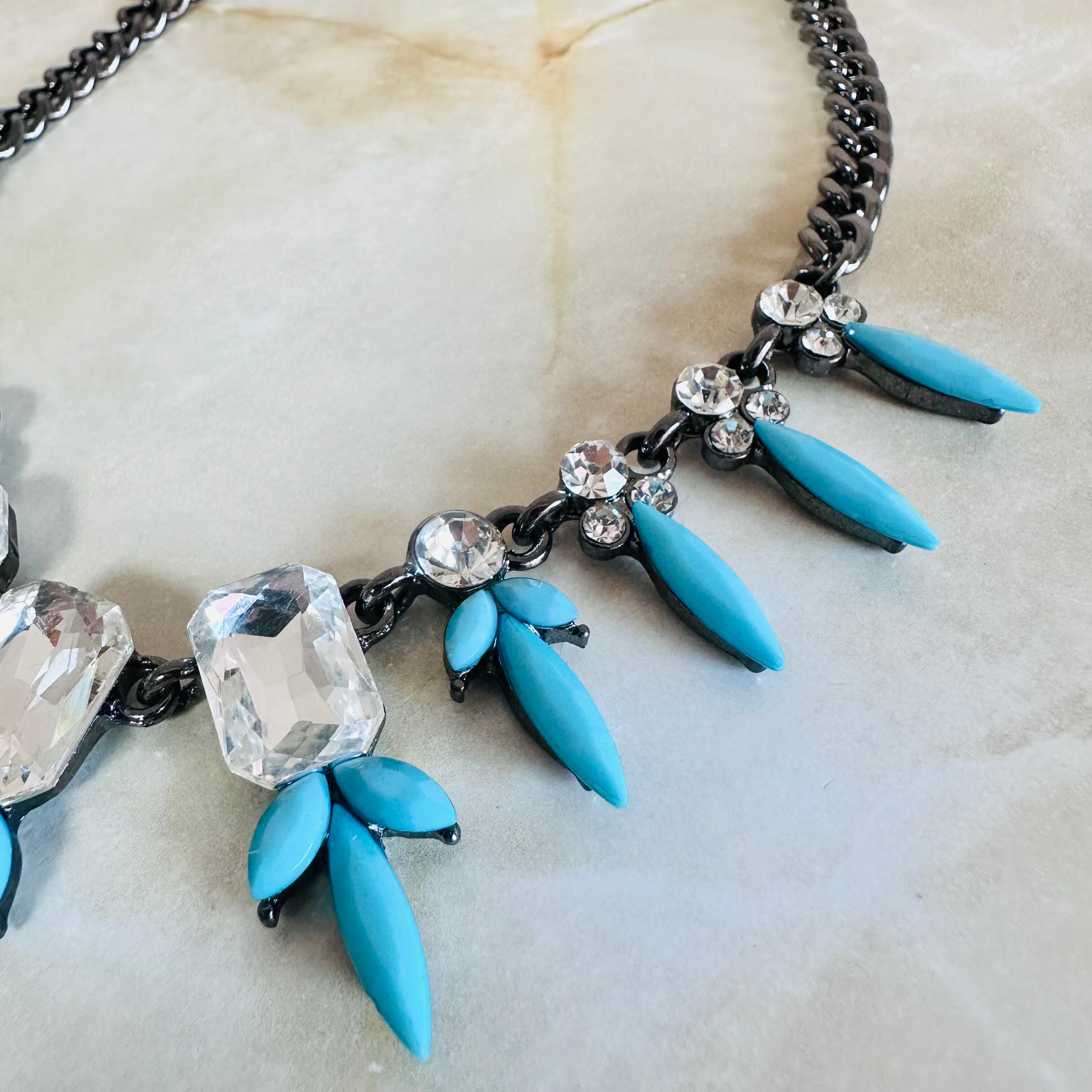 鮮やかなターコイズブルーのパーツにクリアビジューを合わせて、ブラックシルバーカラーのチェーンで引き締めたデザインです。