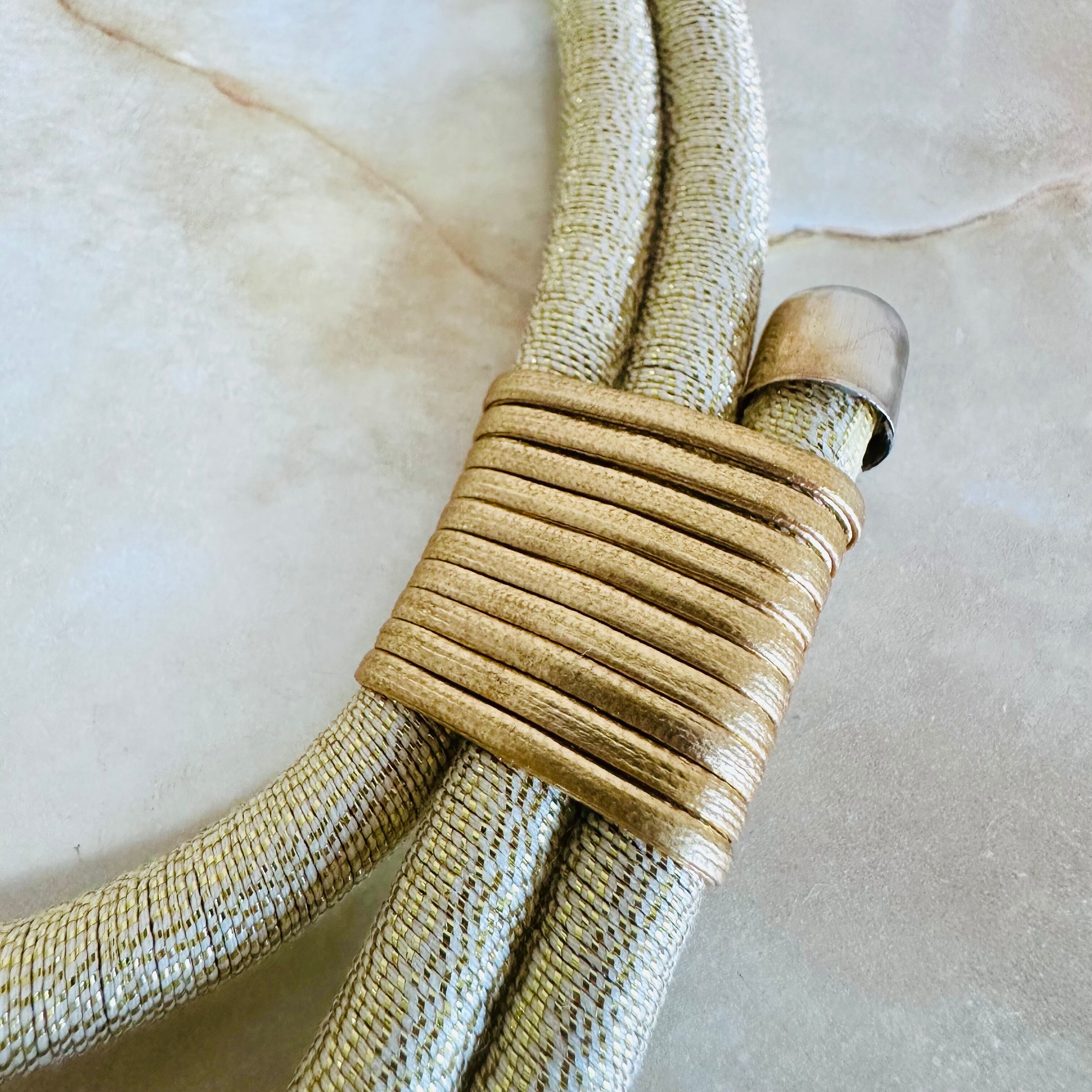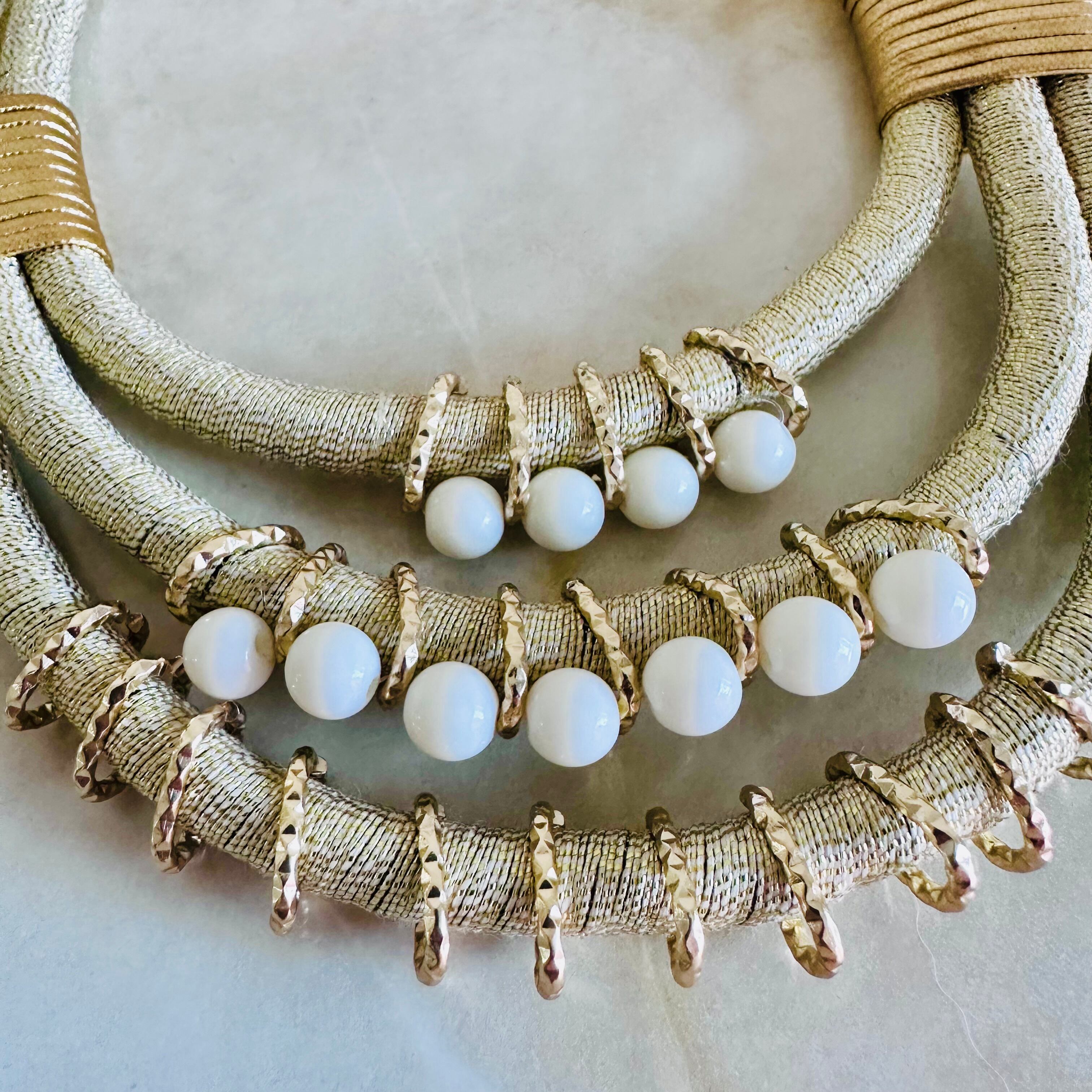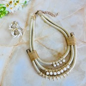 ゴールドのコードにアイボリーのビーズをプラスし、ユニークなデザインに仕上げたデザインです。