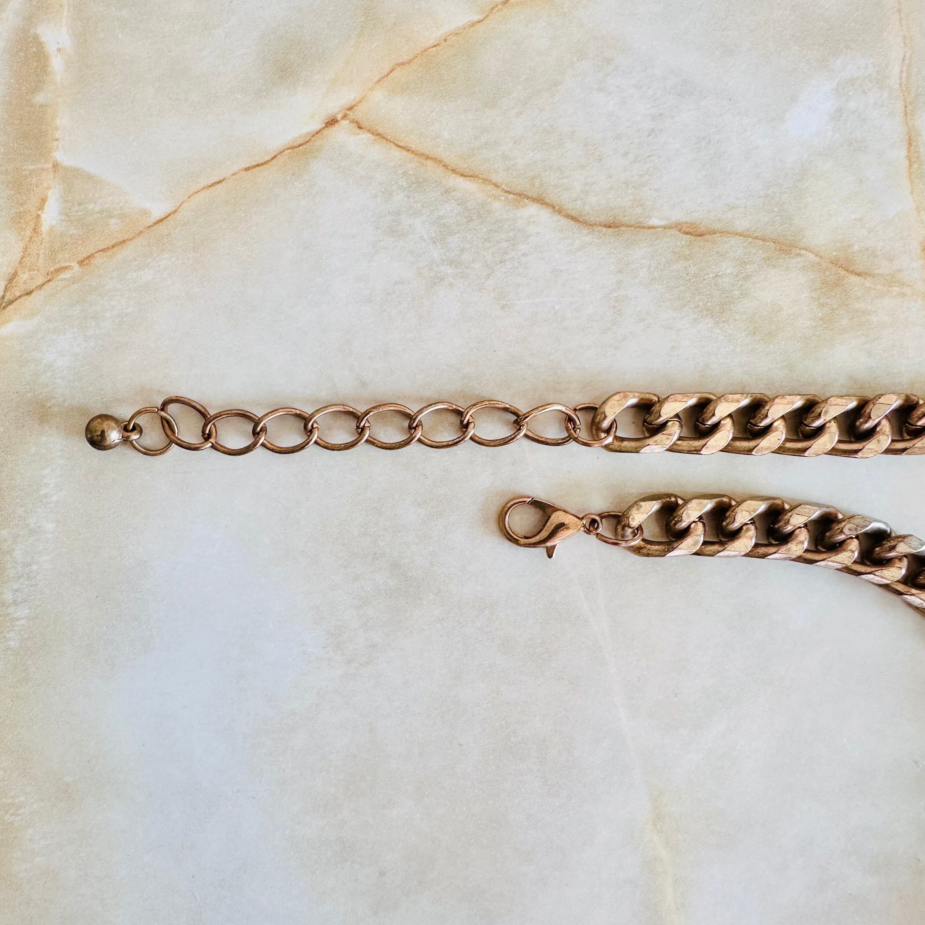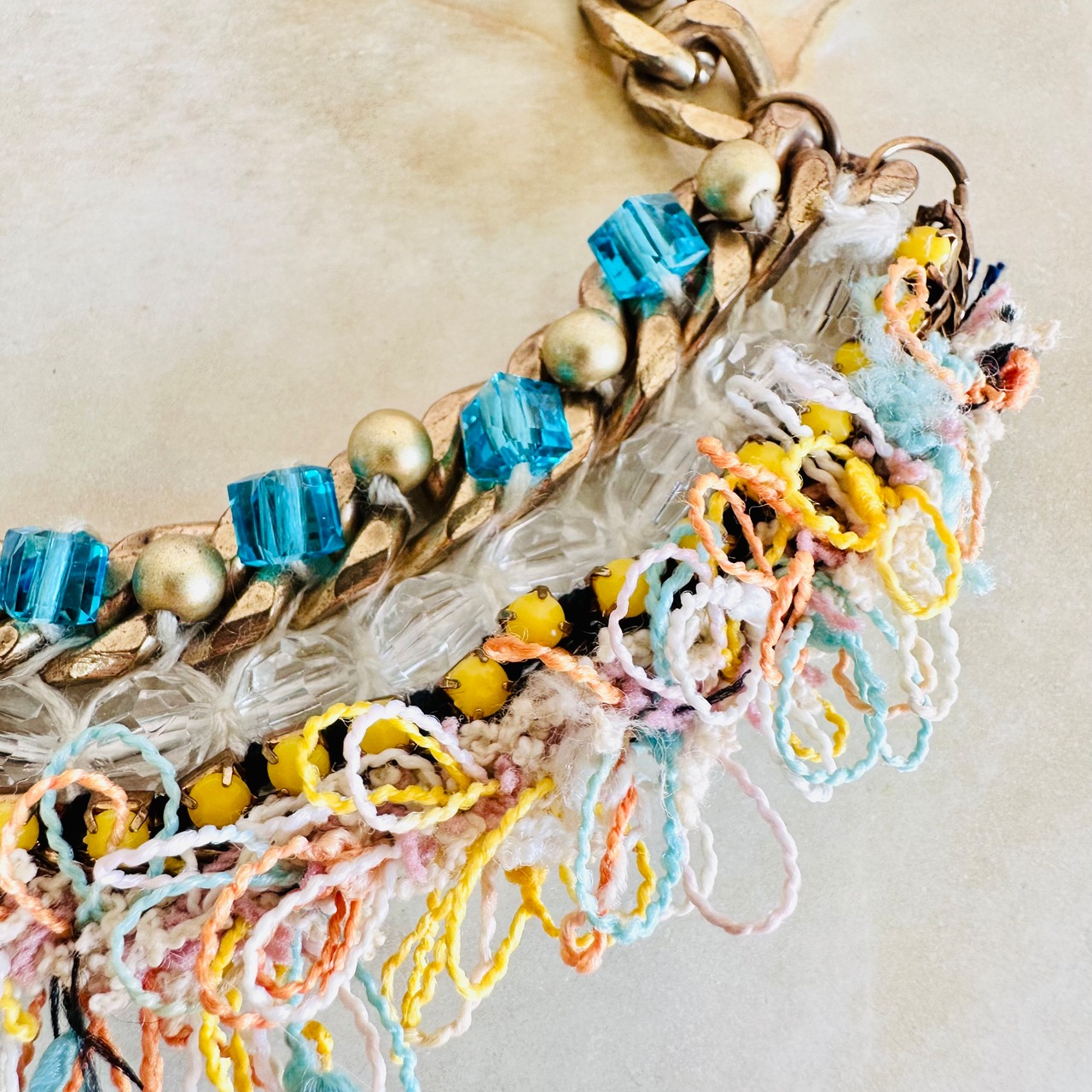 優しい色とりどりのコードを取り付けカラフルでキュートなモチーフをアンティークゴールドカラーのチャンキーチェーンで大人っぽく仕上げました。