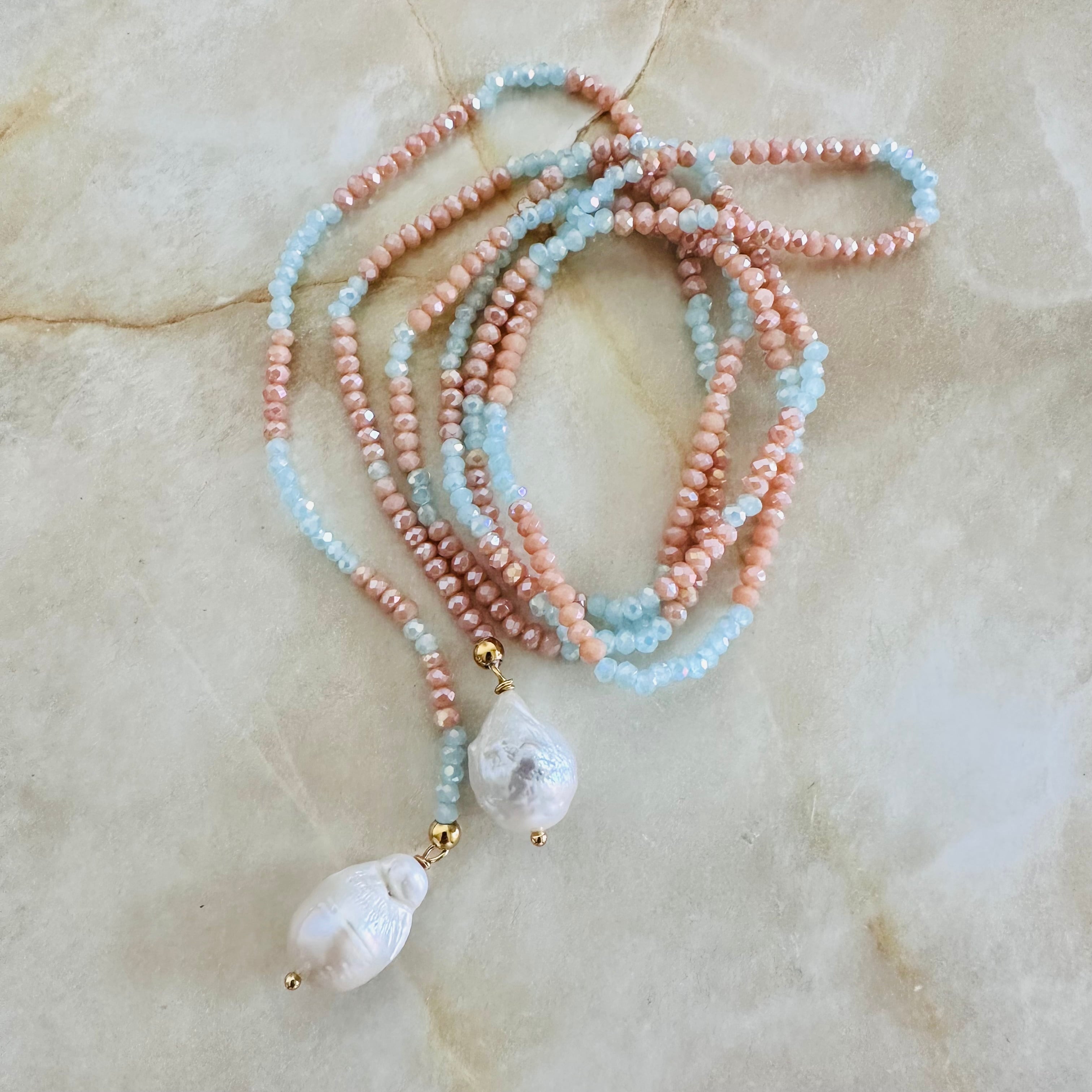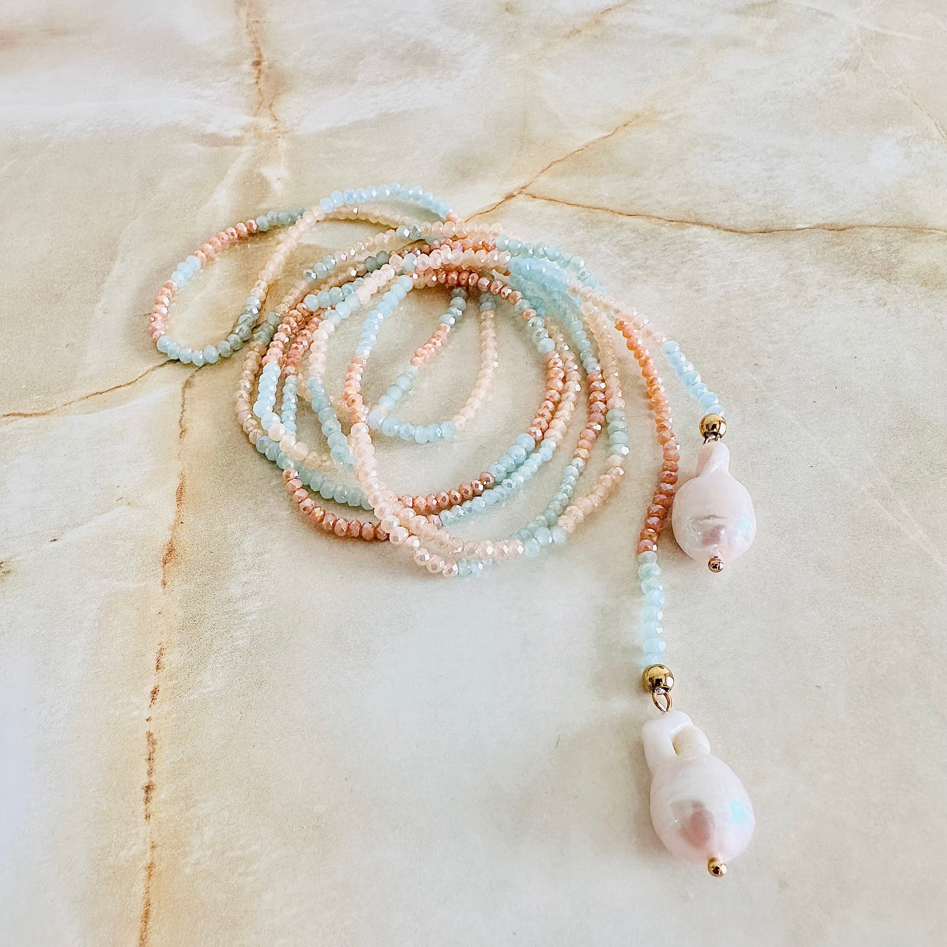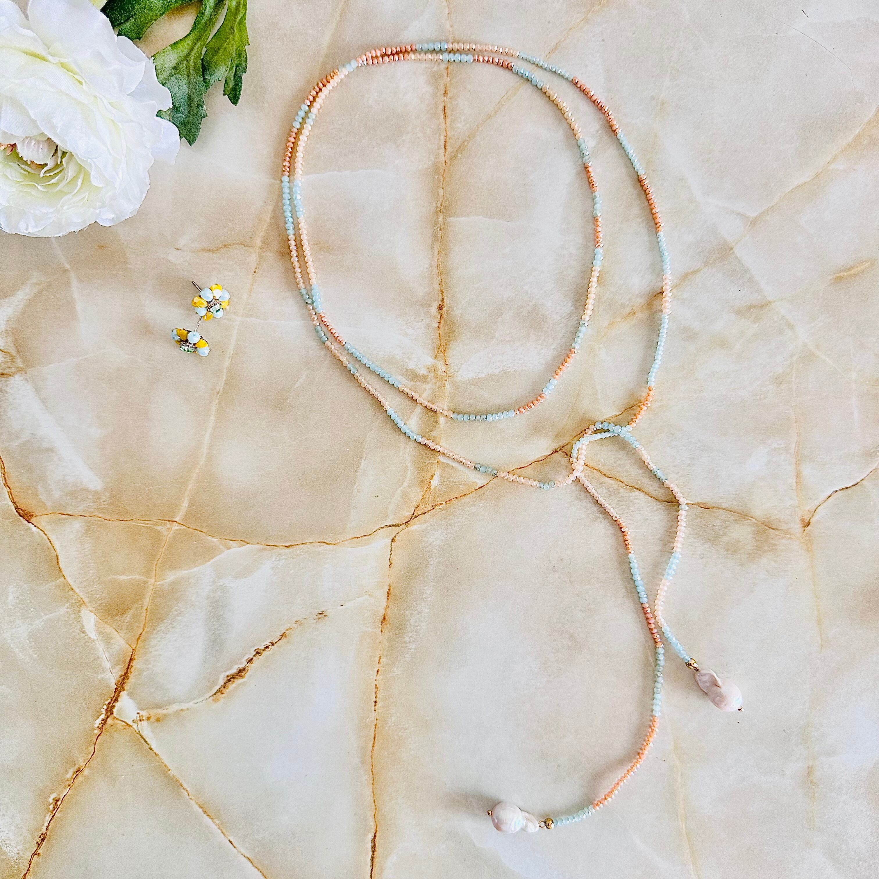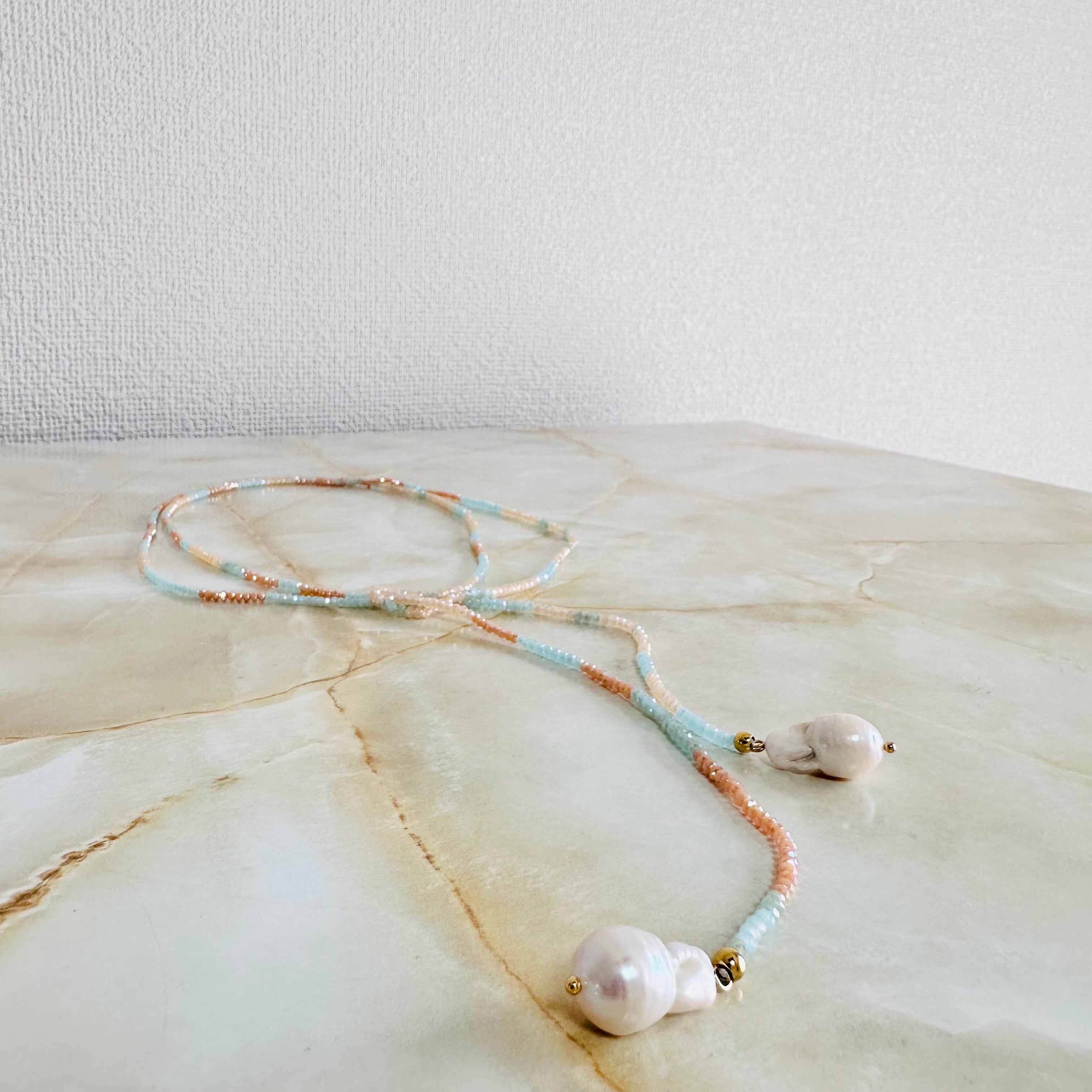 優しいブルー、オレンジ、ベージュの繊細なガラスビーズに大粒の天然淡水パールをプラスした、おしゃれなラリエットデザインです。