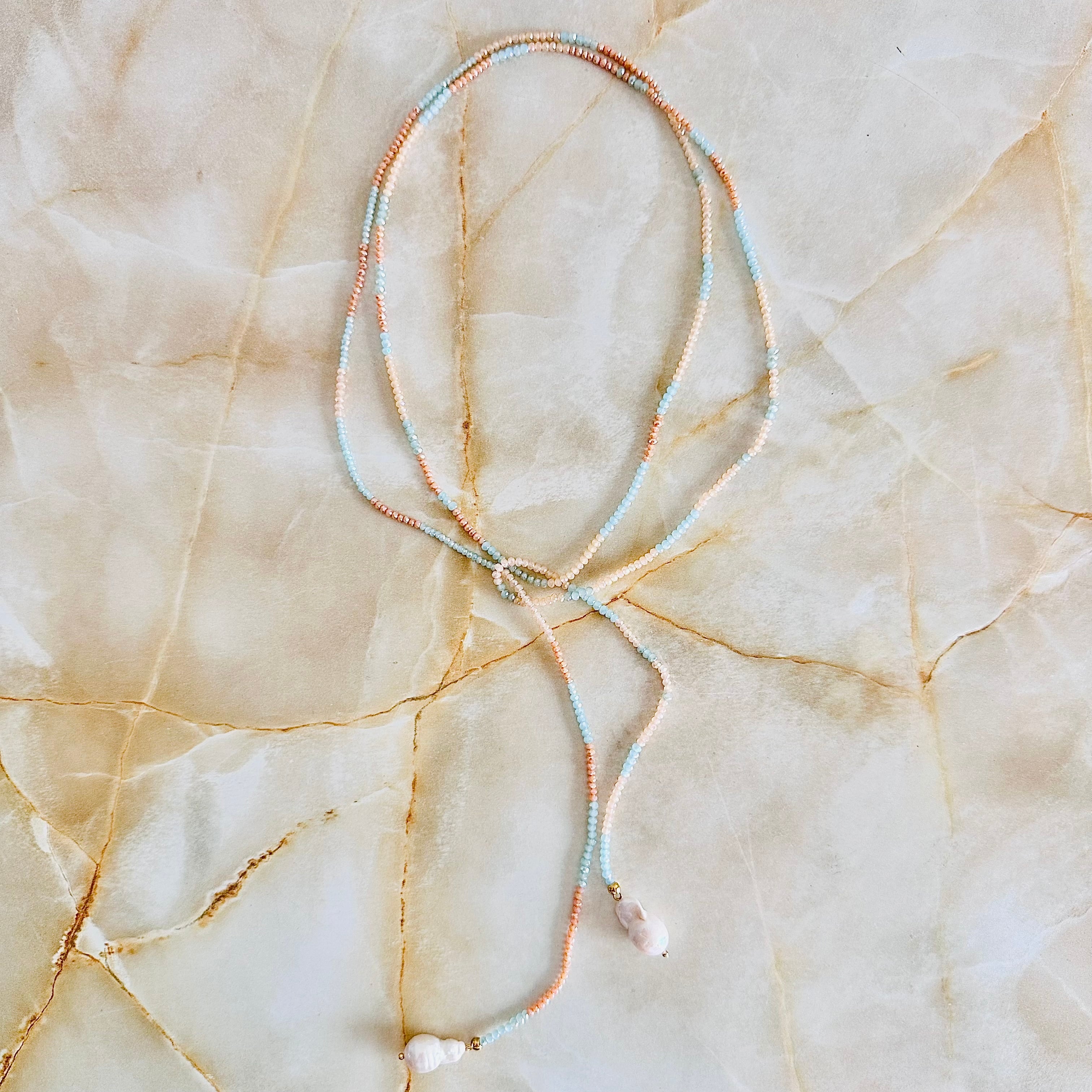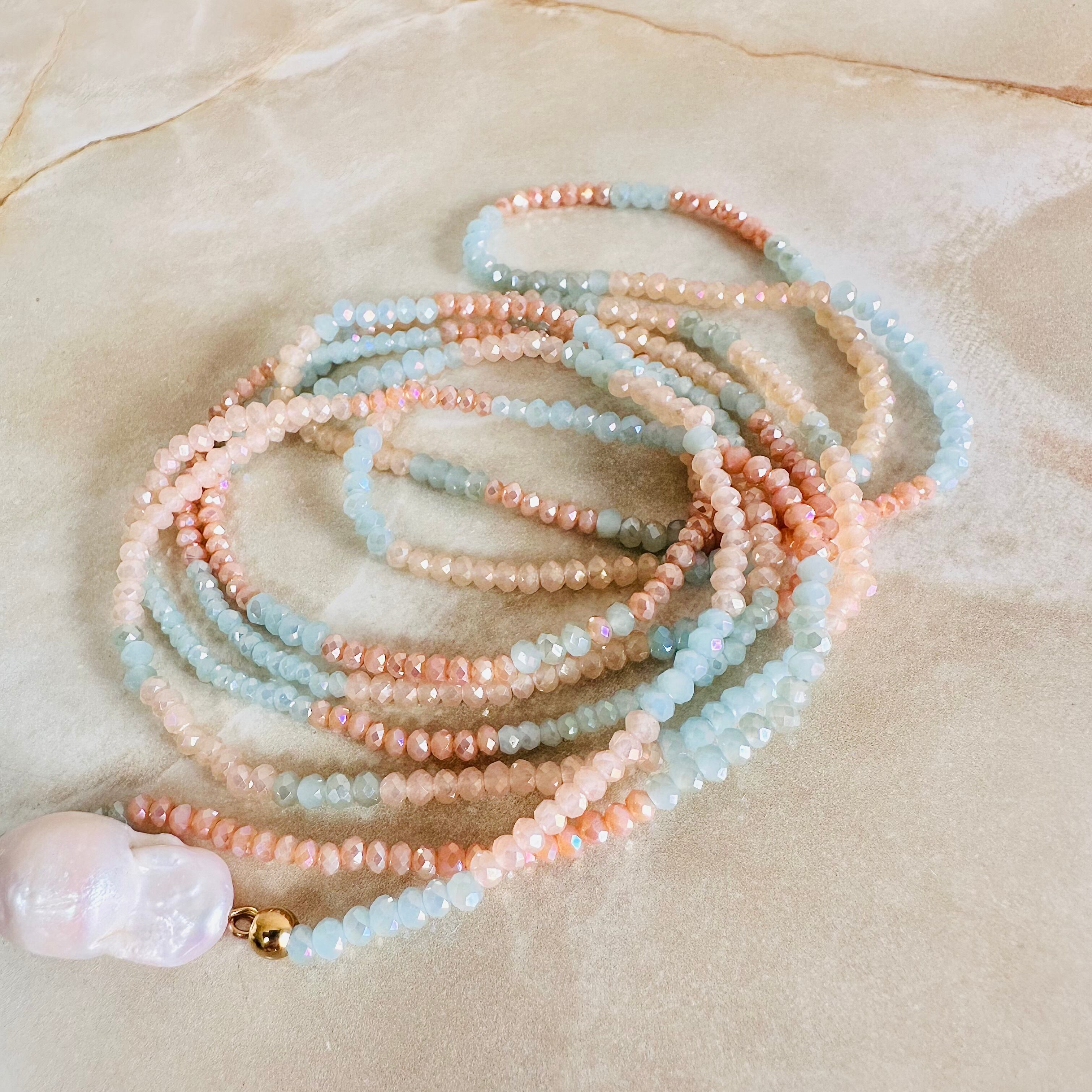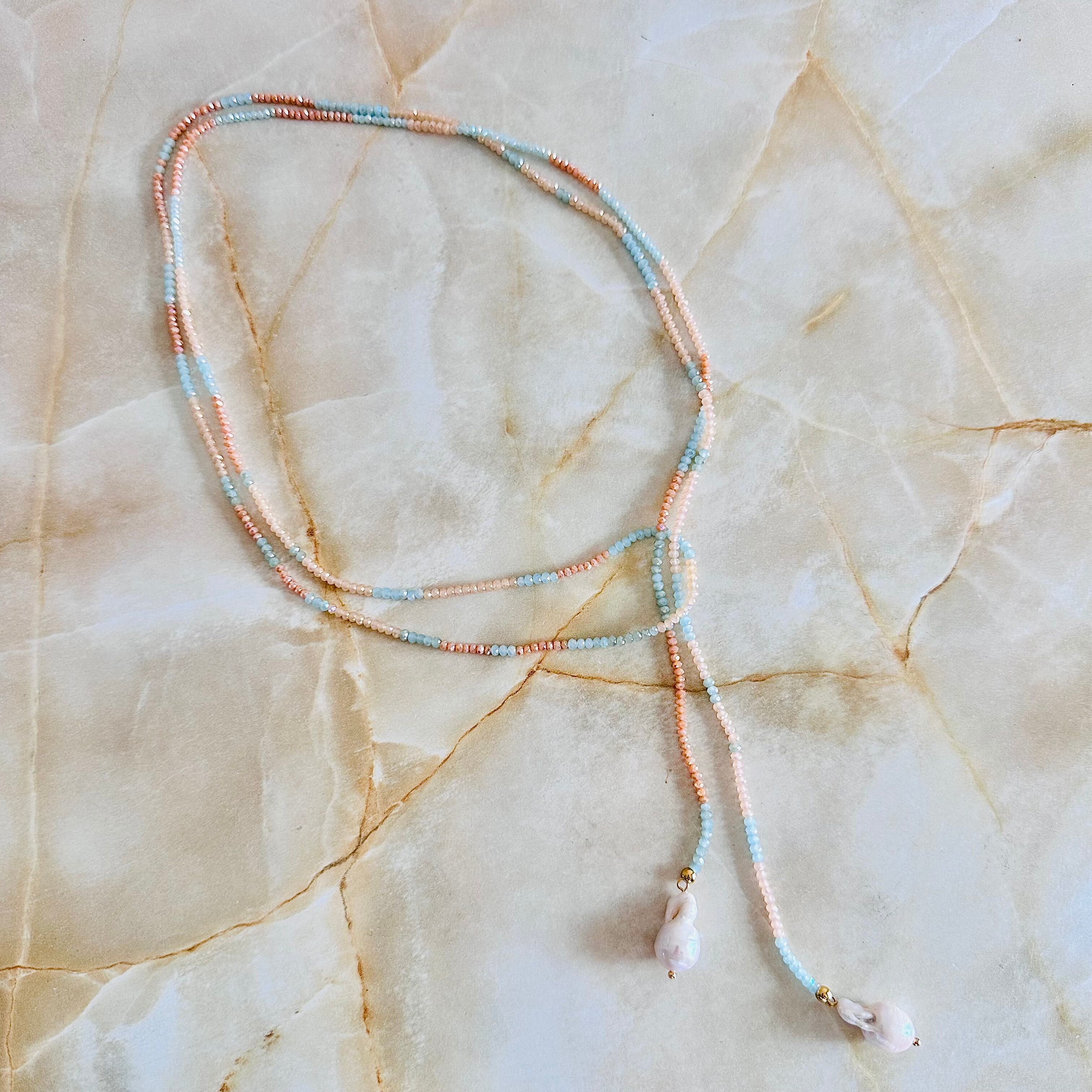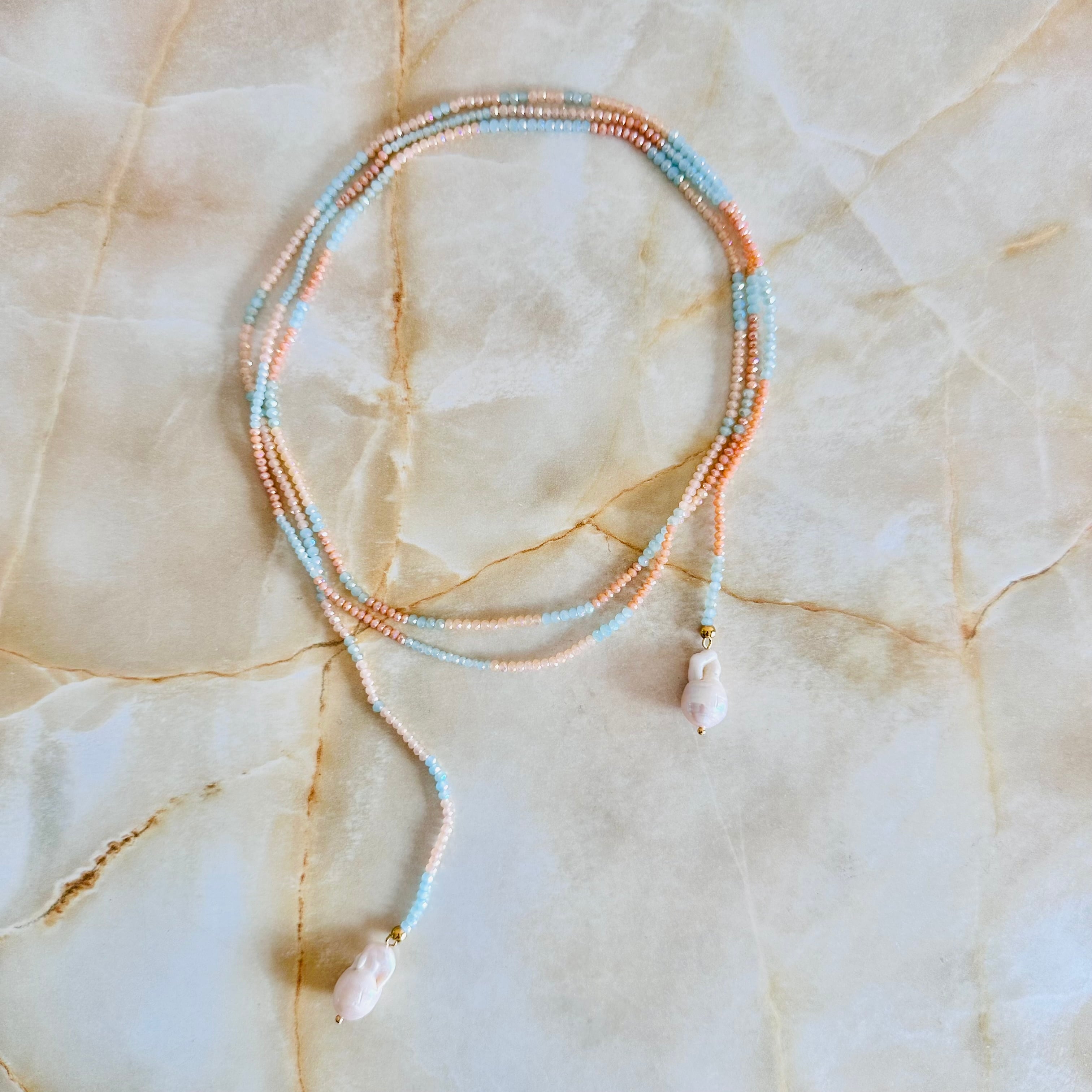 優しいブルー、オレンジ、ベージュの繊細なガラスビーズに大粒の天然淡水パールをプラスした、おしゃれなラリエットデザインです。