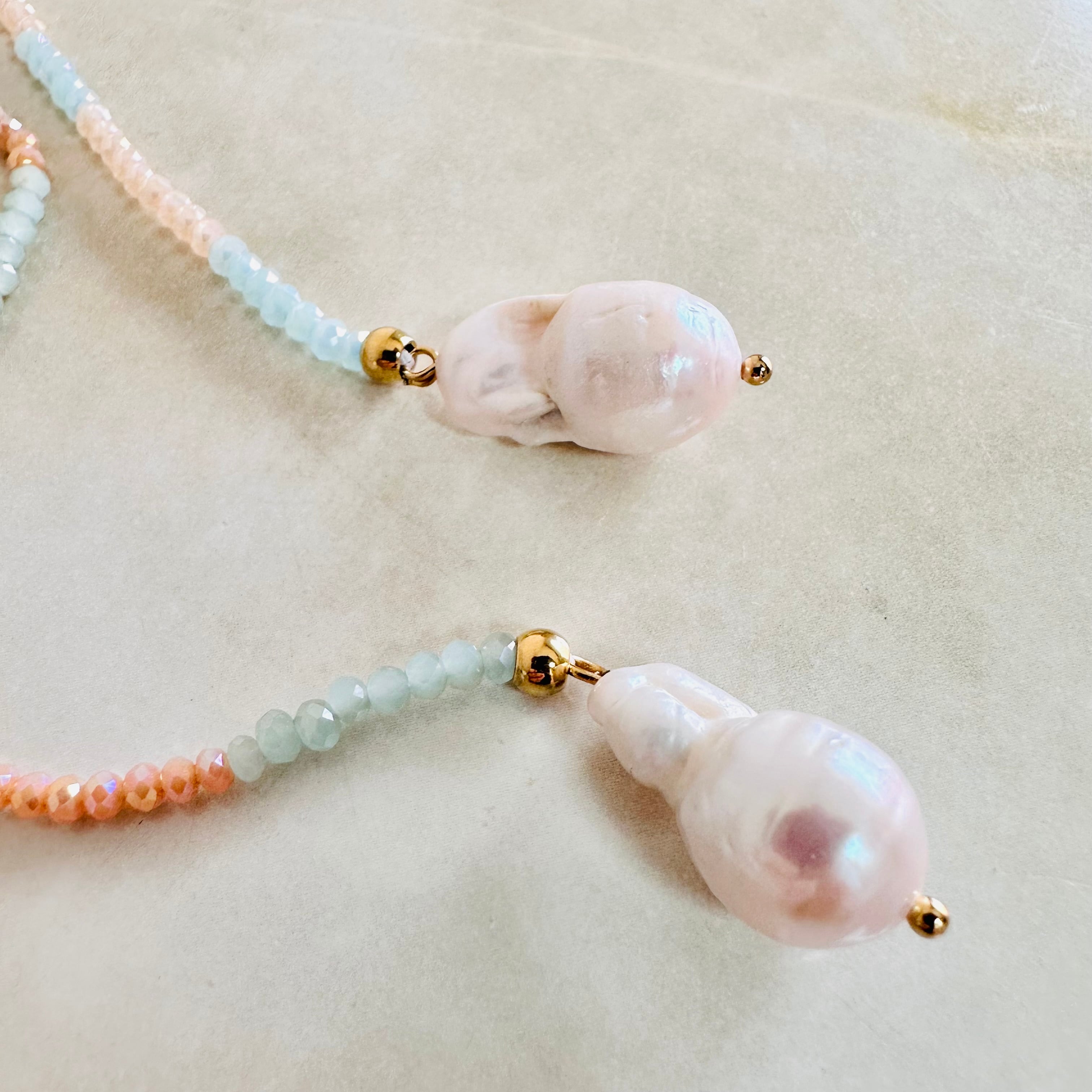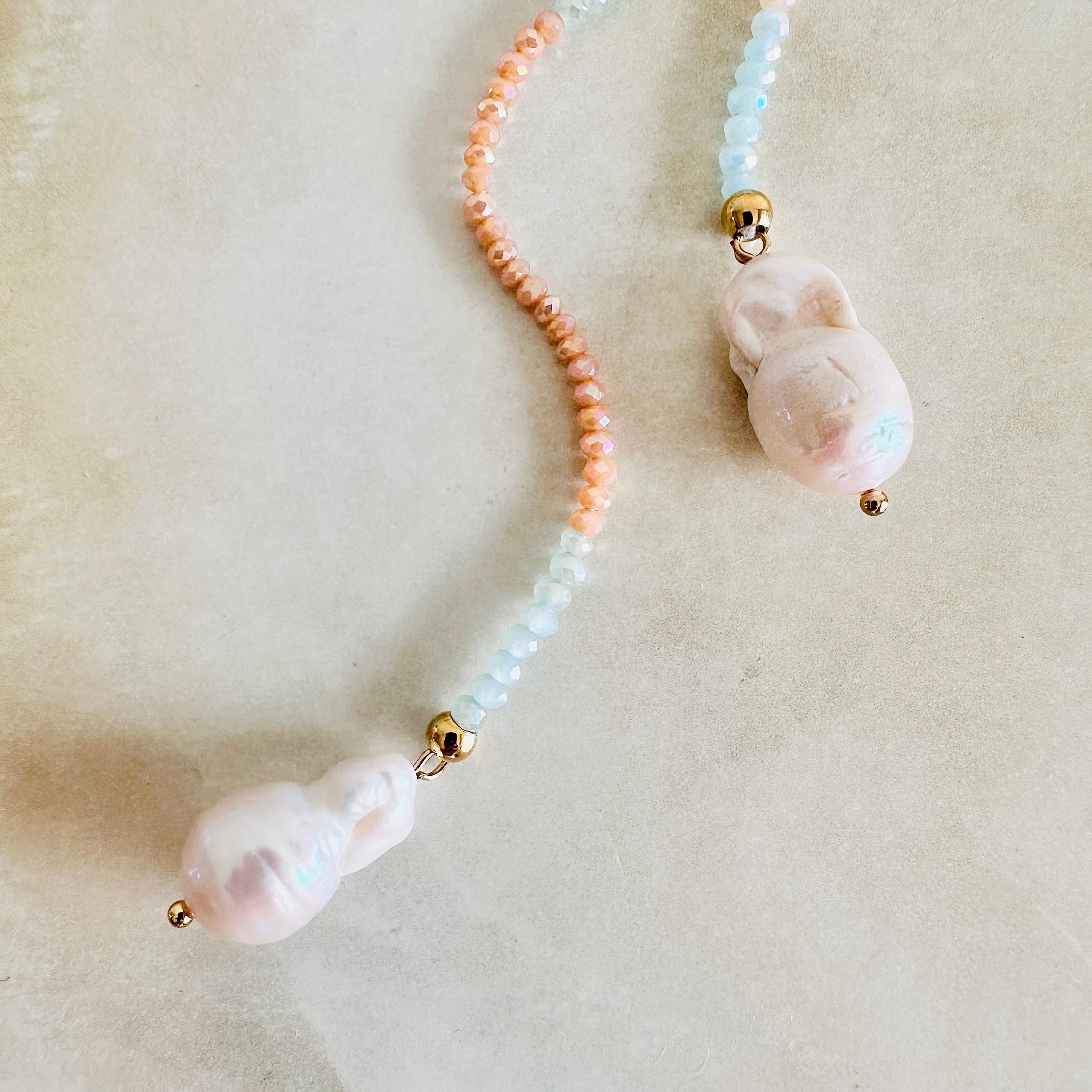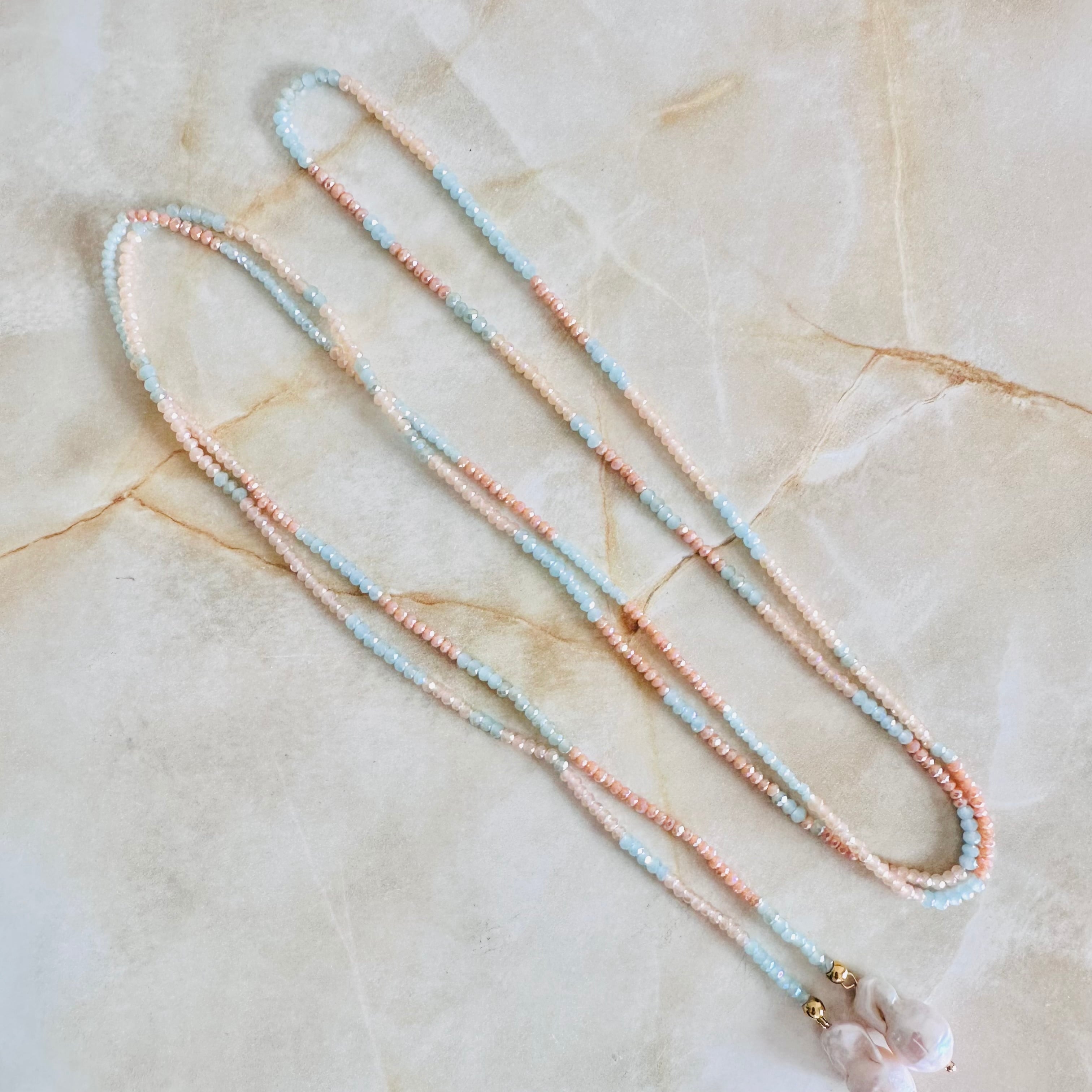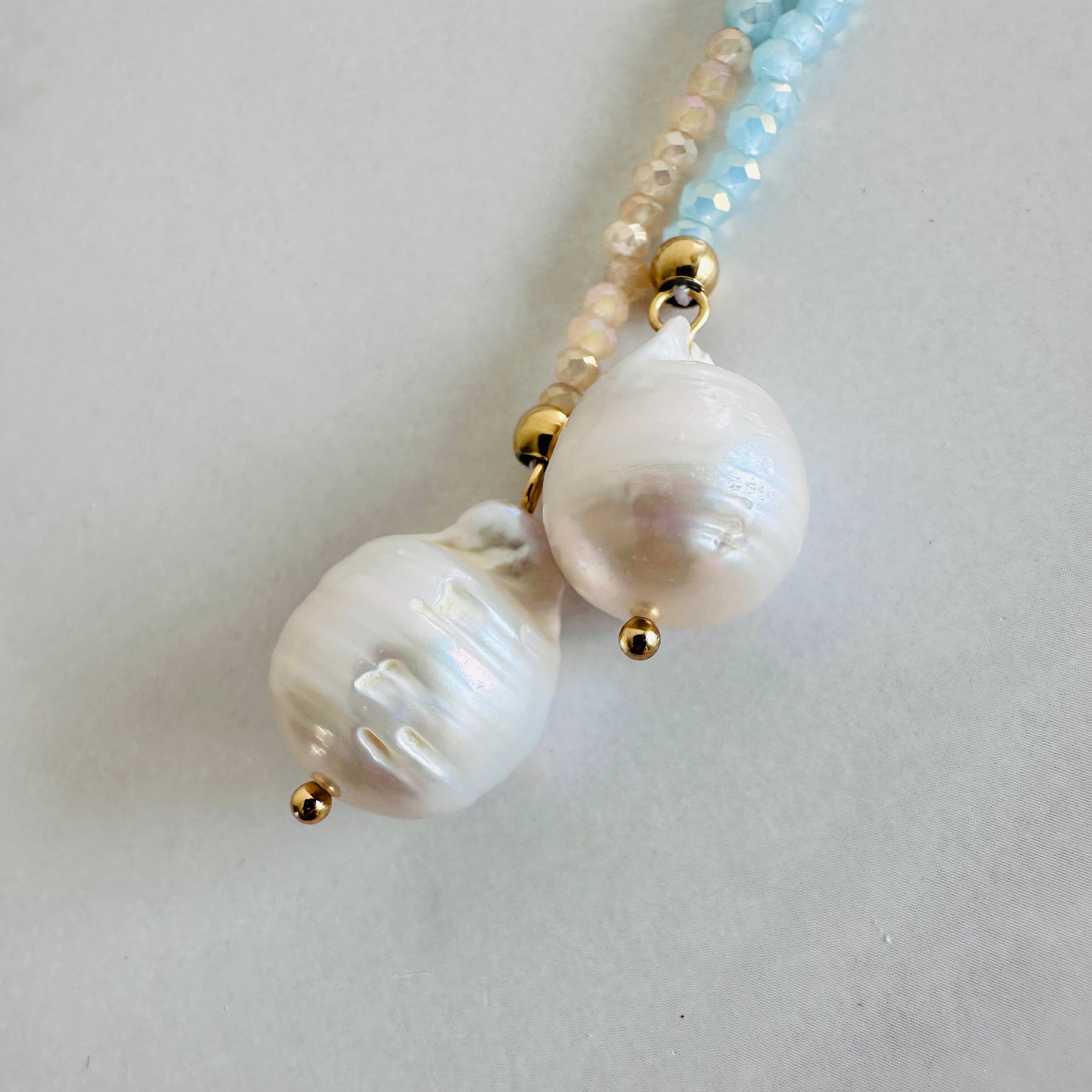 優しいブルー、オレンジ、ベージュの繊細なガラスビーズに大粒の天然淡水パールをプラスした、おしゃれなラリエットデザインです。