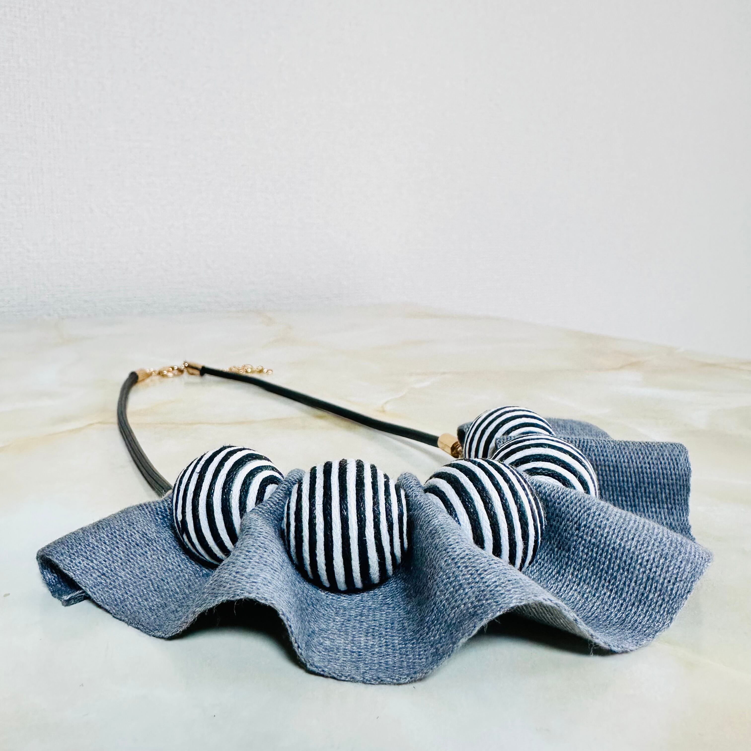 ボールにネイビーとホワイトの暇を巻きストライプにしたパーツにフリルリボンを合わせたデザインです。