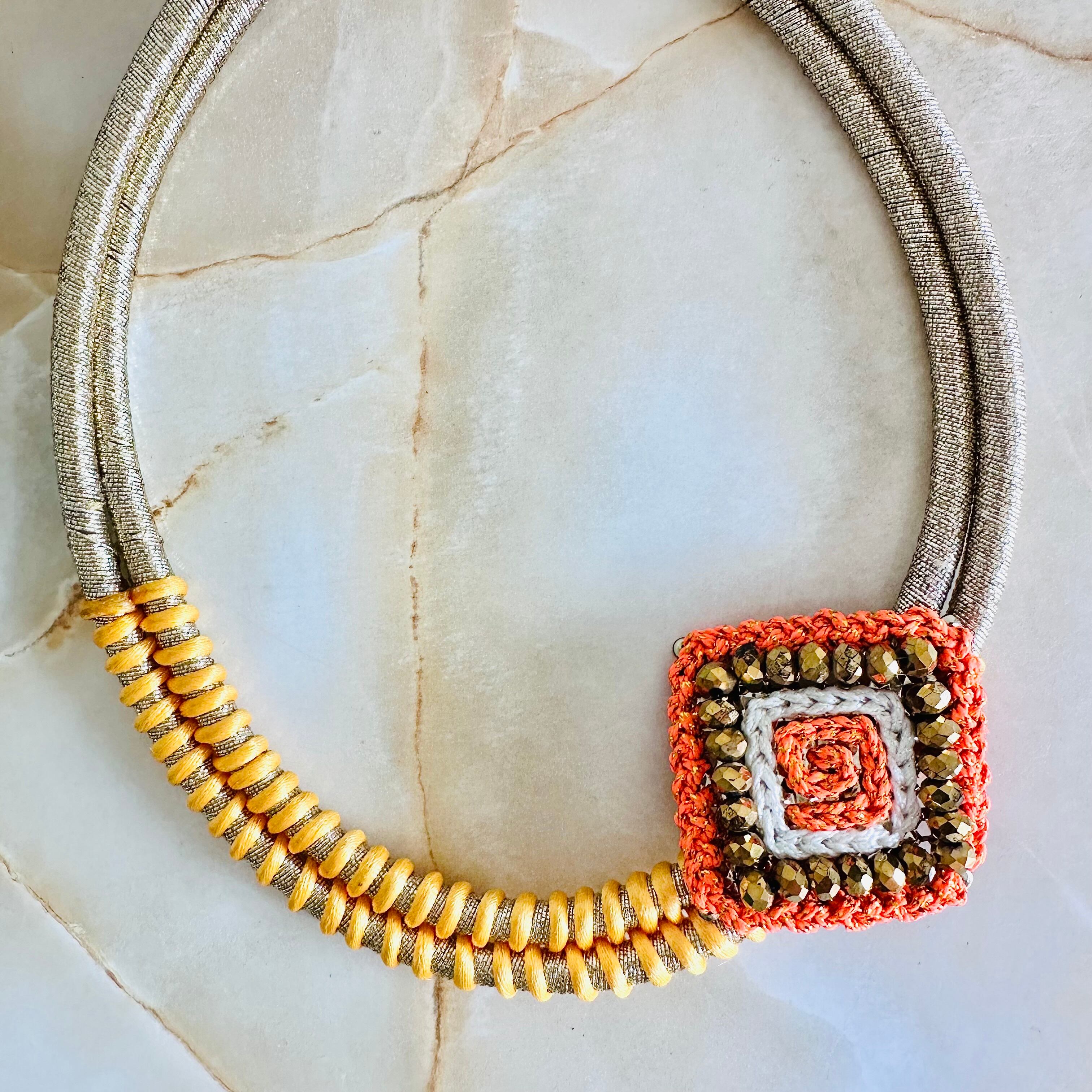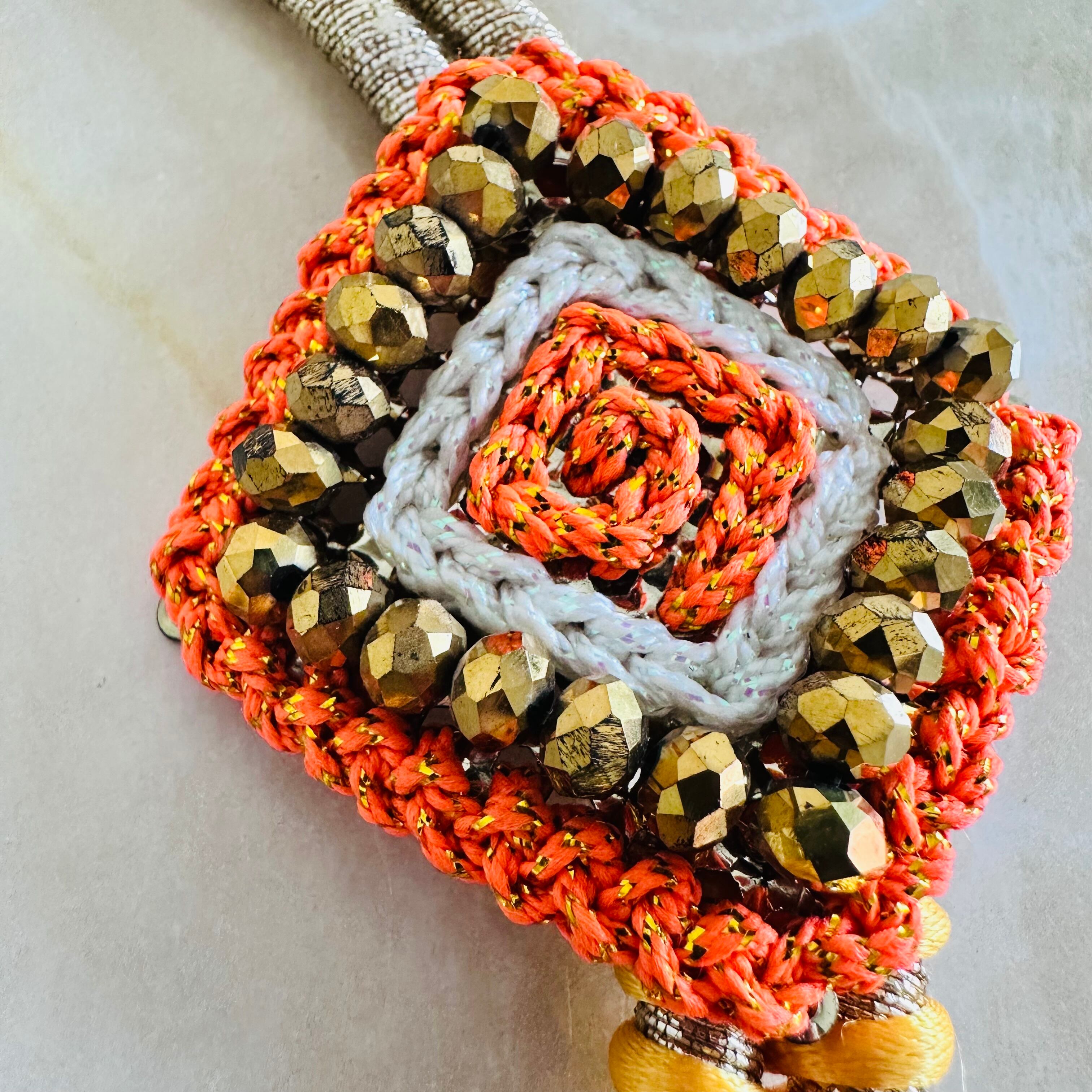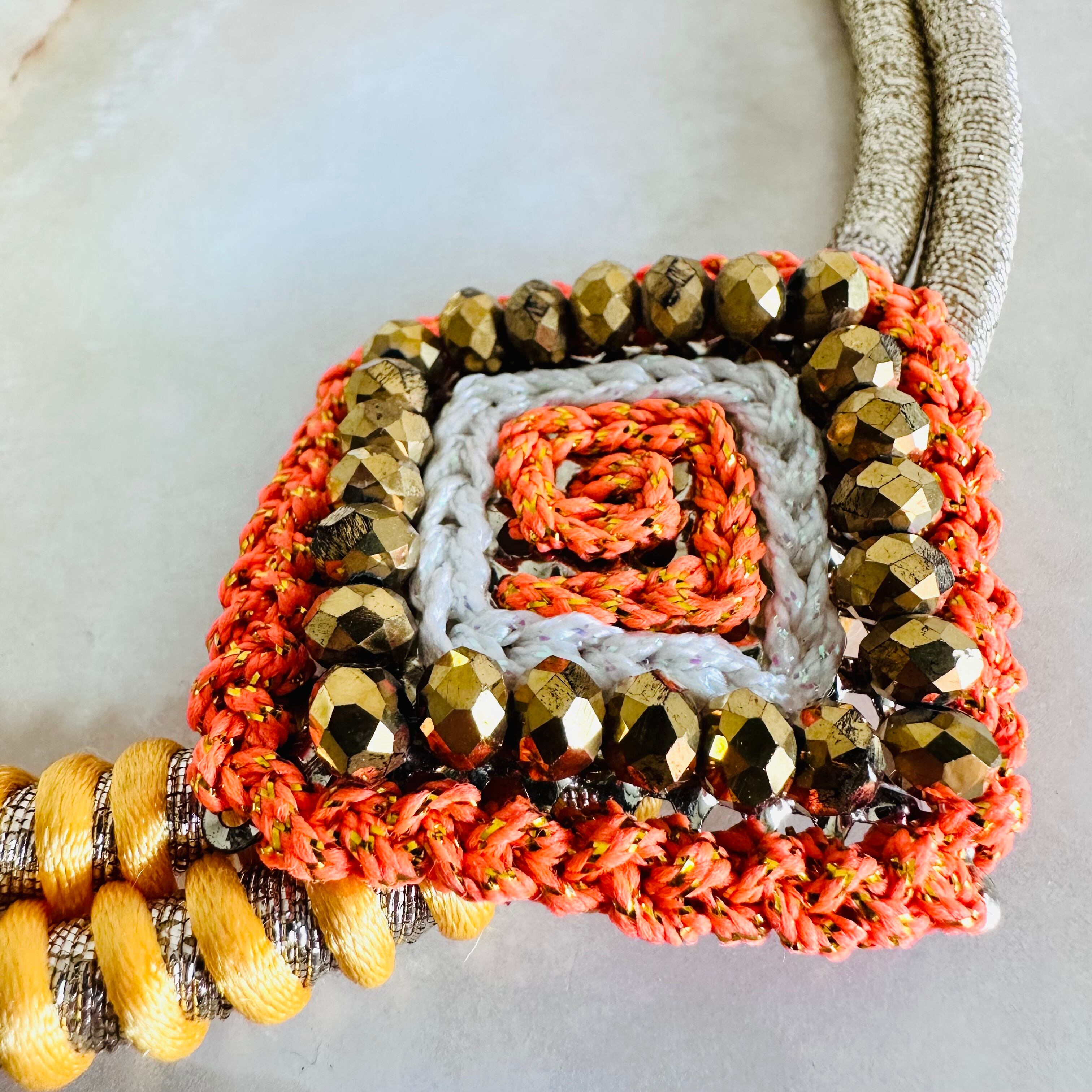 紐とガラスビーズで作られたスクウェアモチーフをプラスしました。