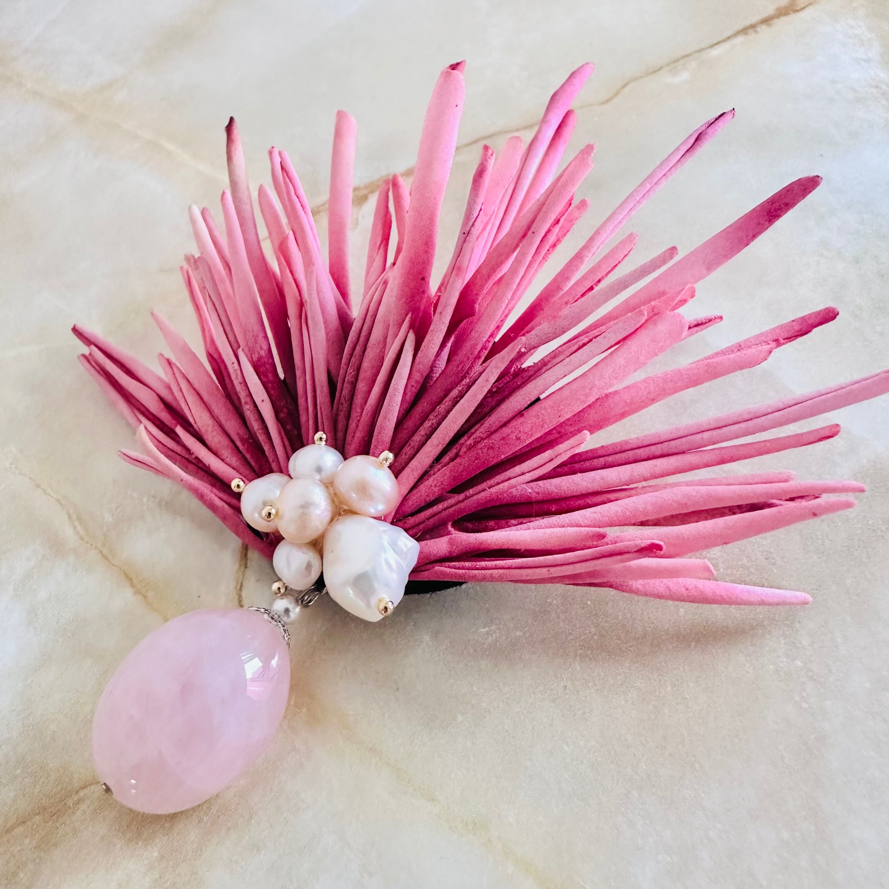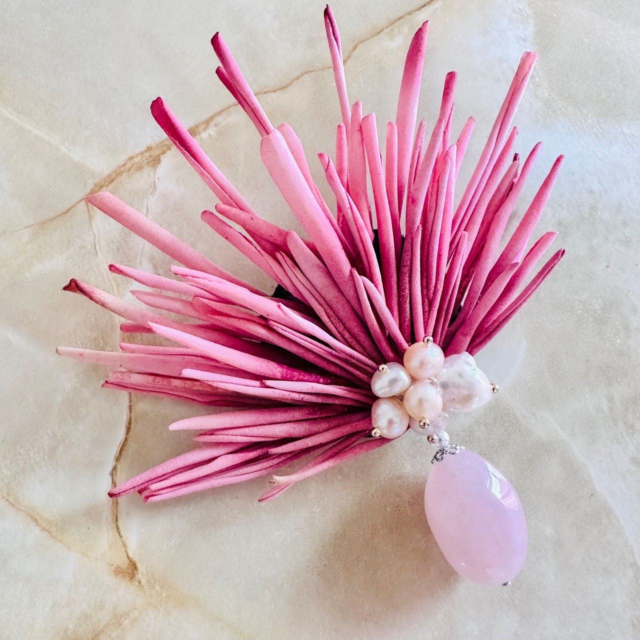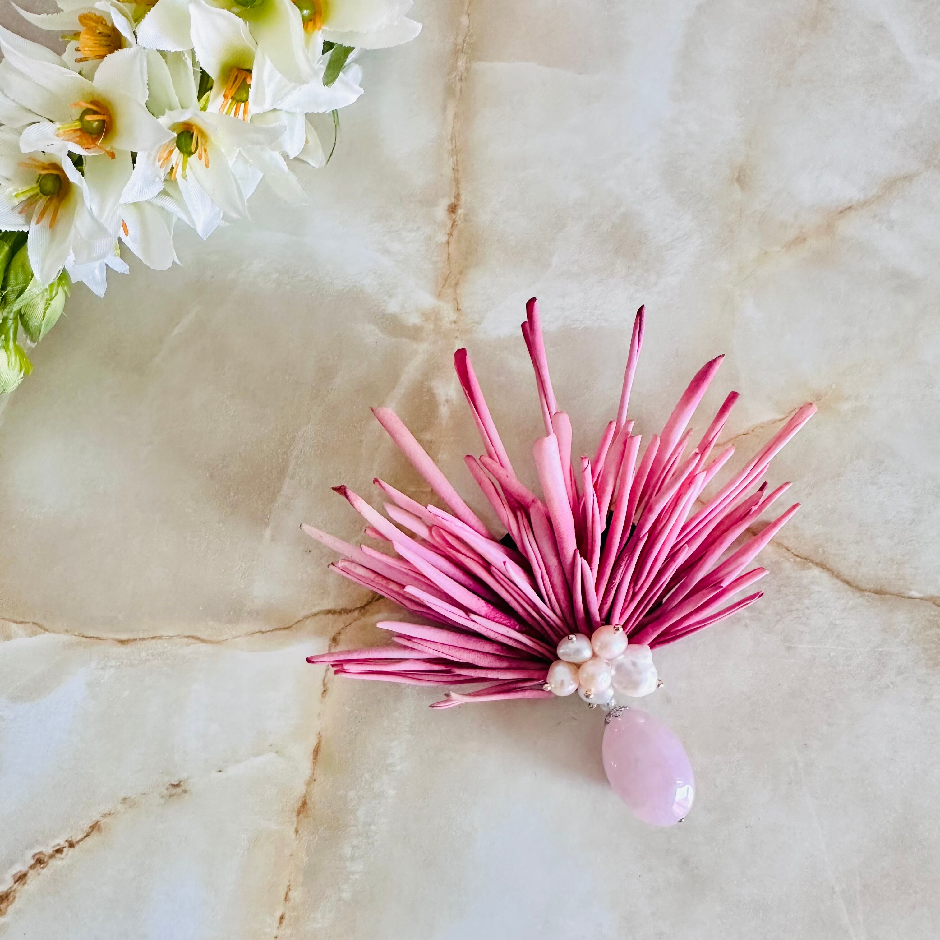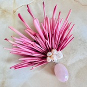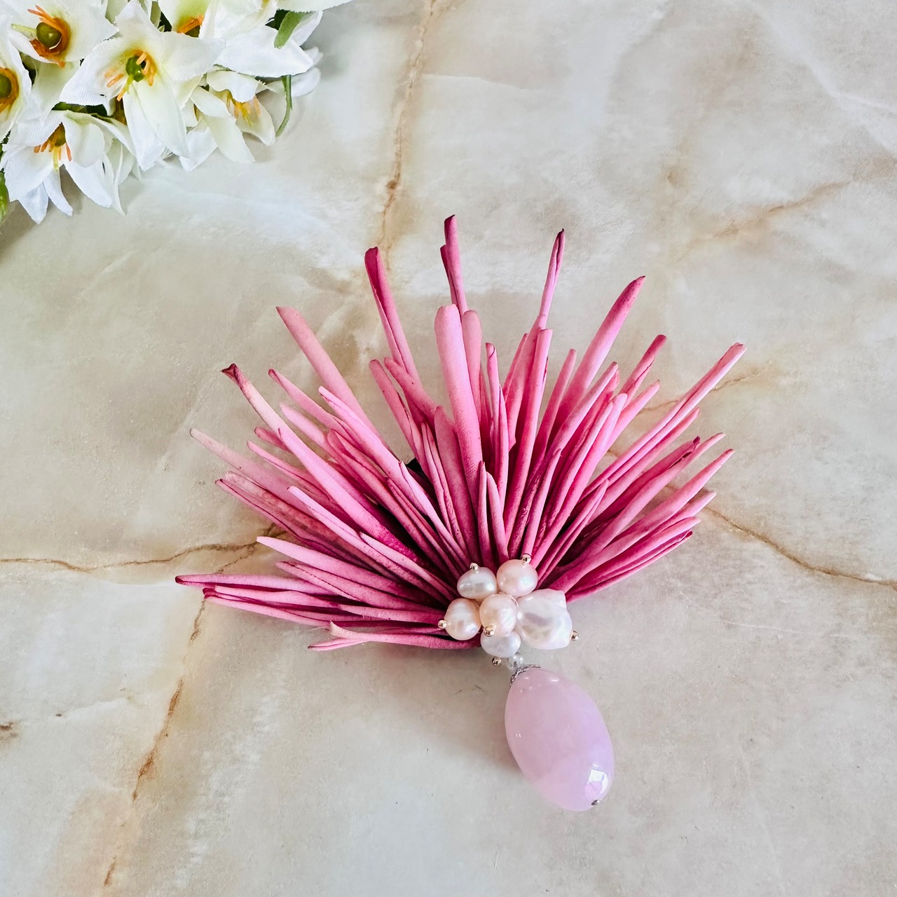 加工された布に天然淡水パールと天然石をプラスし、ピンクのグラデーションを作ったデザインです。