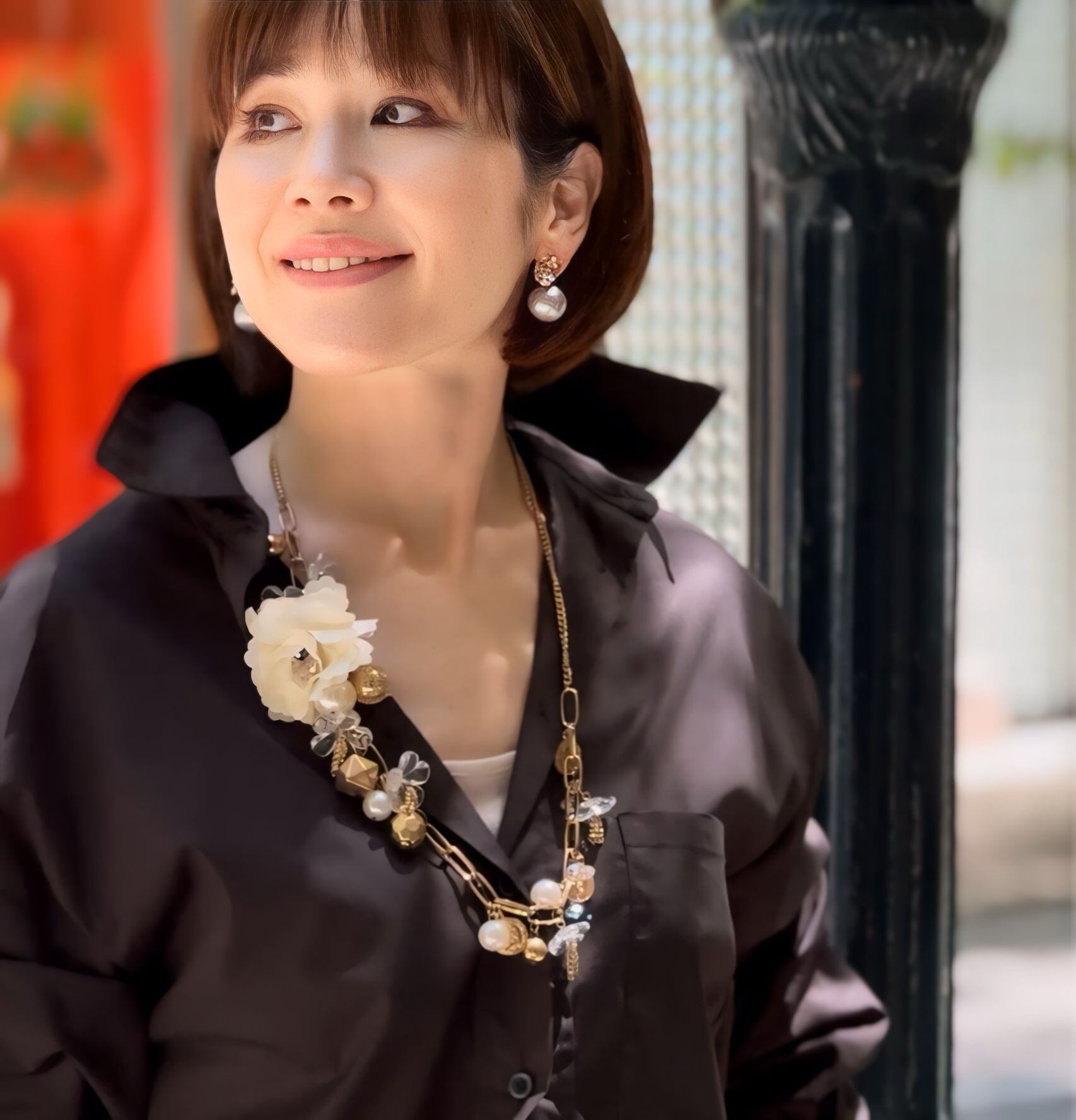 合わせるネックレスのカラーも選ばず、ゴールド、シルバー、パールなどどんな質感とも組み合わせが楽しめます♪