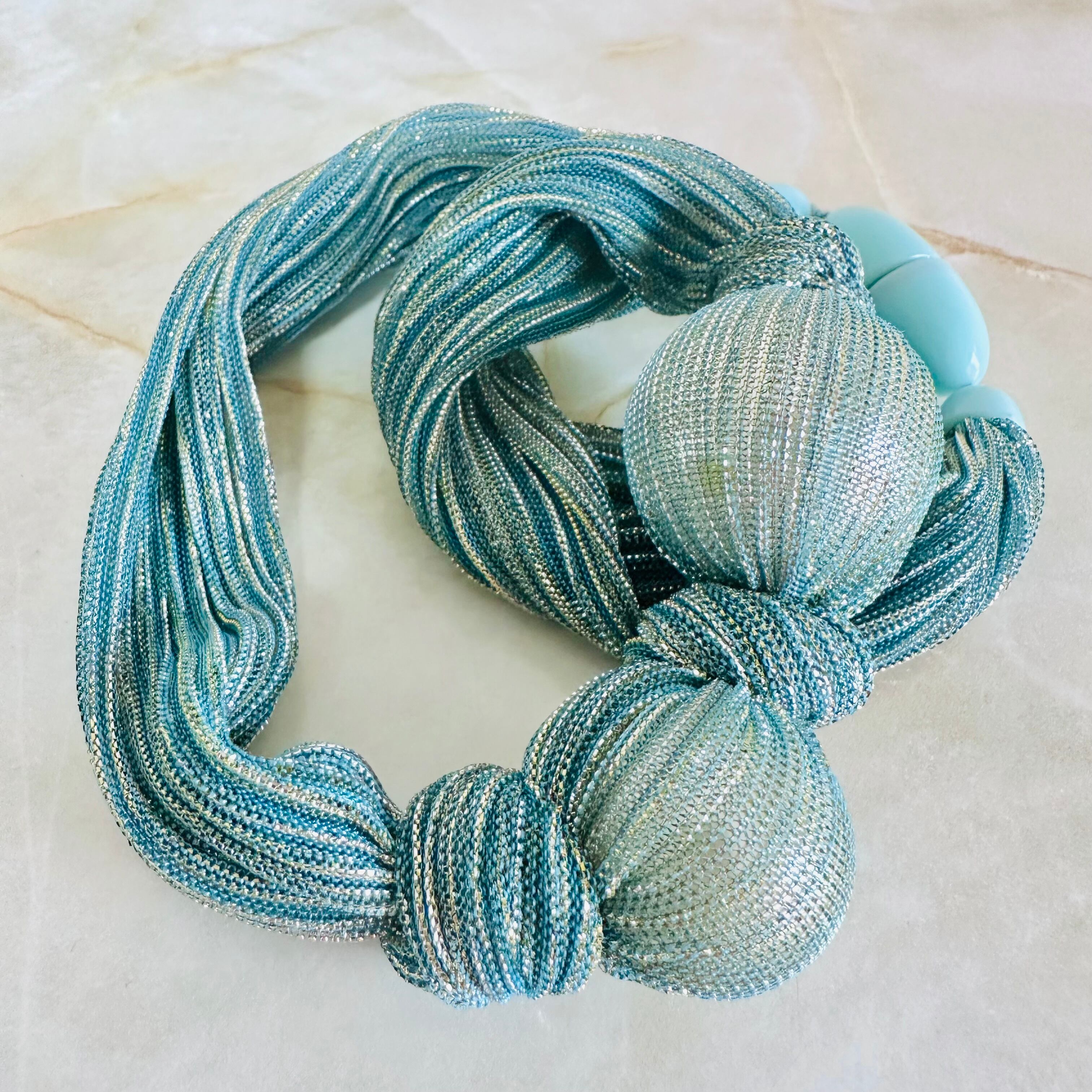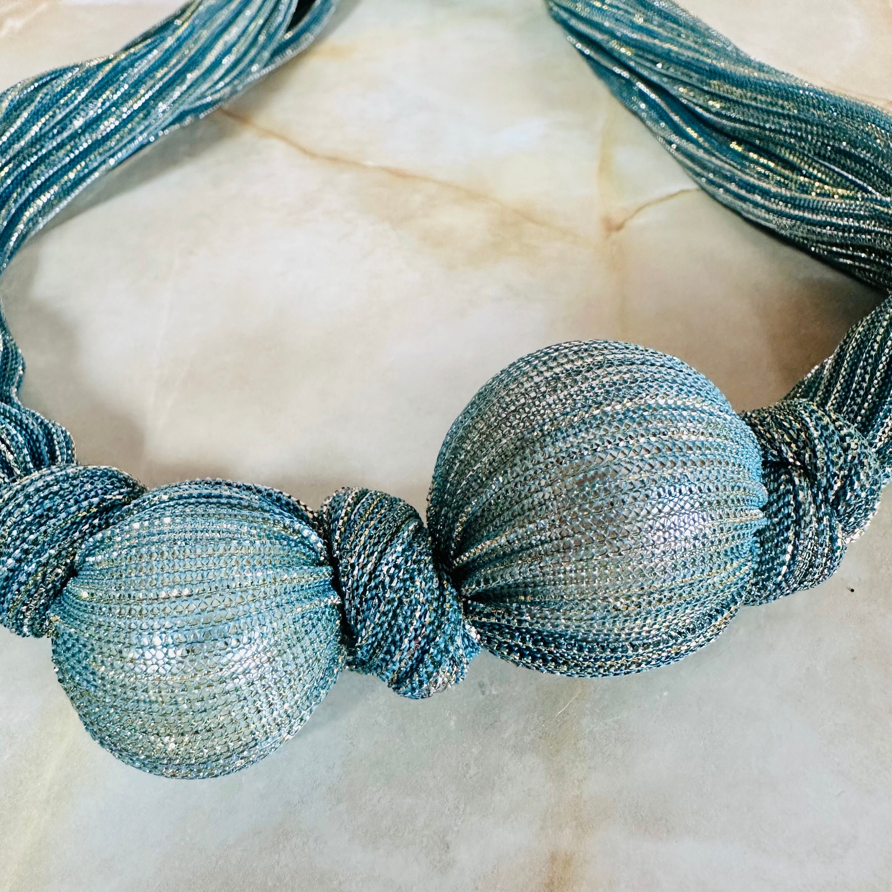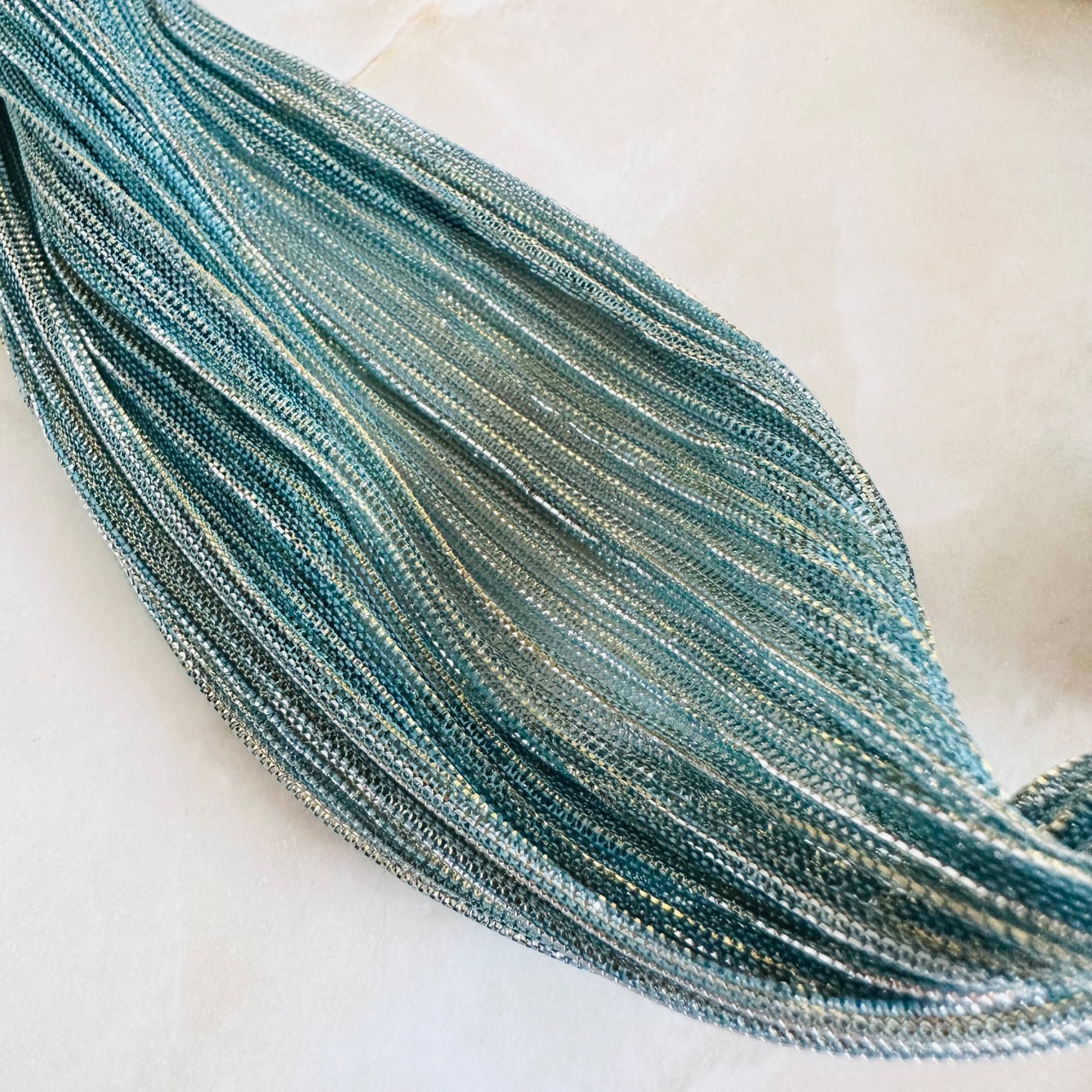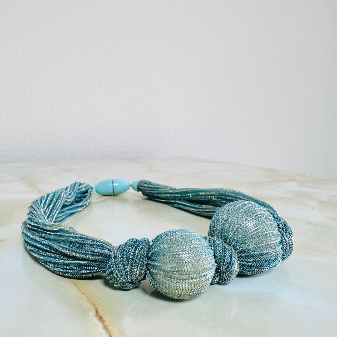 ラメの入ったブルーの生地でパールを包んだデザインです。