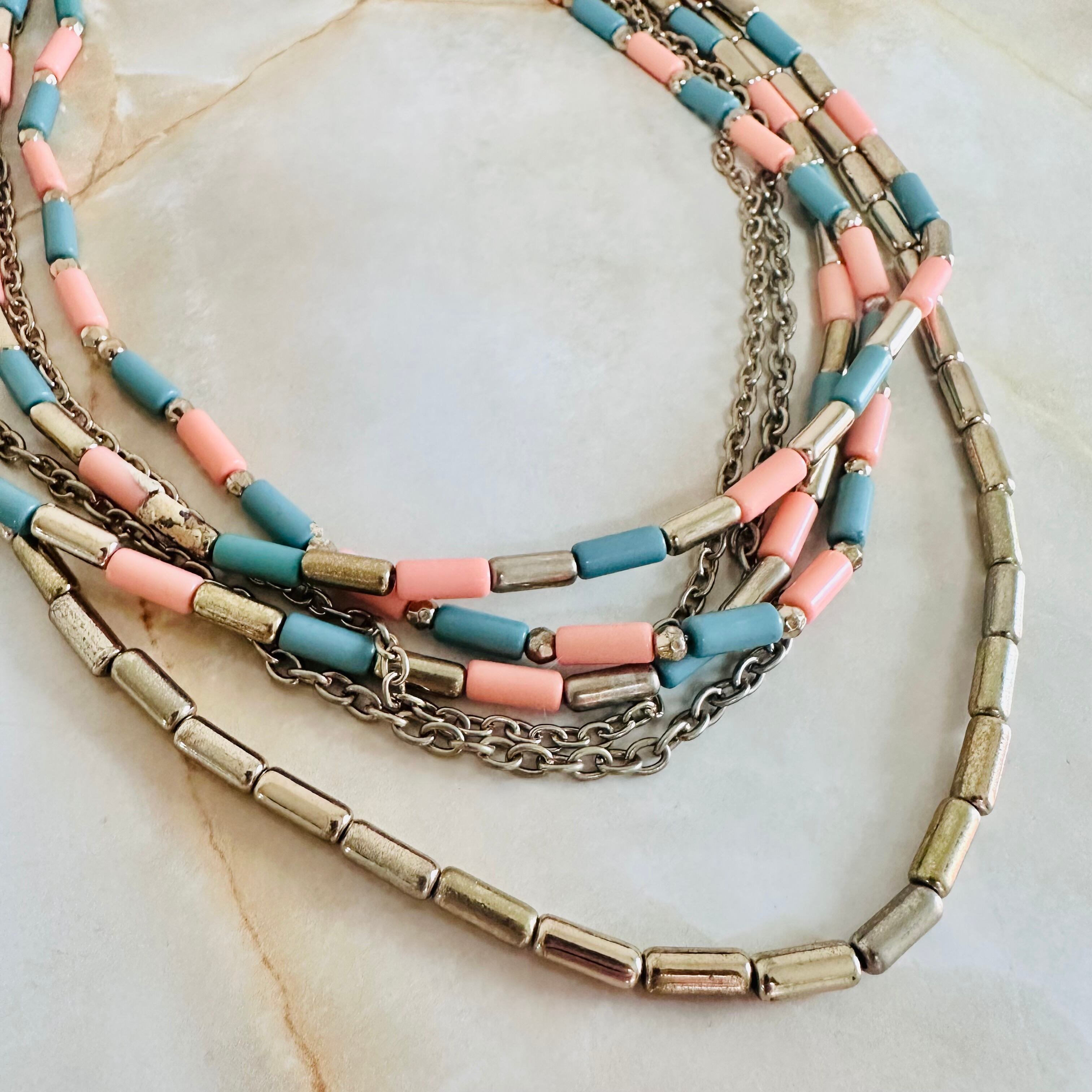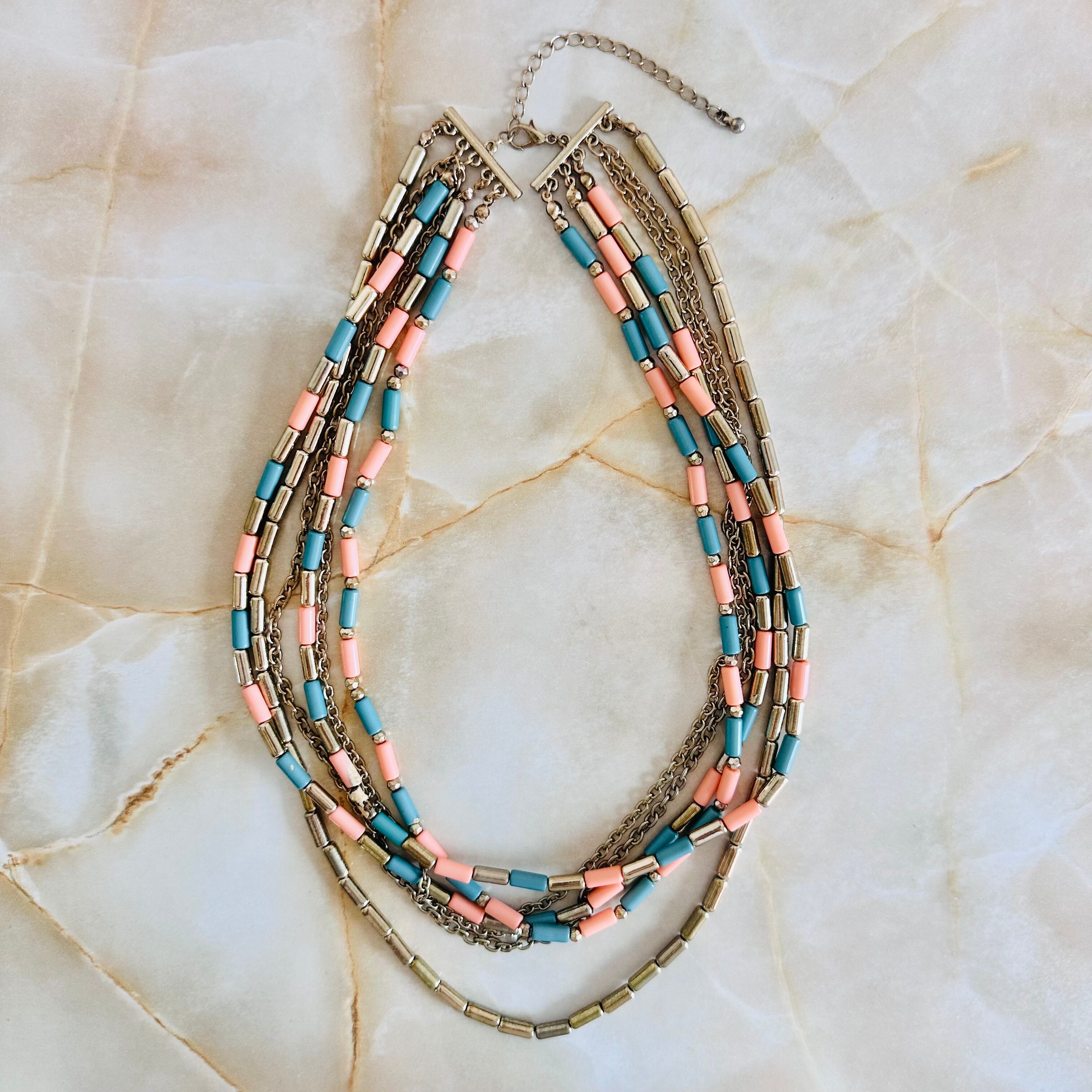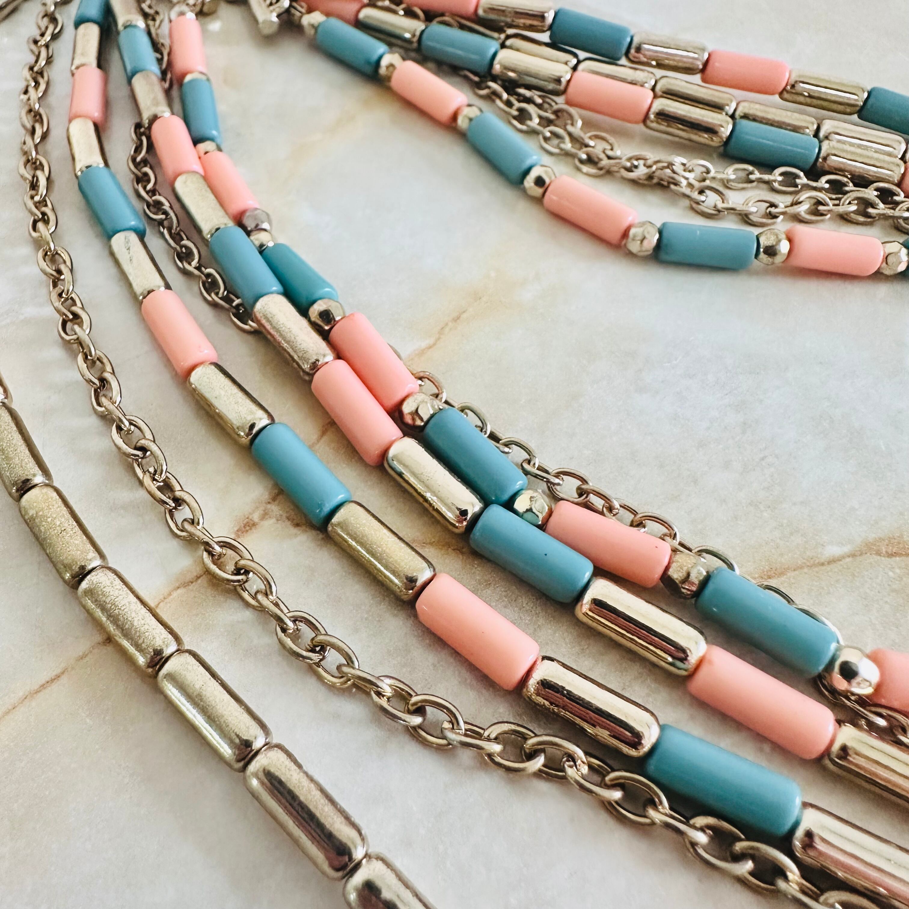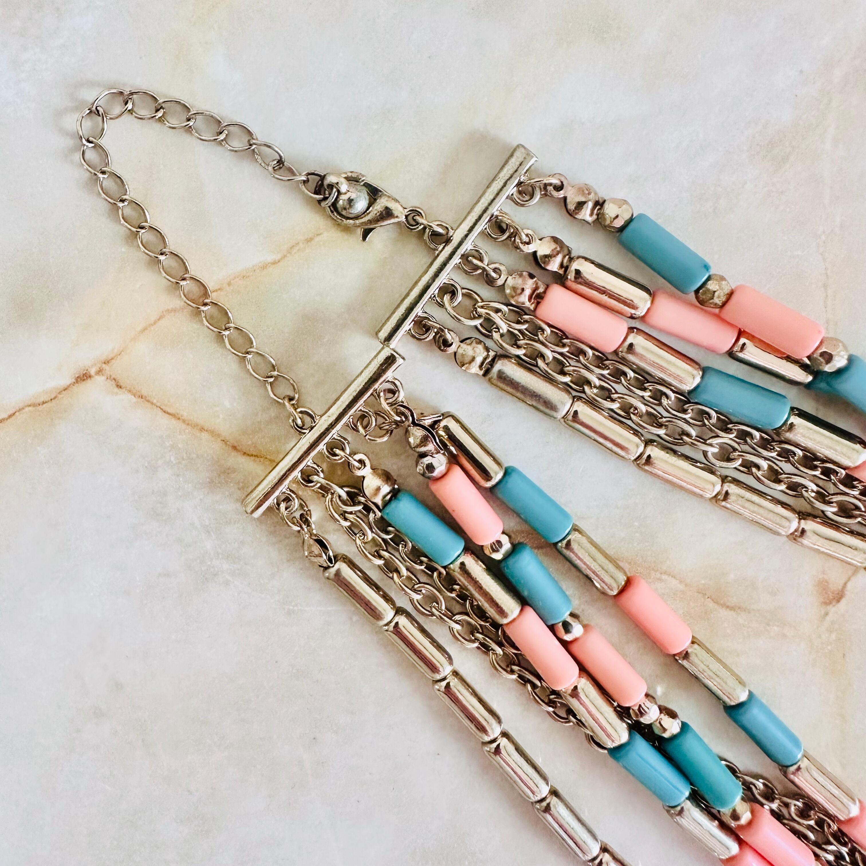 オレンジやブルー、ゴールドの華やかなビーズパーツとアンティークゴールドのチェーンとの色合わせが目を惹くデザインです。