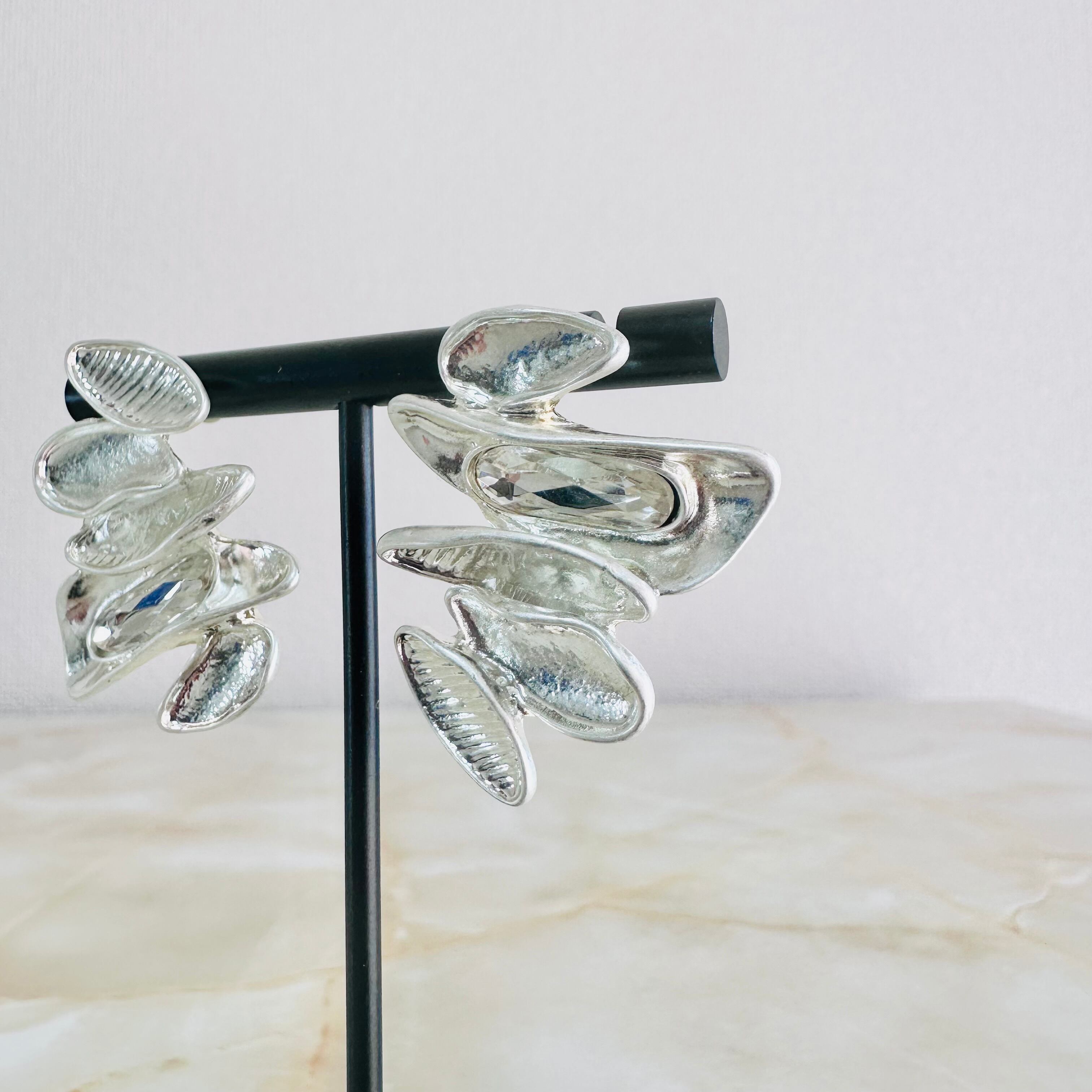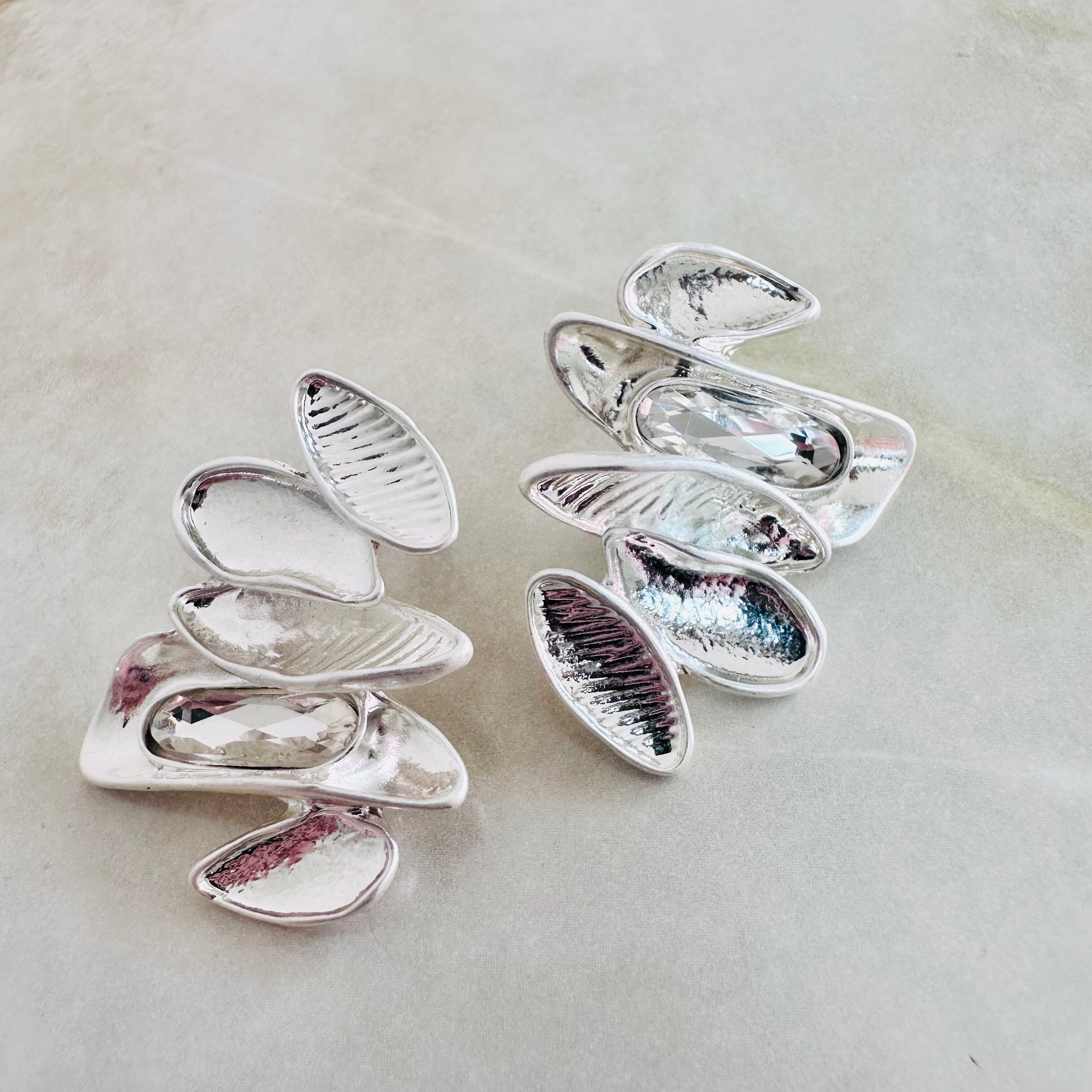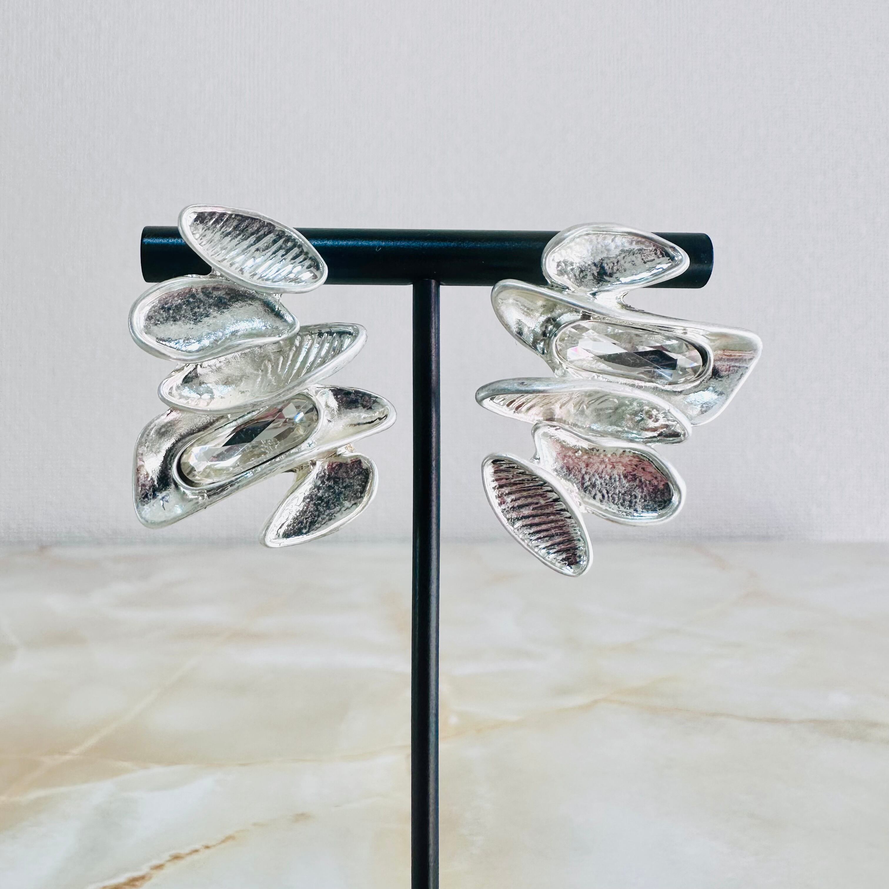 プラチナシルバーカラーにクリアのビジューを左右アンバランスにプラスしたデザインです。