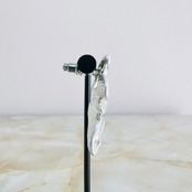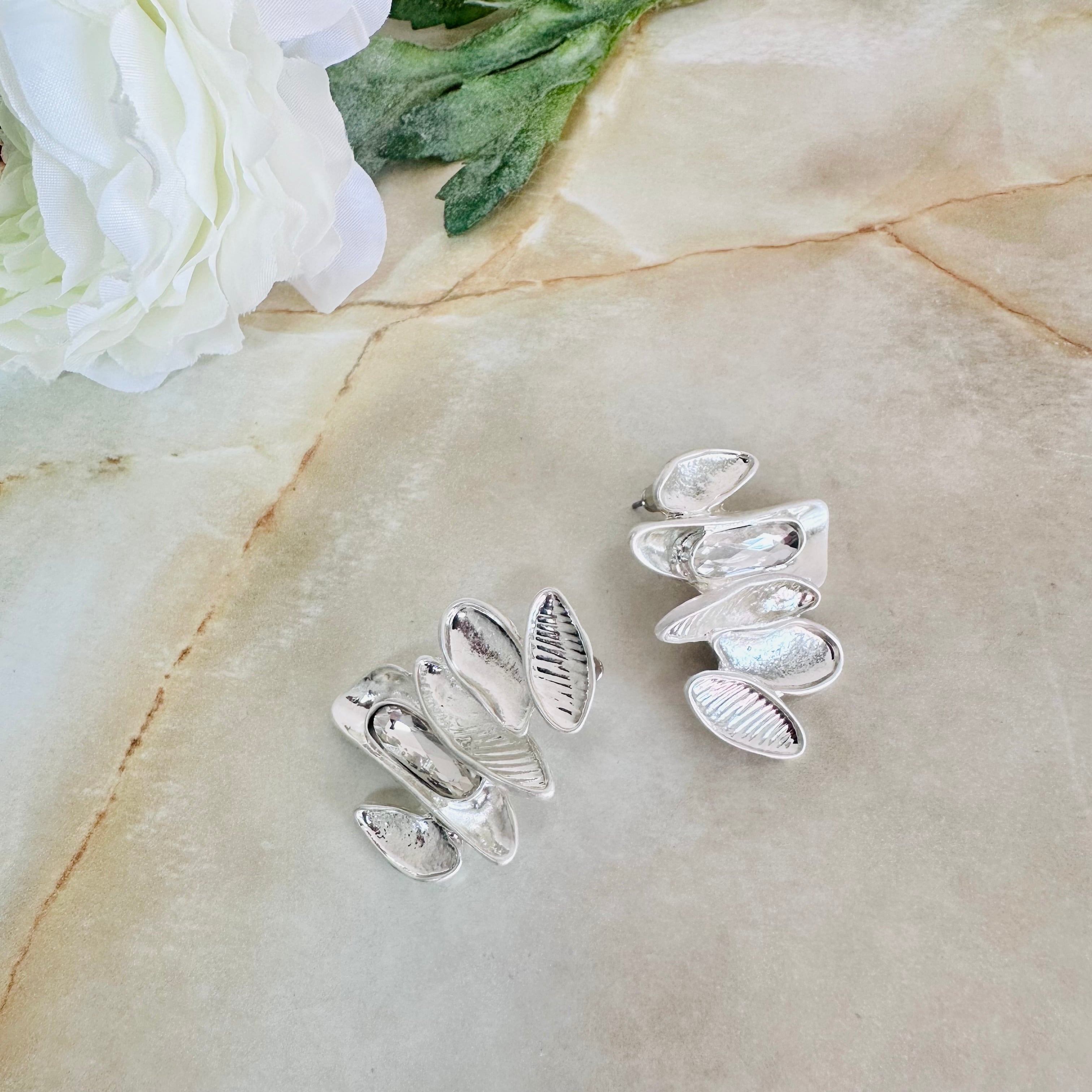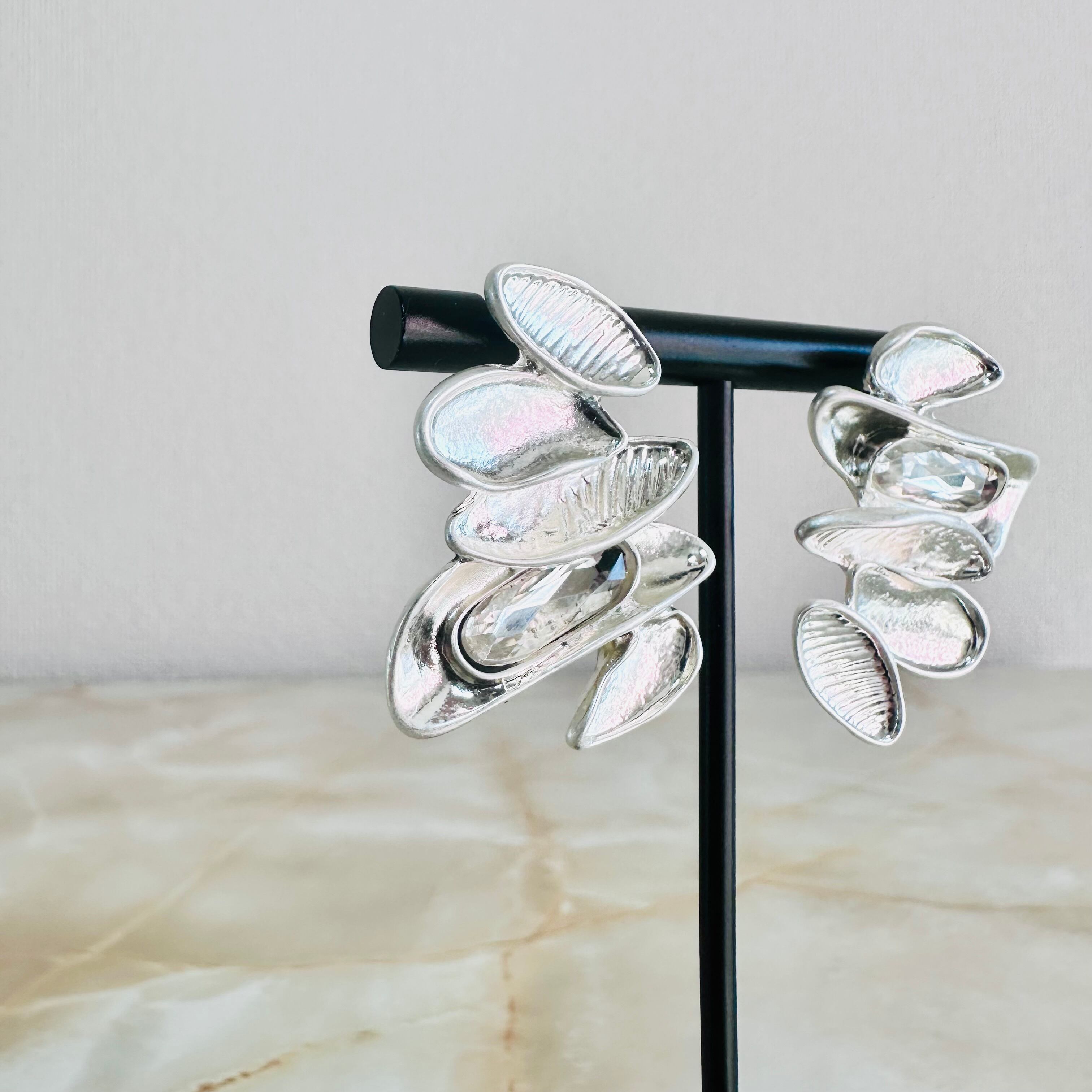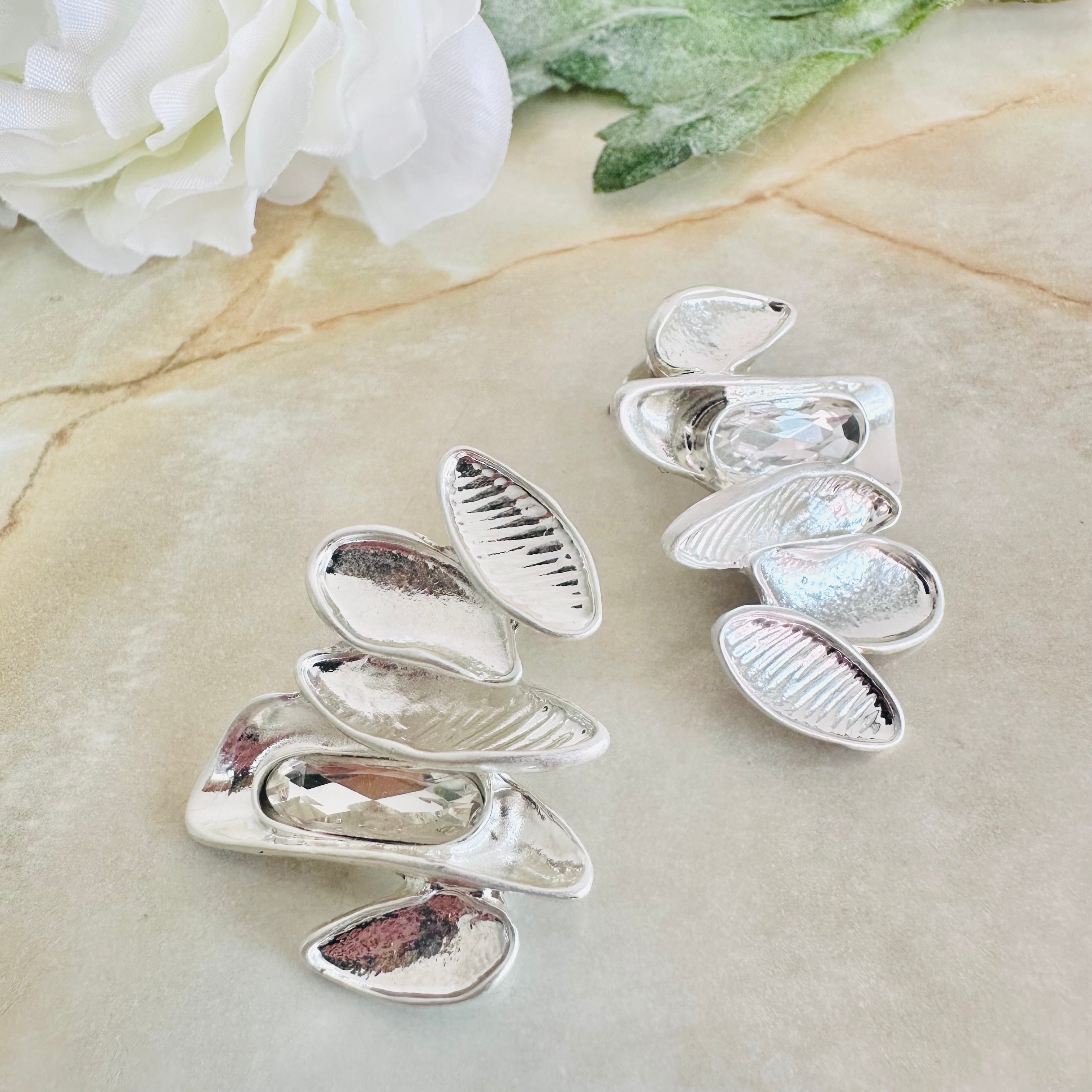 プラチナシルバーカラーにクリアのビジューを左右アンバランスにプラスしたデザインです。