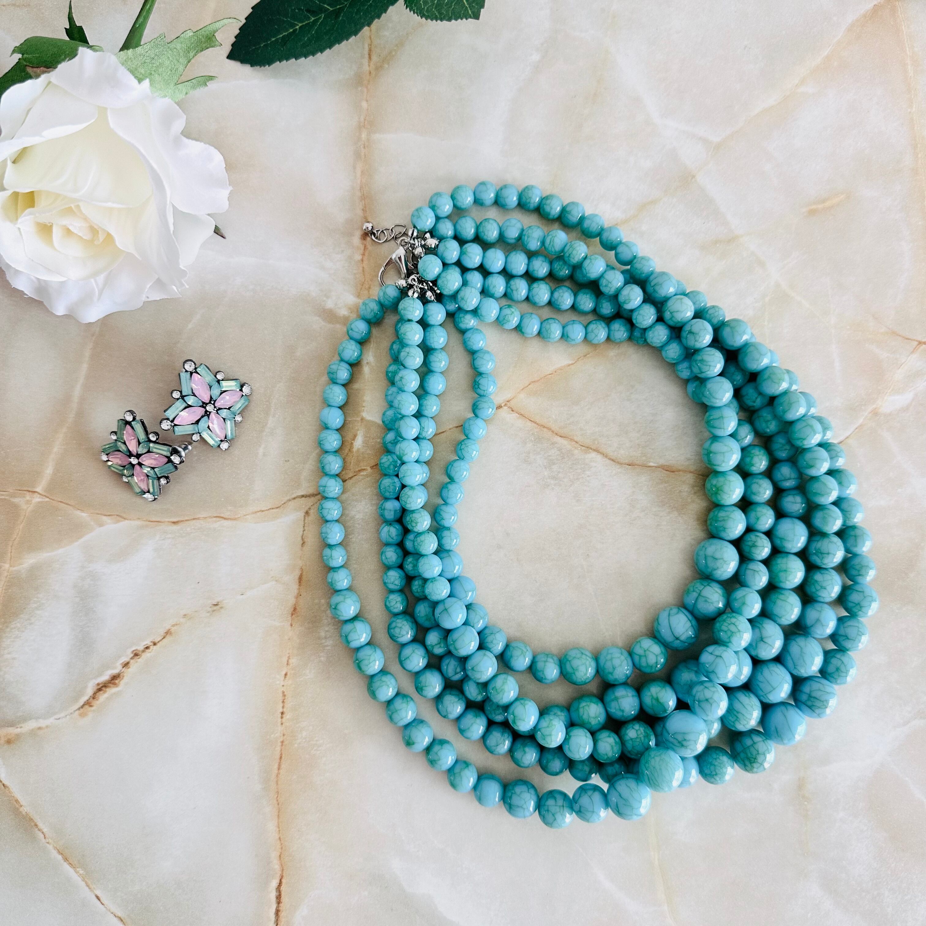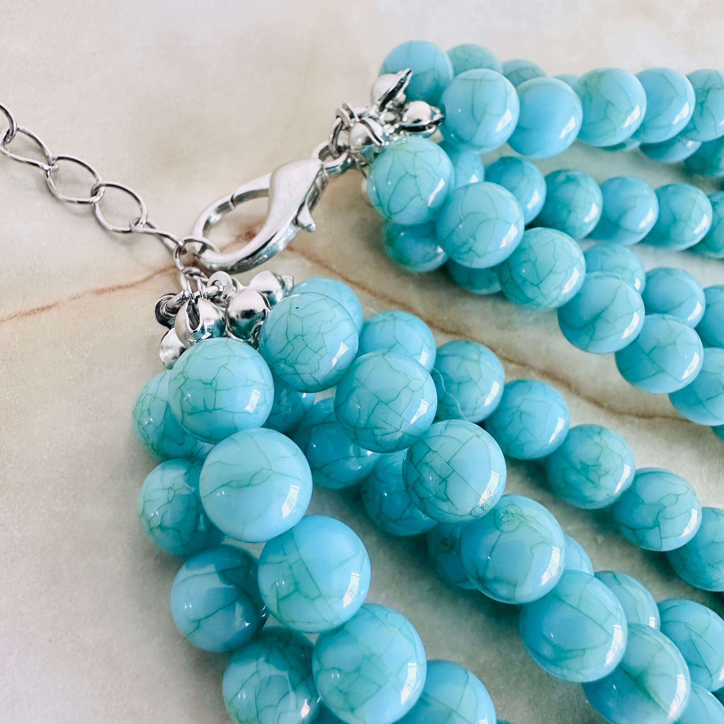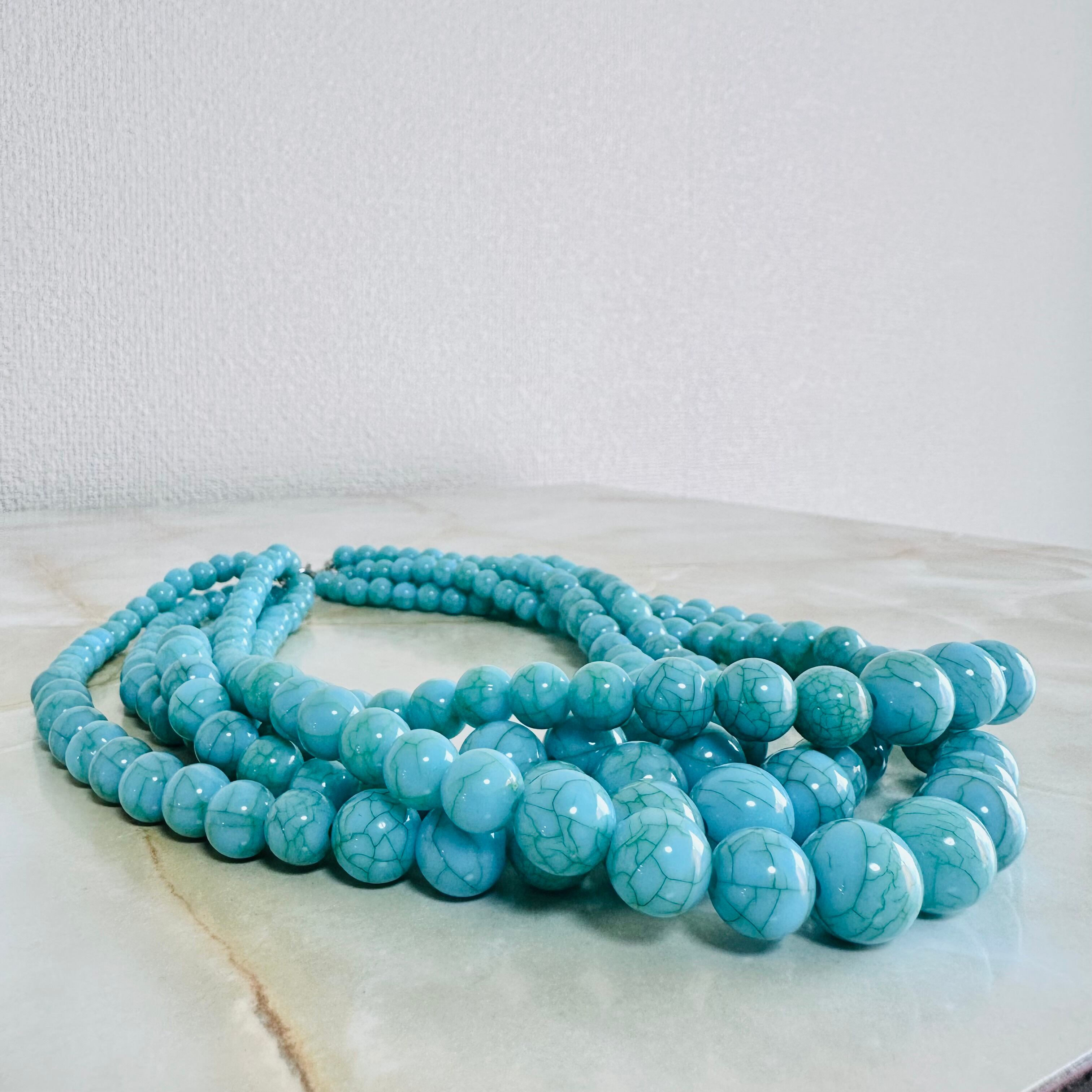 艶のある美しいターコイズブルーカラーのアクリルビーズをふんだんに使用し5連のボリューミィなデザインです。