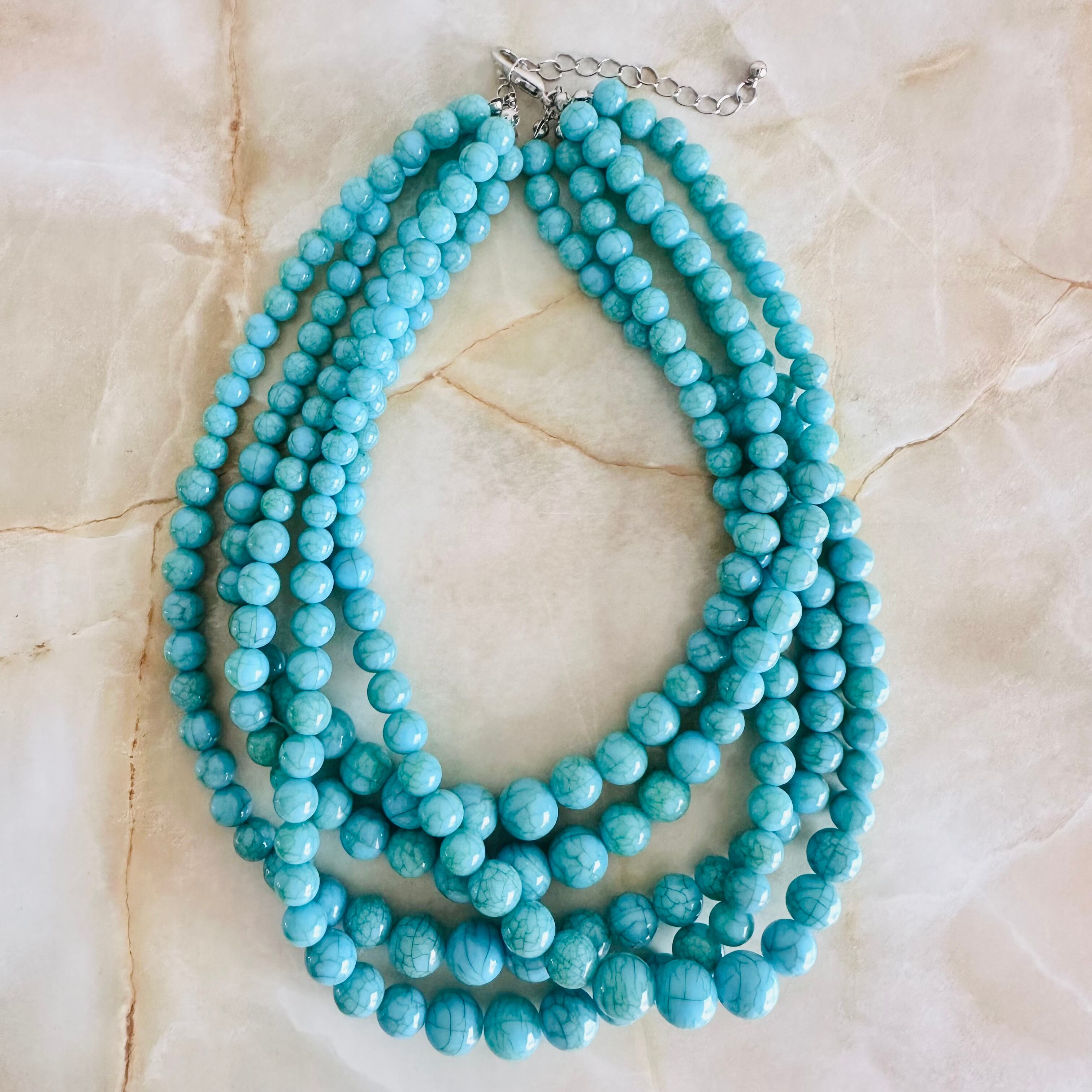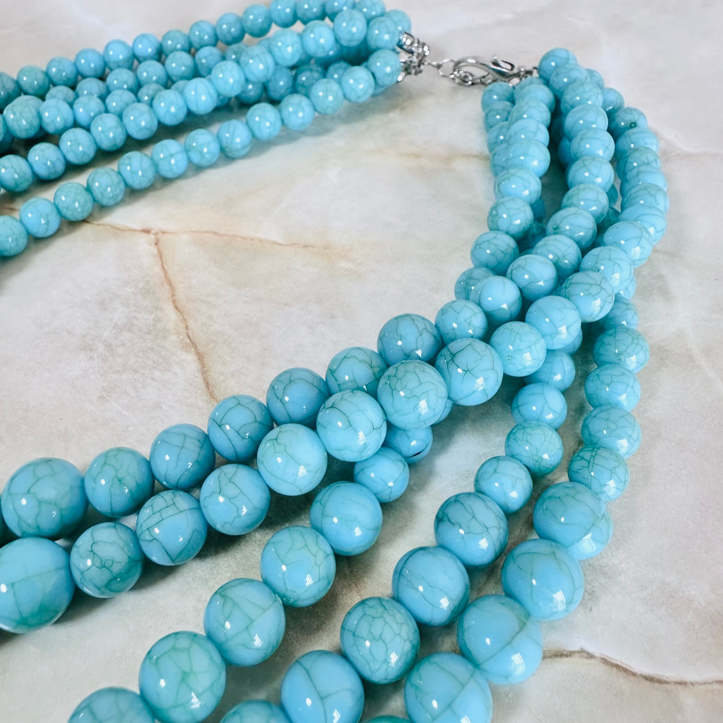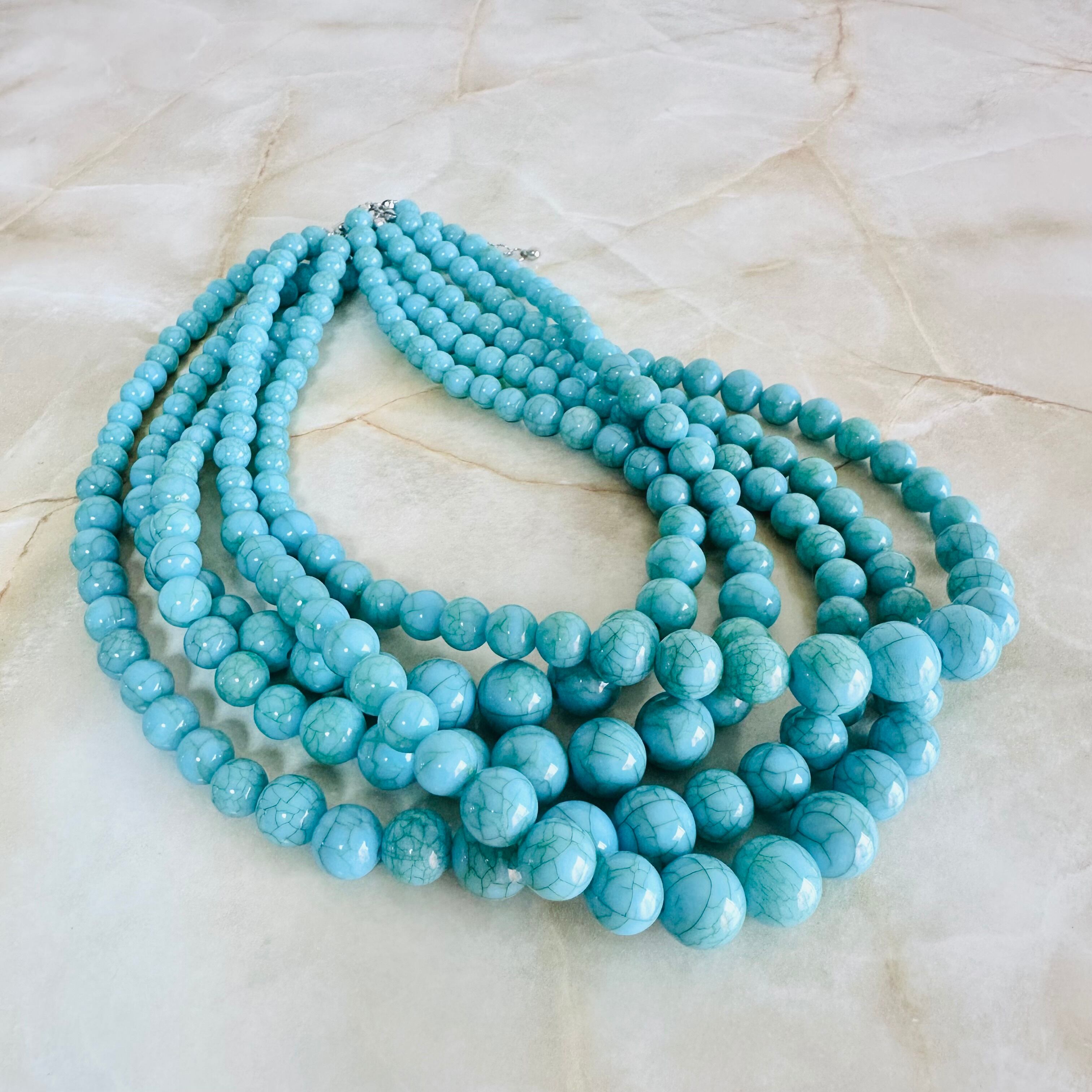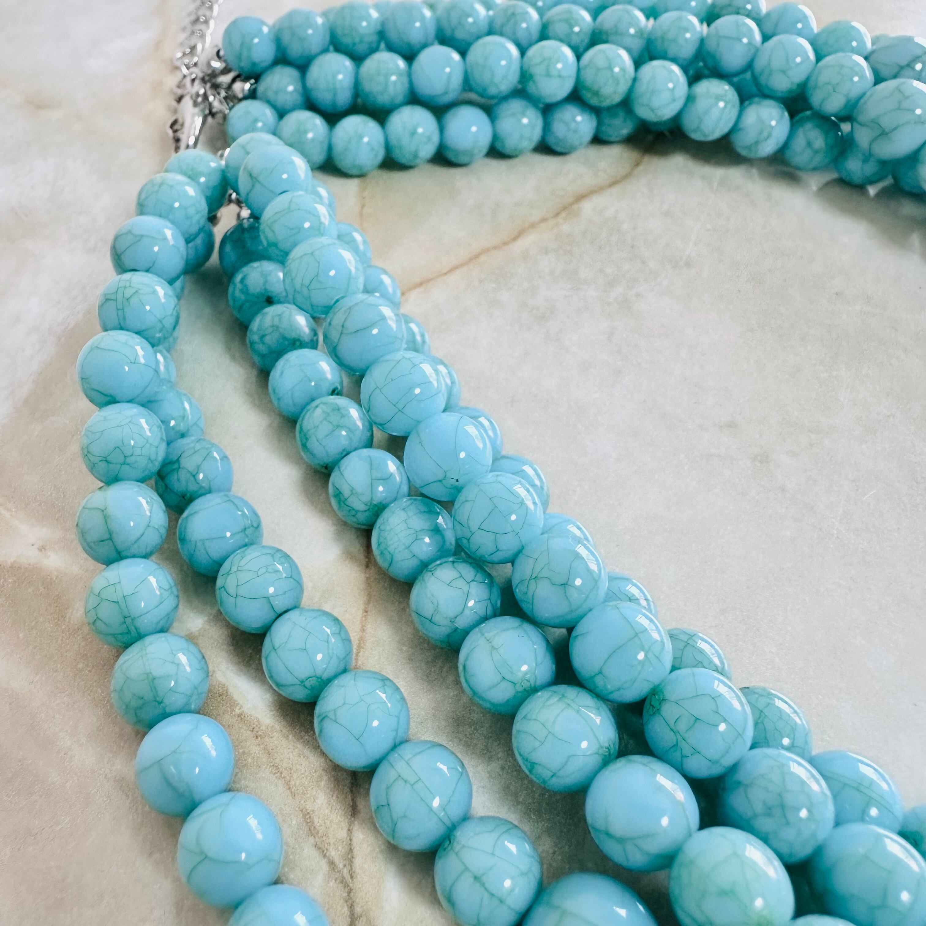 艶のある美しいターコイズブルーカラーのアクリルビーズをふんだんに使用し5連のボリューミィなデザインです。