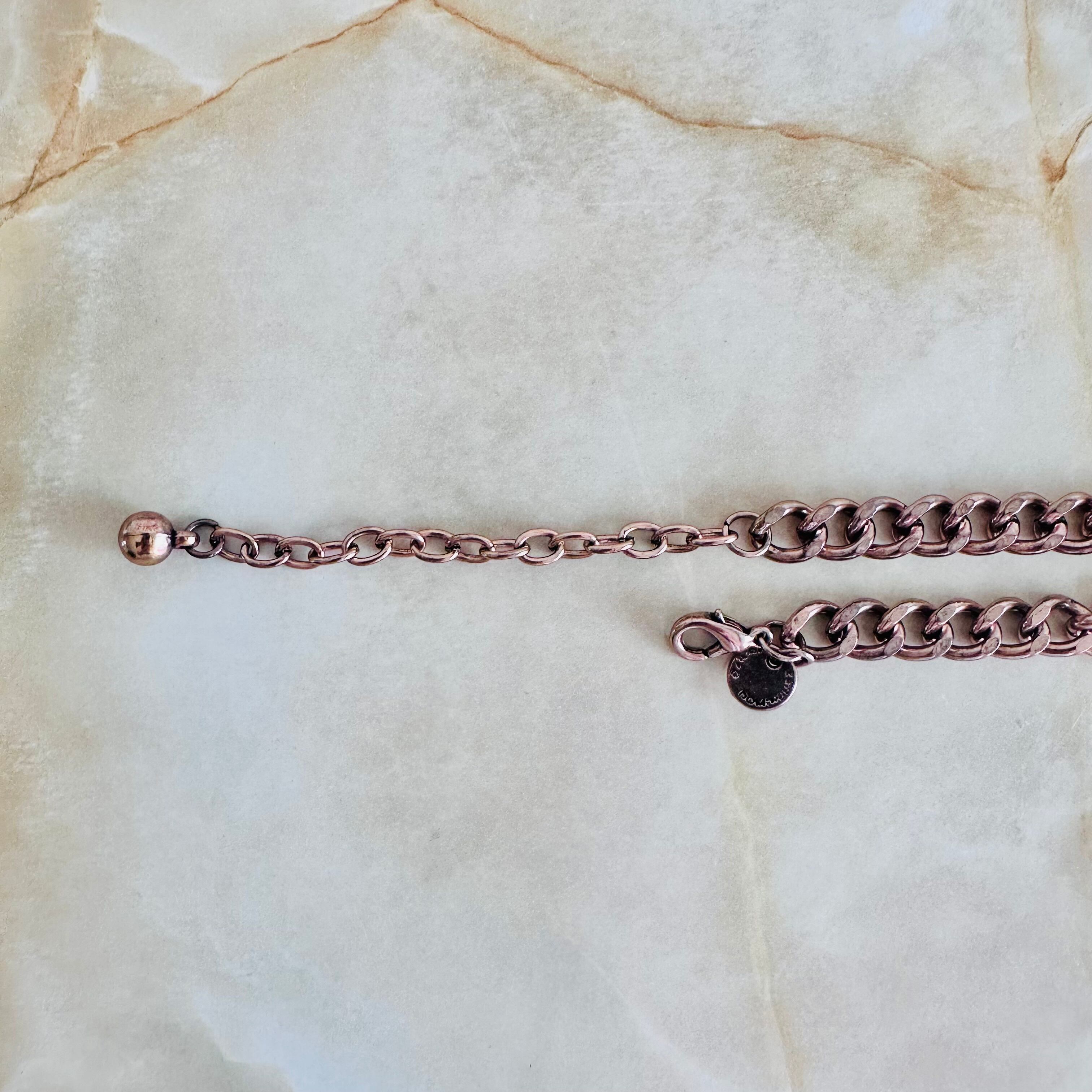 またローズ系のヴィンテージゴールドのチャンキーチェーンが華やかさを一層引き立て、おしゃれな個性をアピールしてくれます。