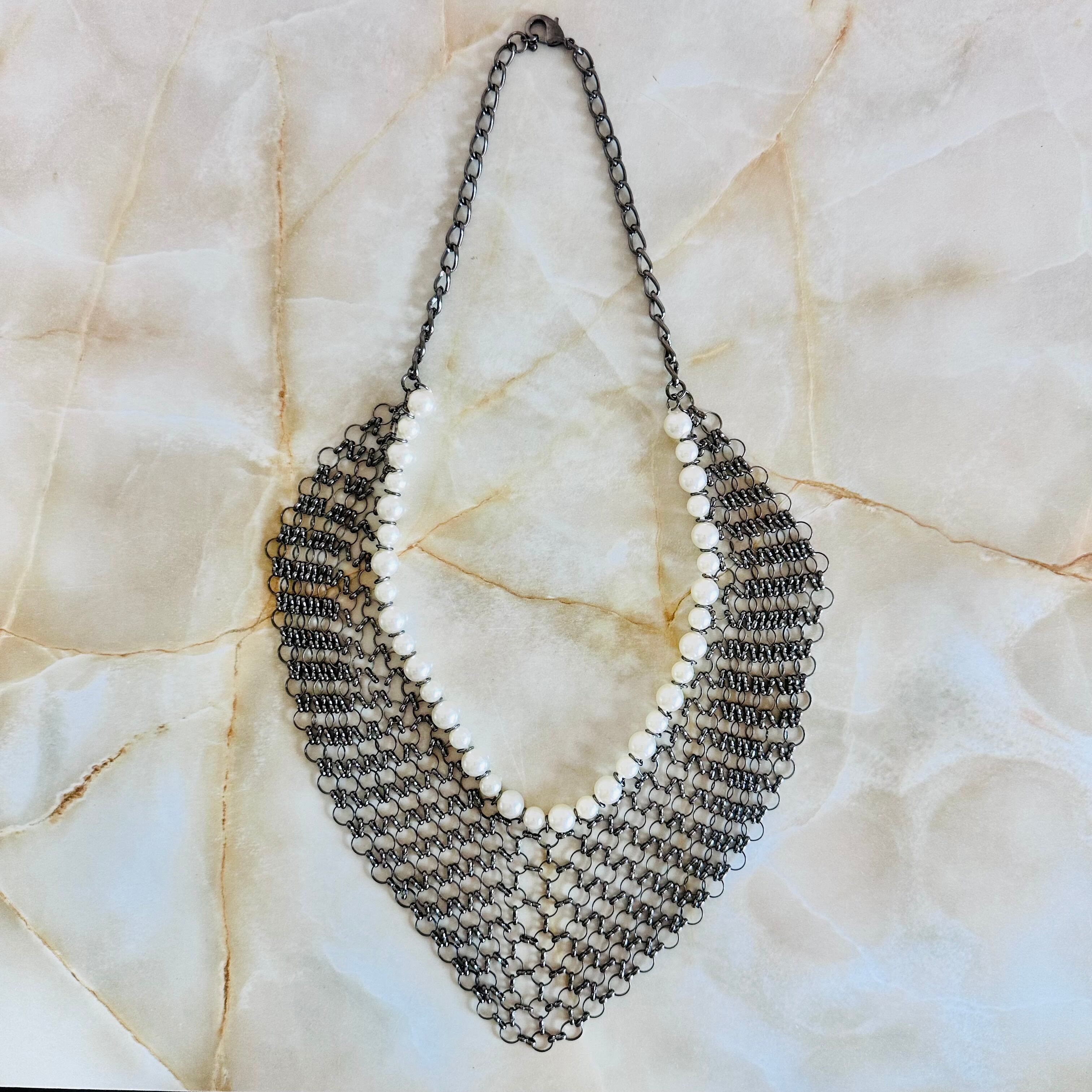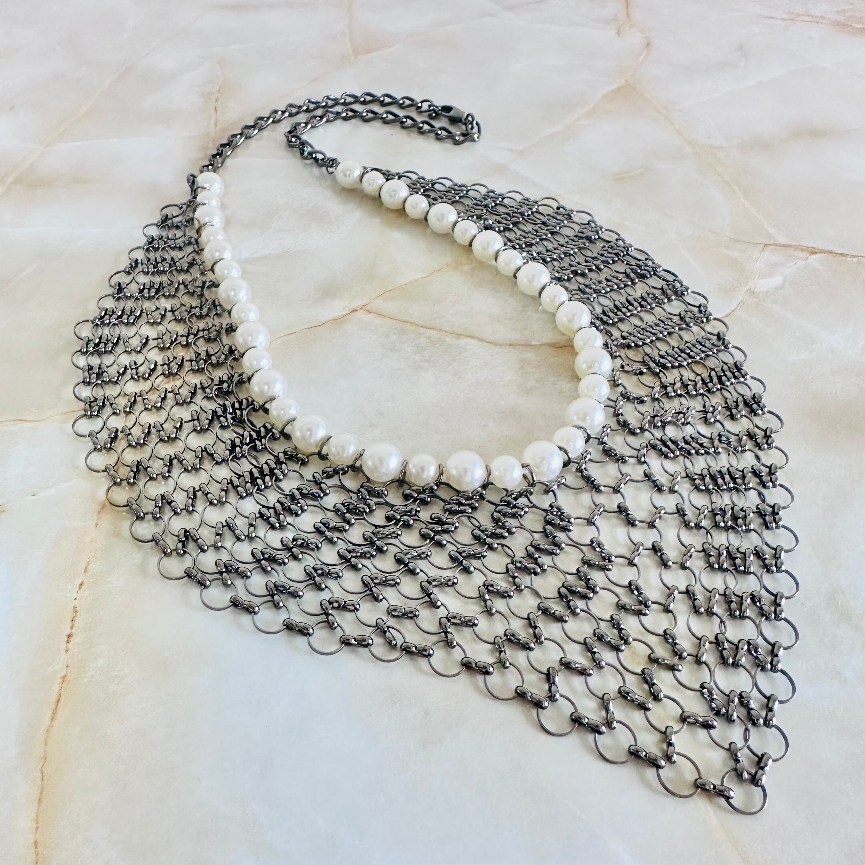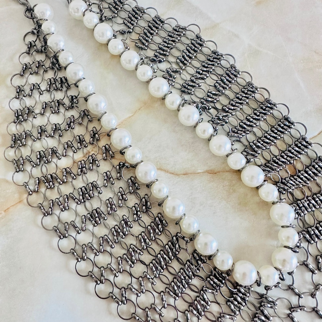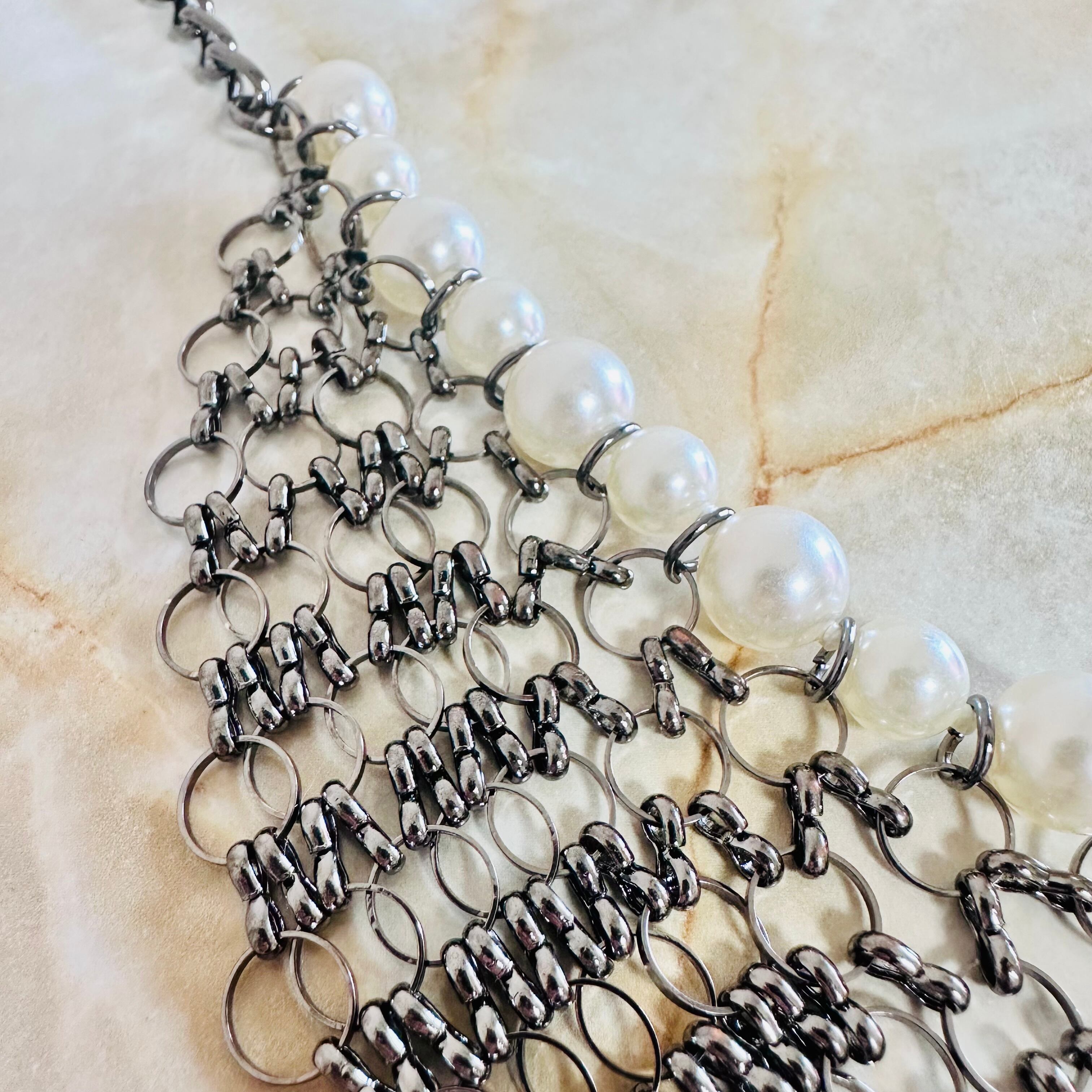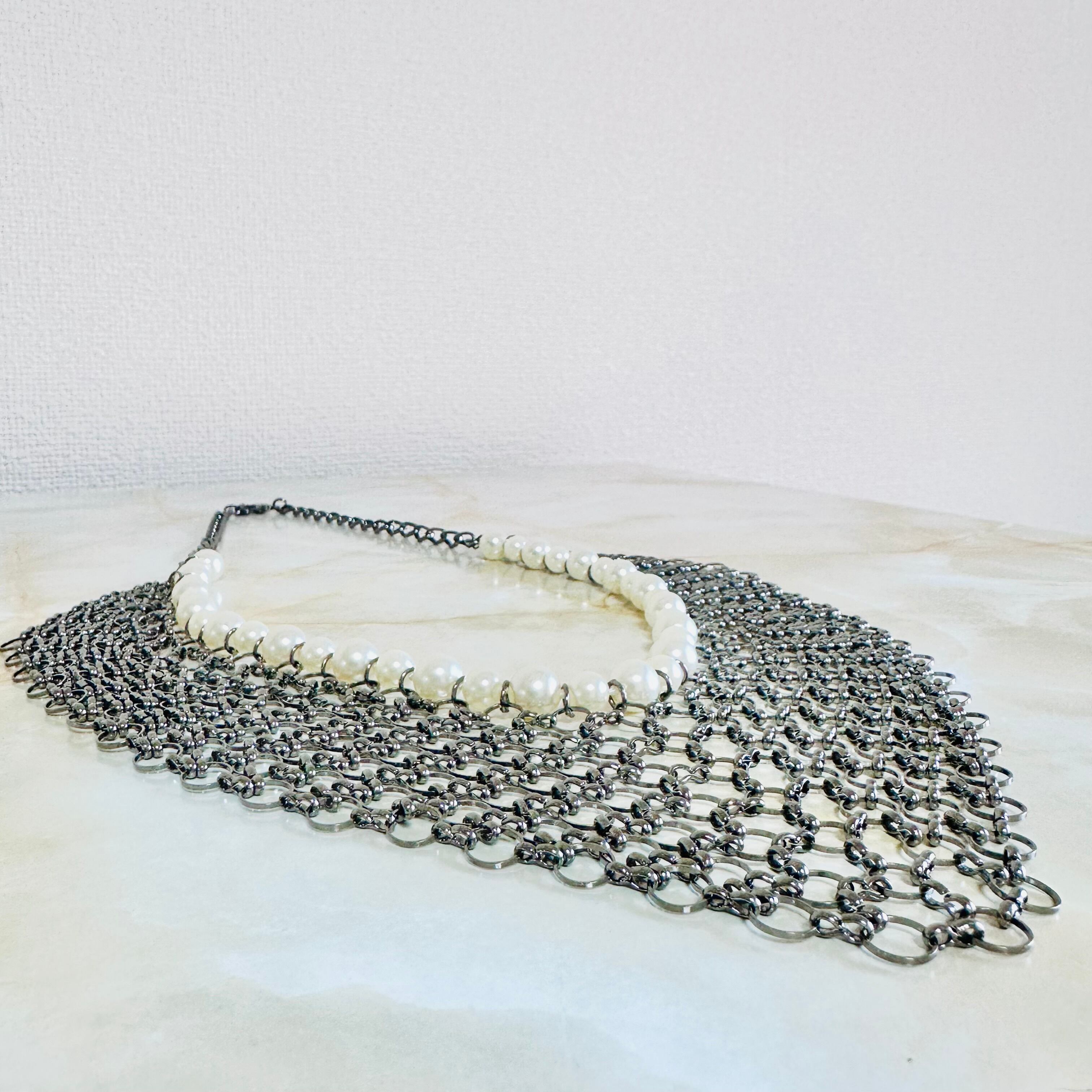 チェーンを布のように繋げ、大小大きさの異なるパールと組み合わせ、ユニークなデザインに仕上げてます。
