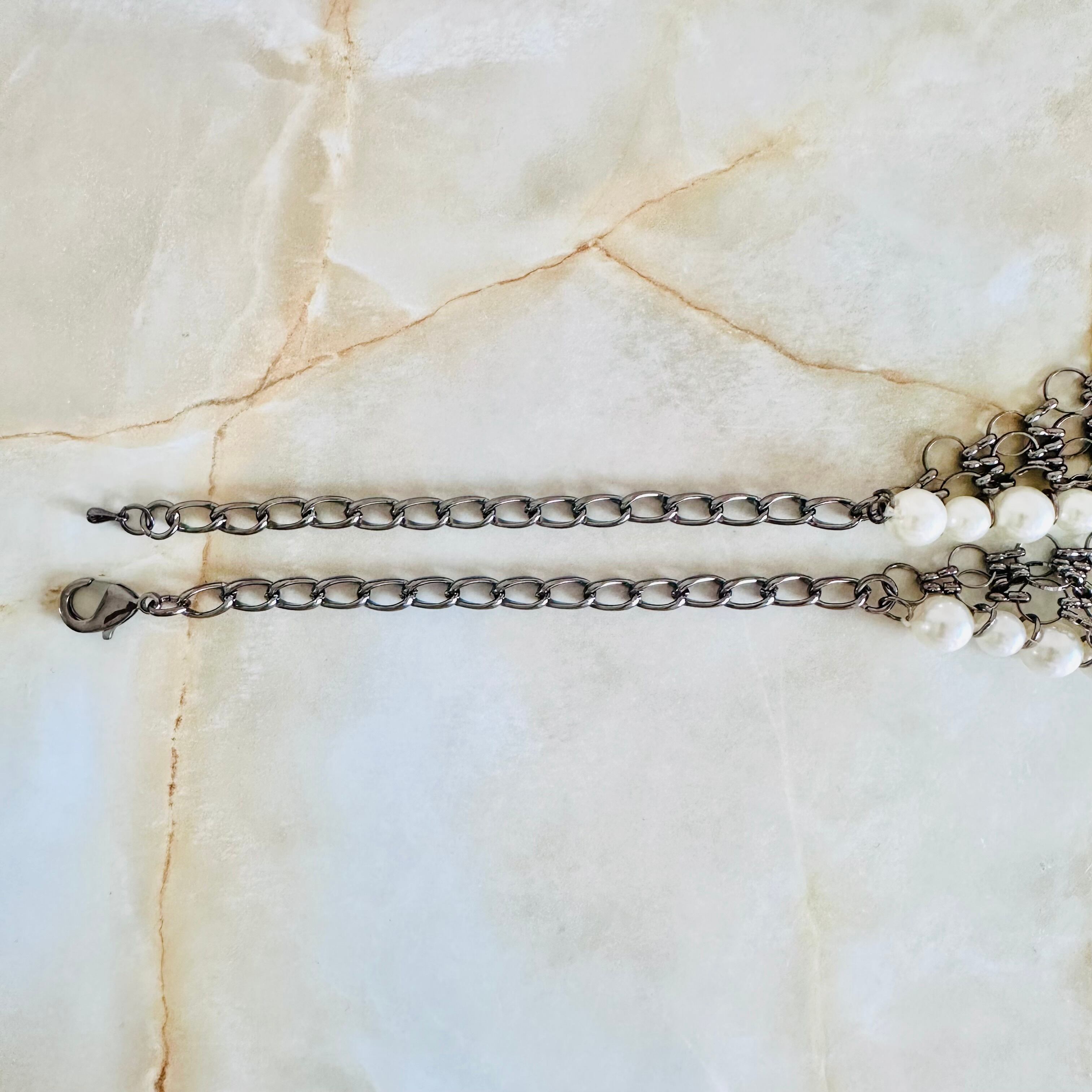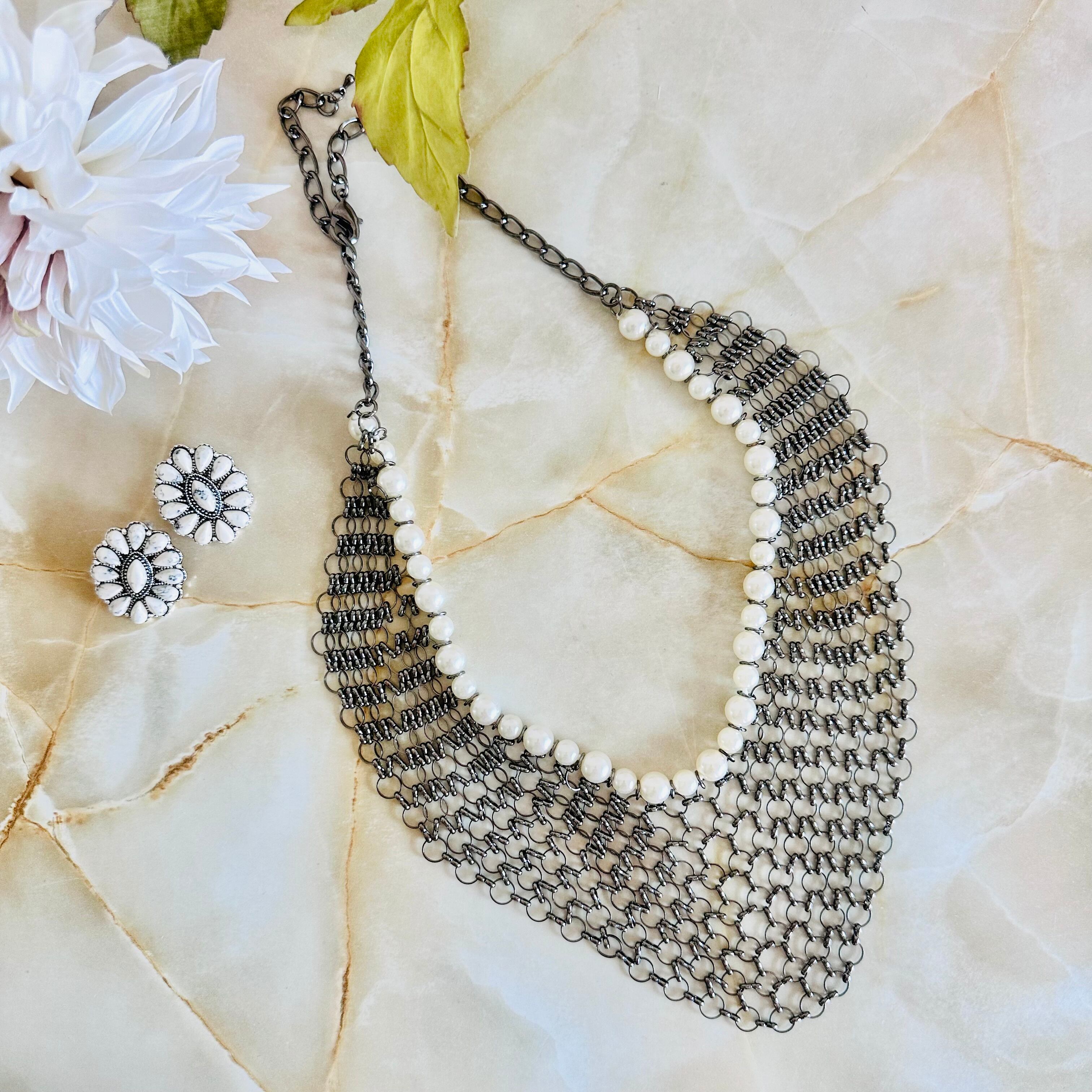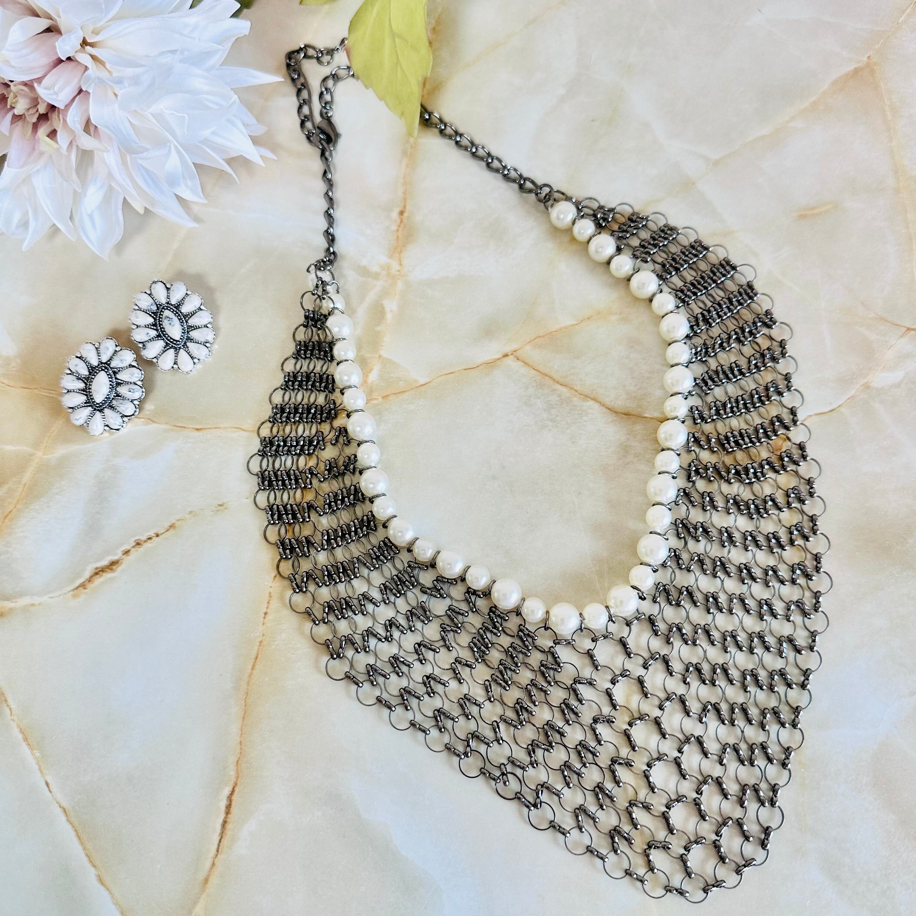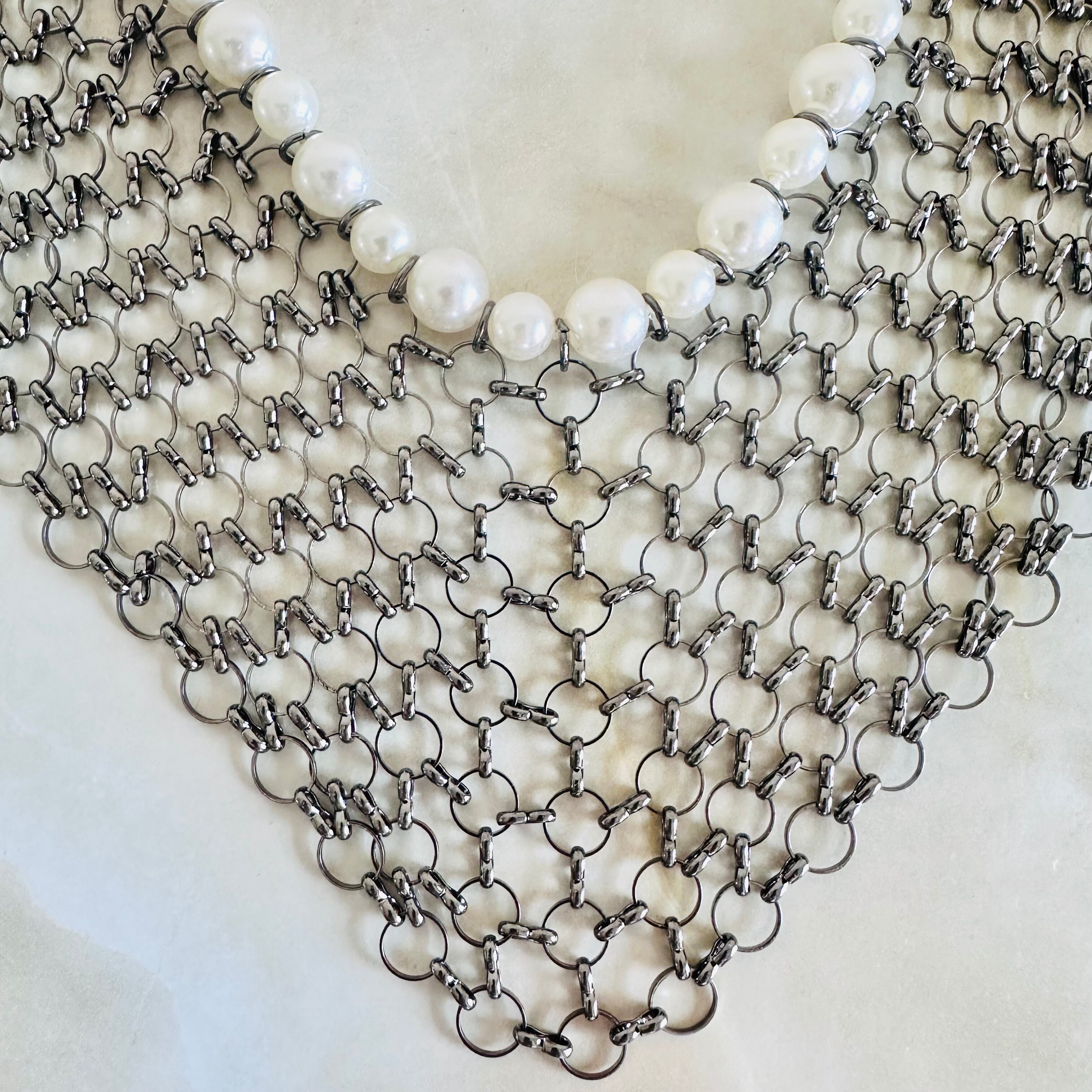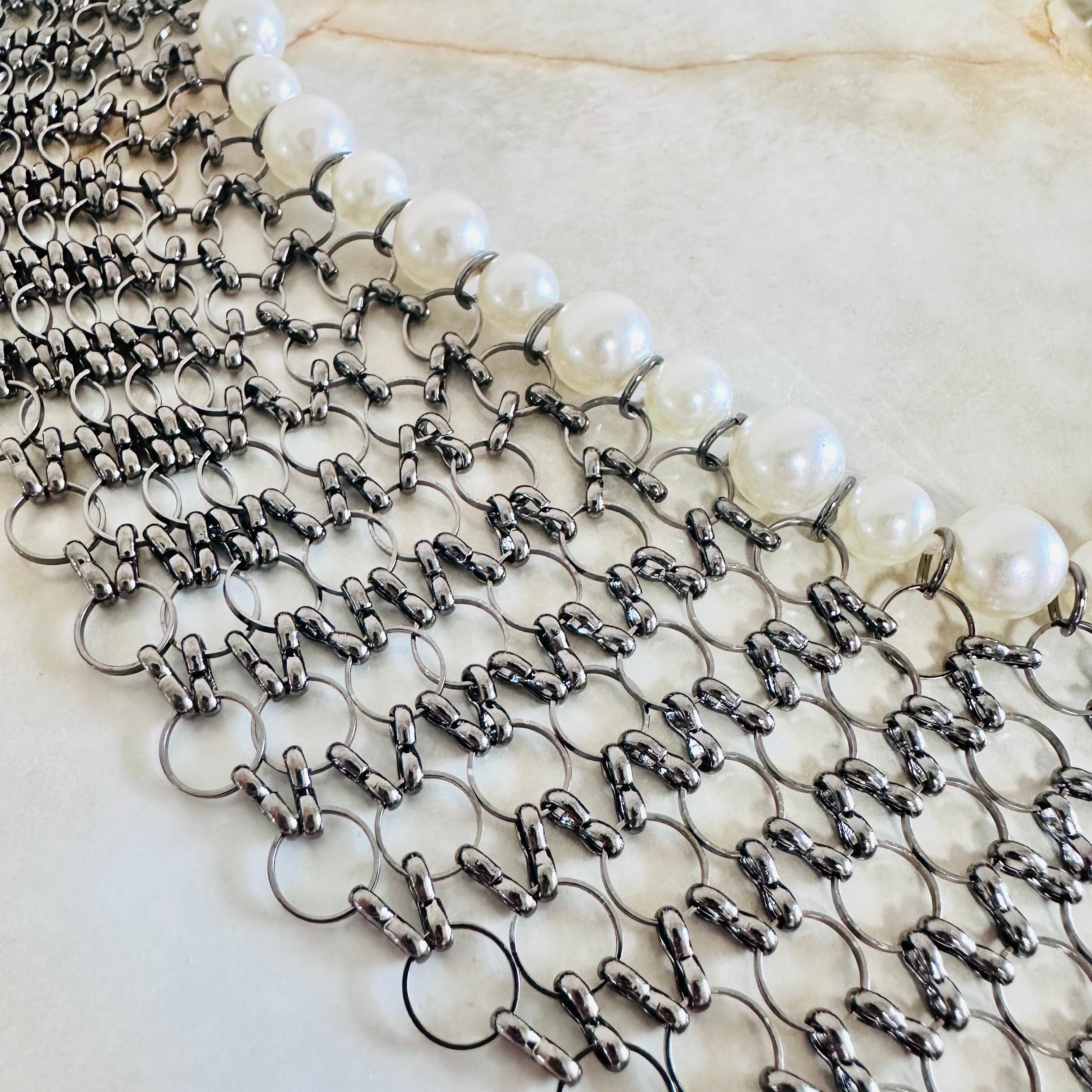 チェーンを布のように繋げ、大小大きさの異なるパールと組み合わせ、ユニークなデザインに仕上げてます。