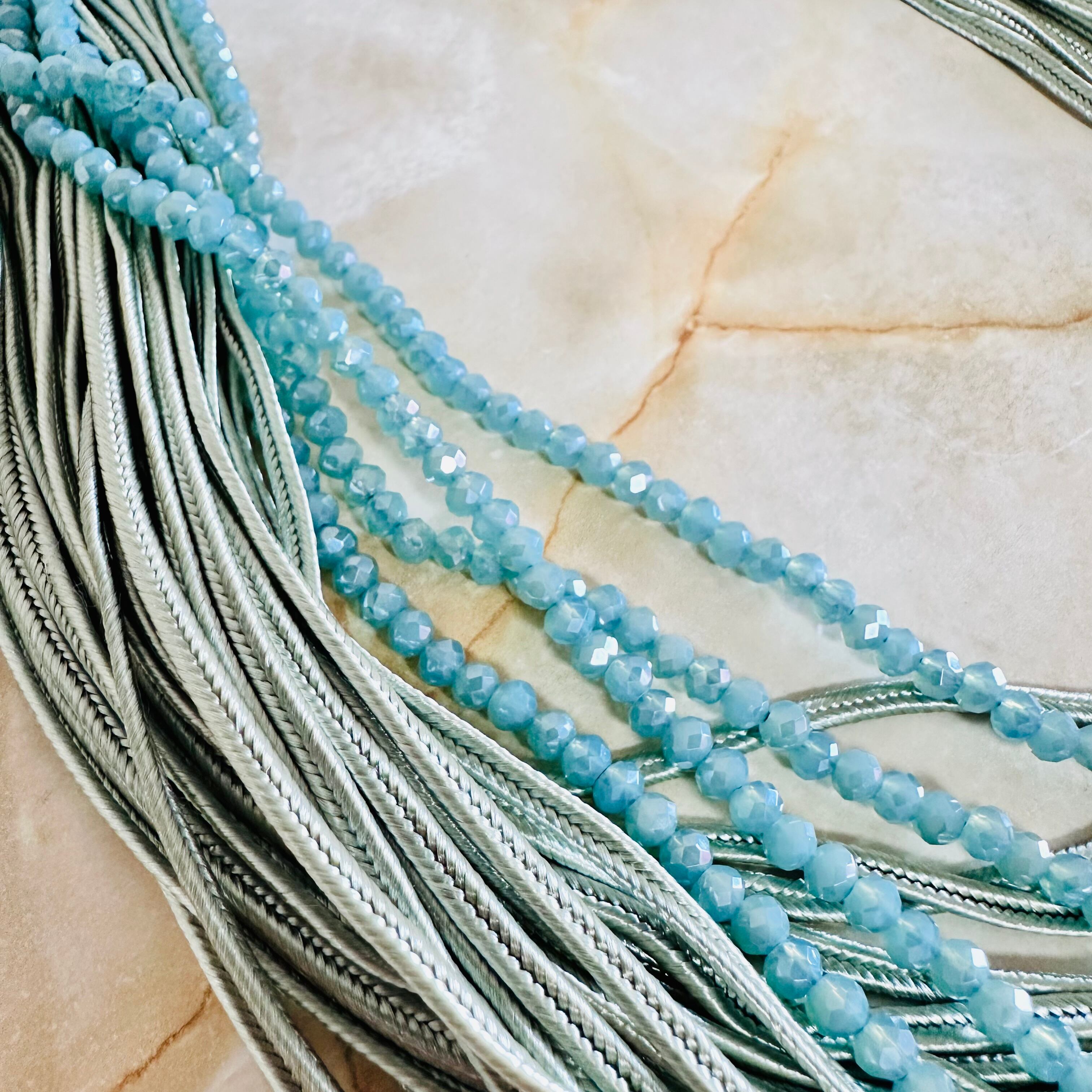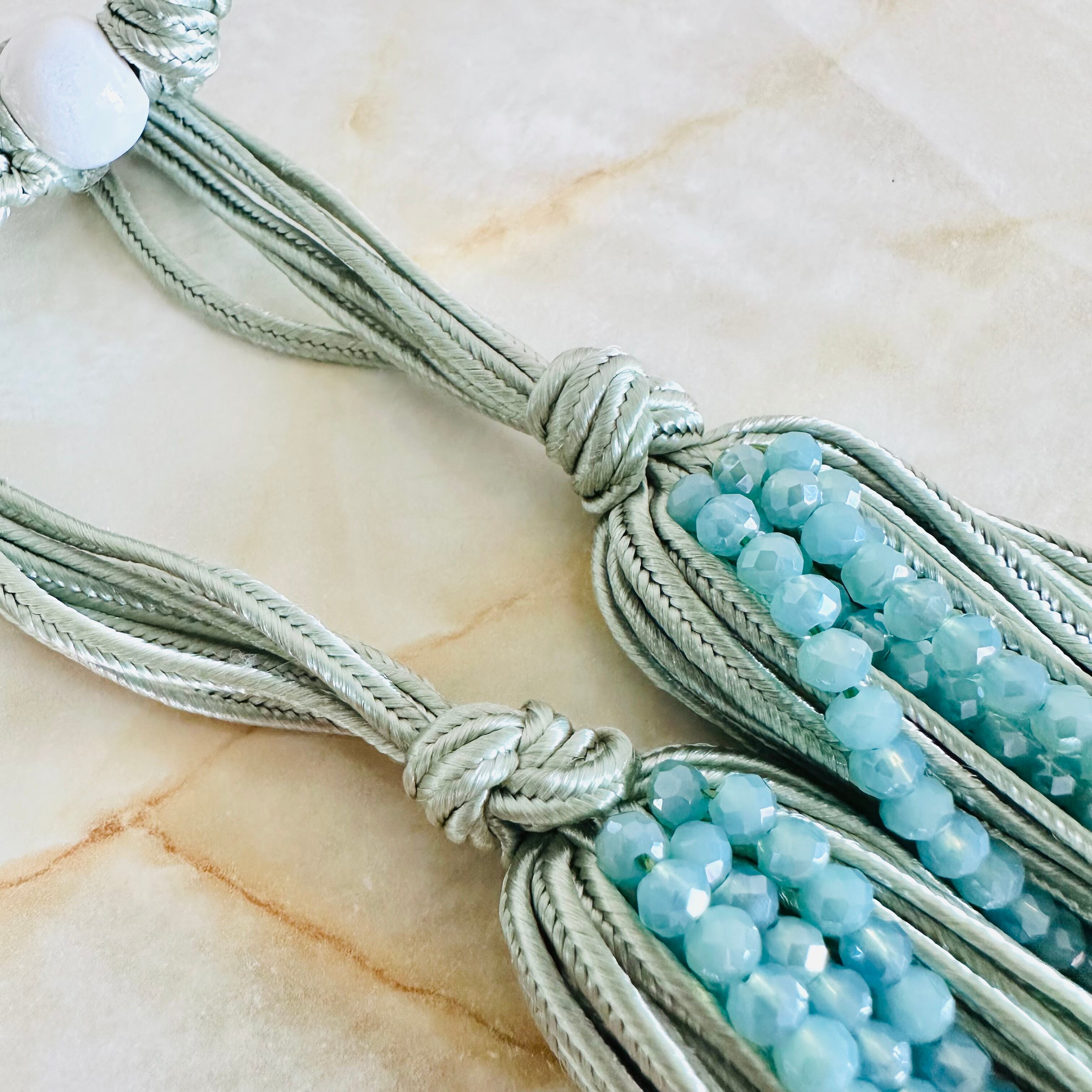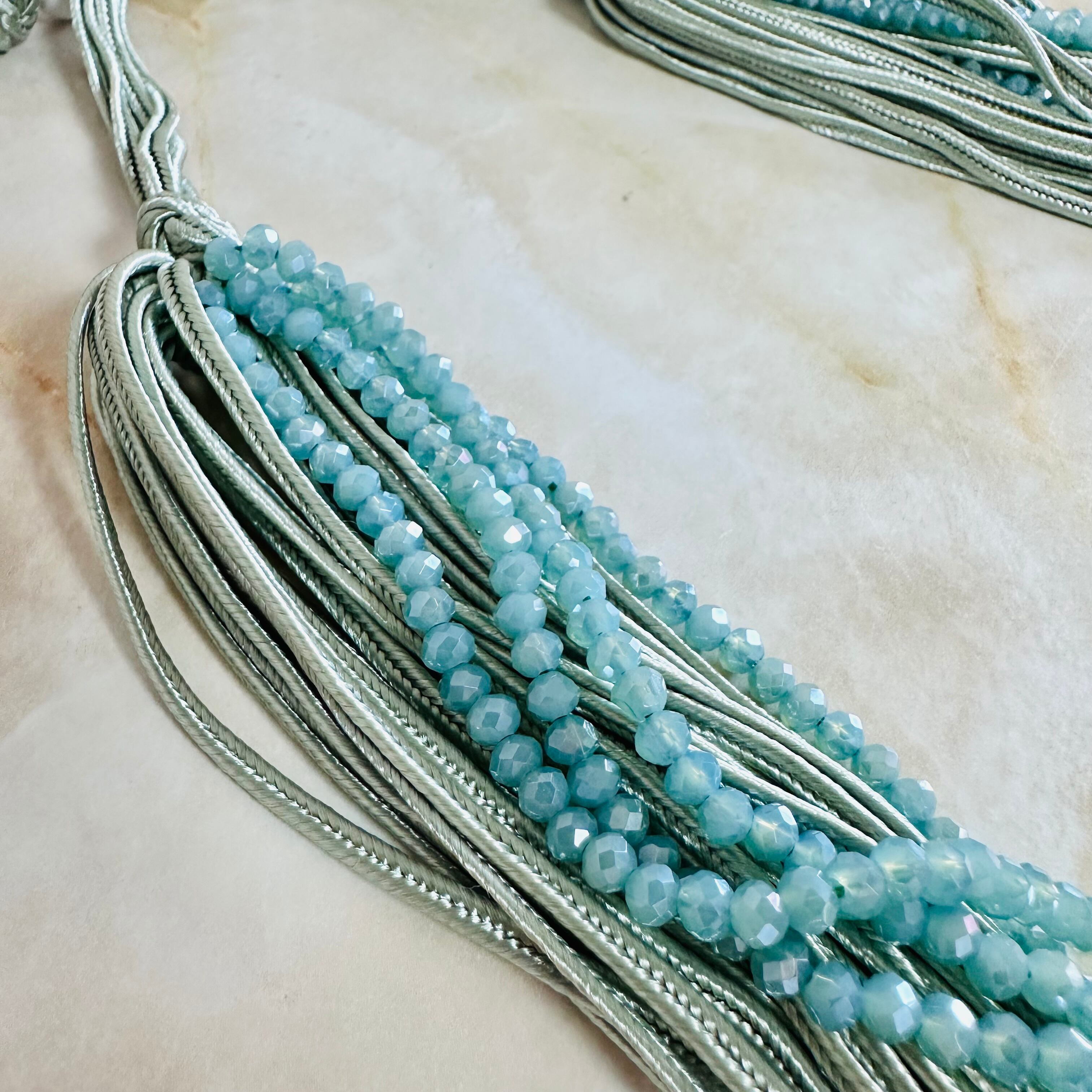 クリスタルビーズと光沢感のあるコードを幾重にも重ね、涼しげなデザインに仕上げました。