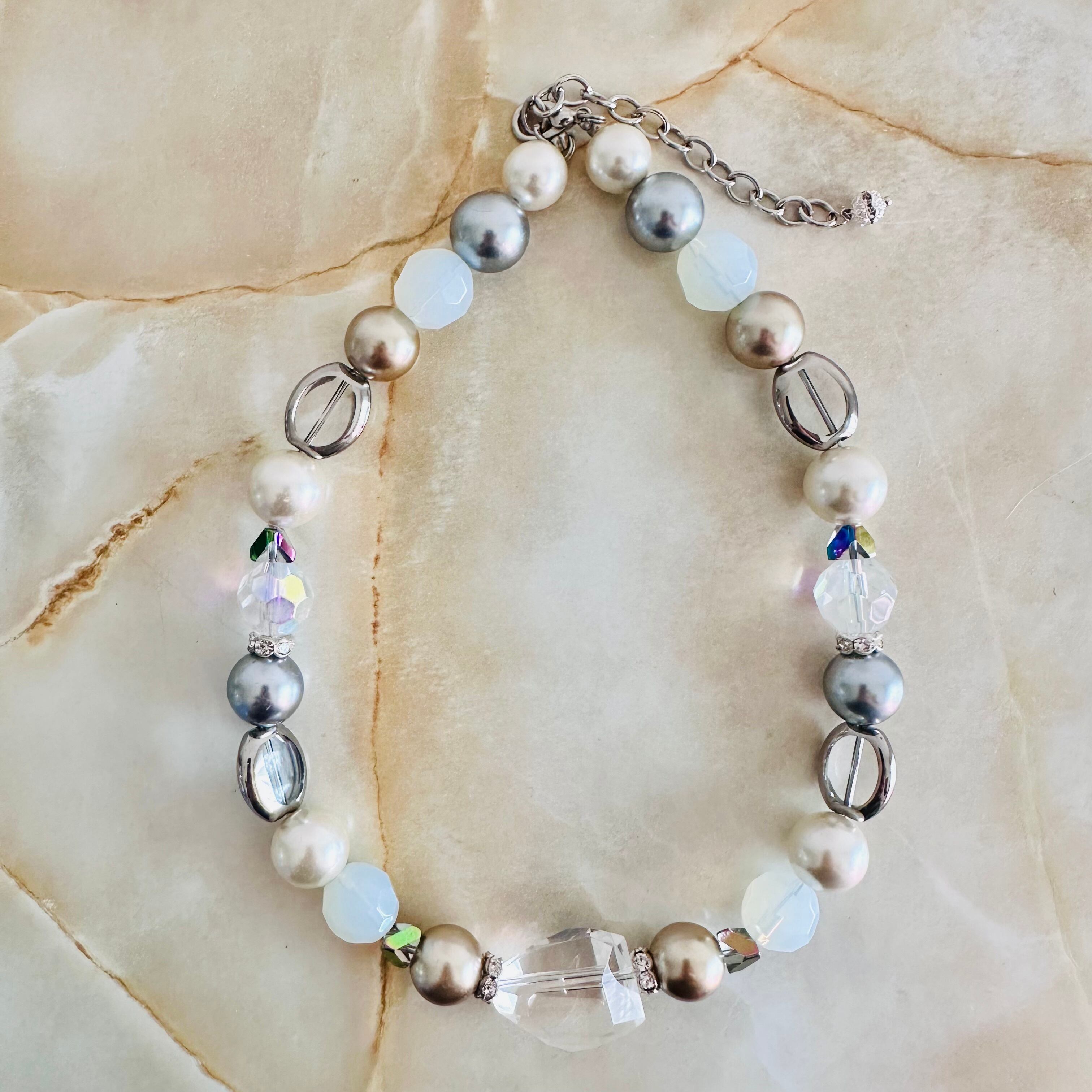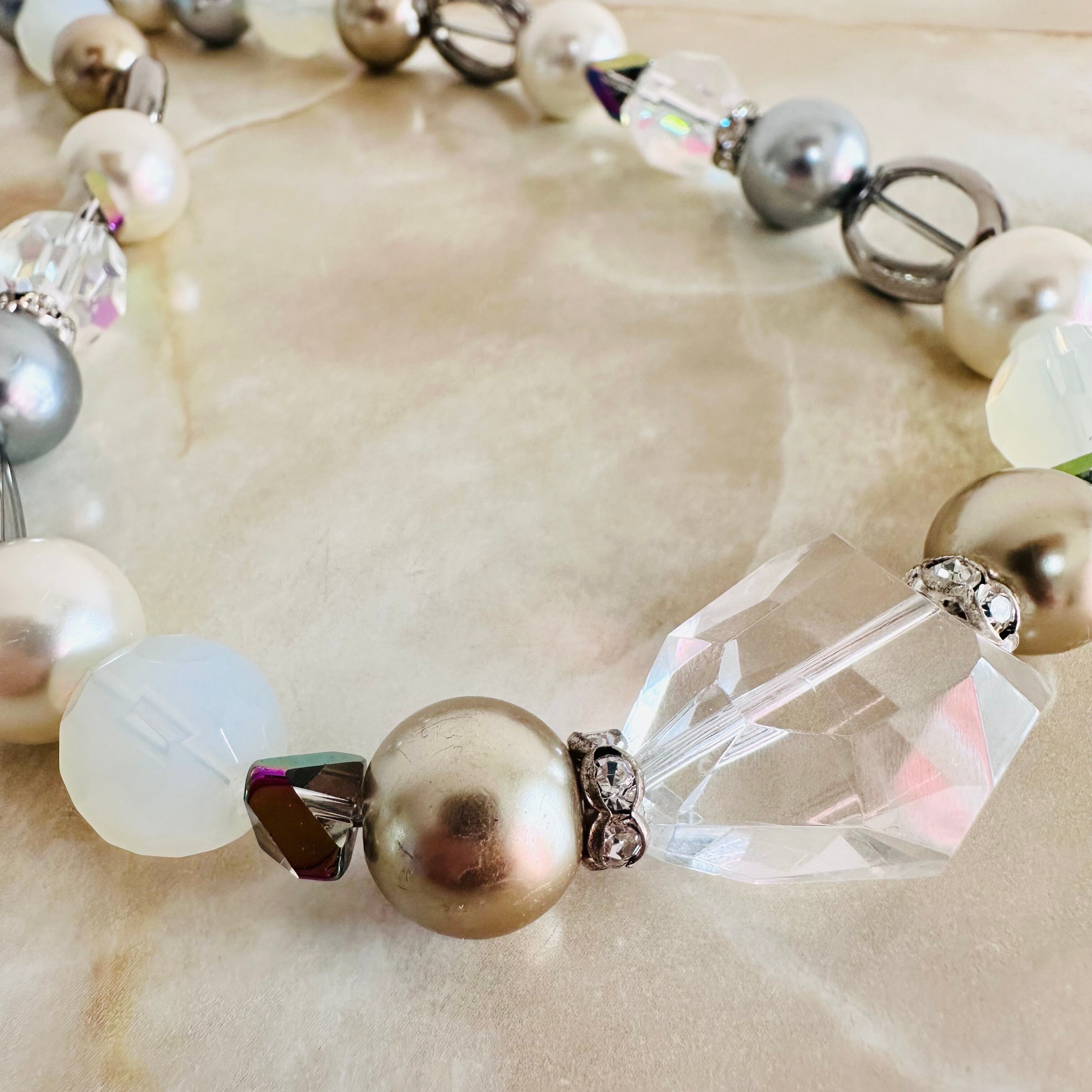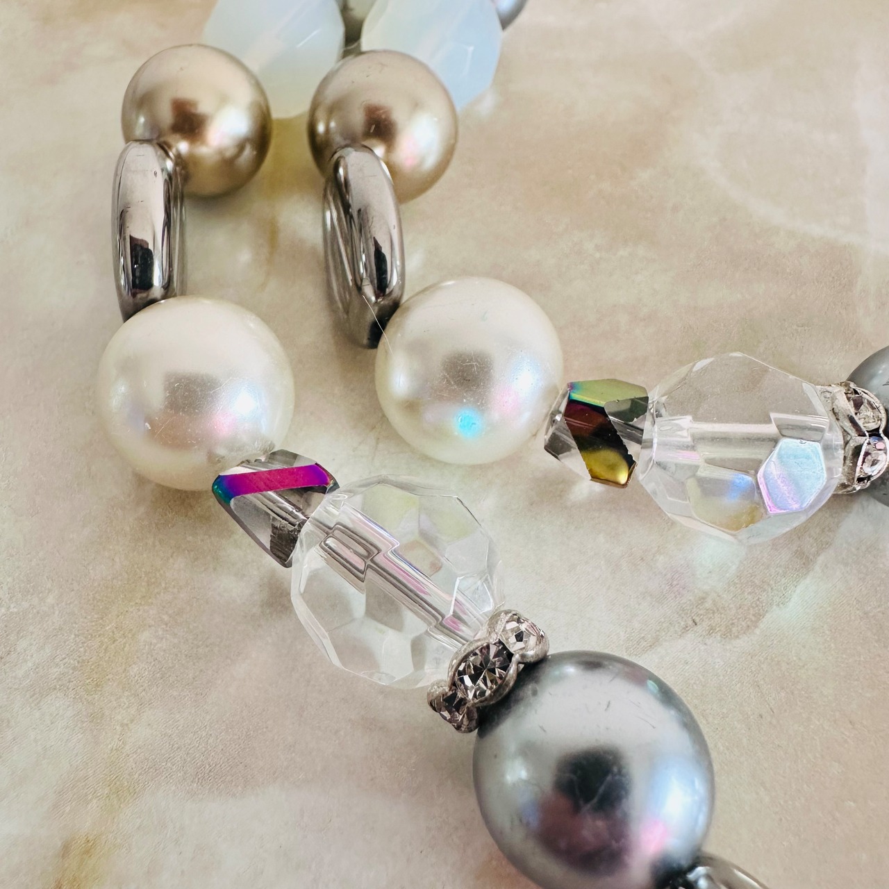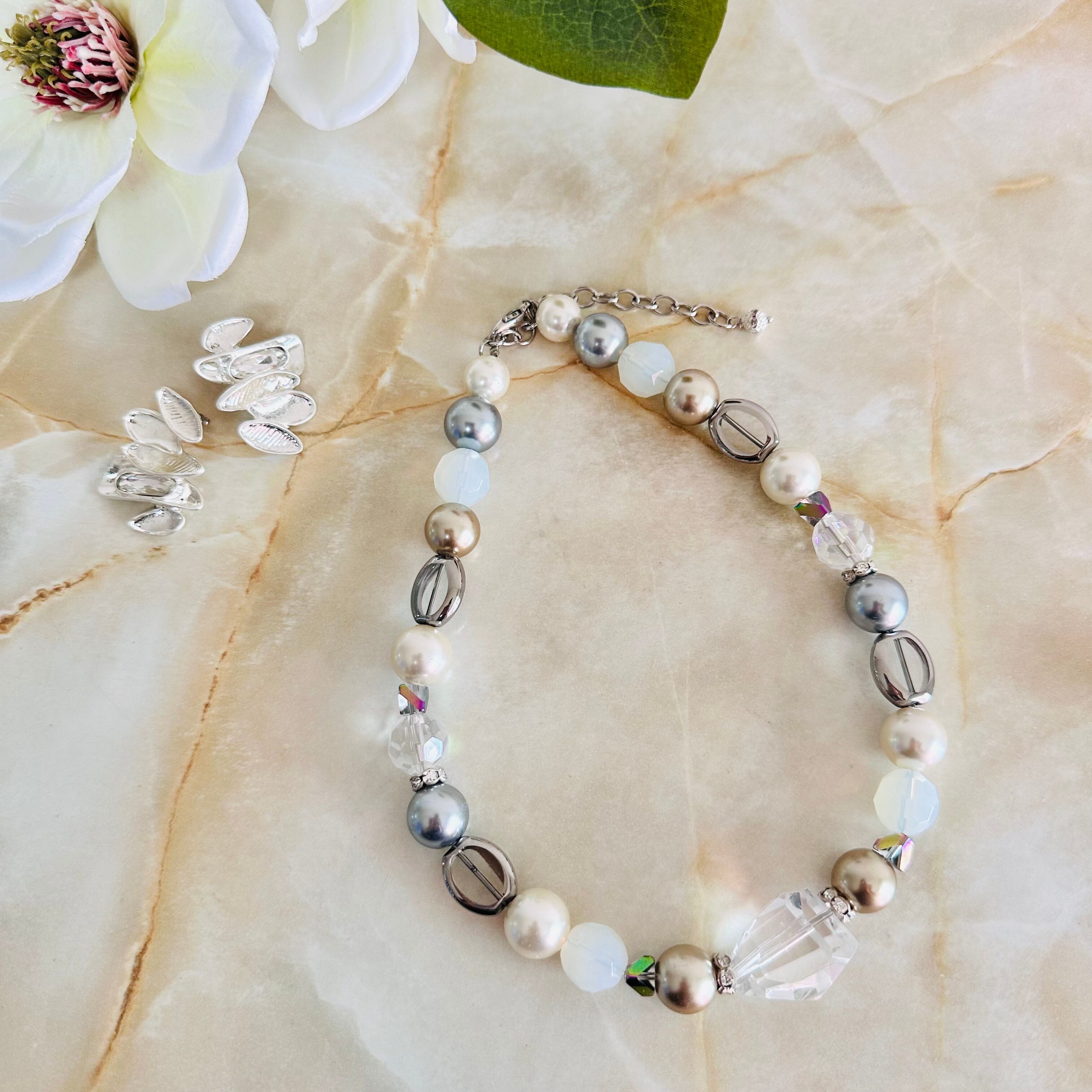 パールやクリスタル、ビジューなどさまざまなパーツを組み合わせ、それぞれを引き立てる為にシンプルなデザインに仕上げました。