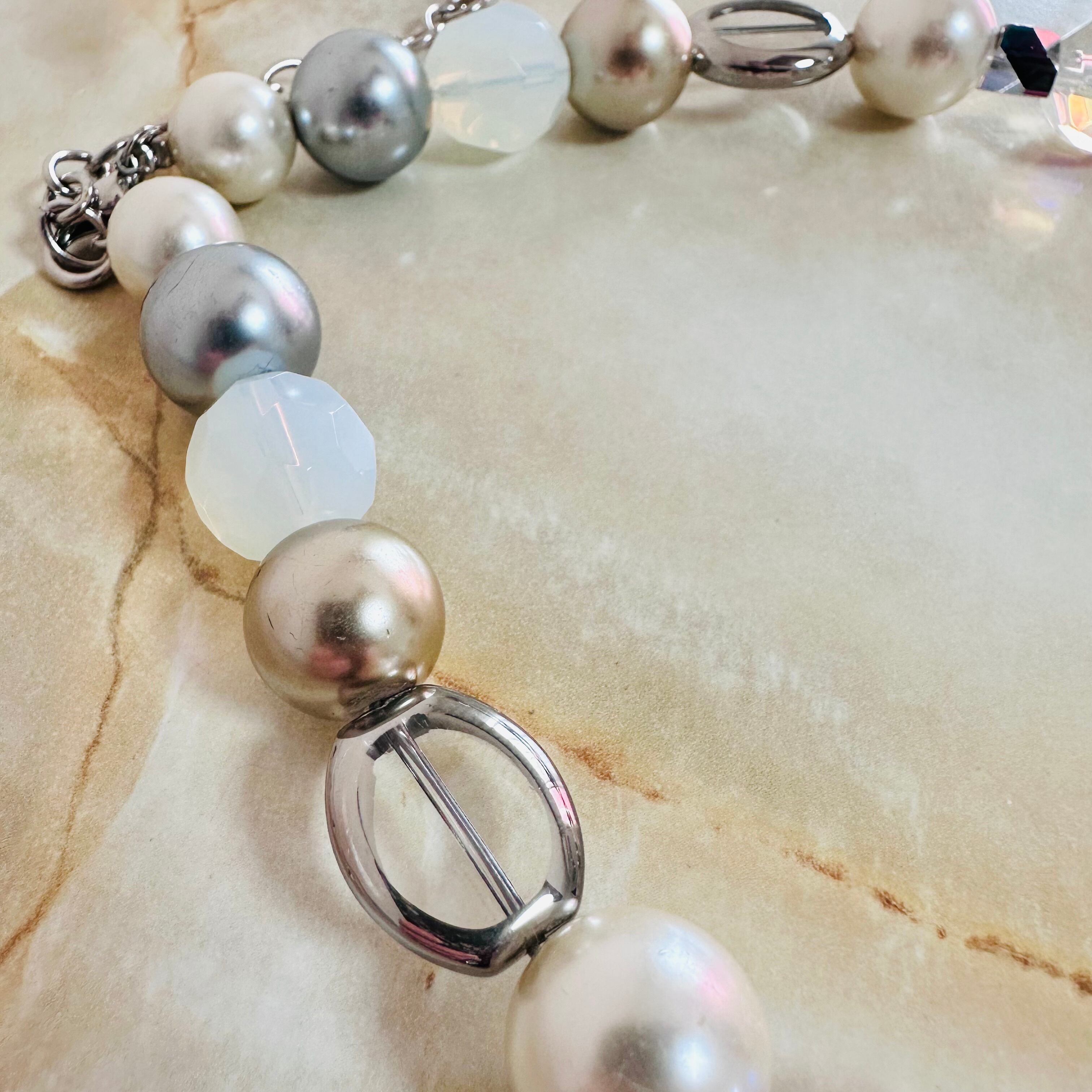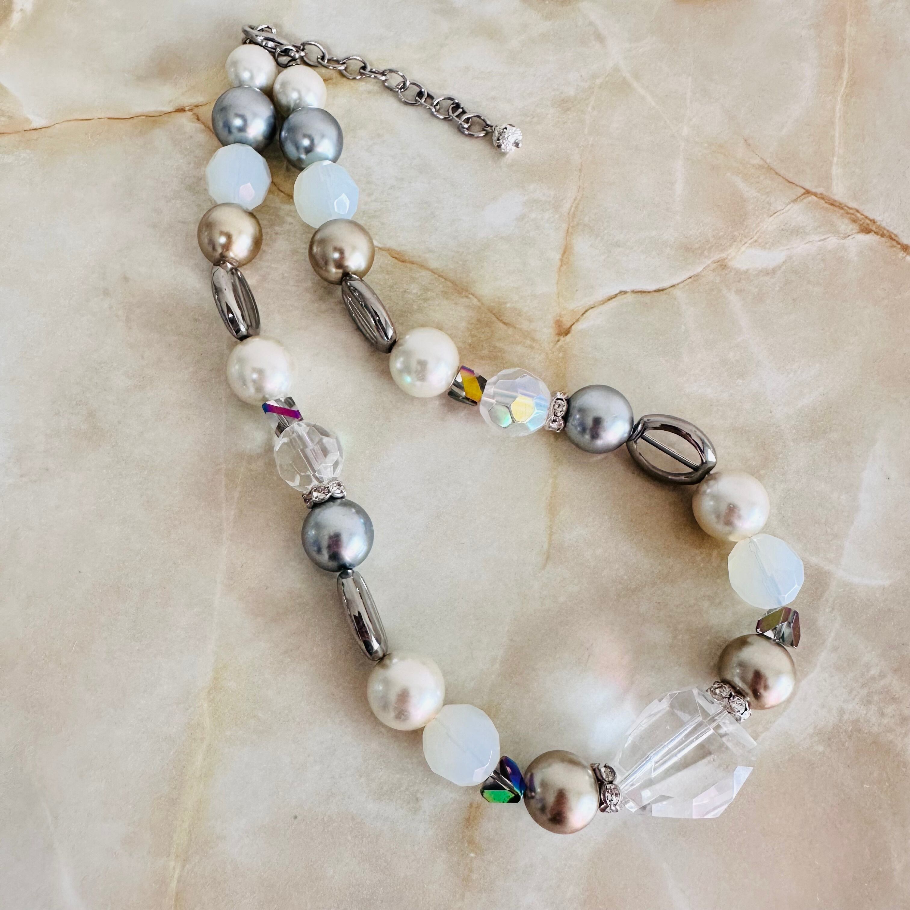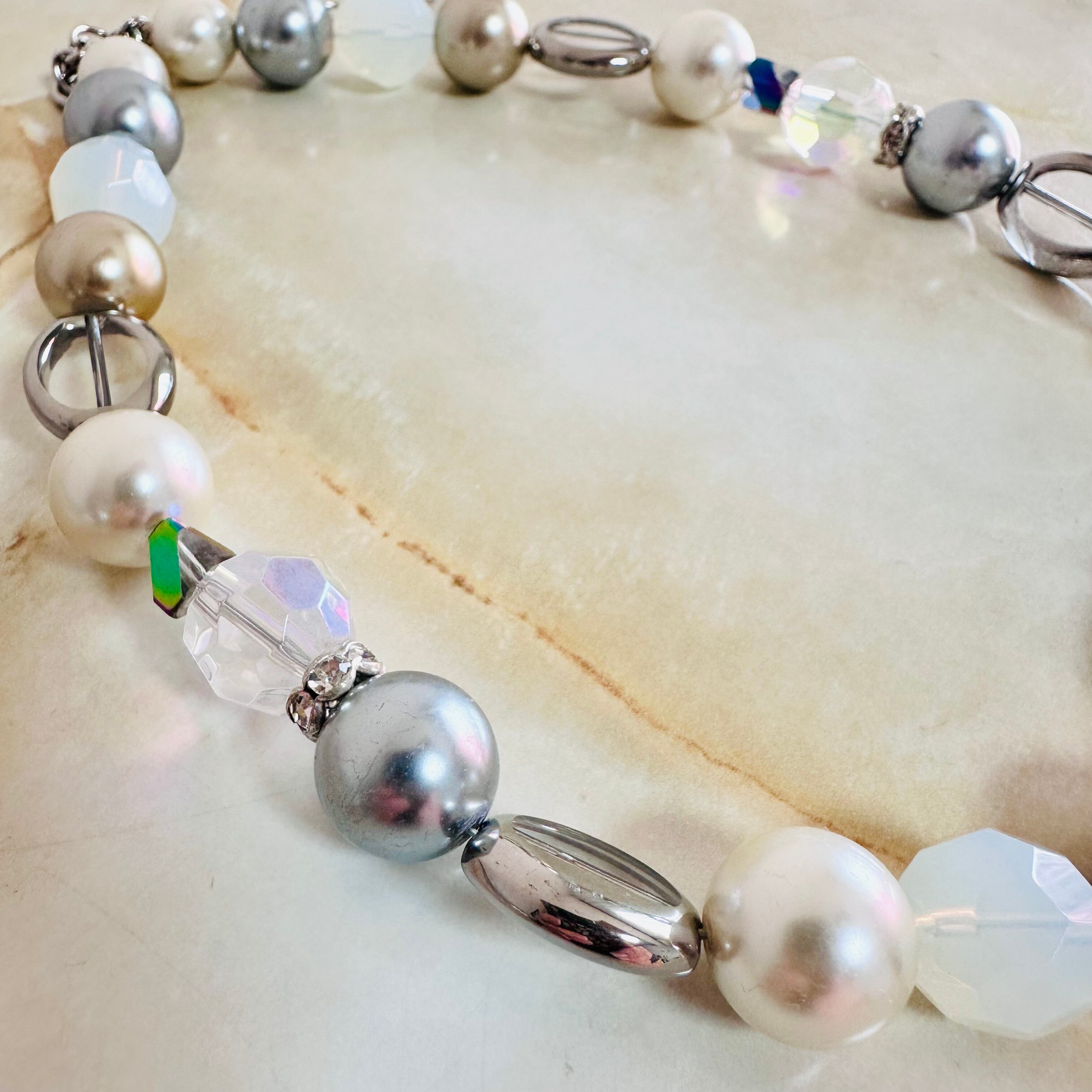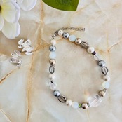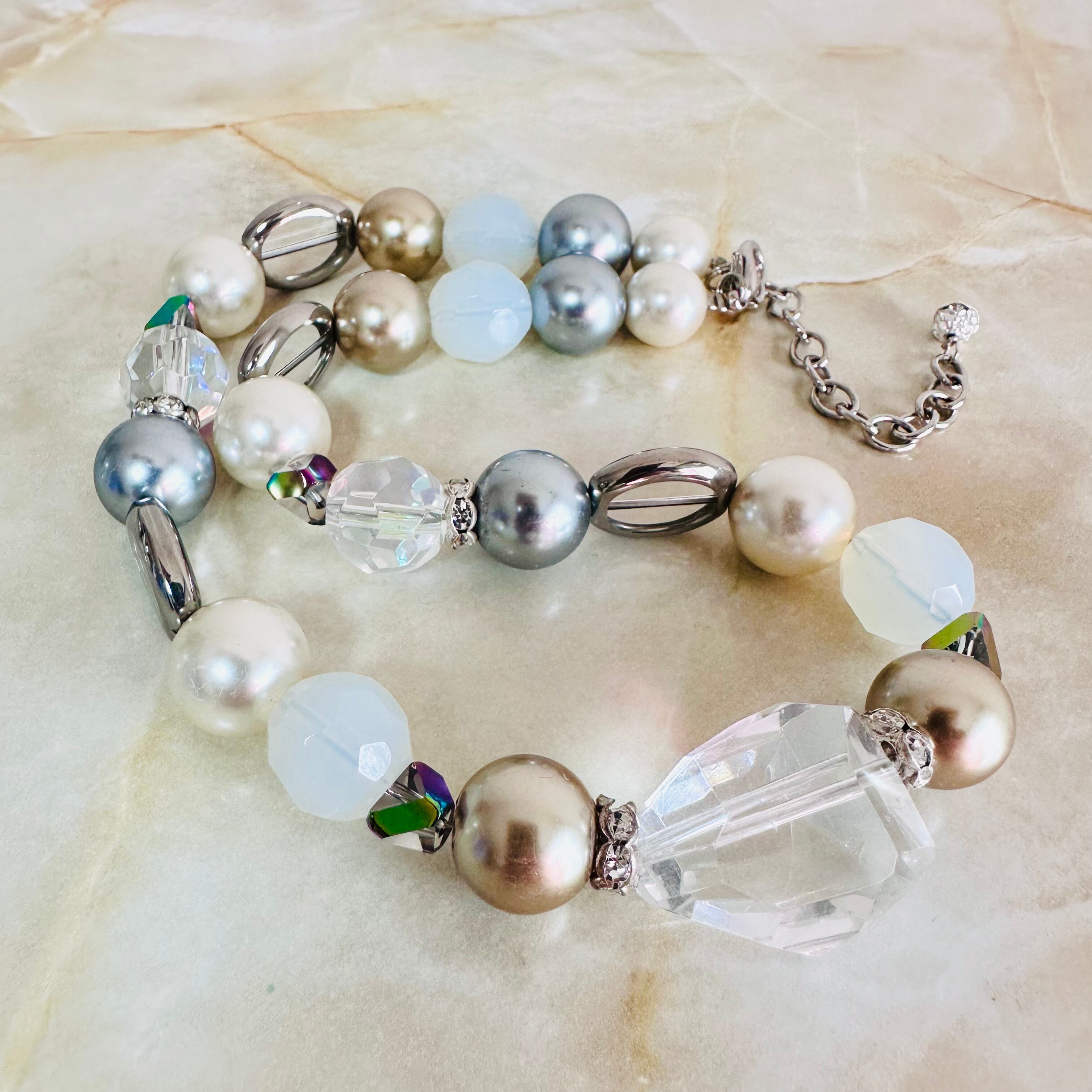 パールやクリスタル、ビジューなどさまざまなパーツを組み合わせ、それぞれを引き立てる為にシンプルなデザインに仕上げました。