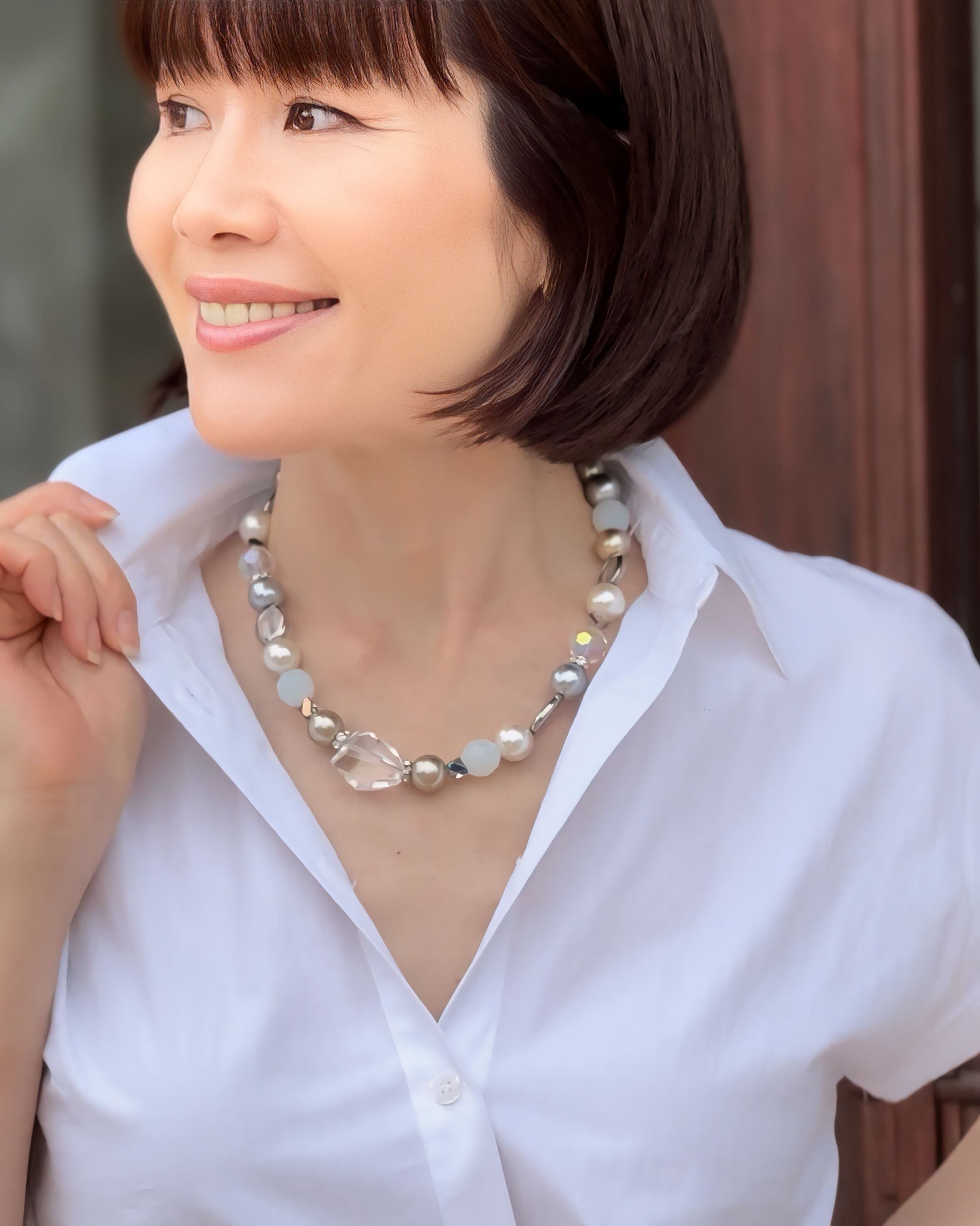 控えめな色使いで上品な印象がありつつも、光が当たるたびにオーロラ調に輝くさまはフレッシュで若々しさを表現してくれます。