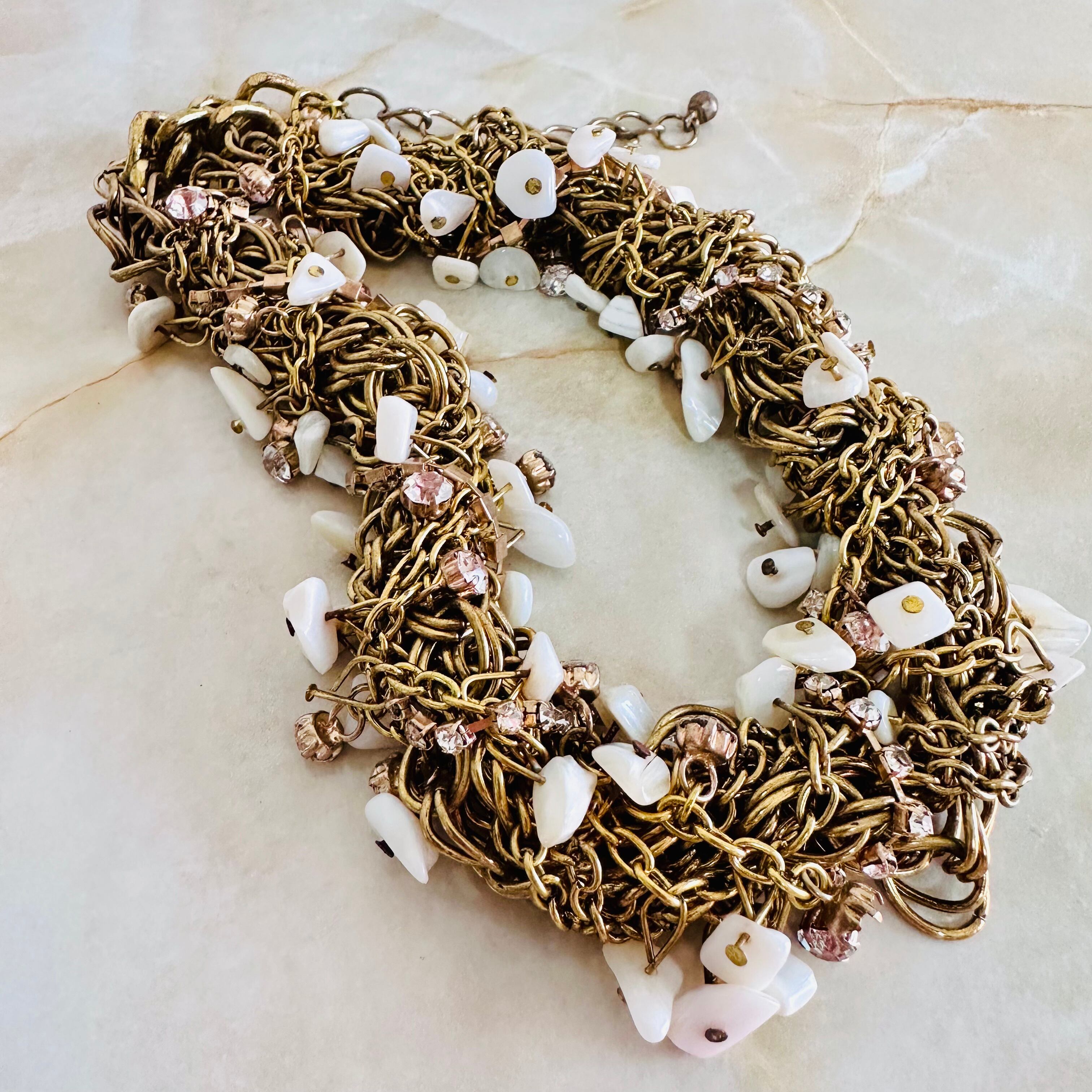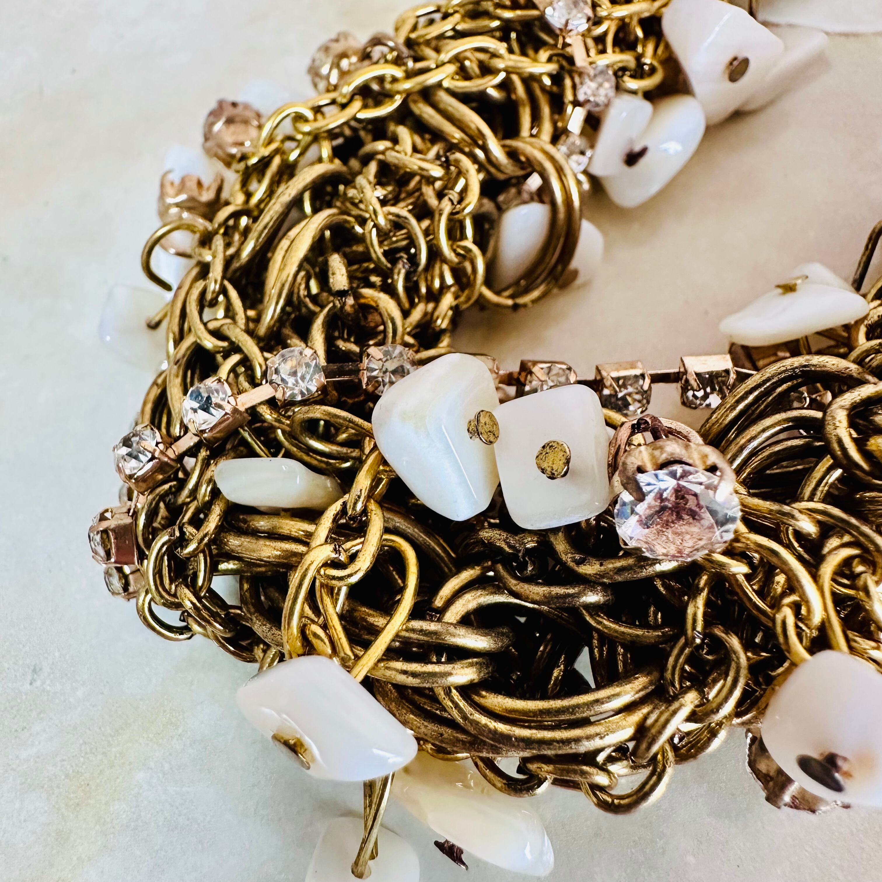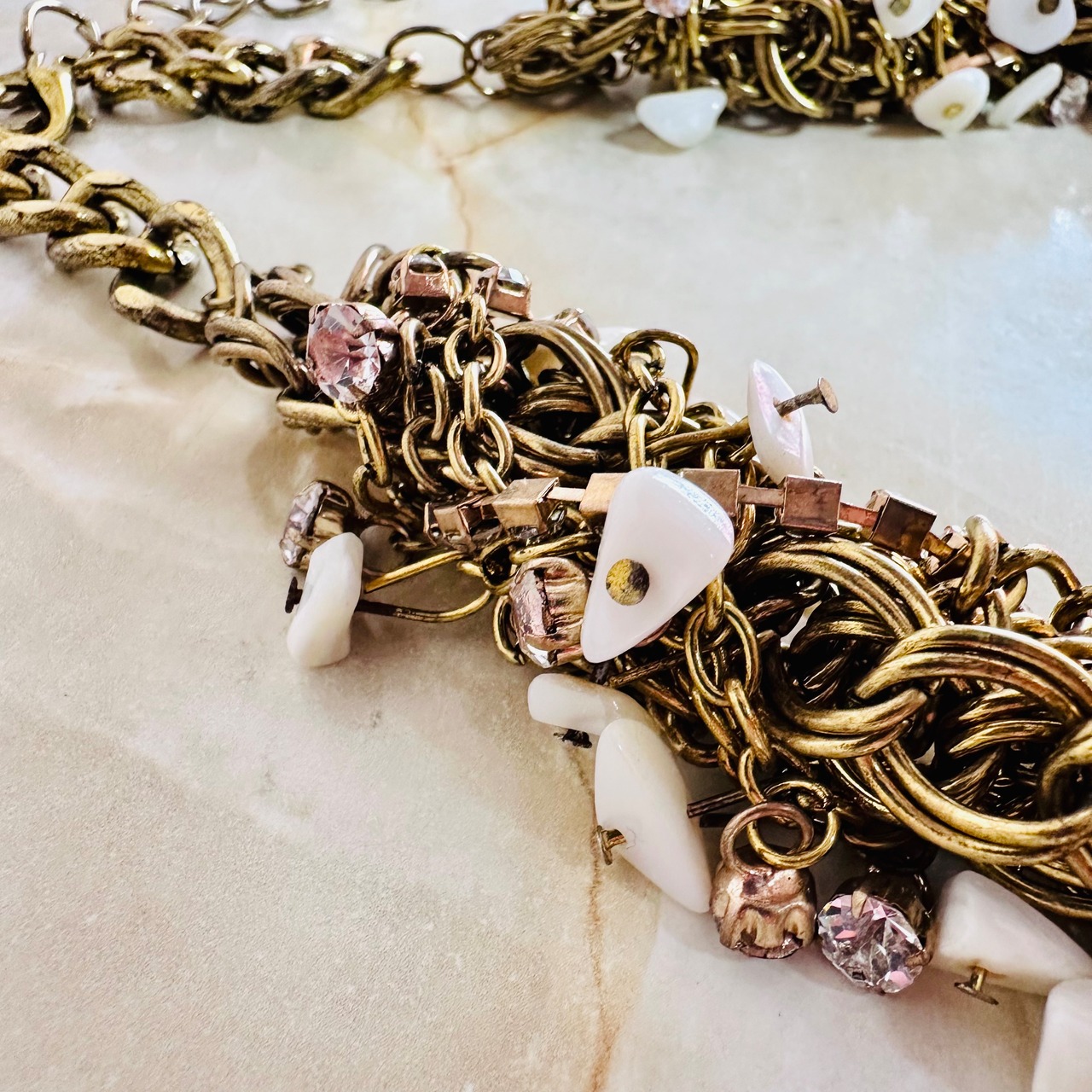 数種類のチャンキーチェーンを捻じ上げ、アイボリーカラーのストーンやラインストーンを取り付けたゴージャスなデザインです。