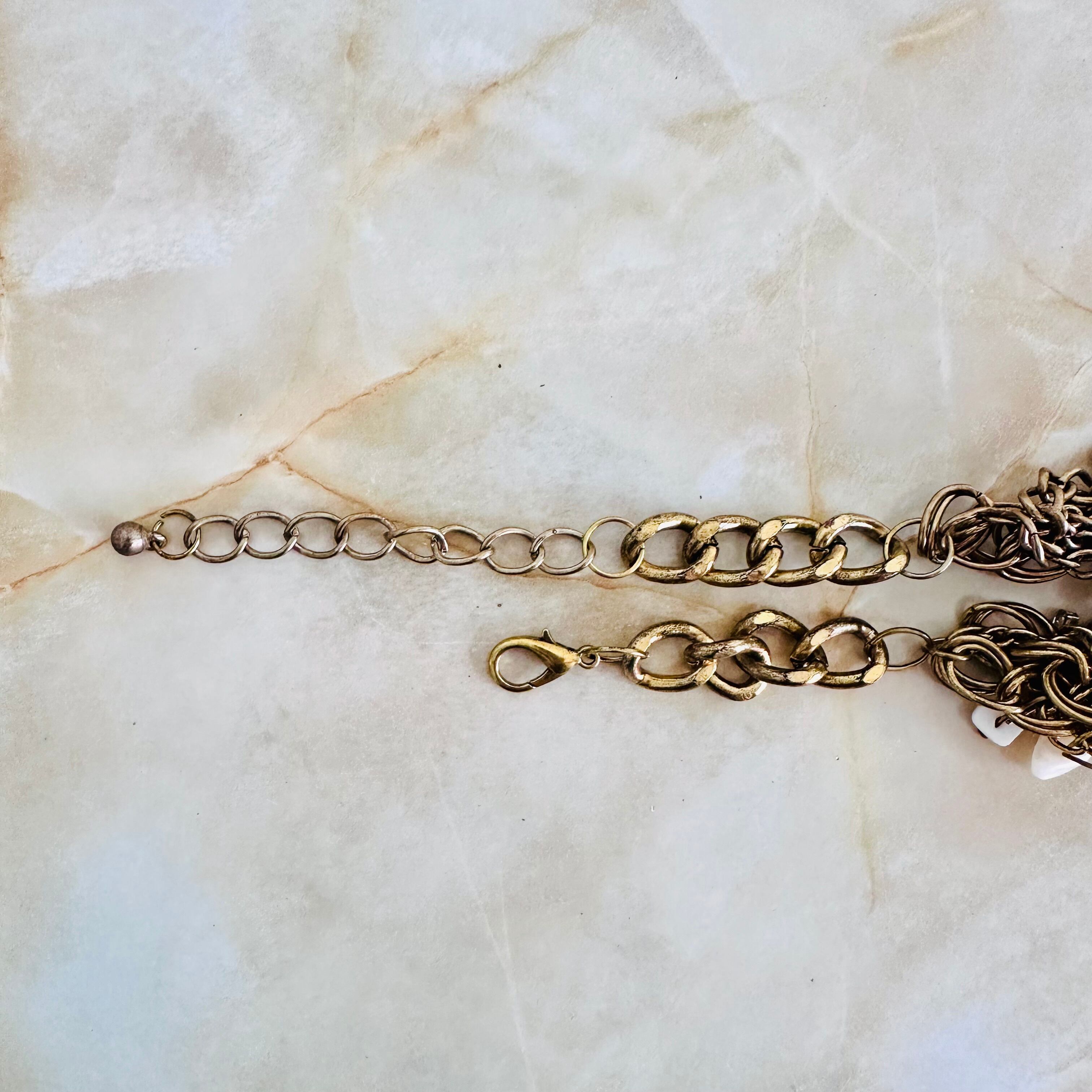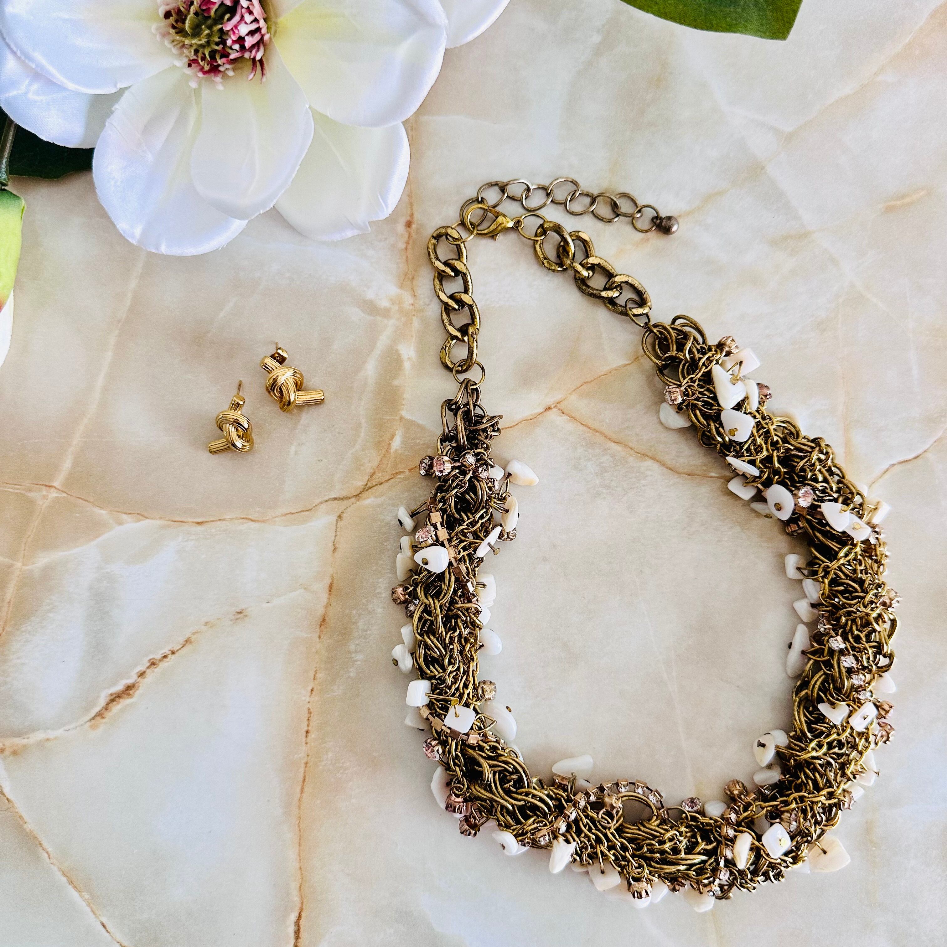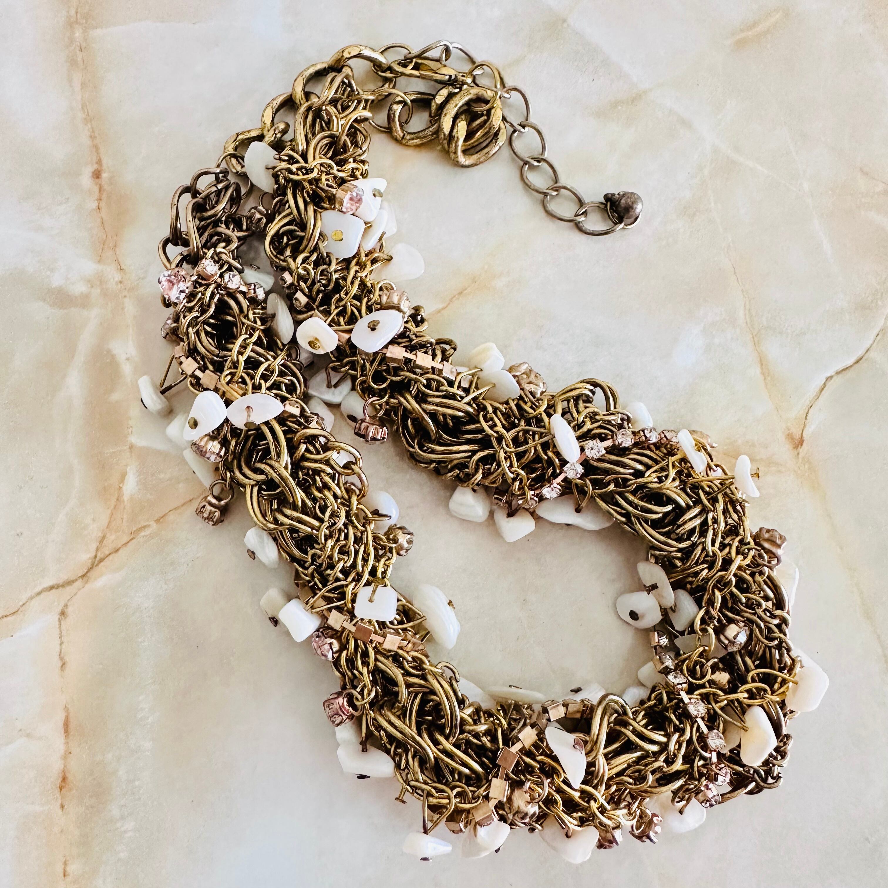 数種類のチャンキーチェーンを捻じ上げ、アイボリーカラーのストーンやラインストーンを取り付けたゴージャスなデザインです。