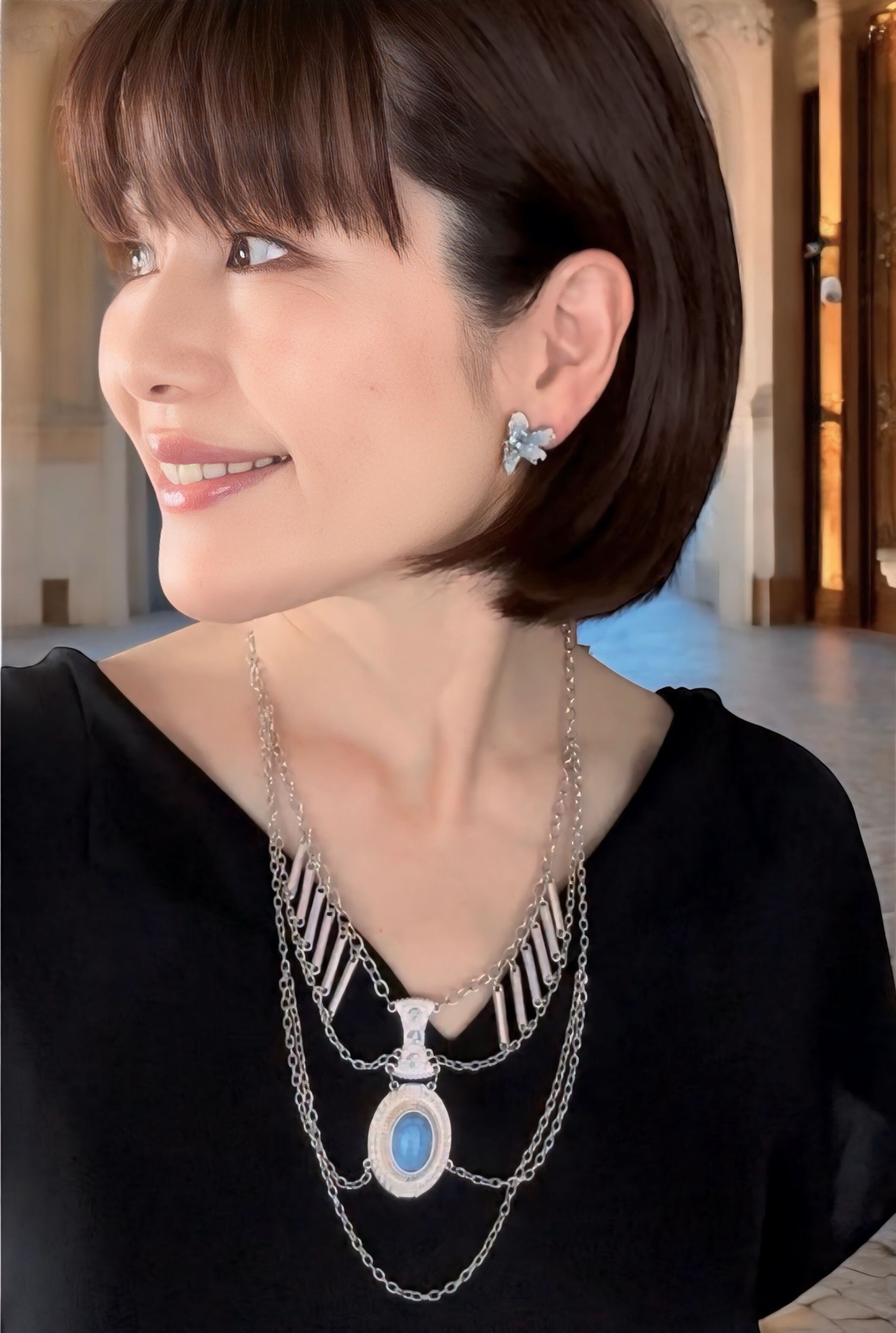 ガラスパーツを使用しブルーのグラデーションと華やかなラインストーンでフラワーモチーフを型どったデザインです。