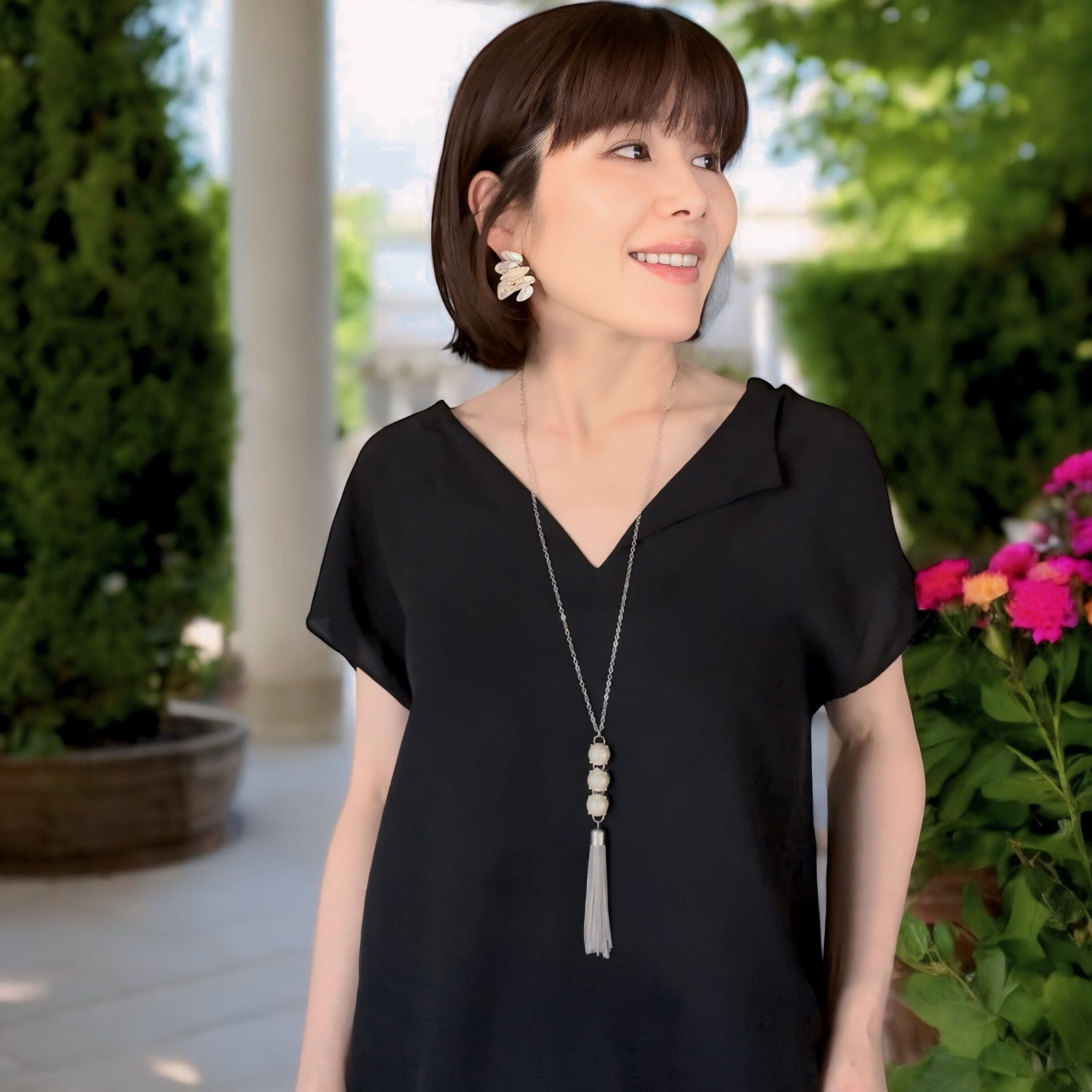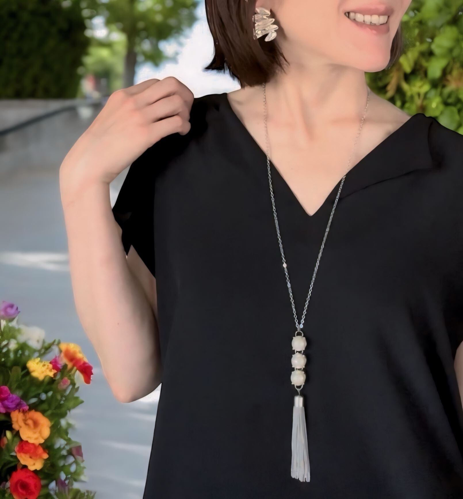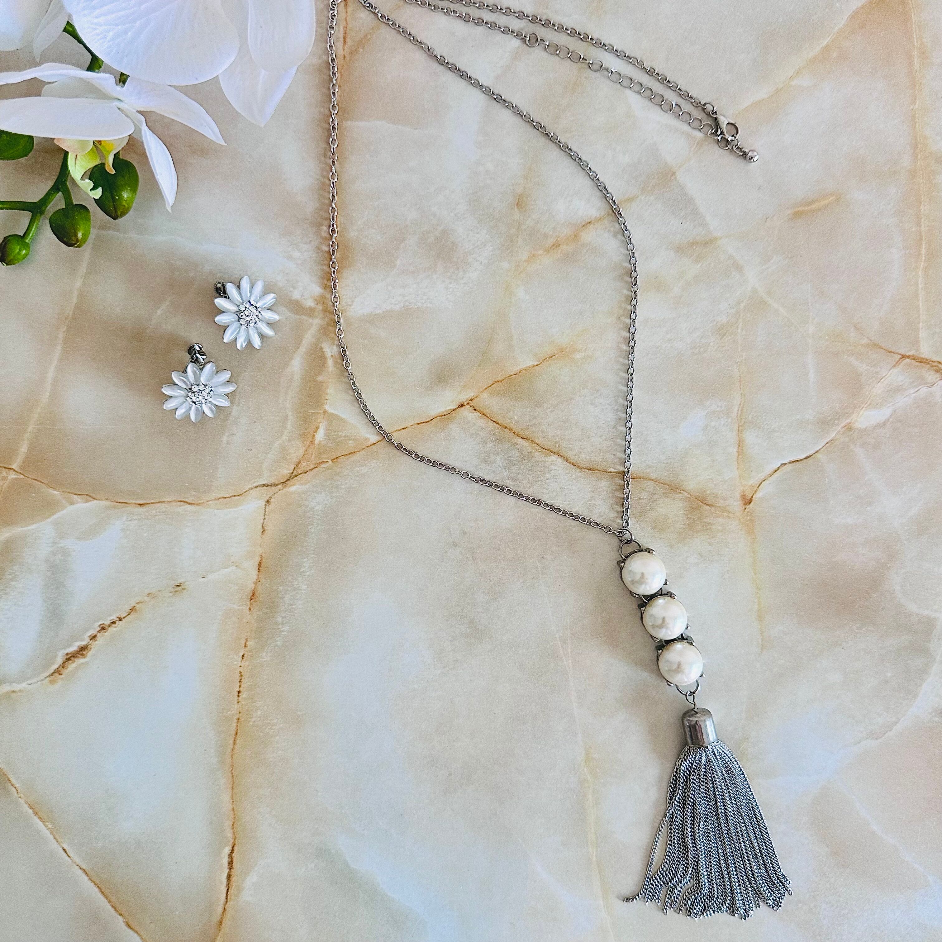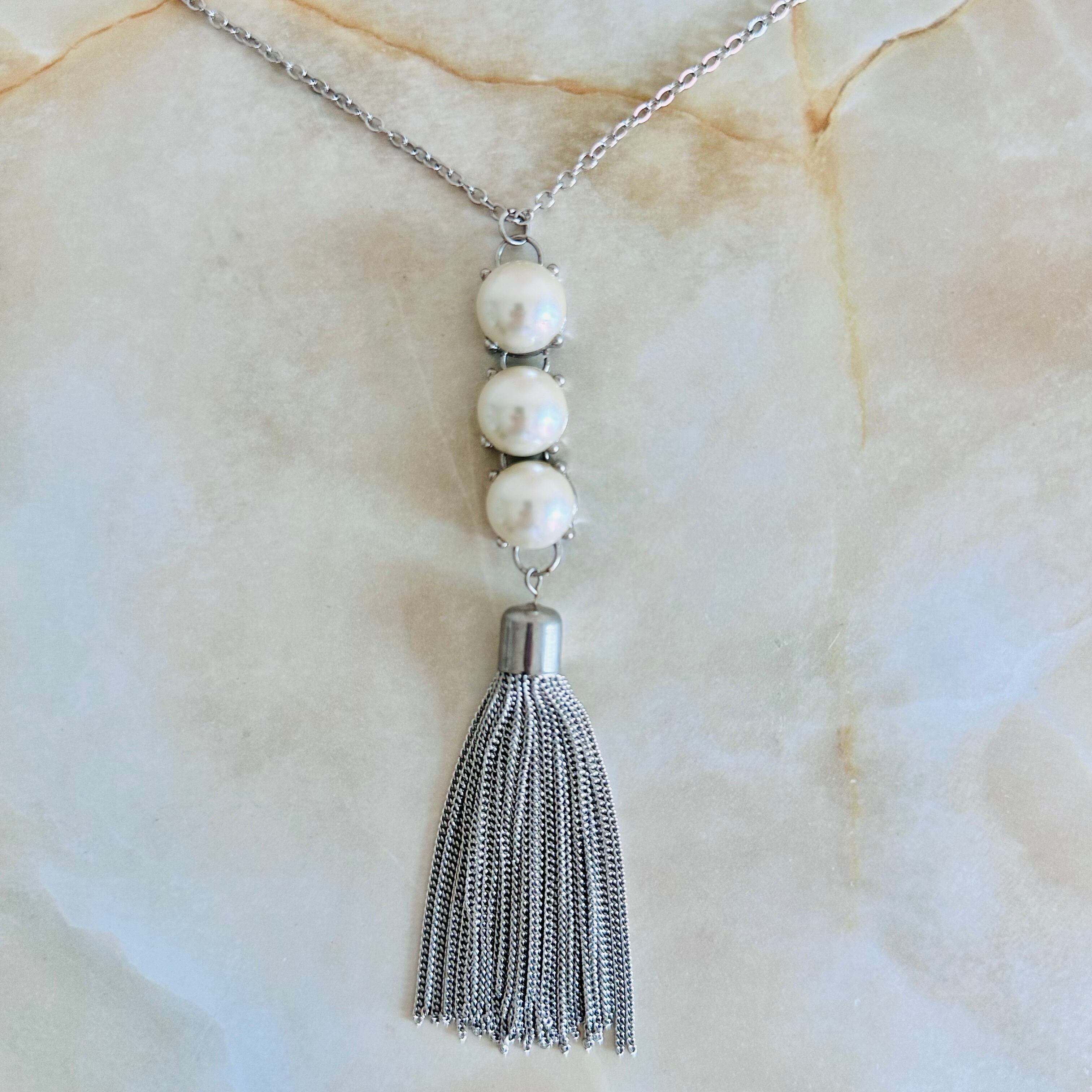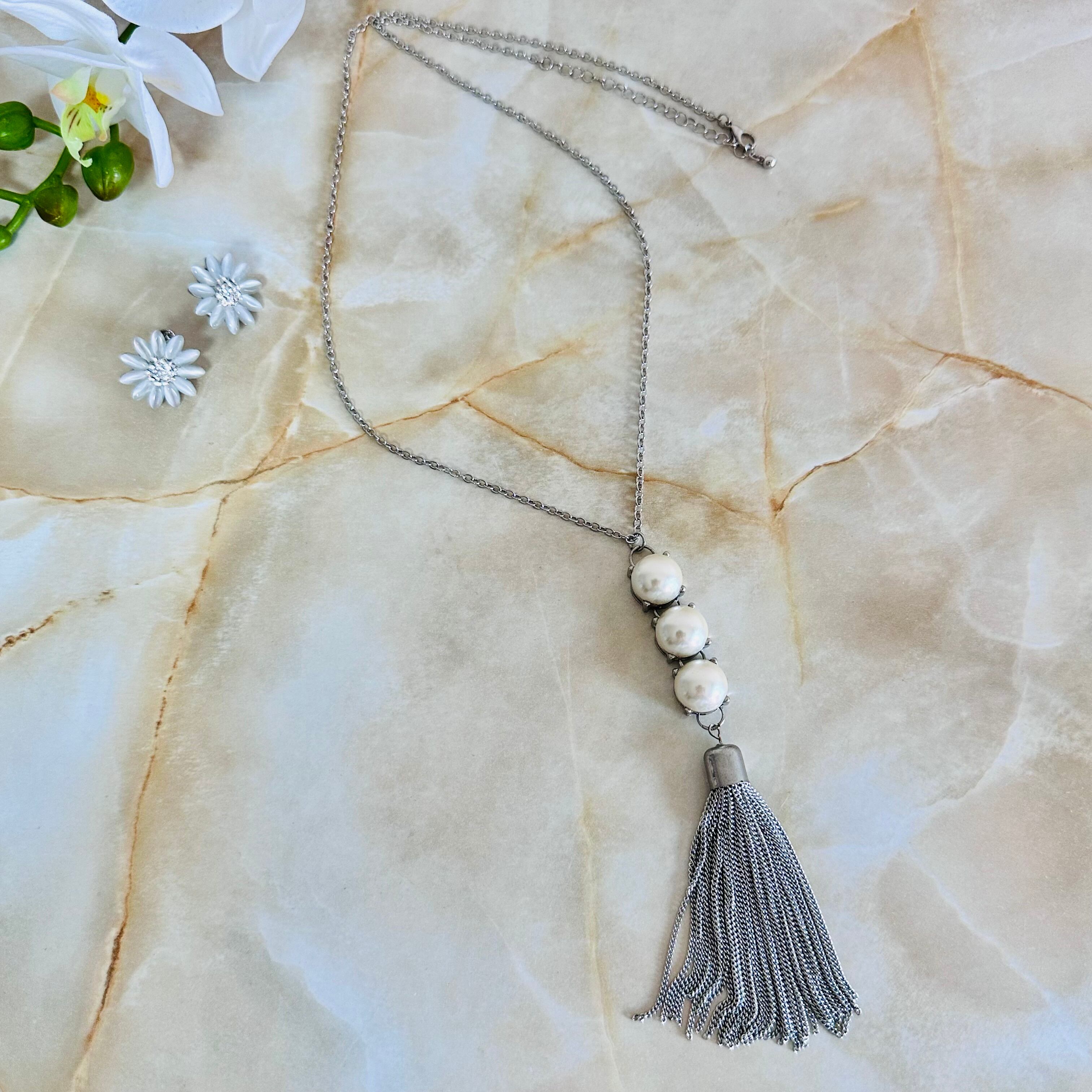 パールをアクセントにタッセルモチーフを組み合わせクールな印象のロングデザインにしました。