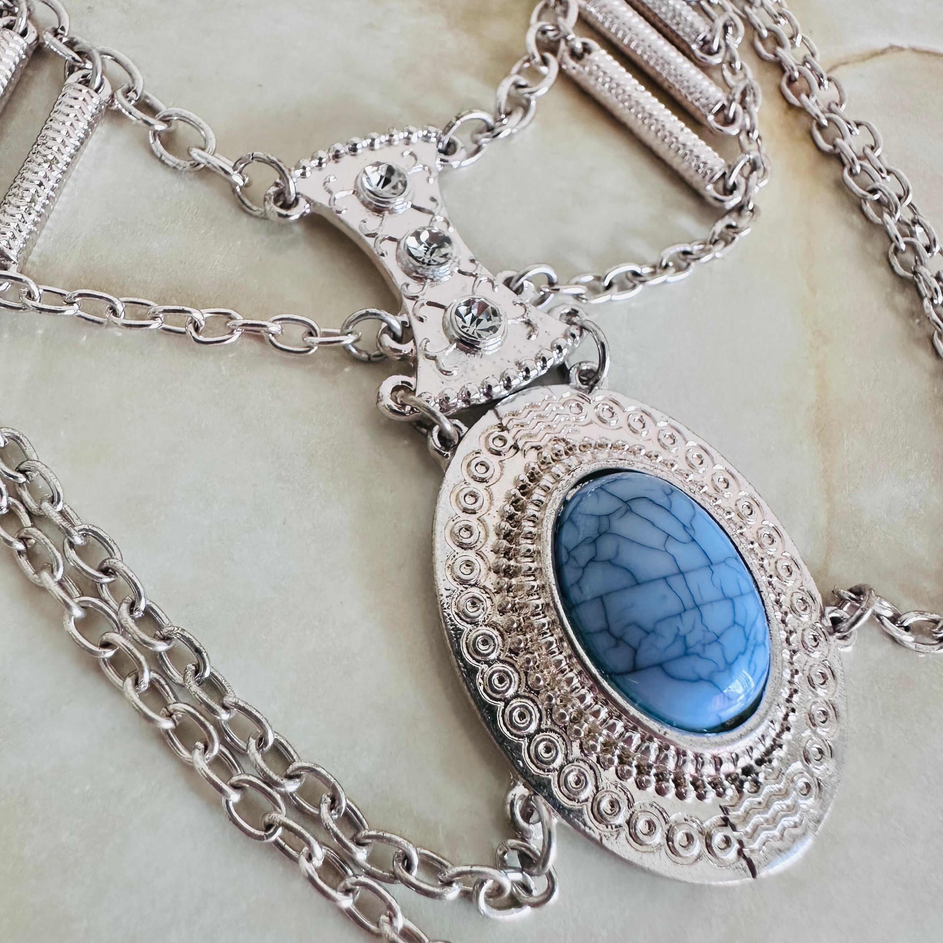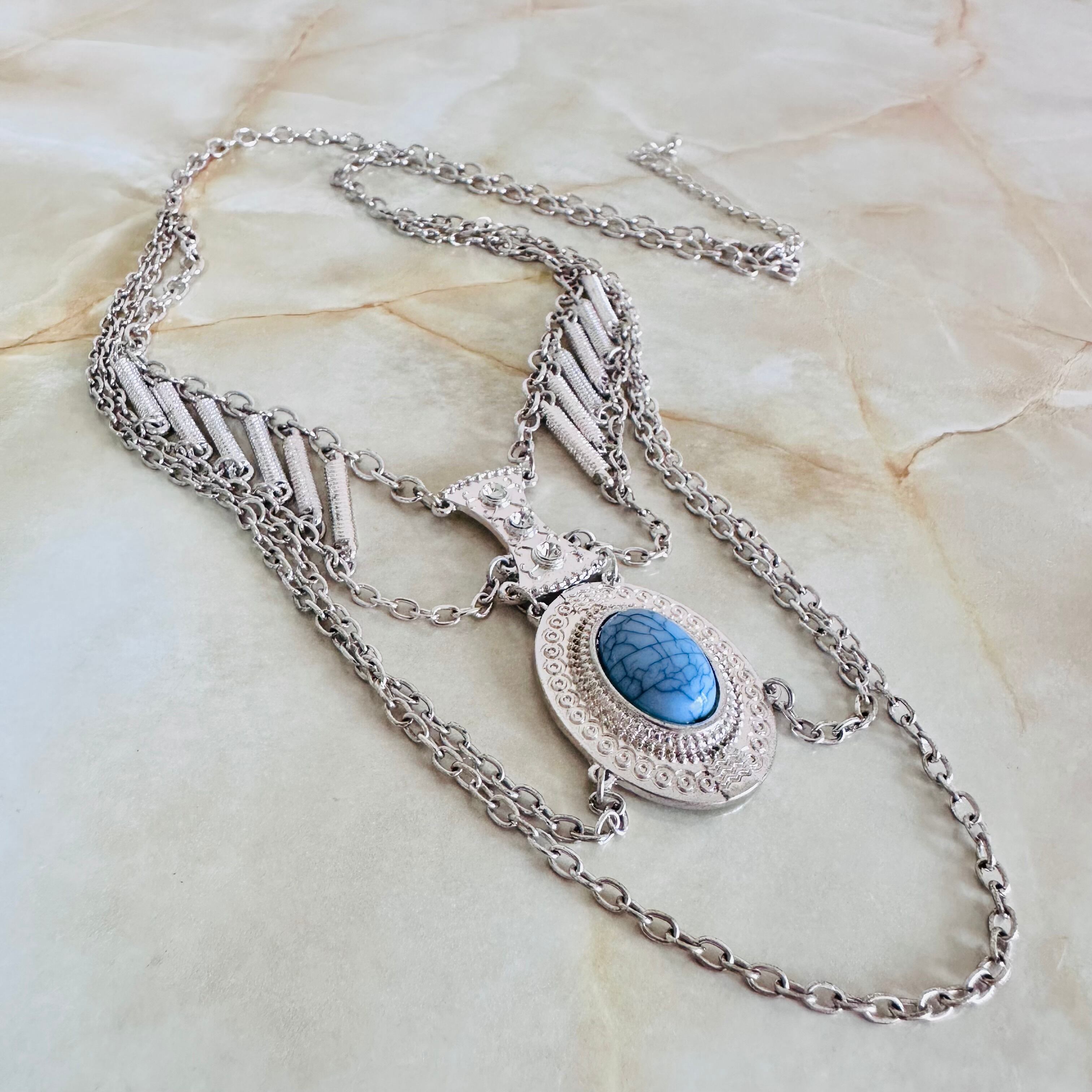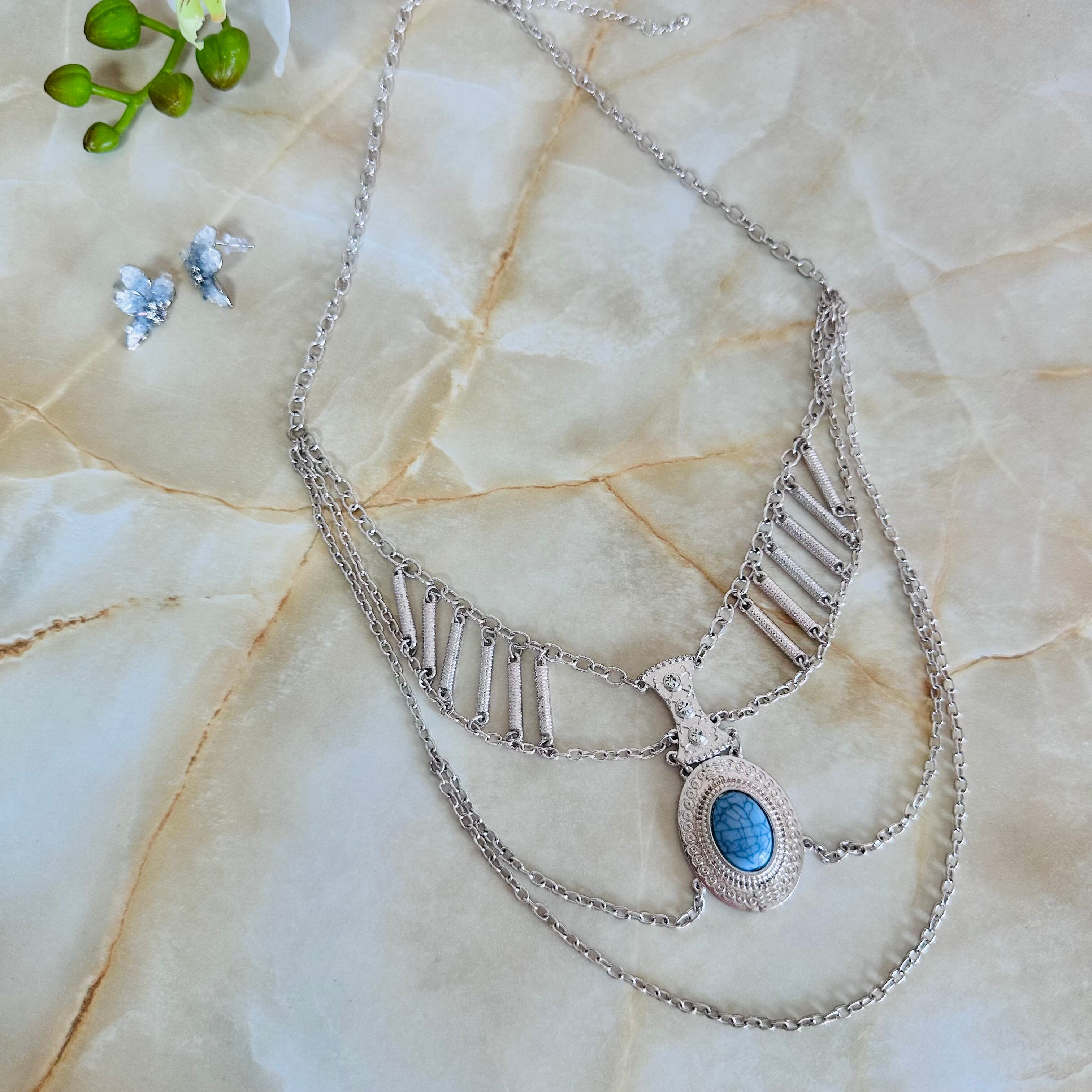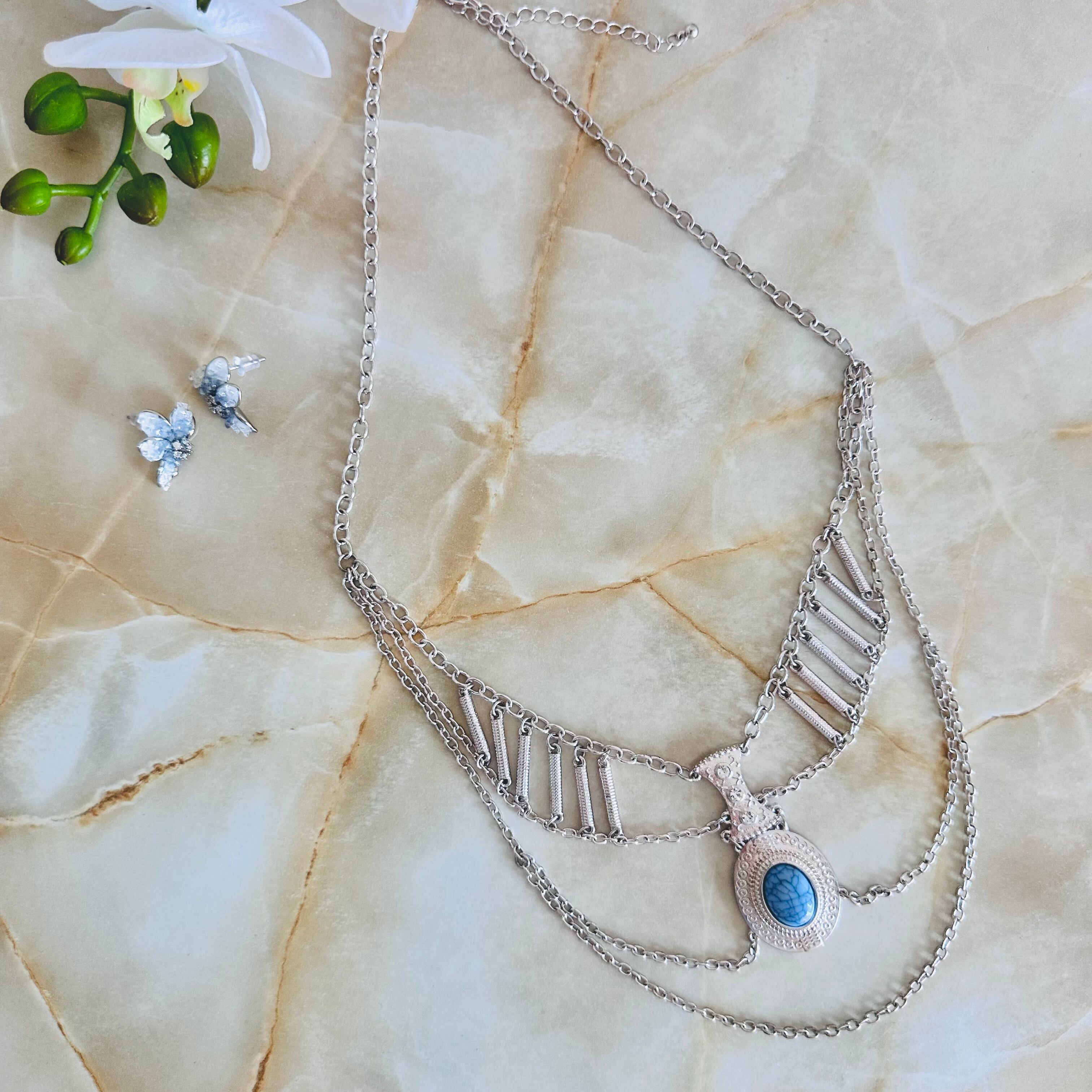 ターコイズ風のアクリルパーツをポイントにシルバーカラーのチェーンで仕上げたボヘミア調のネックレスです。