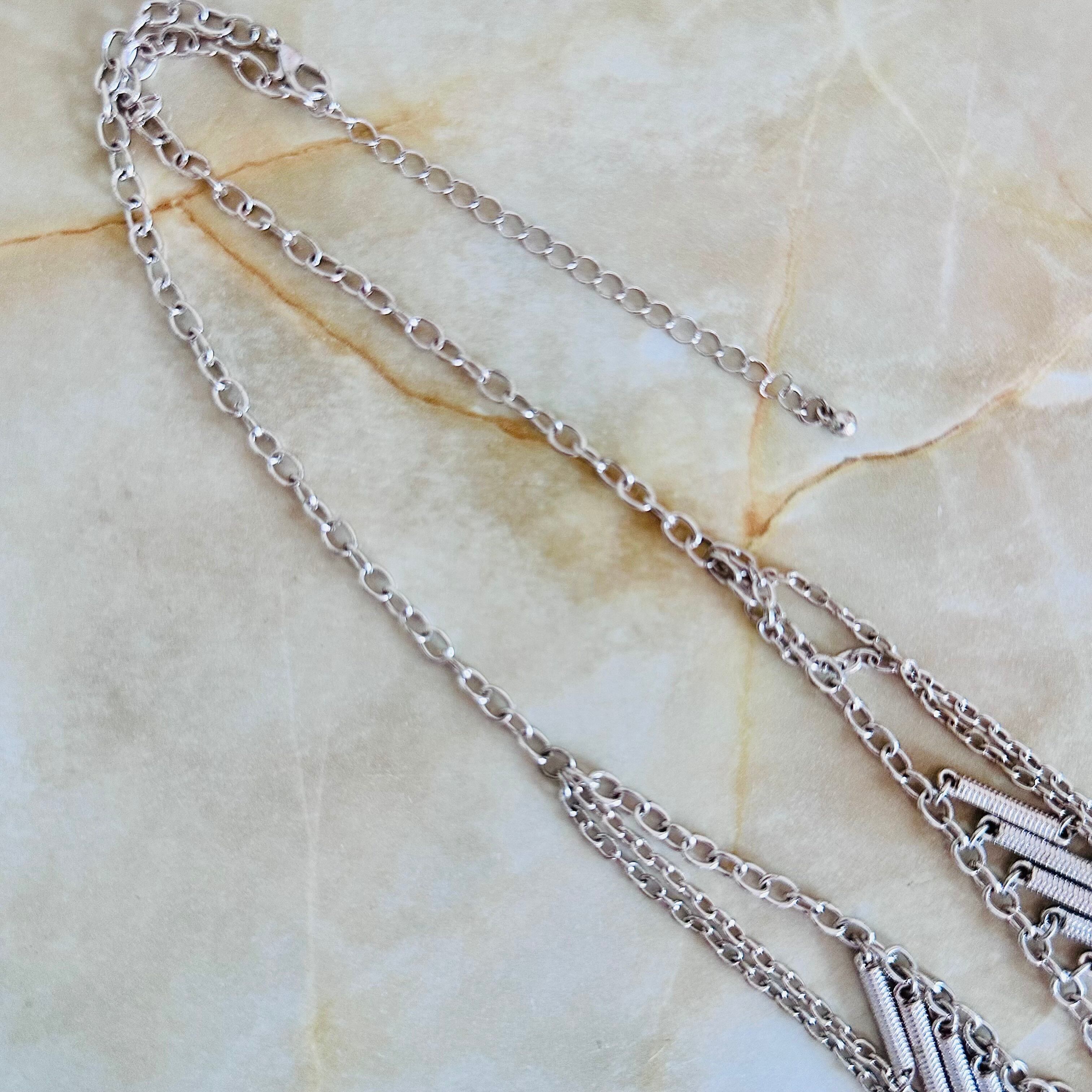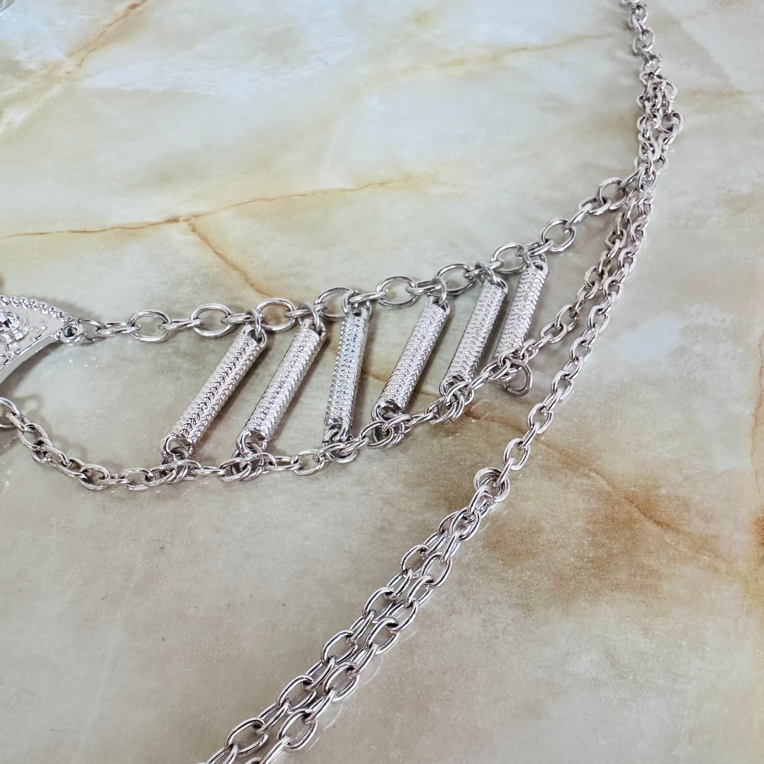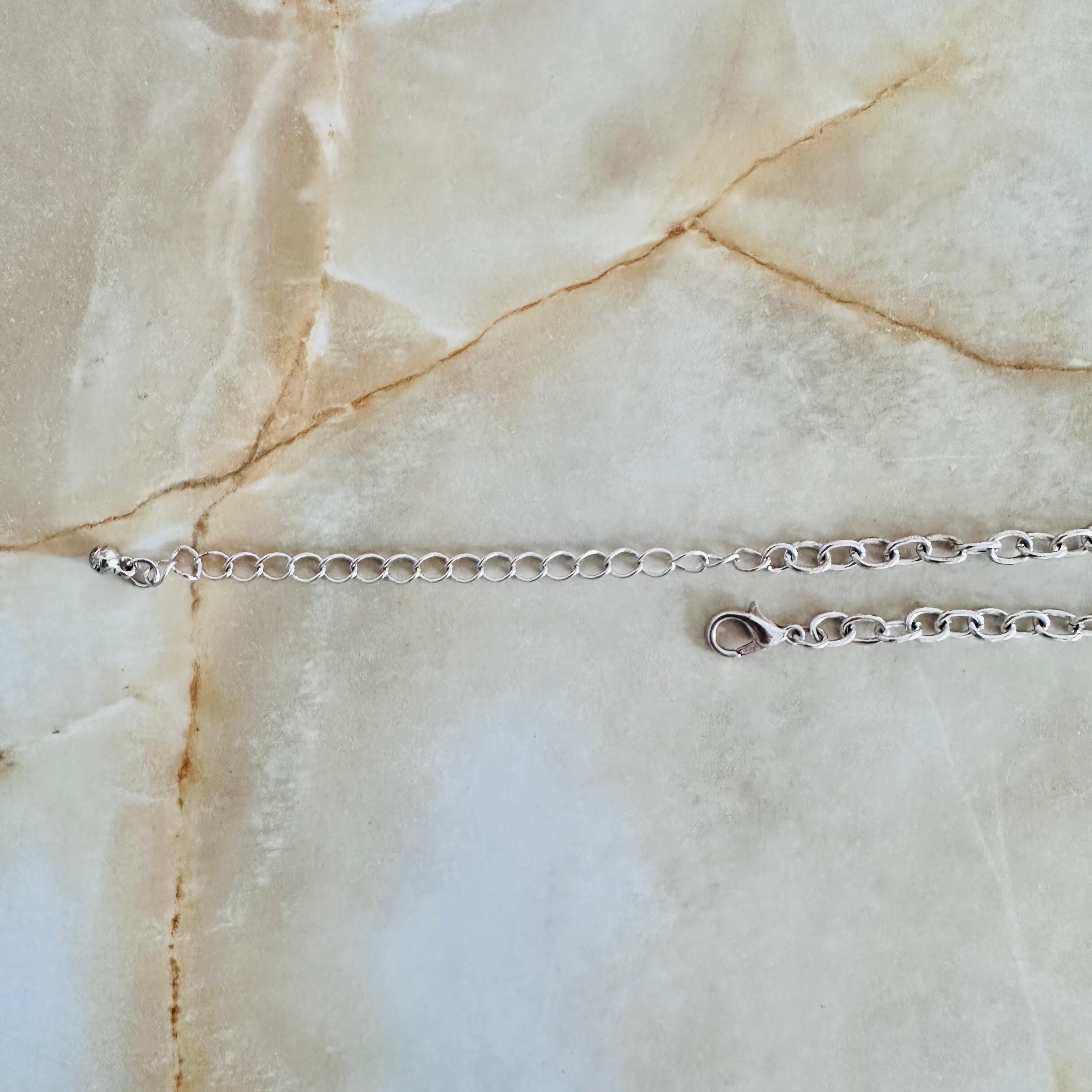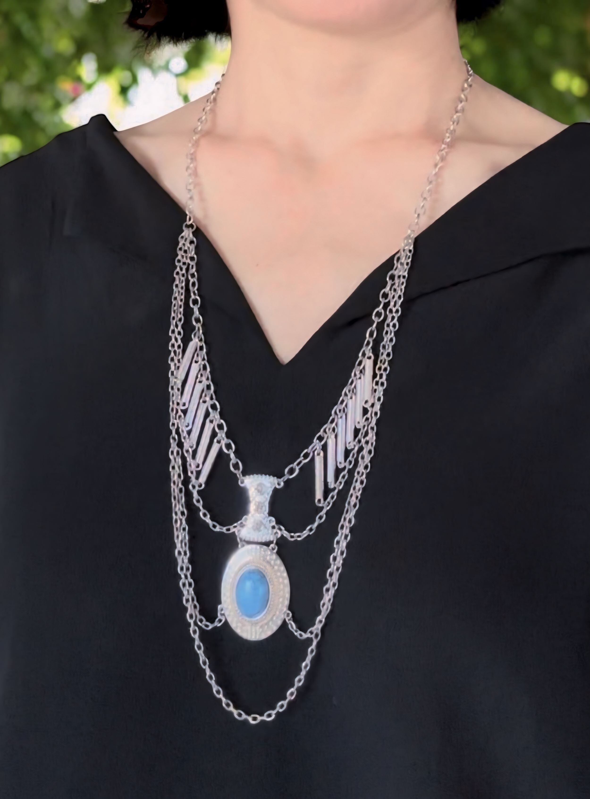 ターコイズ風のアクリルパーツをポイントにシルバーカラーのチェーンで仕上げたボヘミア調のネックレスです。