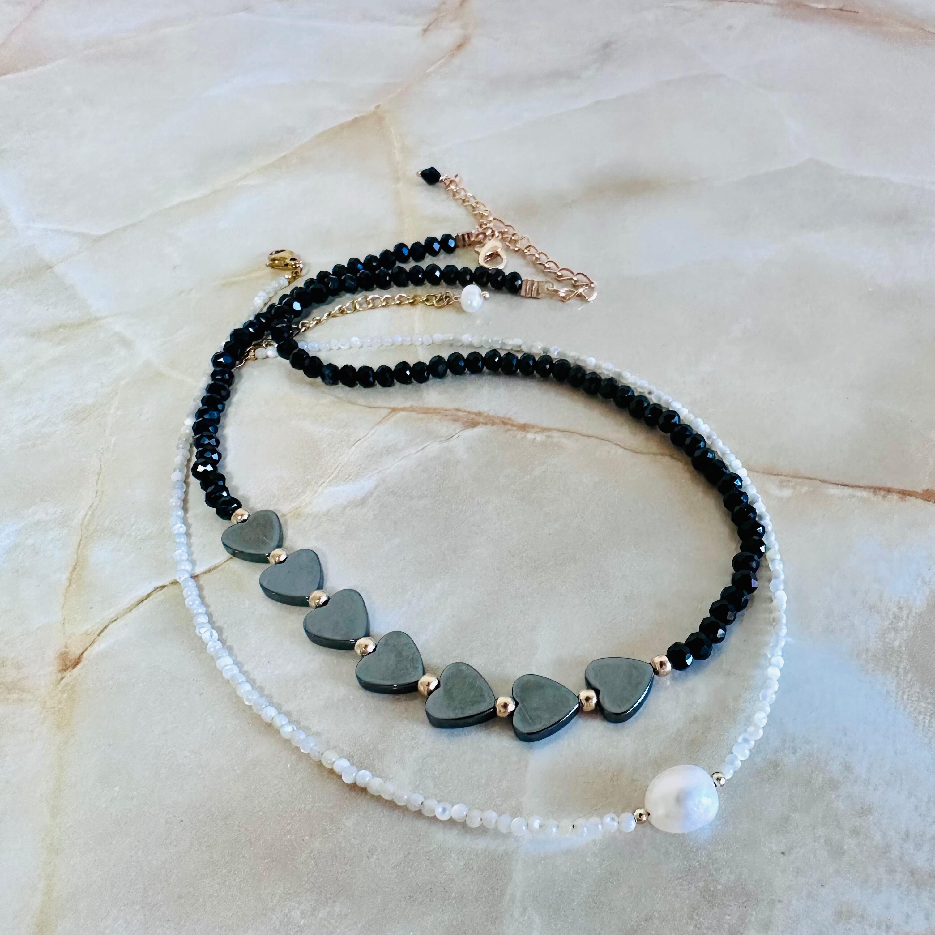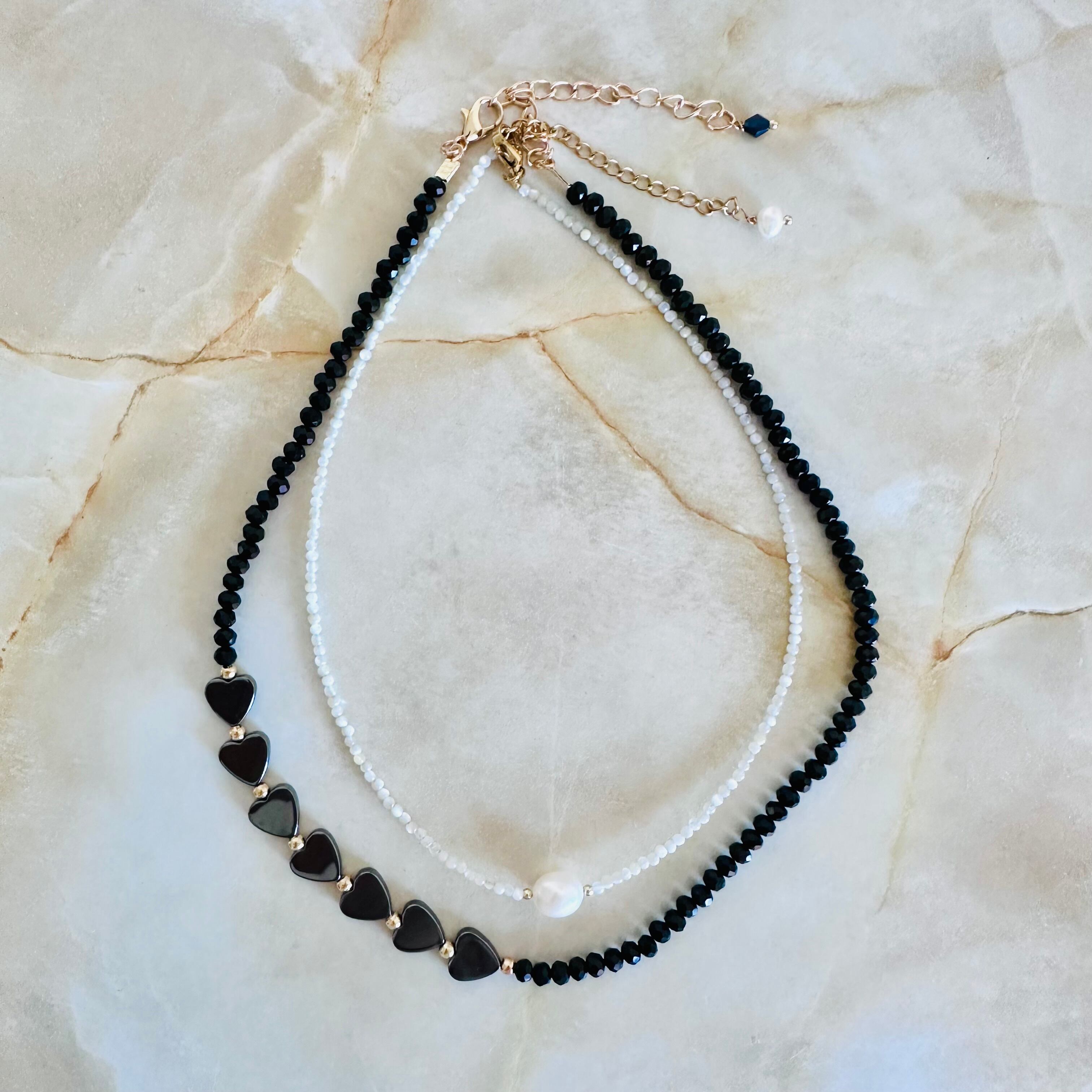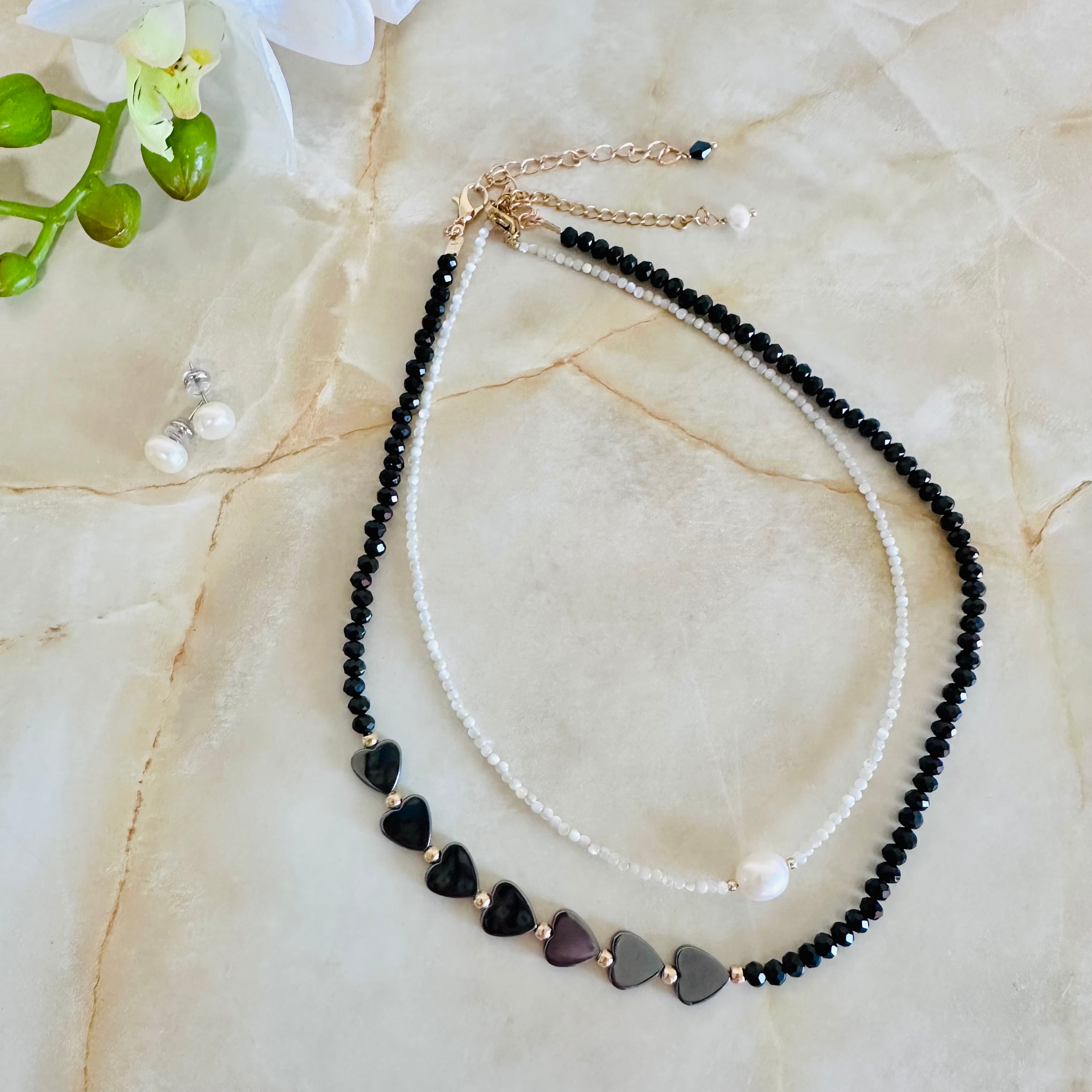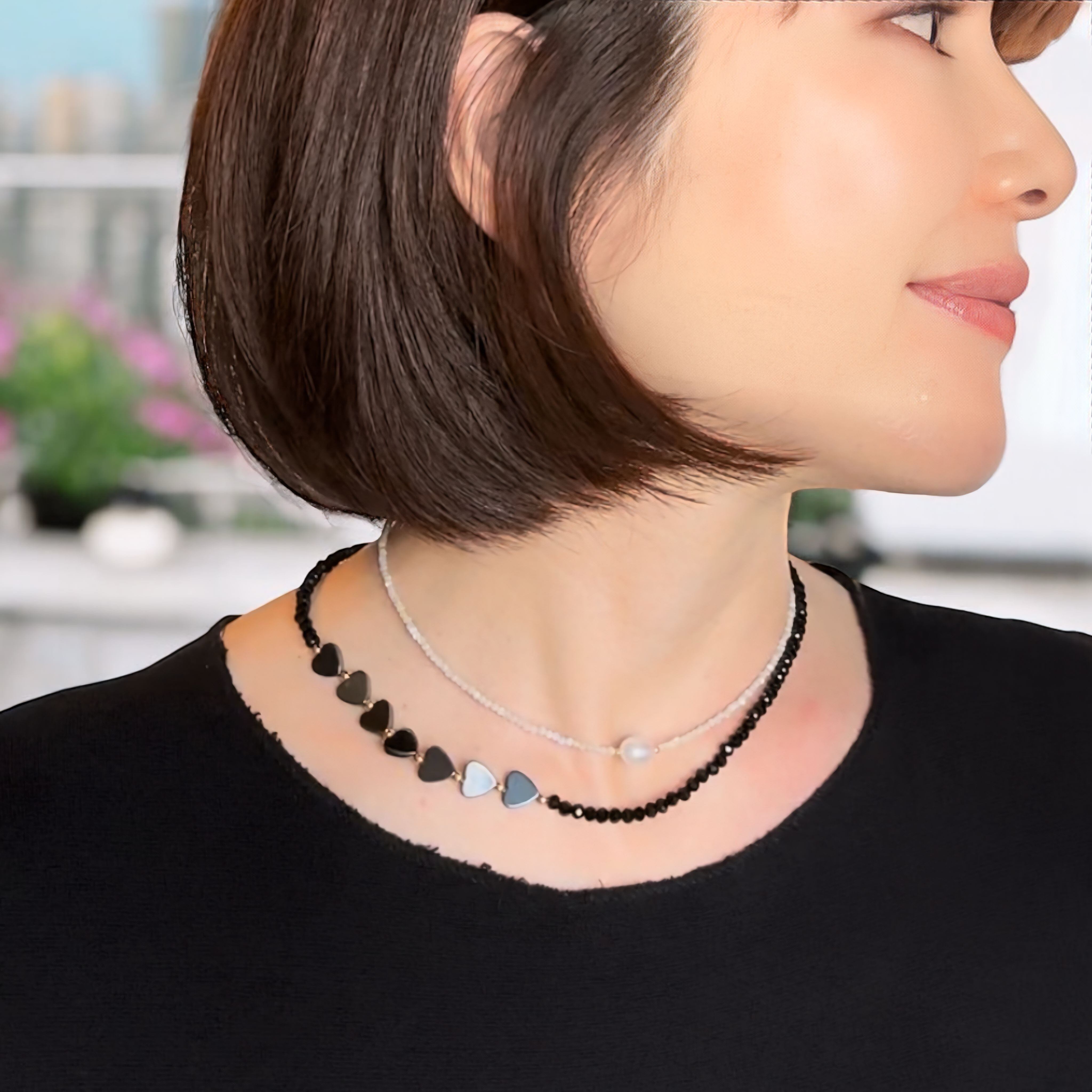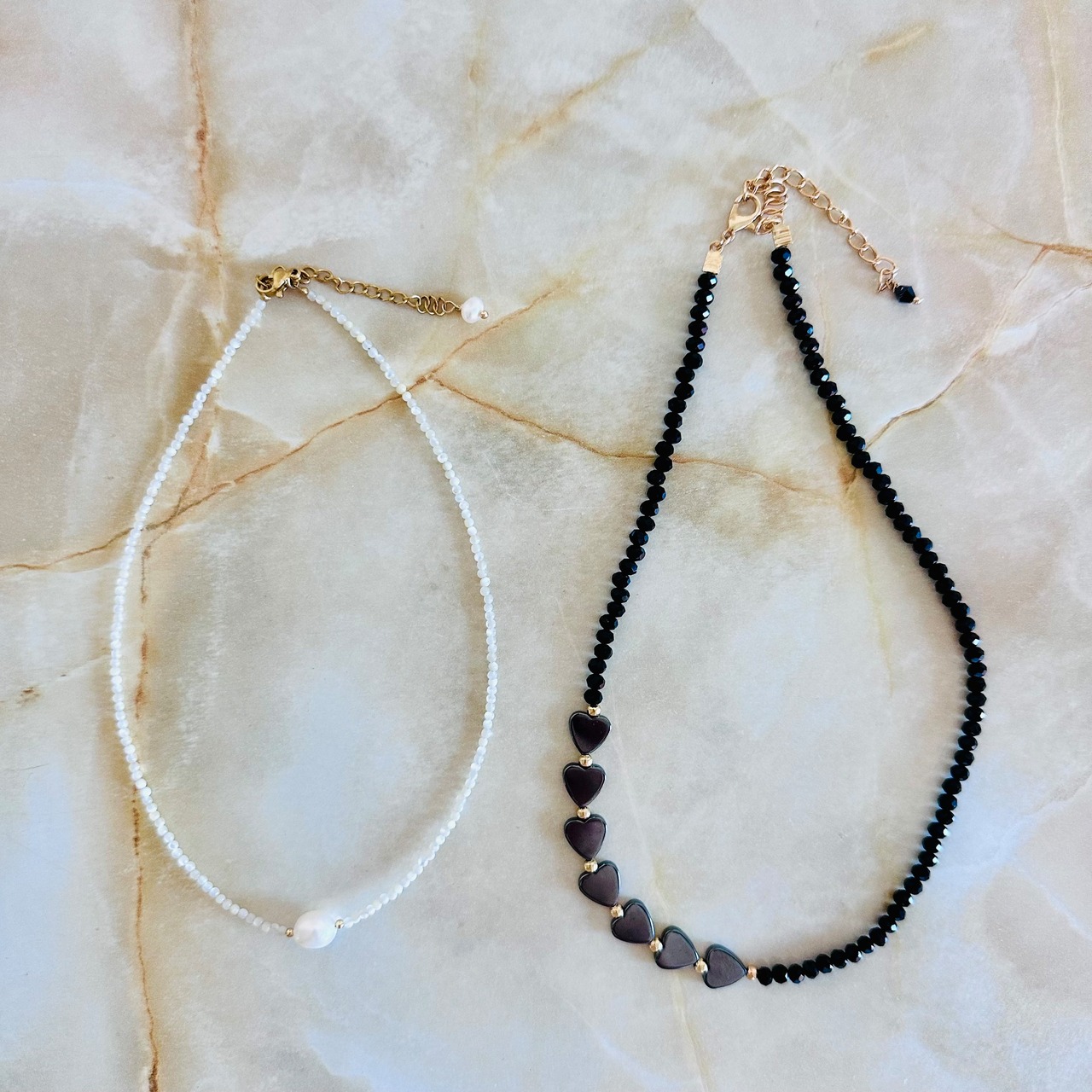 メタリック調に輝くフラットなハートパーツと、クリスタルビーズをおしゃれなブラックてー統一したネックレスと小粒のシェルビーズと天然淡水パールをアイボリーでまとめたネックレス。