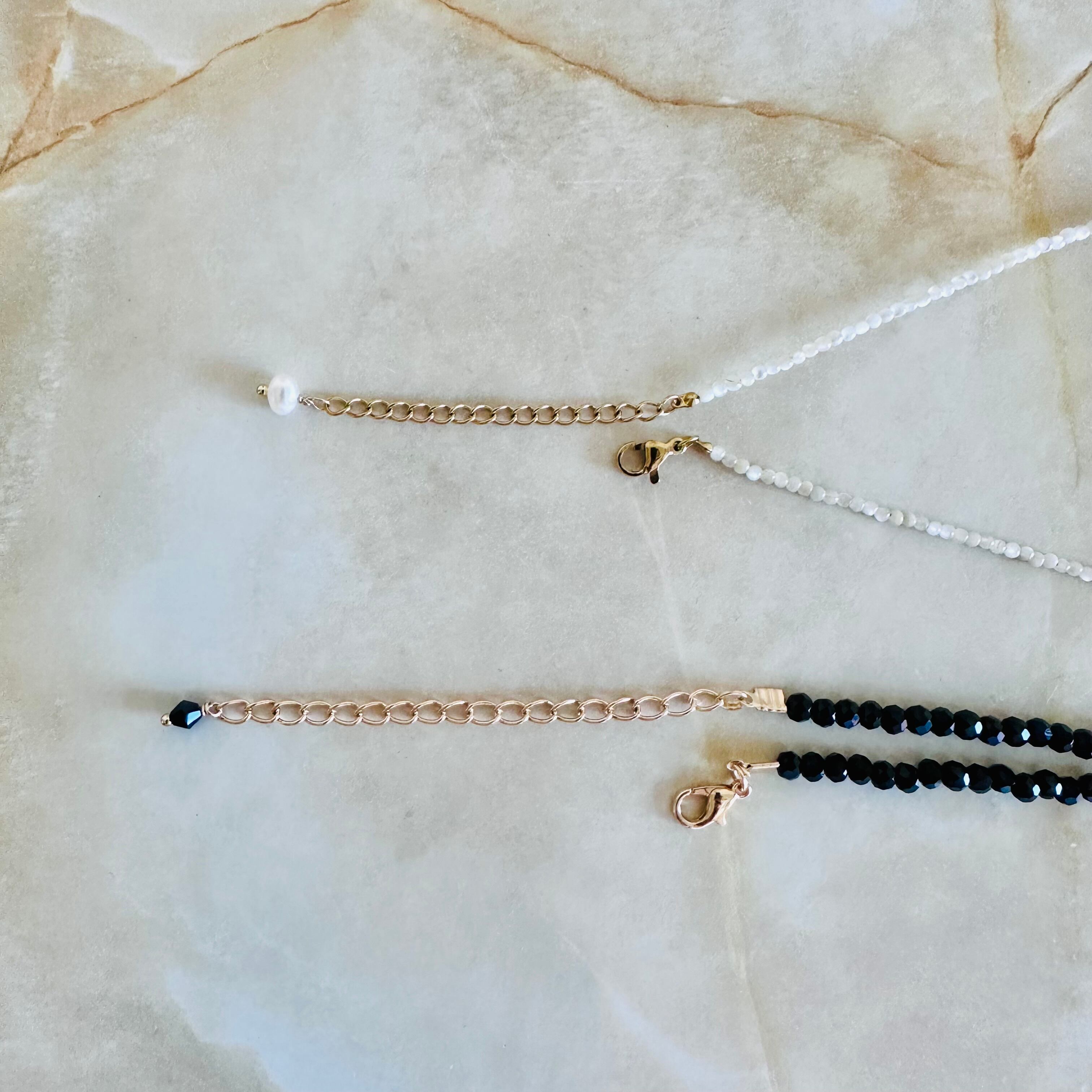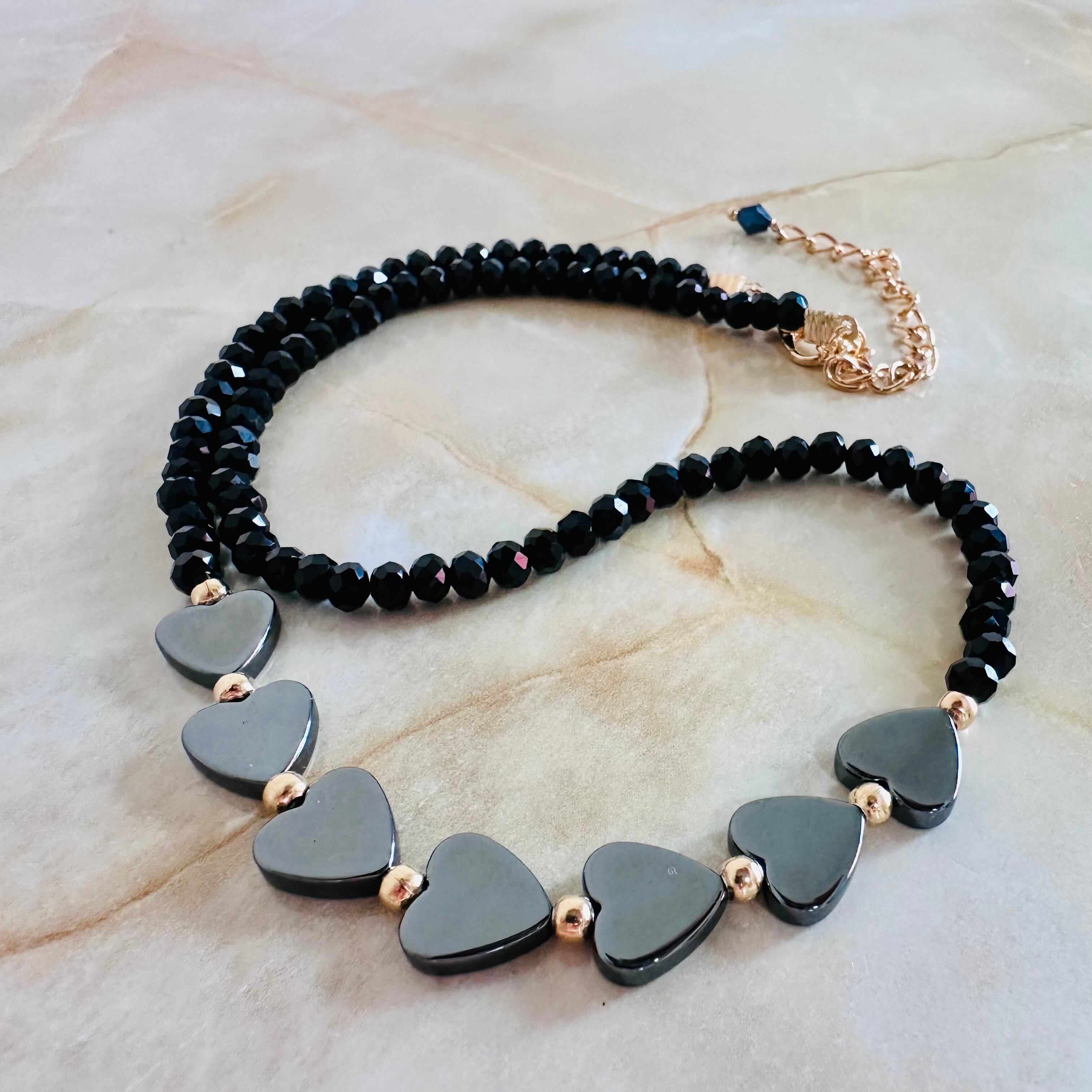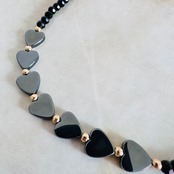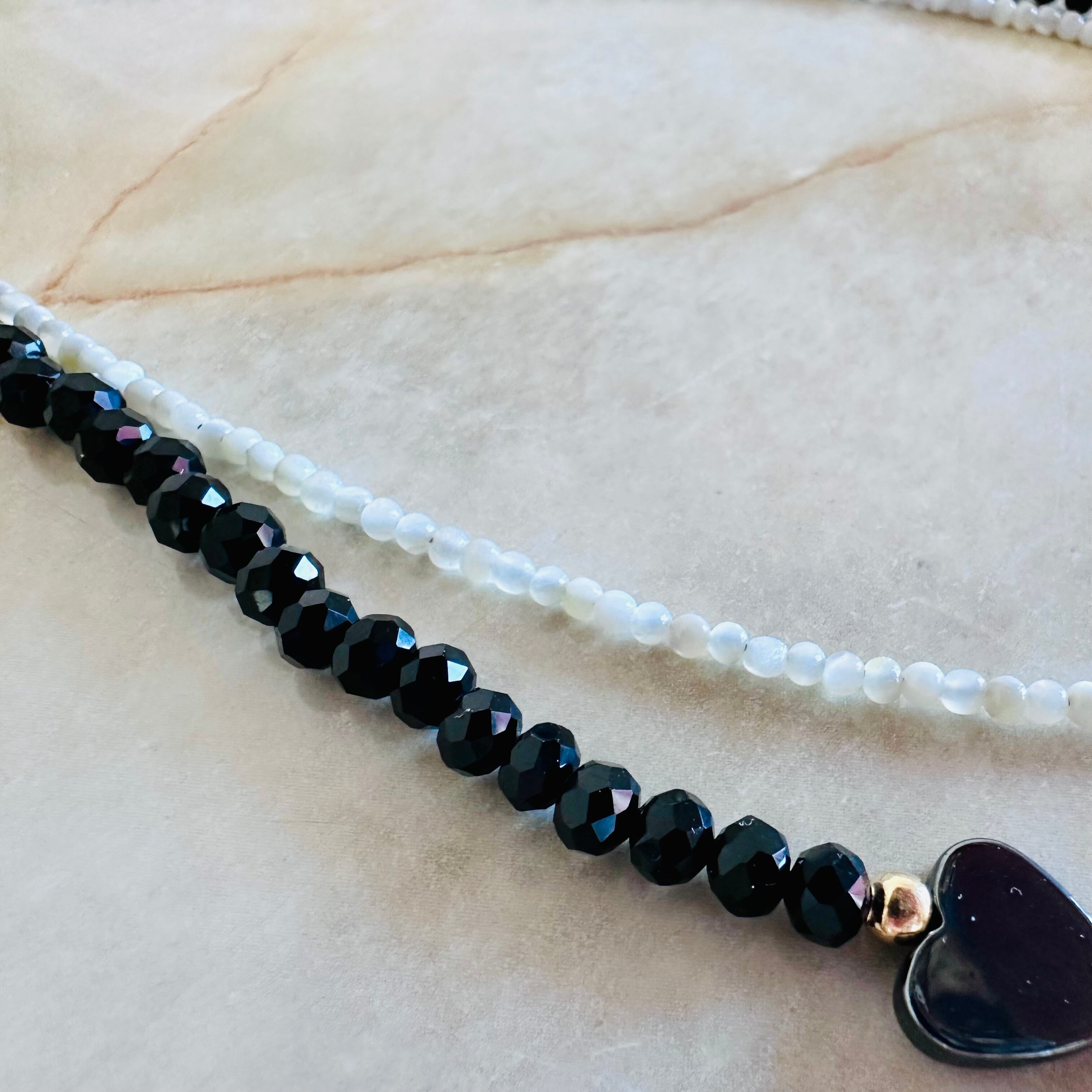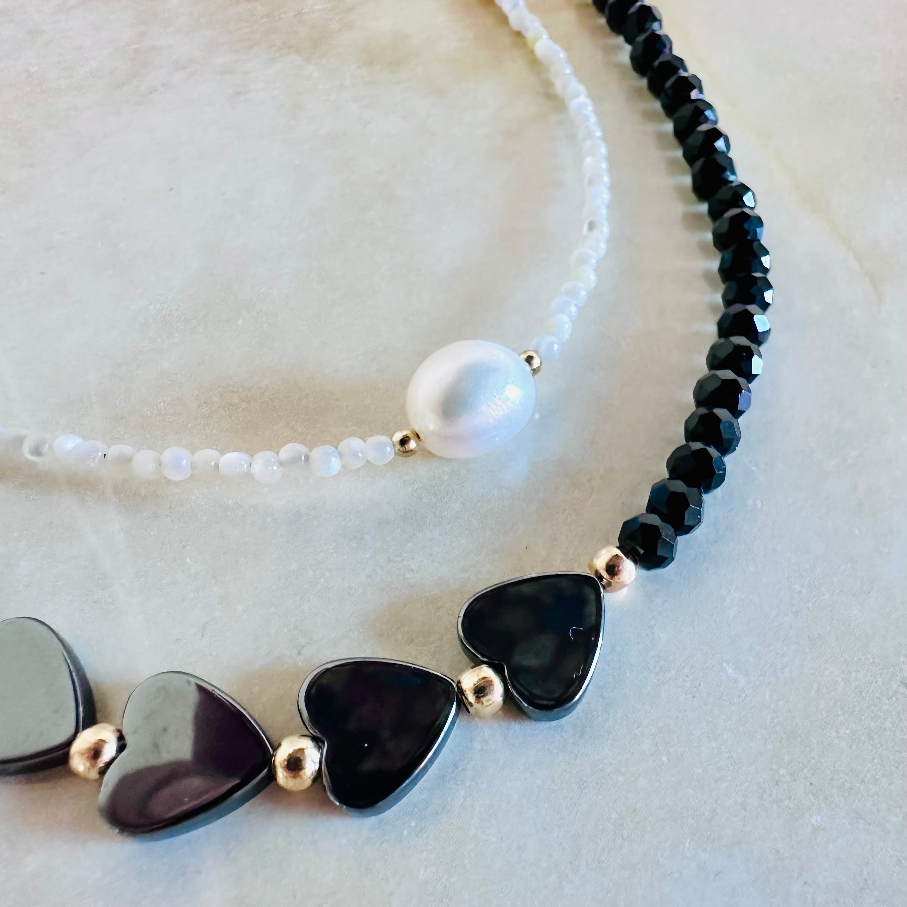 メタリック調に輝くフラットなハートパーツと、クリスタルビーズをおしゃれなブラックてー統一したネックレスと小粒のシェルビーズと天然淡水パールをアイボリーでまとめたネックレス。