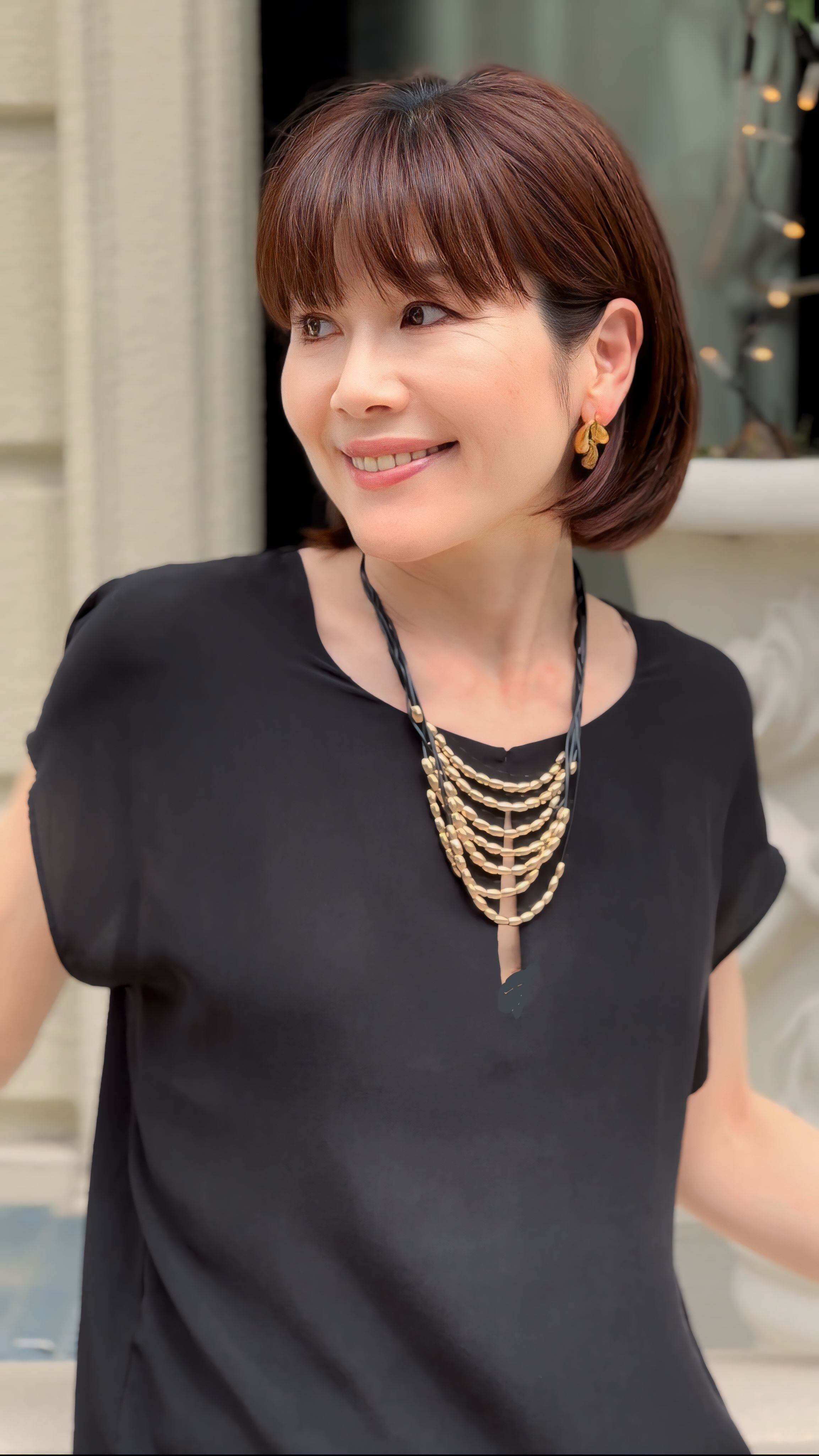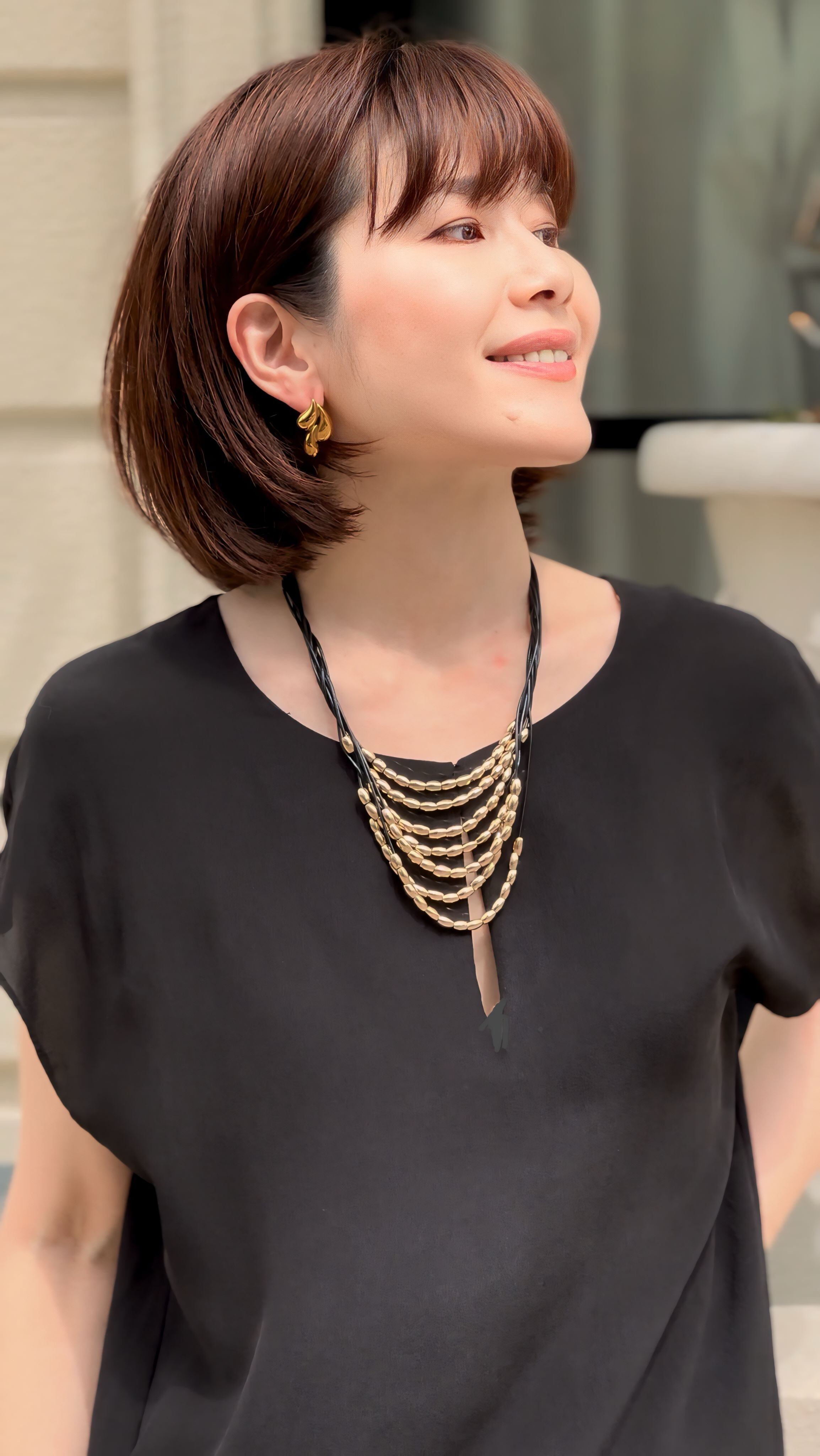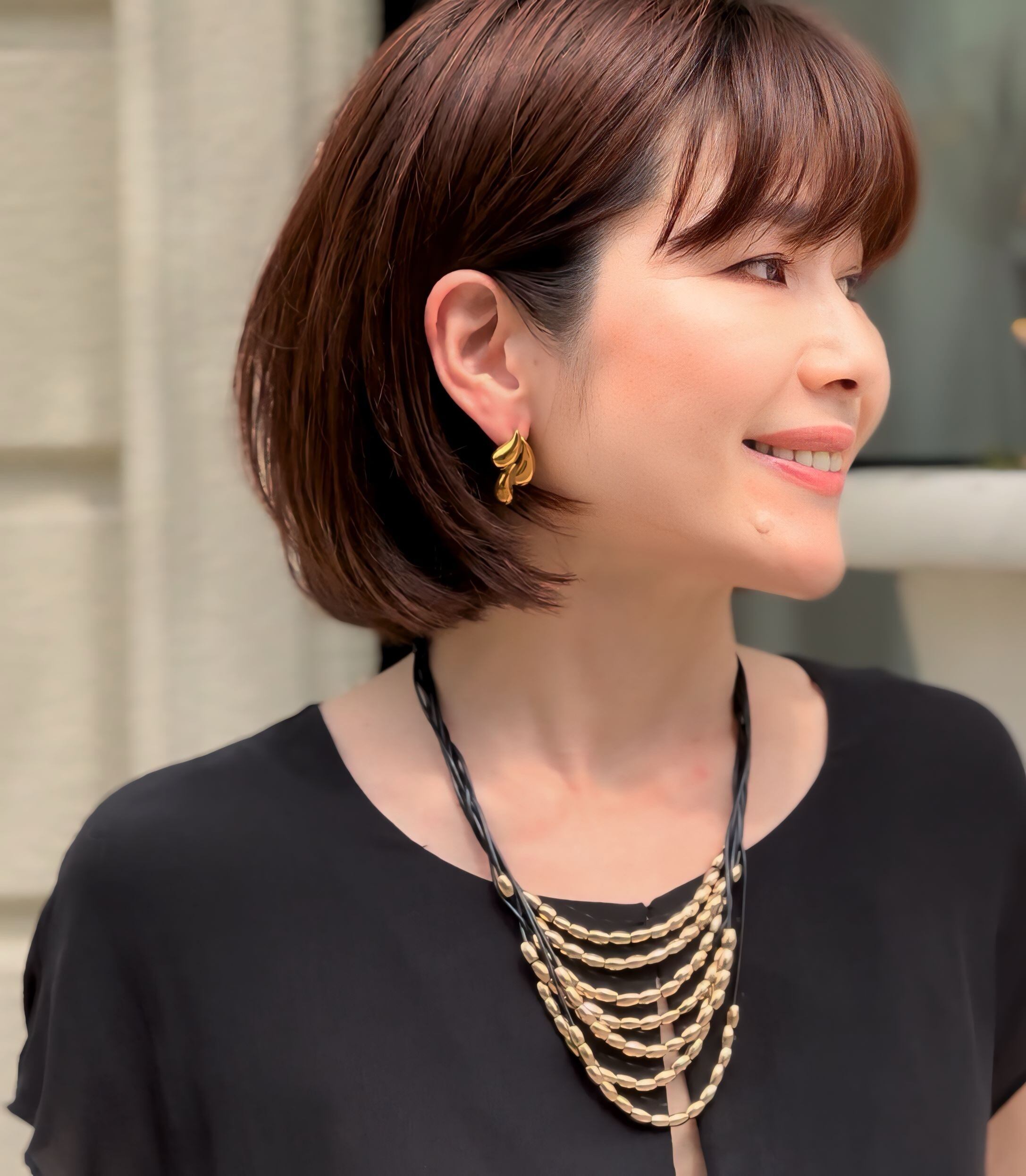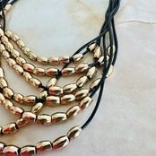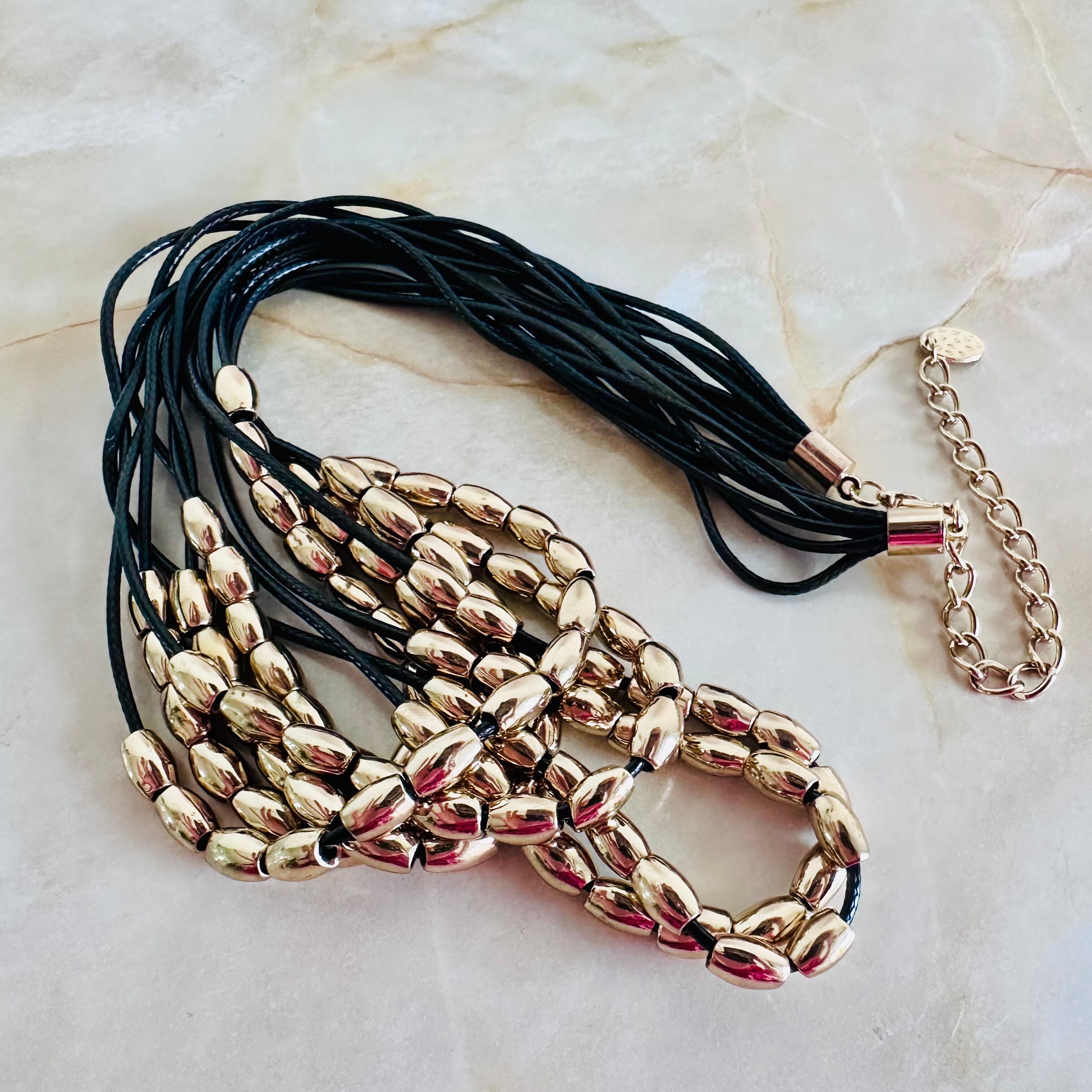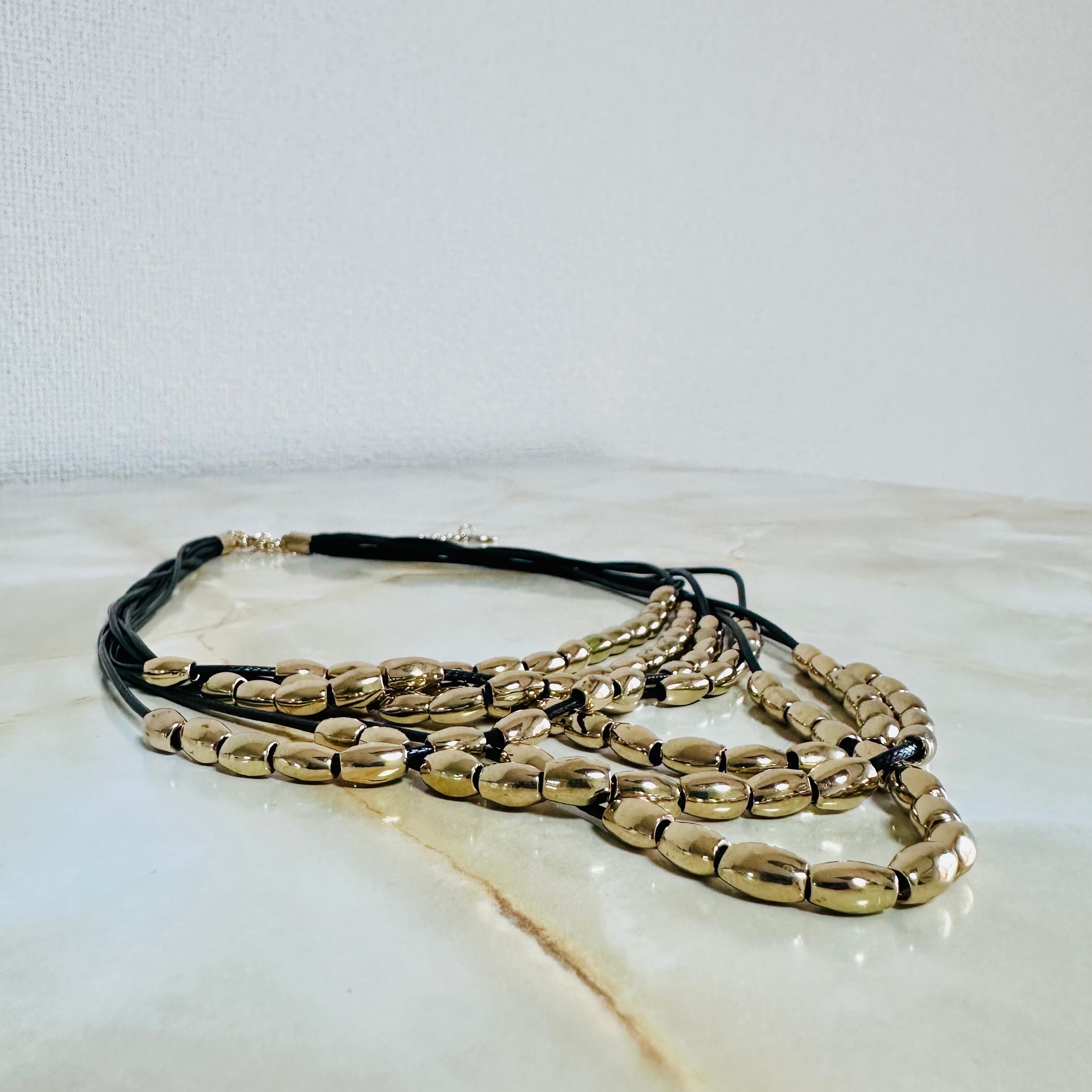 7連のブラックのコードにゴールドのパーツを通して捻り束ねたデザインです。
