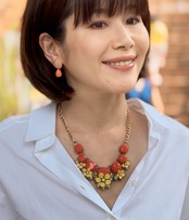 オレンジカラーのアクリルパーツとイエローのフラワーモチーフを合わせたポップなデザインです。