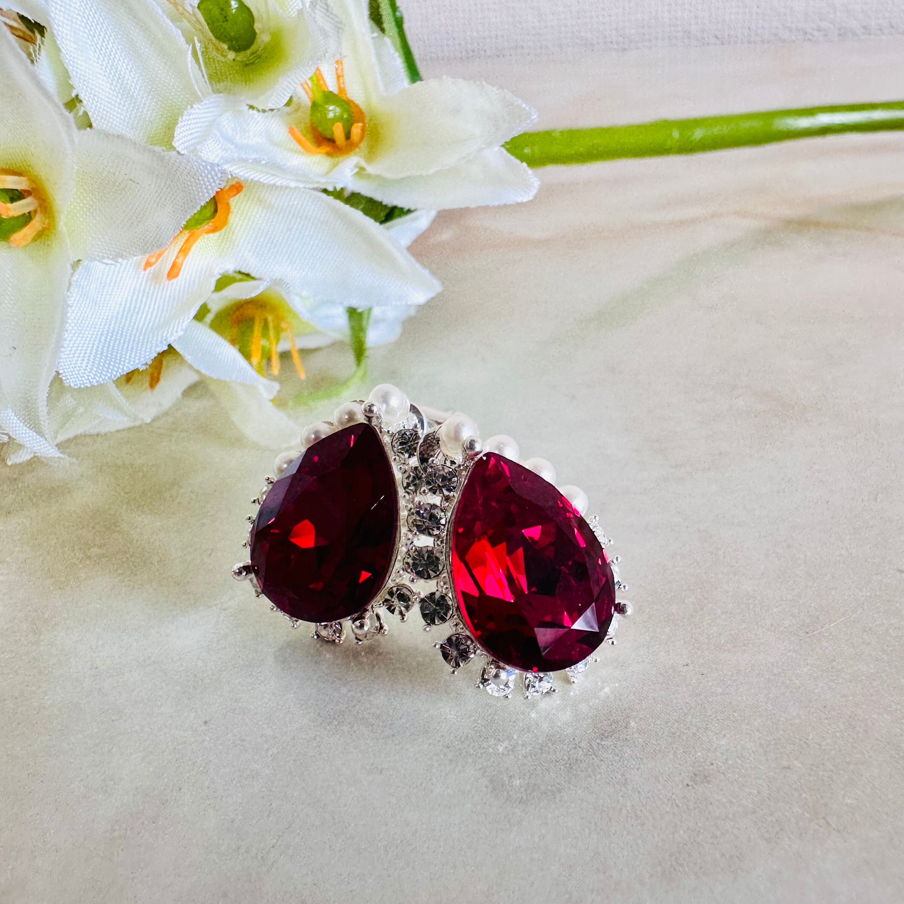 レッドカラーのスワロフスキー社のクリスタルにパールとラインストーンを施したデザインです。