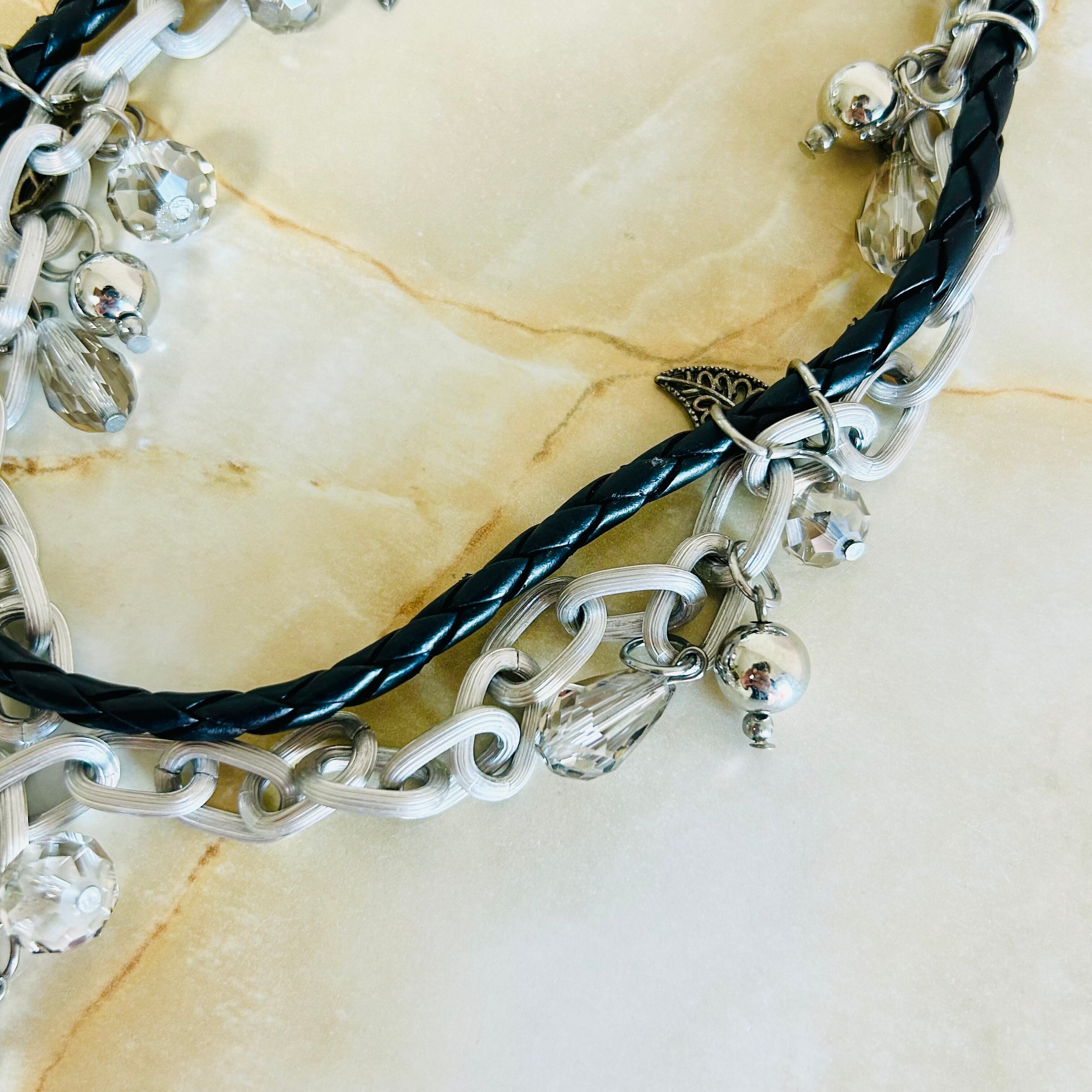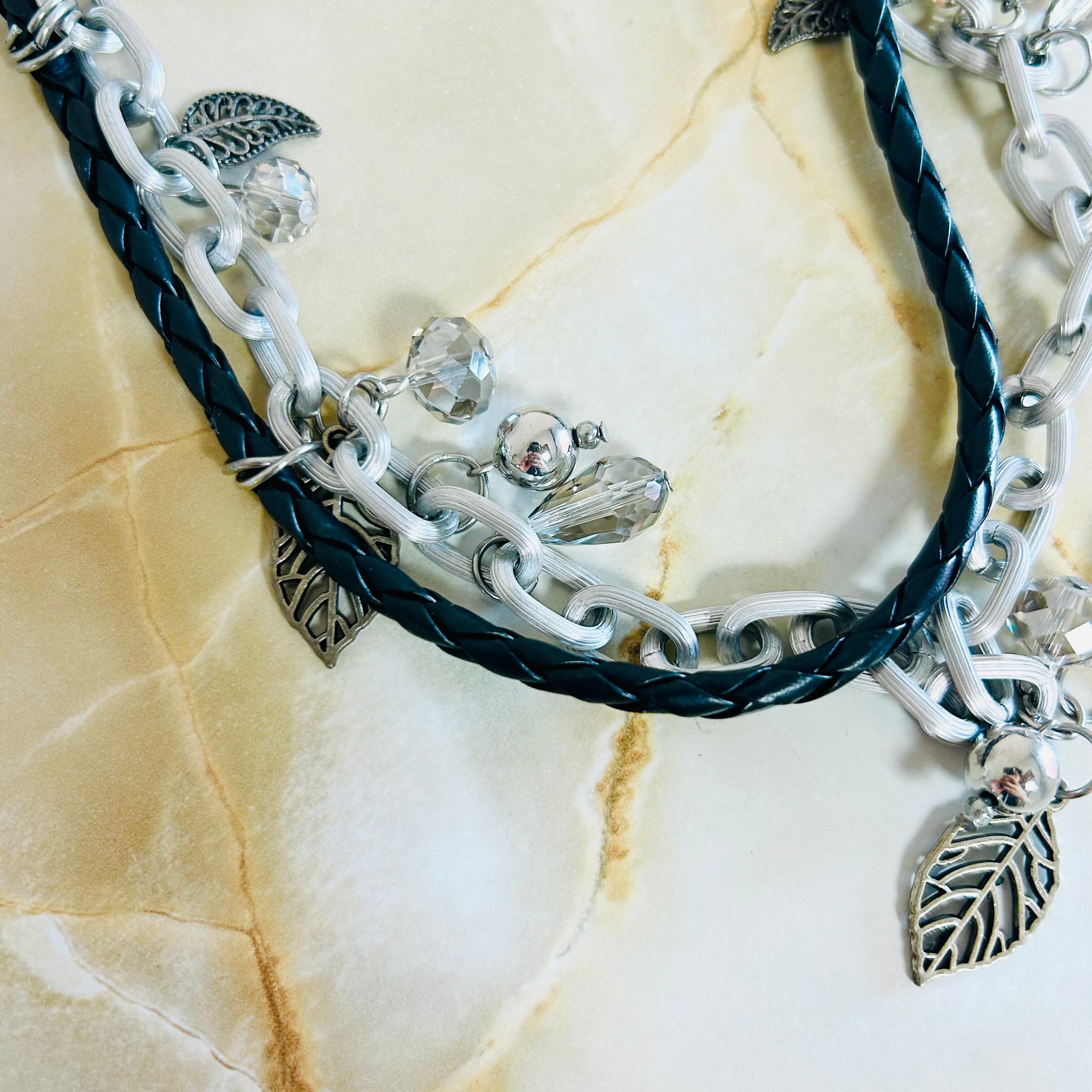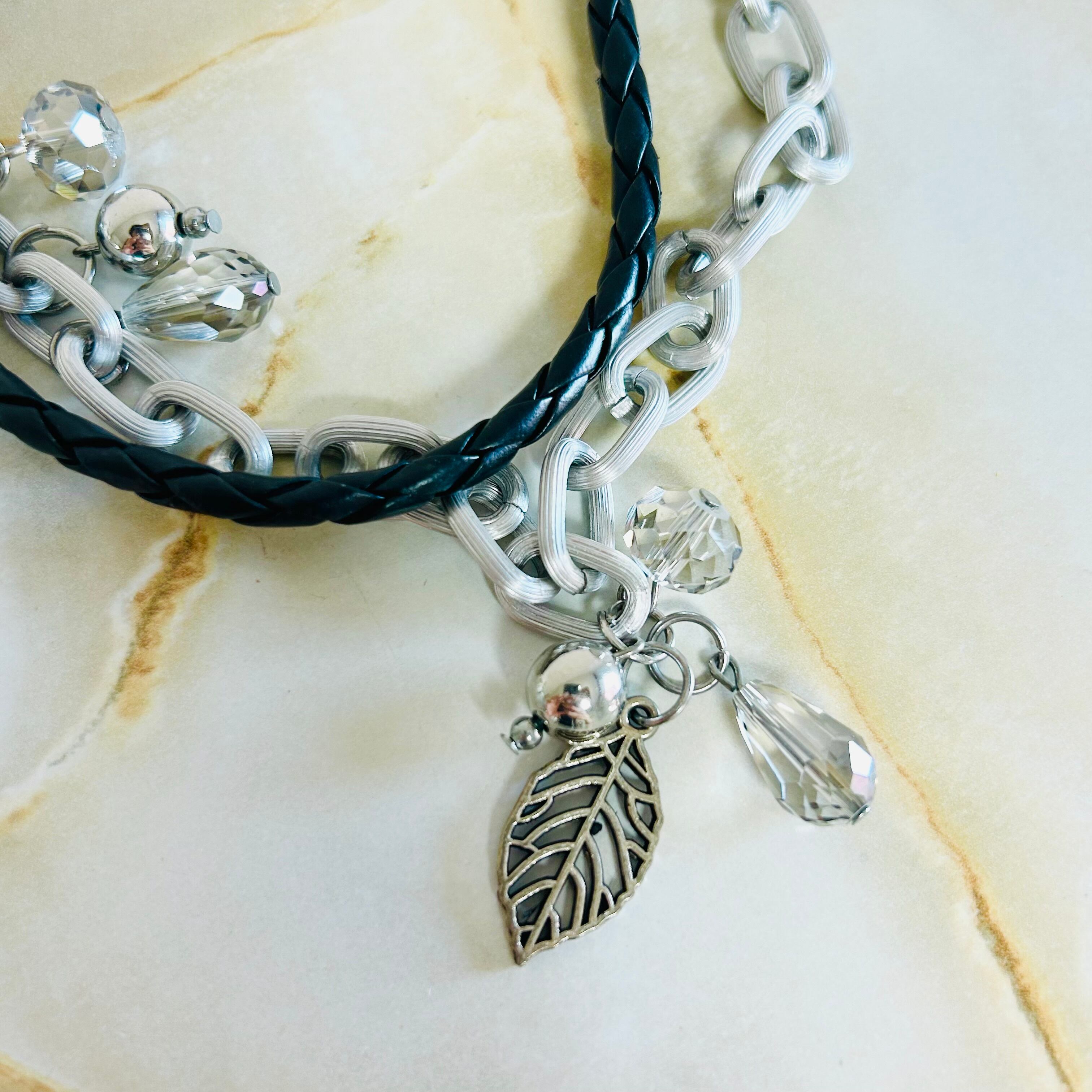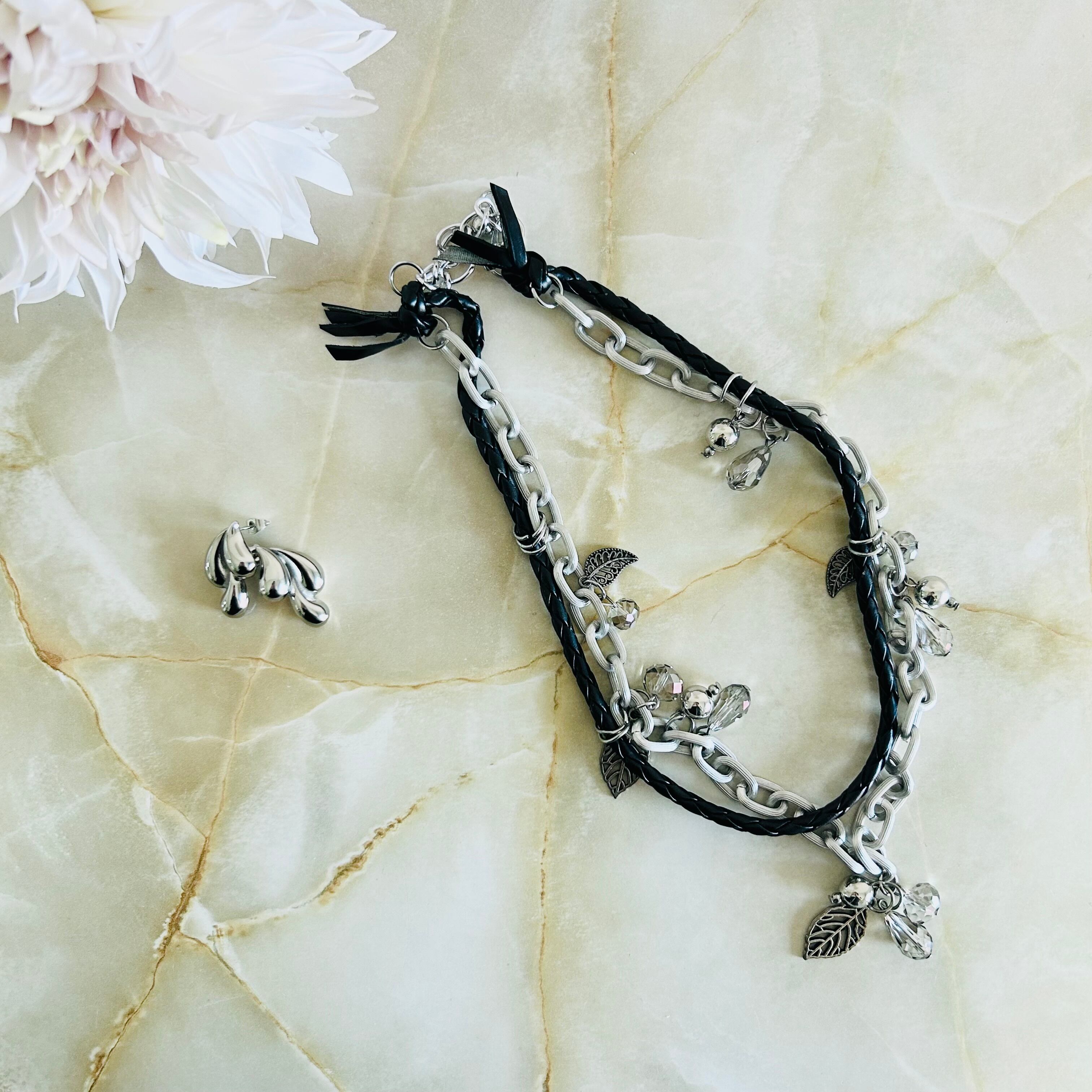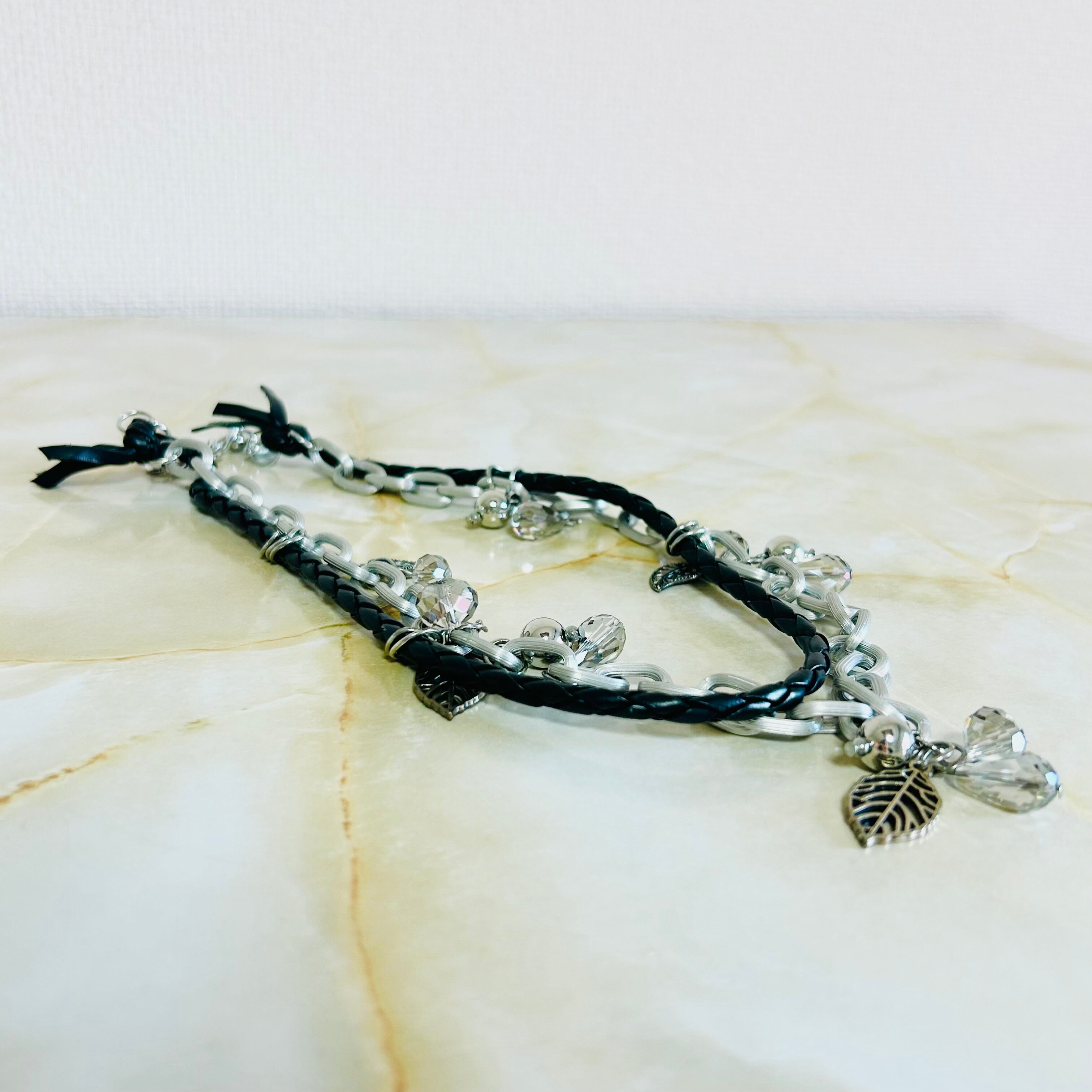 レザーの編み込みのコードとチャンキーチェーンを組み合わせたデザインです♡