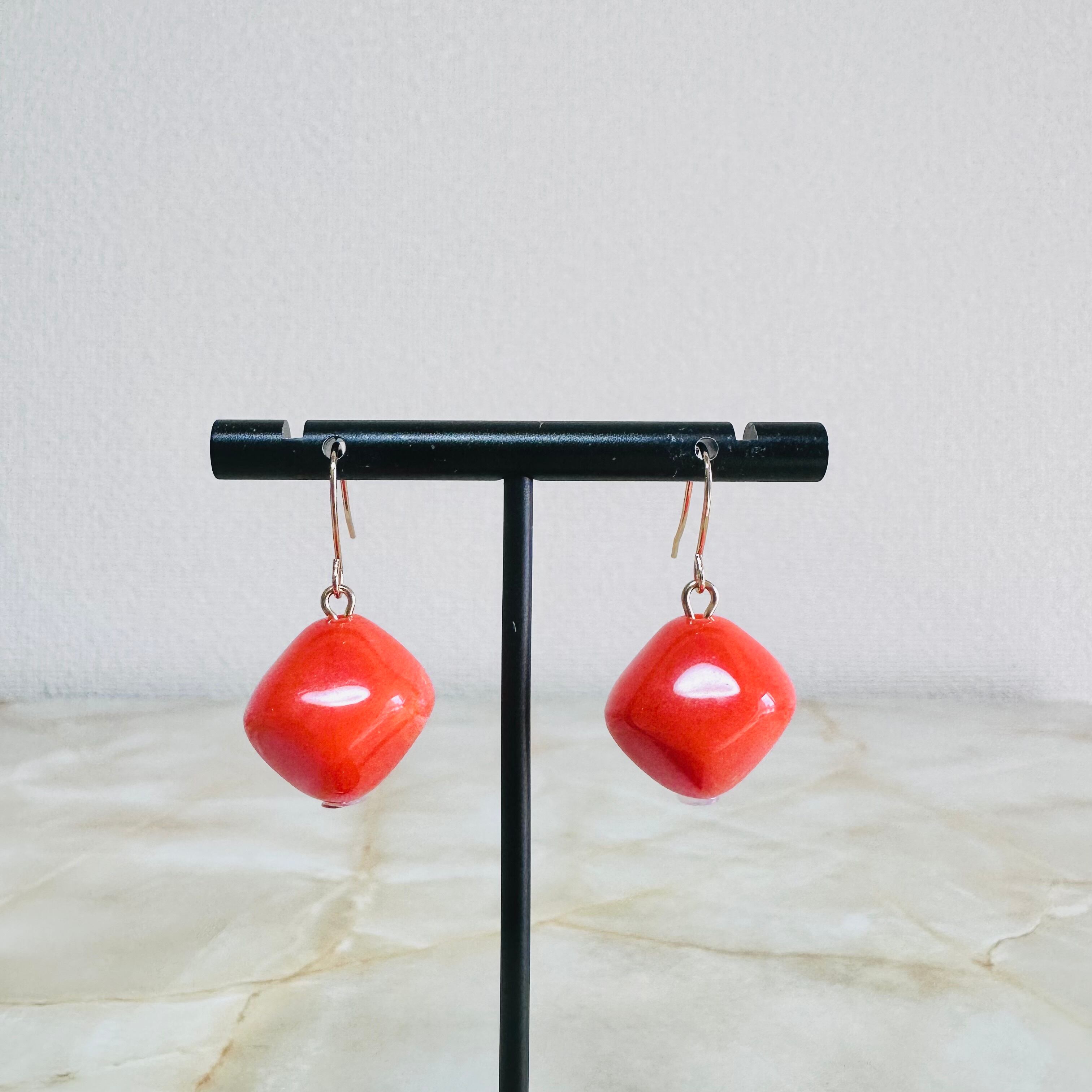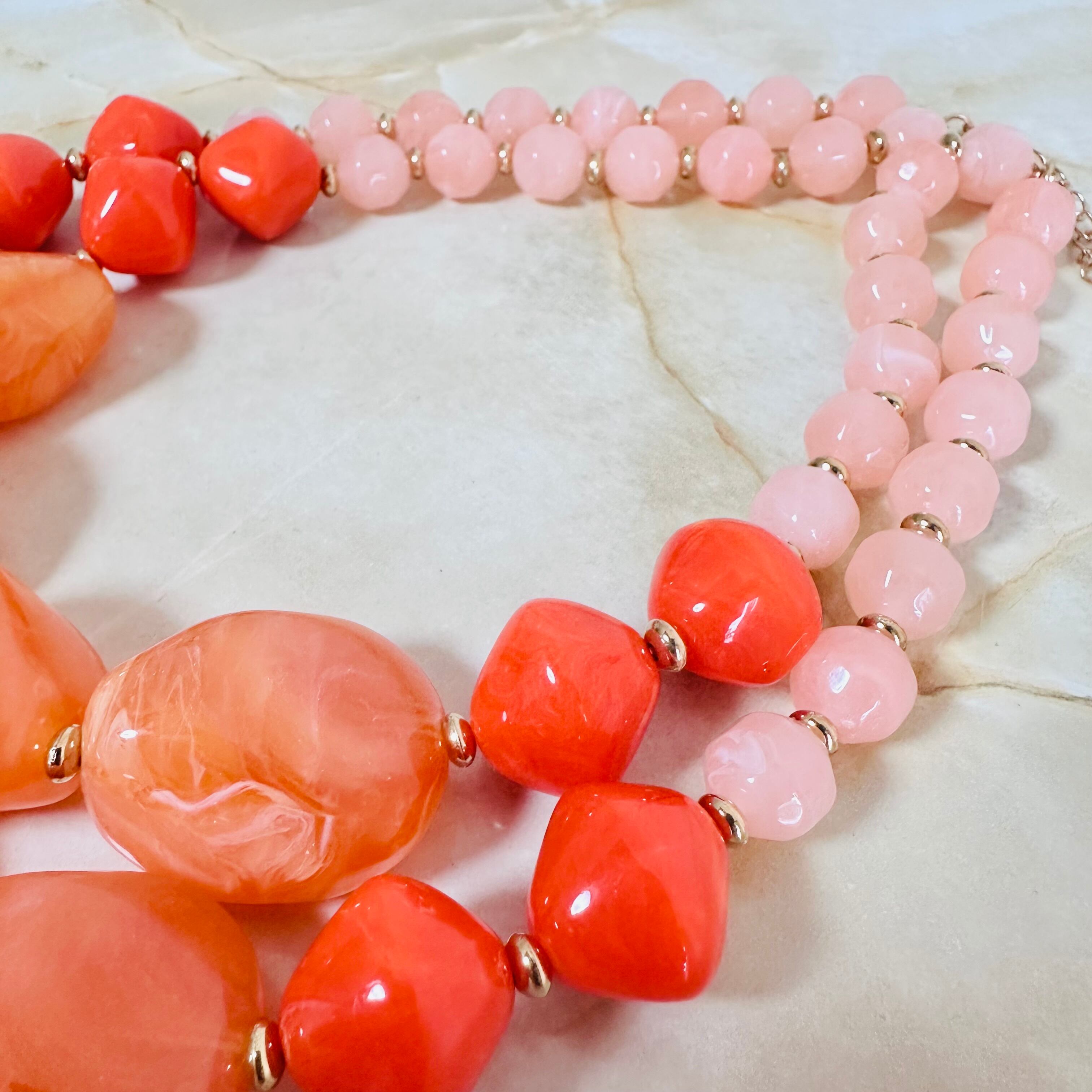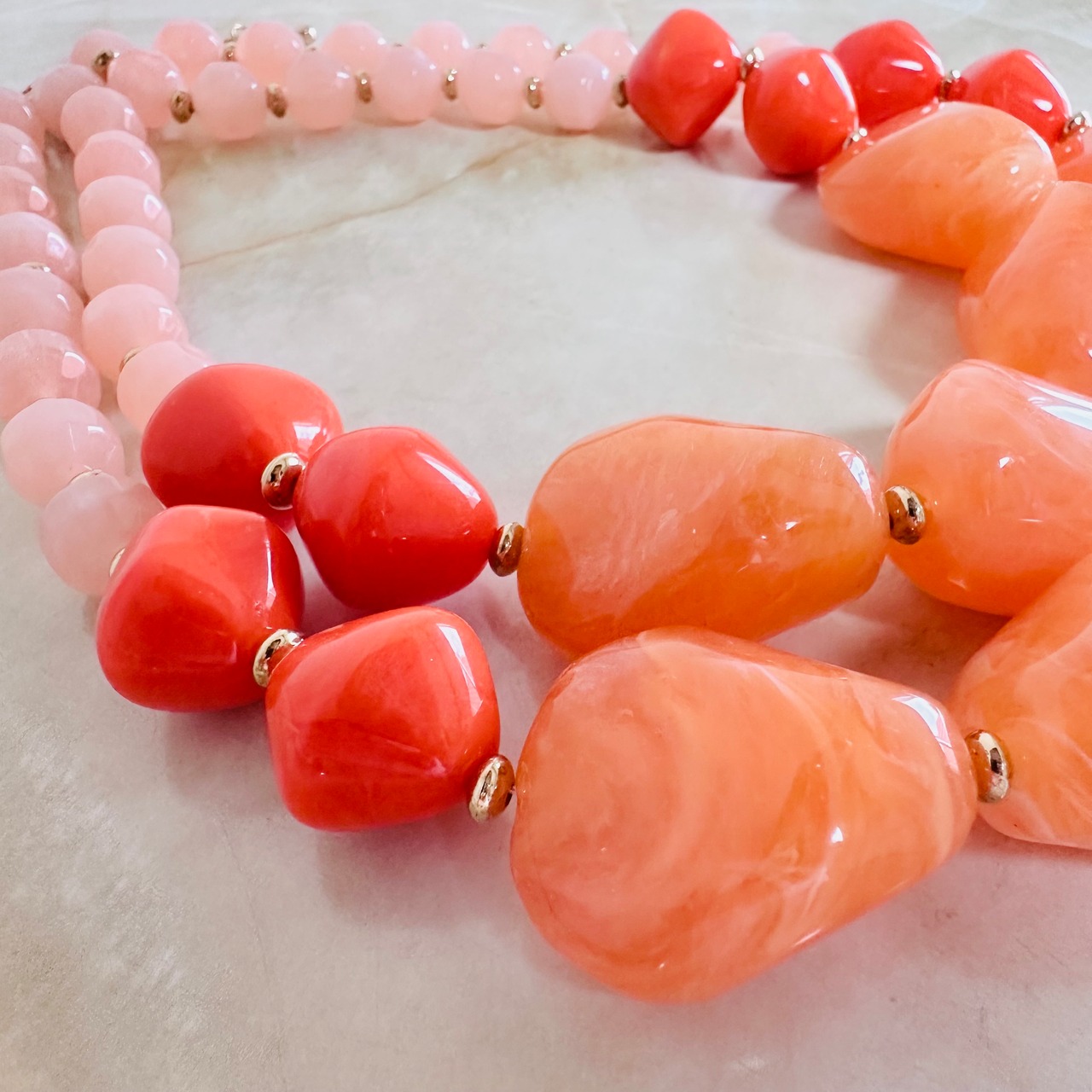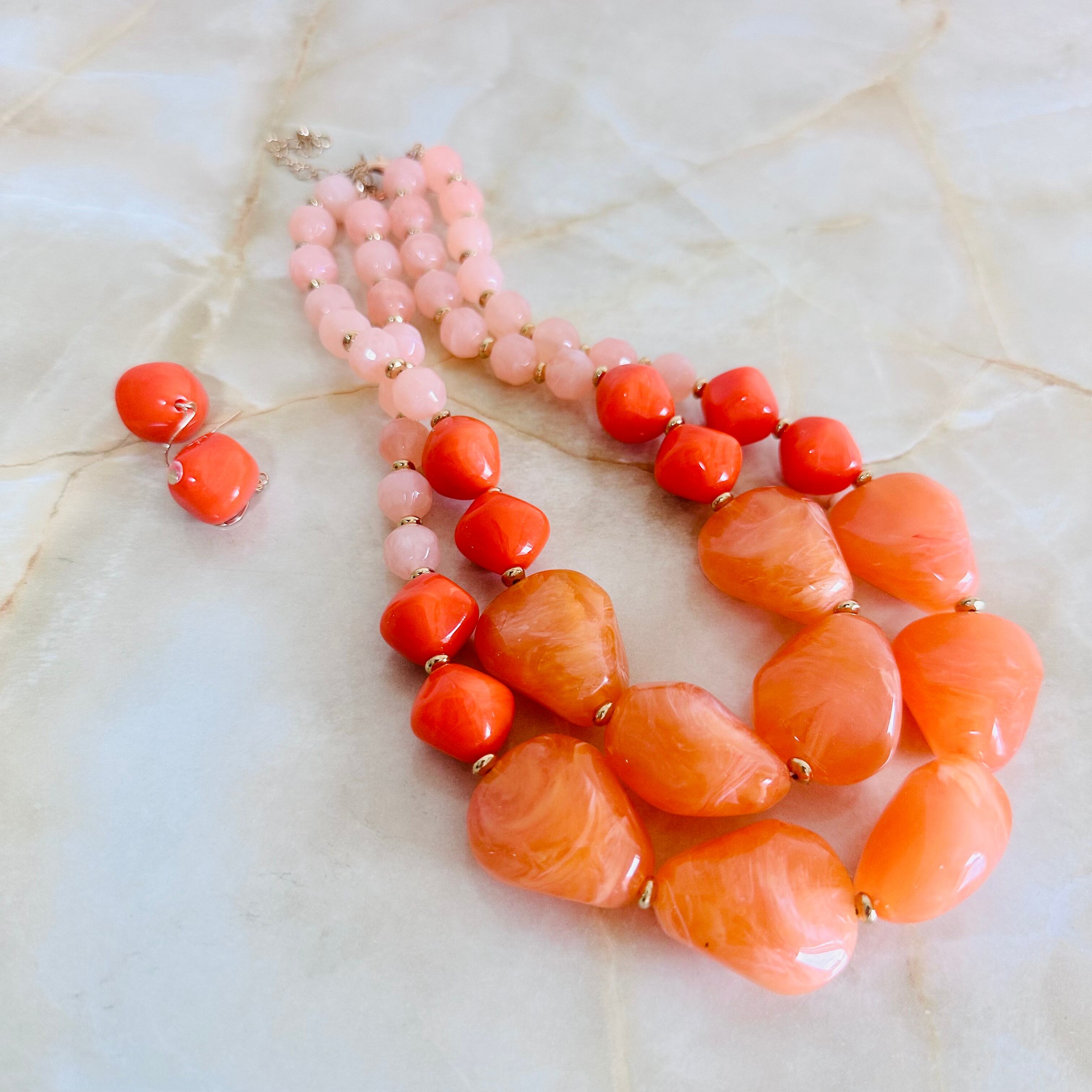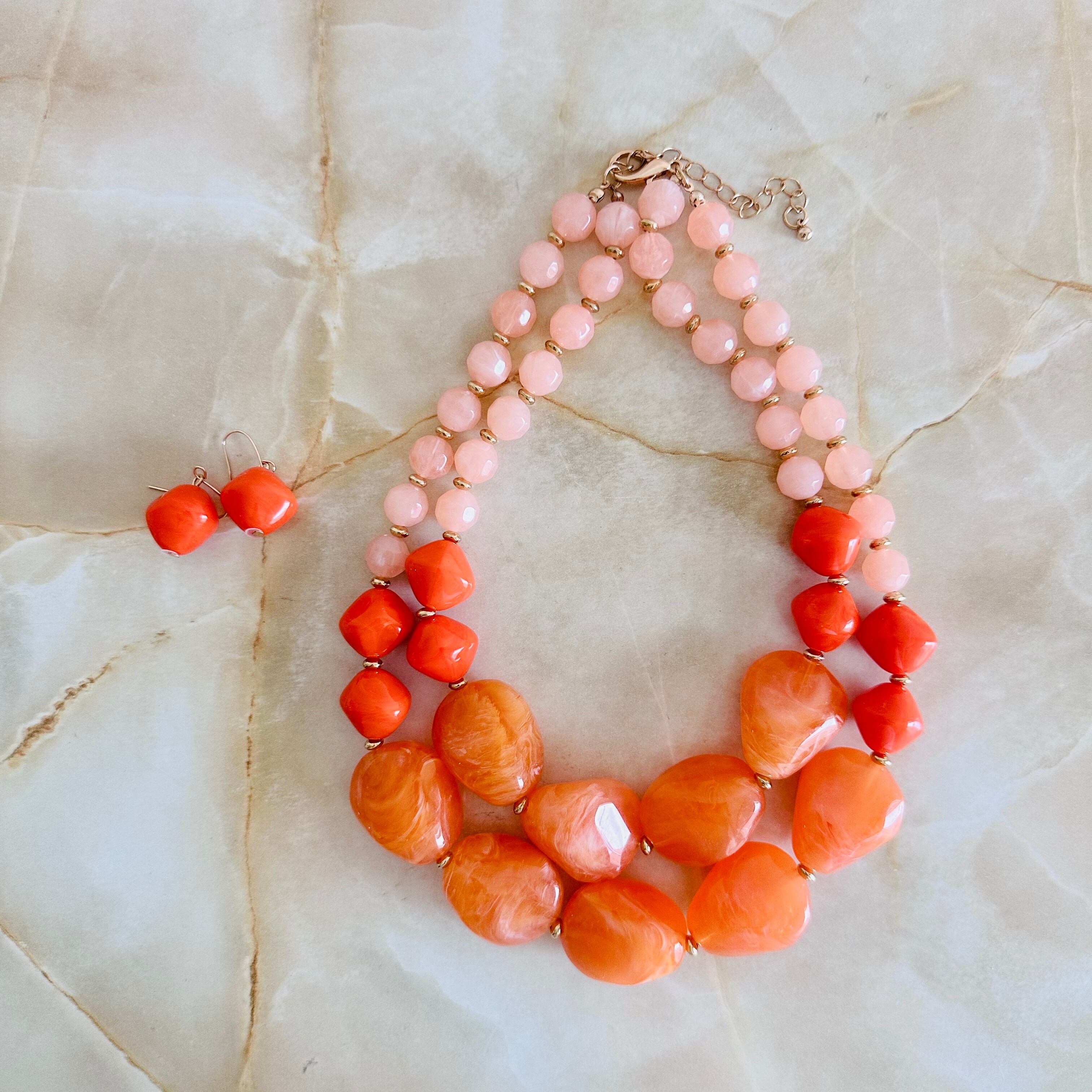 艶やかなアクリルパーツをオレンジのグラデーションで連ねたピアスとセットのネックレスです。