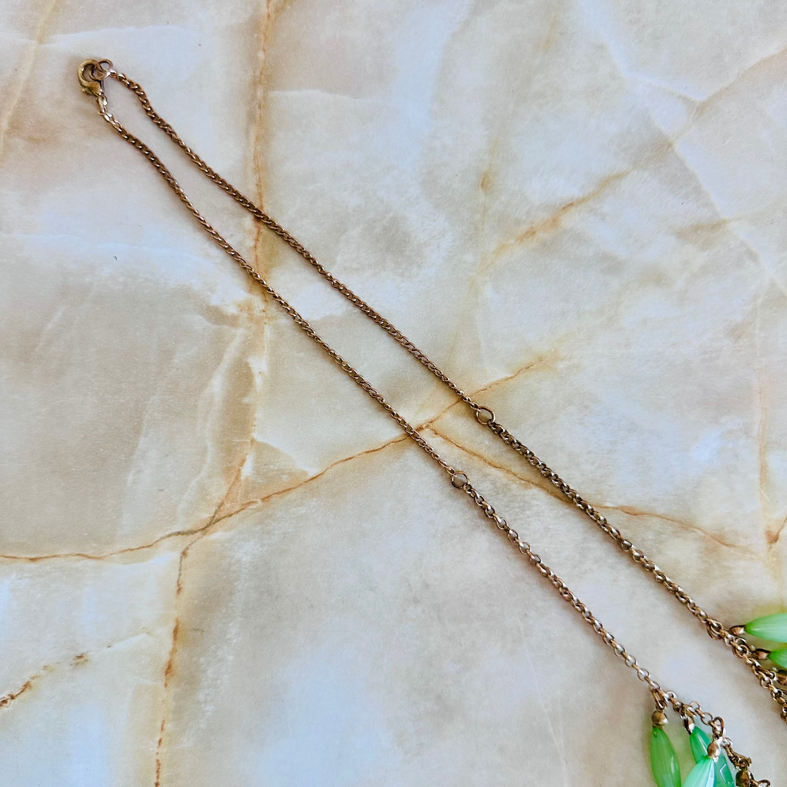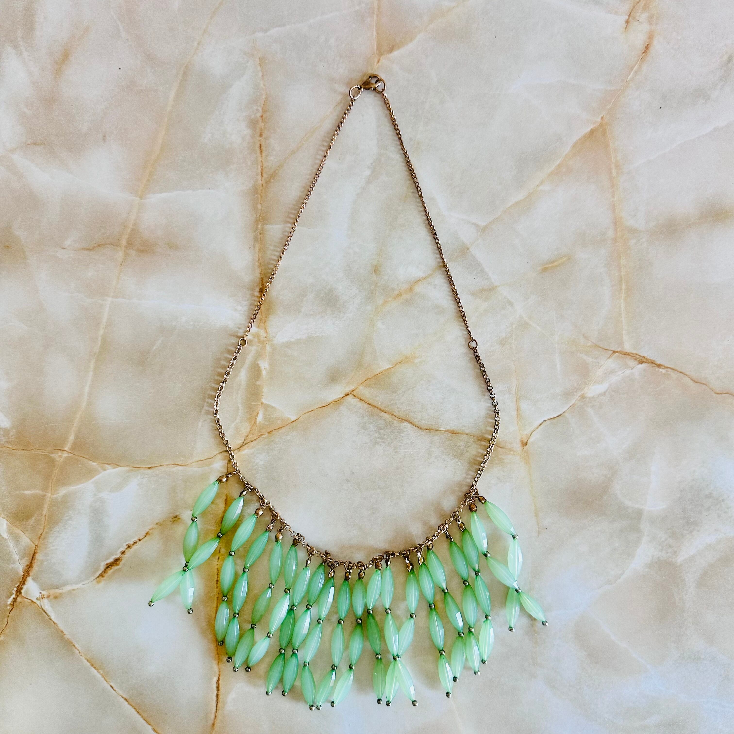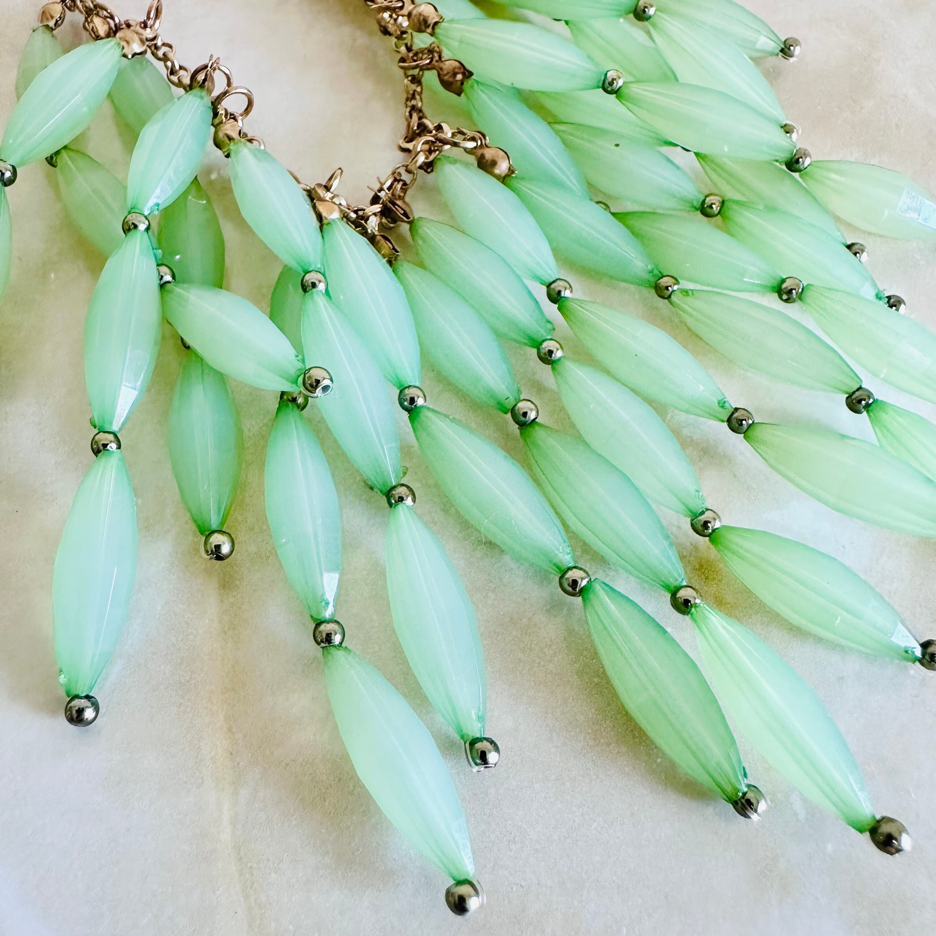 透明感のあるグリーンカラーのアクリルビーズをアンティークゴールドチェーンでボヘミアン調のフリンジデザインに仕上げています。