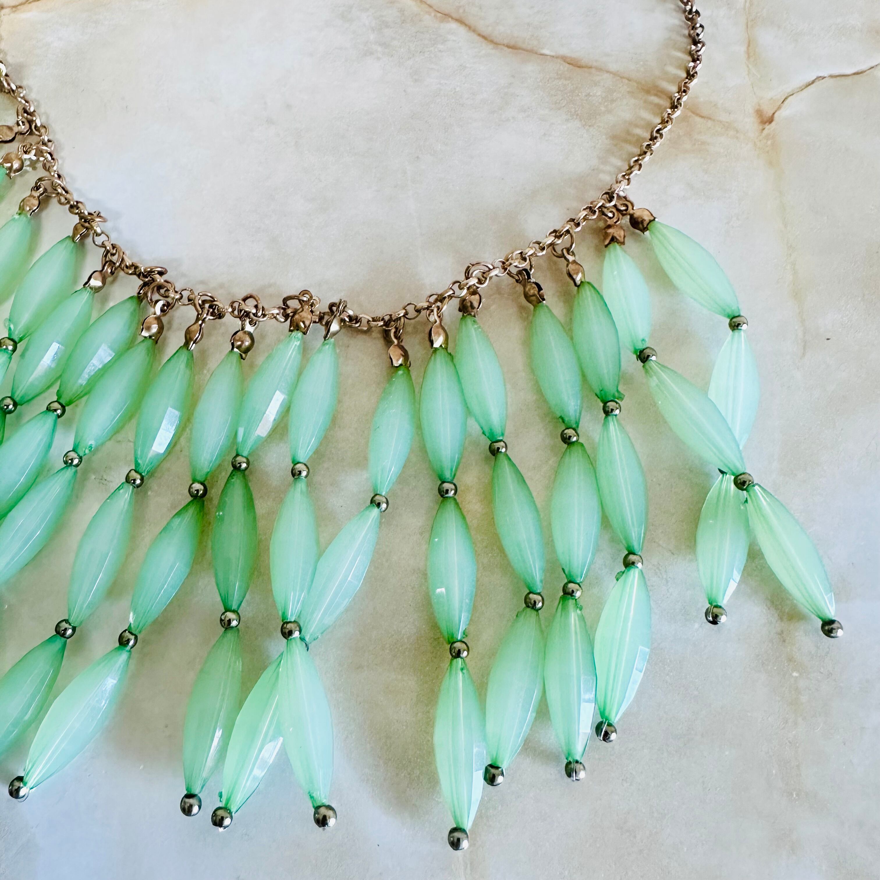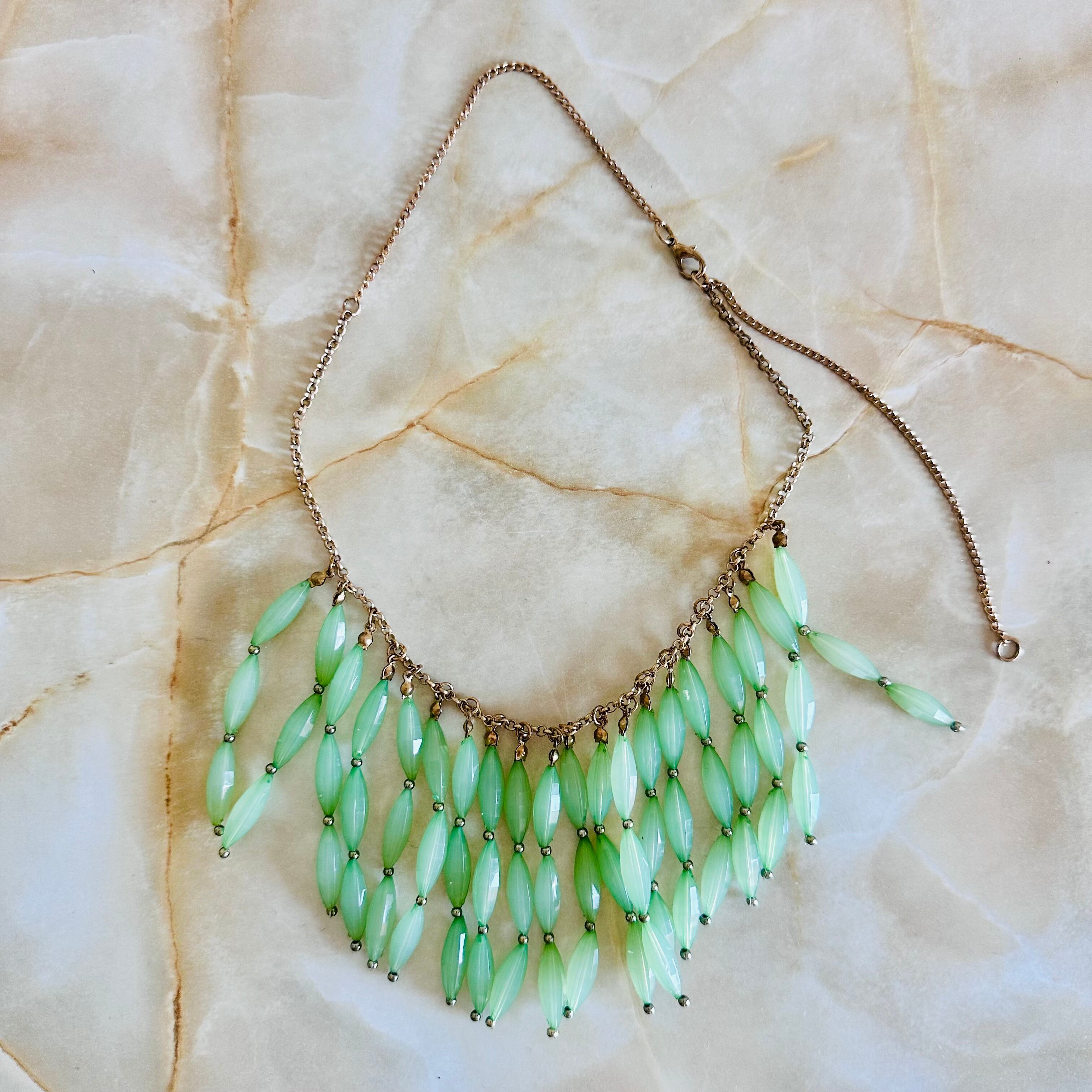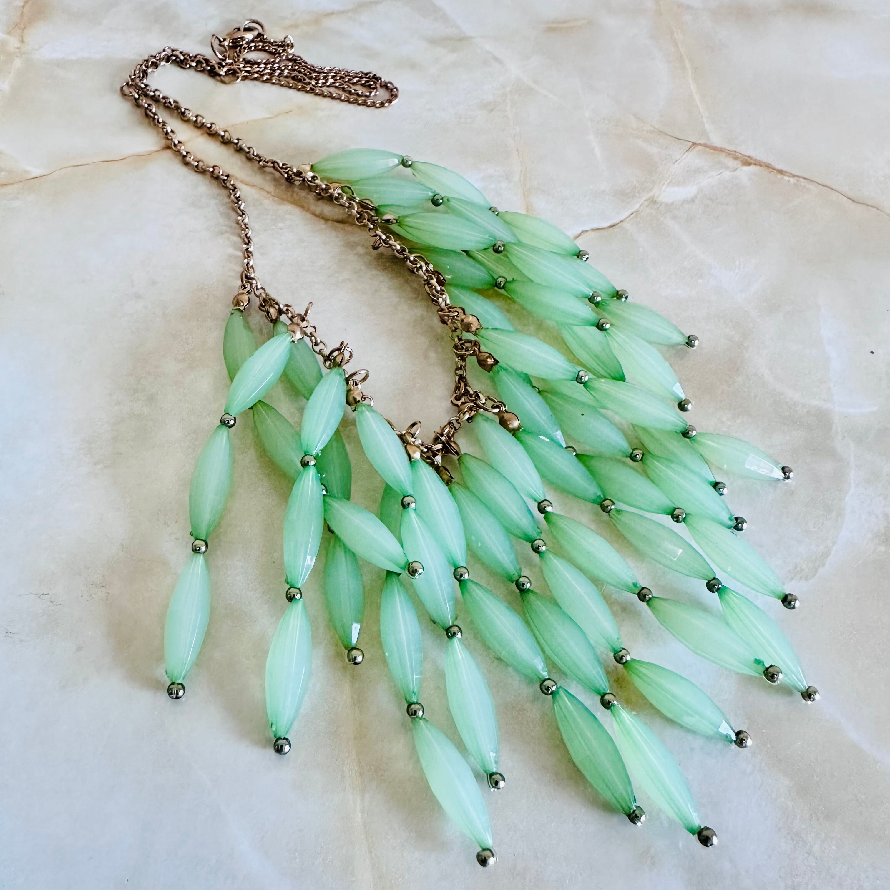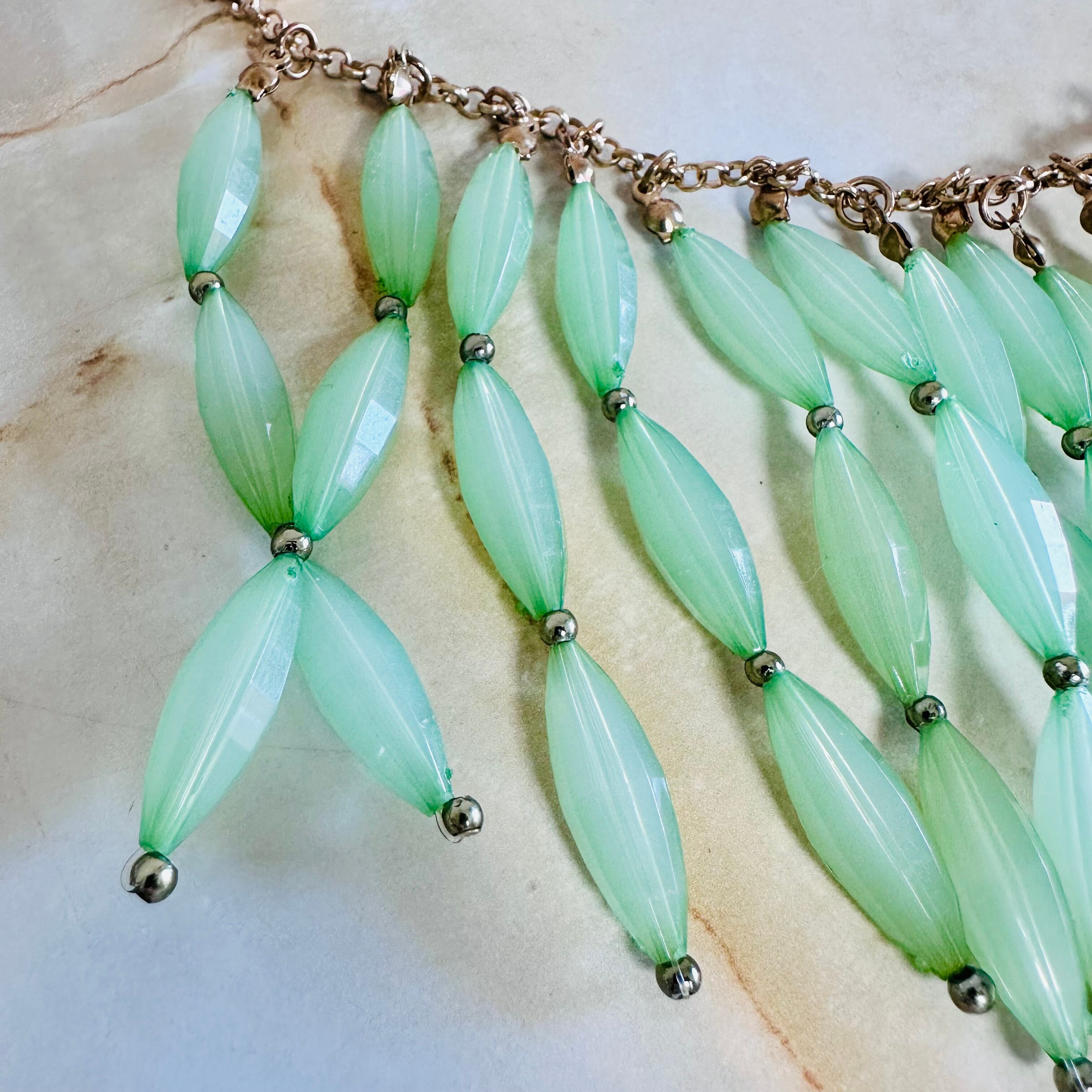 透明感のあるグリーンカラーのアクリルビーズをアンティークゴールドチェーンでボヘミアン調のフリンジデザインに仕上げています。