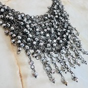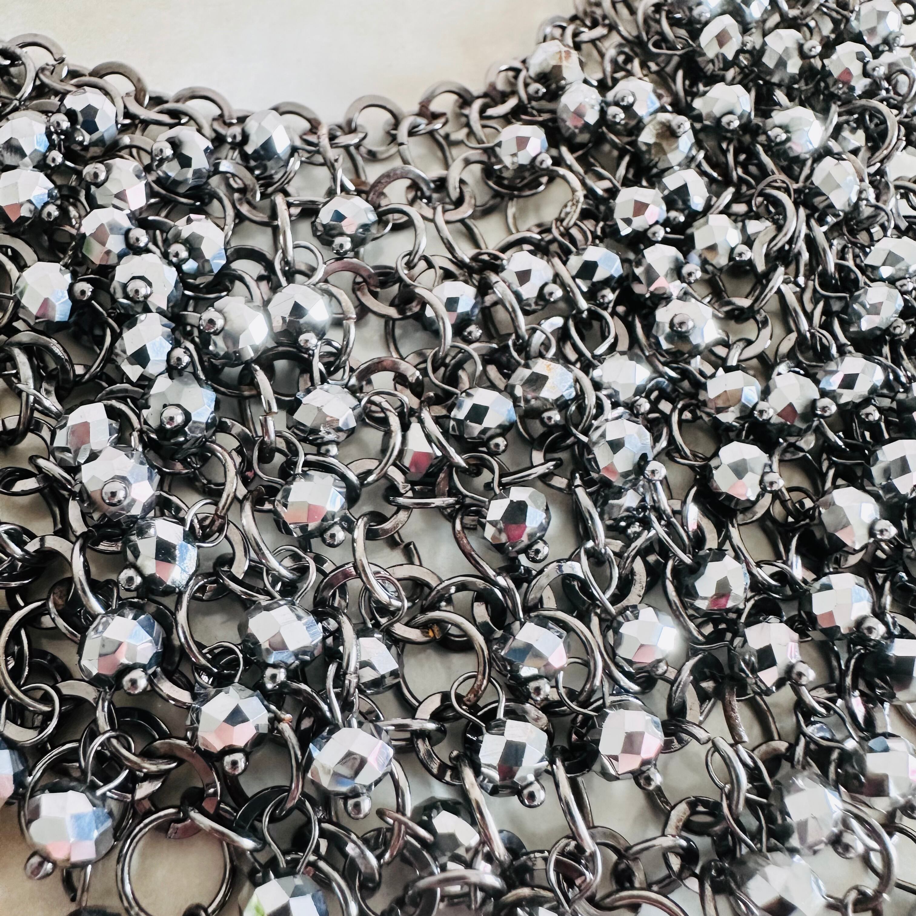 華やかに輝くクリスタルビーズをふんだんに使用し、チェーンに繋げあわせたデザインです。